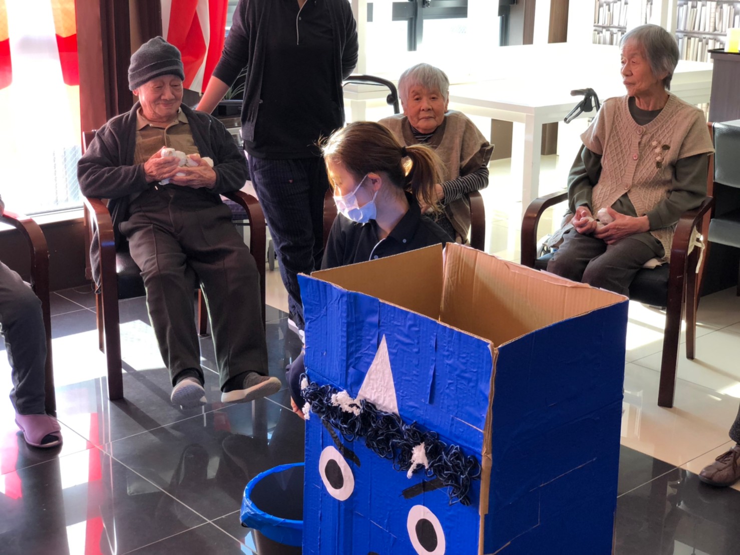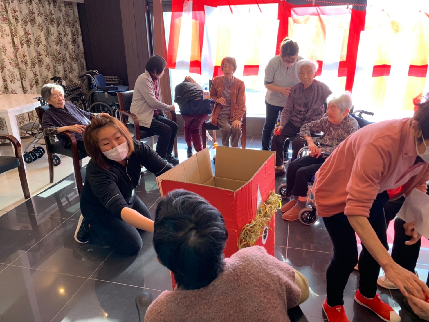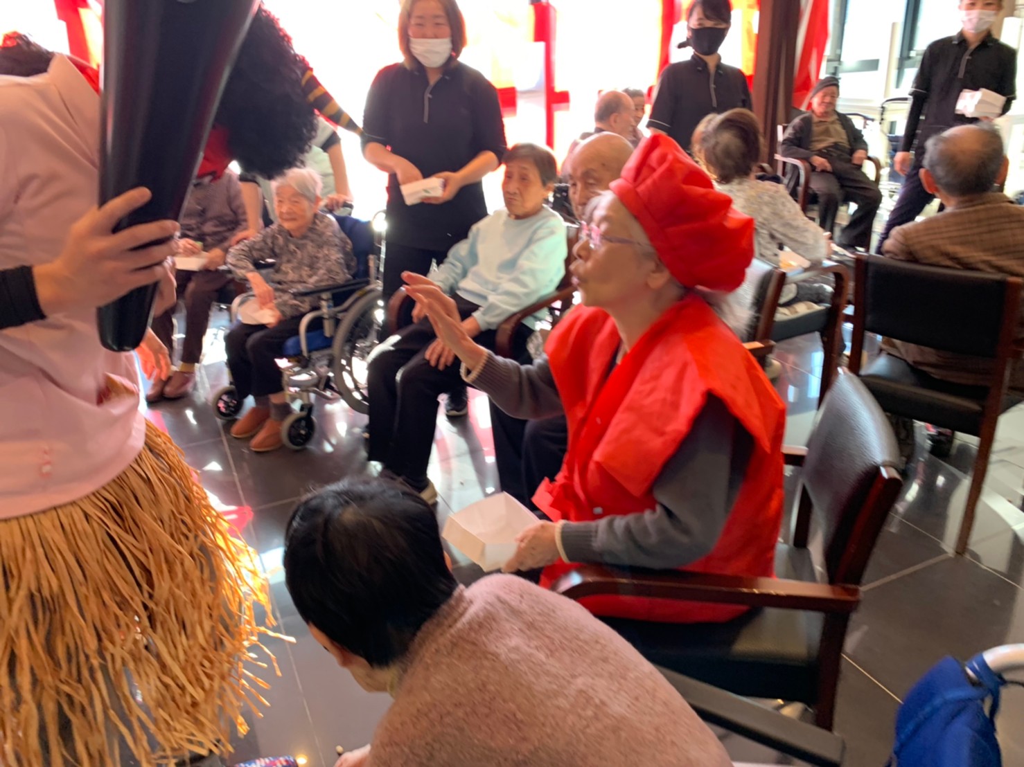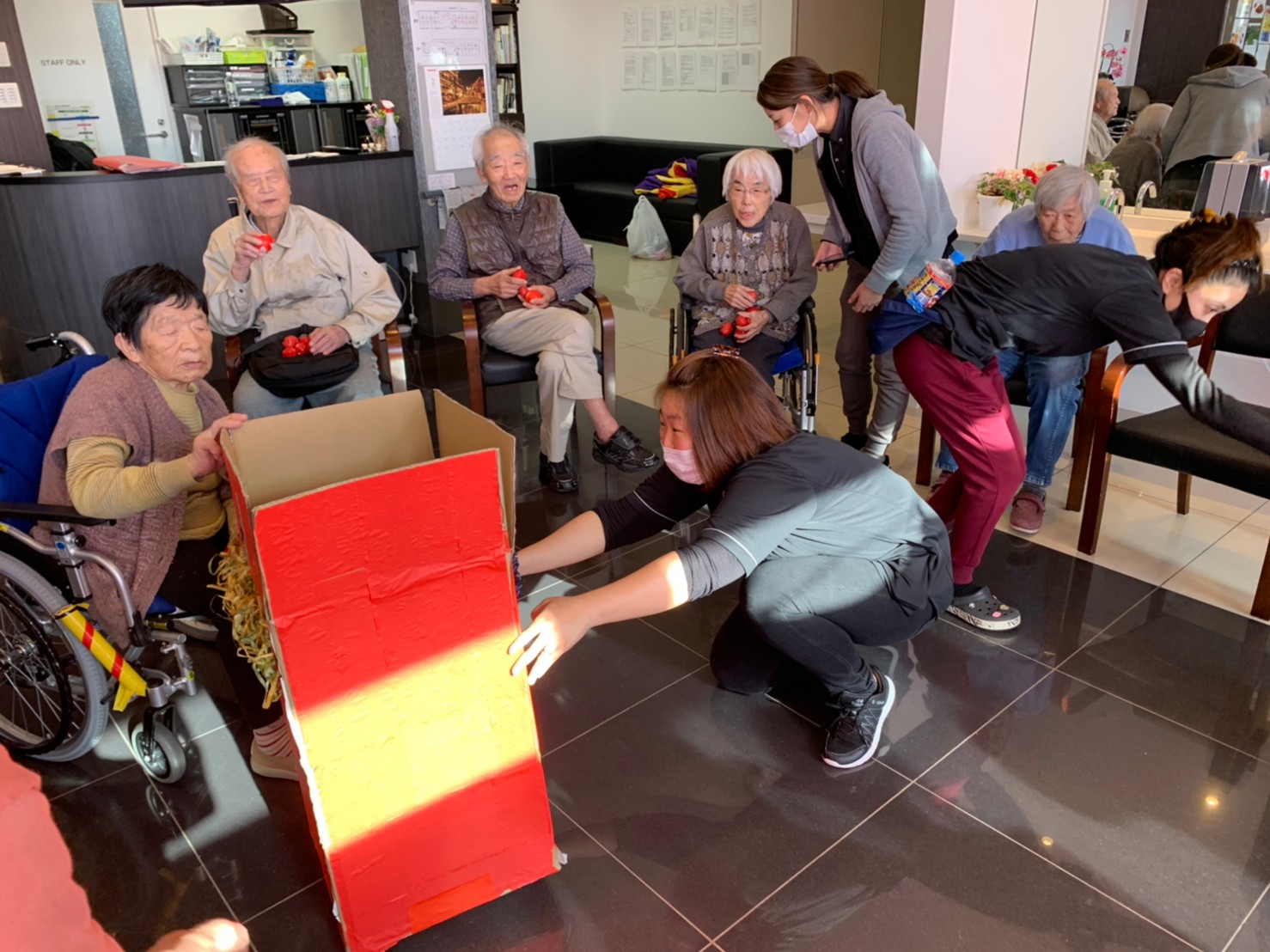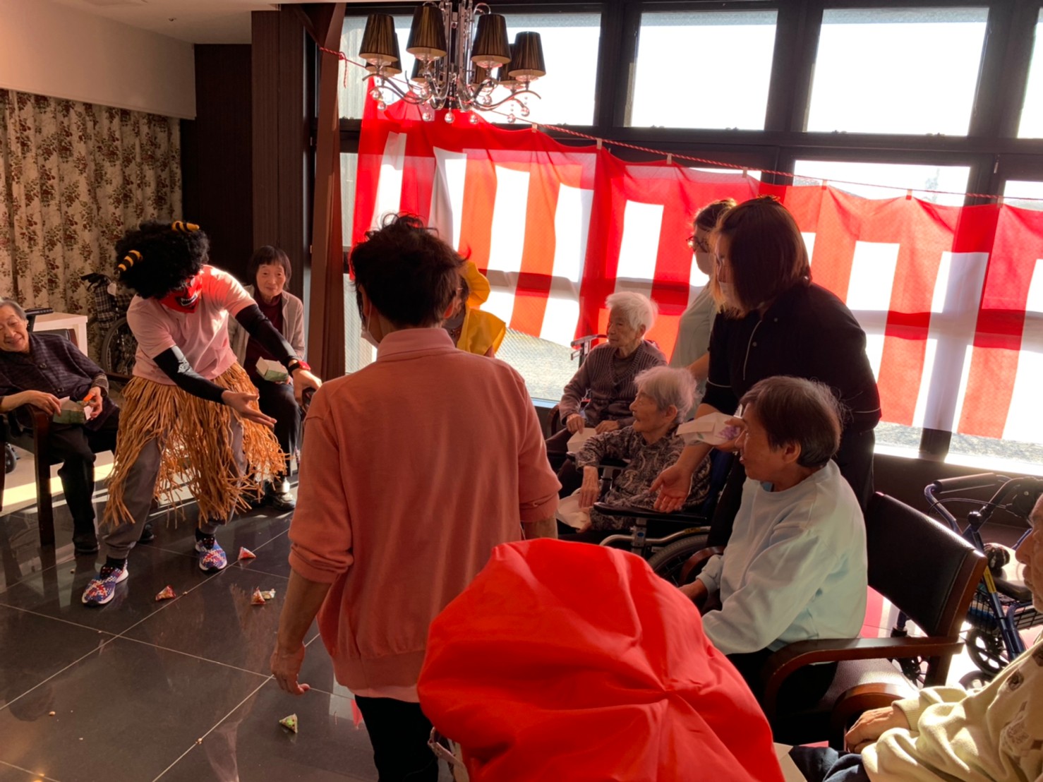サニープレイス河瀬の月1イベントを本日開催いたしました。2月は節分祭として企画し、豆まきにちなんだミニ運動会を行いました。豆に見立てて玉入れやボーリングのピンを鬼に見立て倒しました。ちなみに玉入れに使った赤鬼のサニーちゃんと青鬼のプレイスくんは利用者さまとスタッフの共同制作です。そのあとは恒例の鬼退治です。今年から衣装も新調されたスタッフ扮する鬼に利用者さまに退治していただきました。悪さをする鬼がなぜか人気で利用者さまが握手をされました(笑)鬼の金棒は空気で膨らますビニール製ですのでご安心ください。最後はこのイベント大トリの福娘の登場です。社内選考会を何度もかさね、名誉ある今年の福娘に選ばれたスタッフが利用者さまとお一人ずつお話をしながら記念撮影をいたしました。ボクも来年の福娘選考会に応募すると言ったら、スタッフ全員から来年も鬼やで!と止められたのはここだけのお話です(‘Д’)