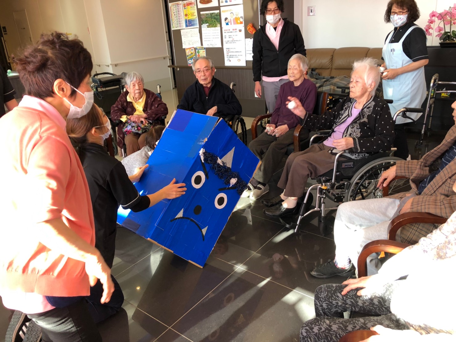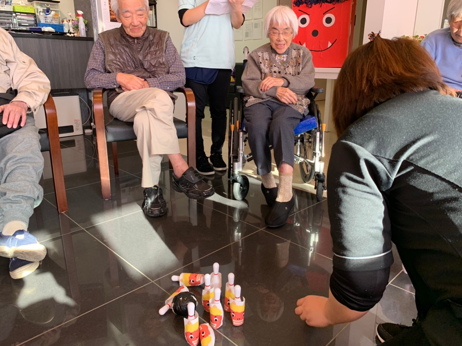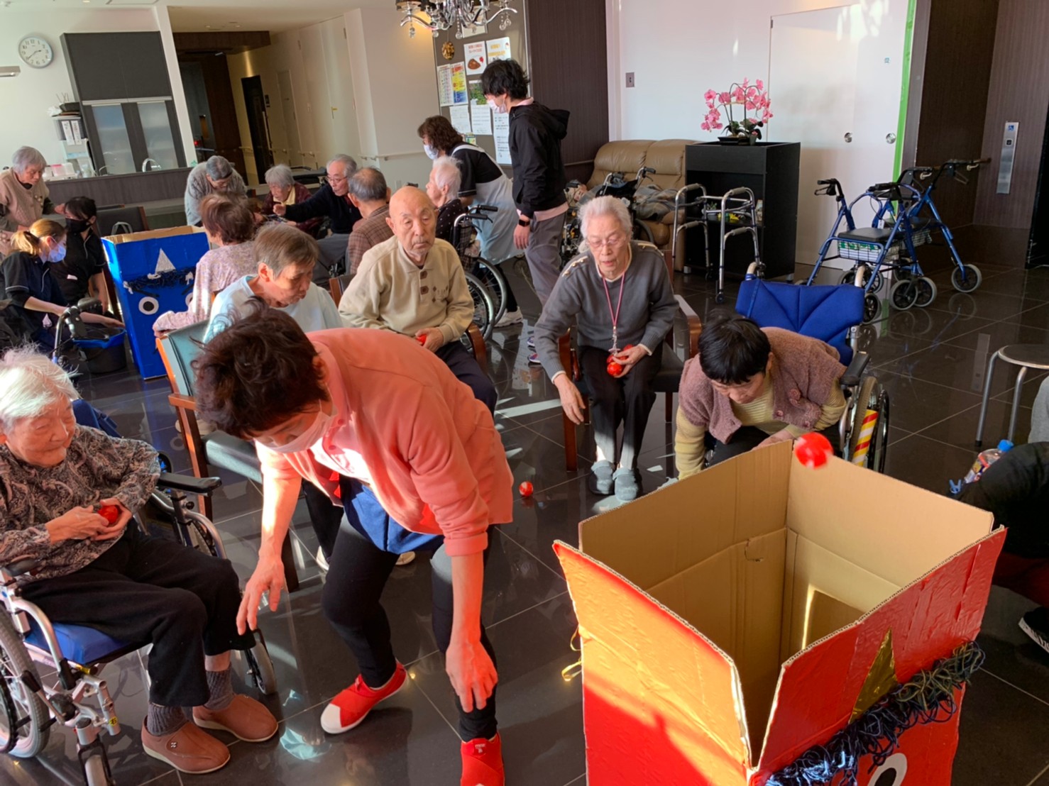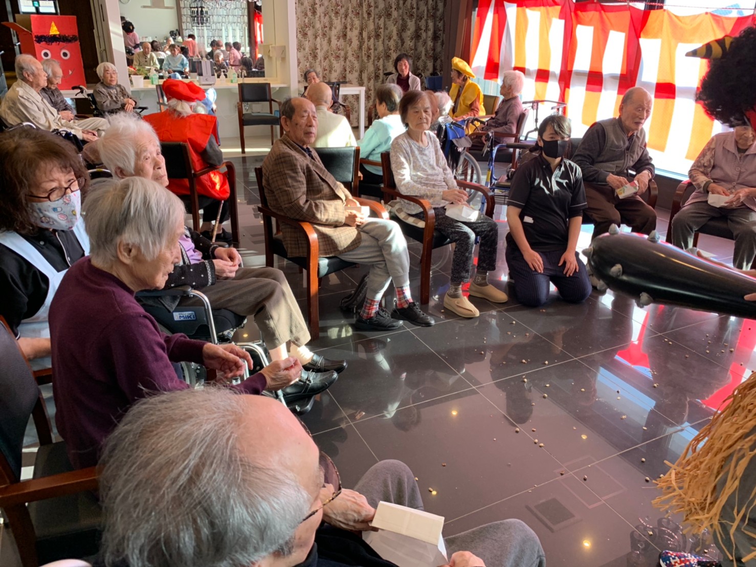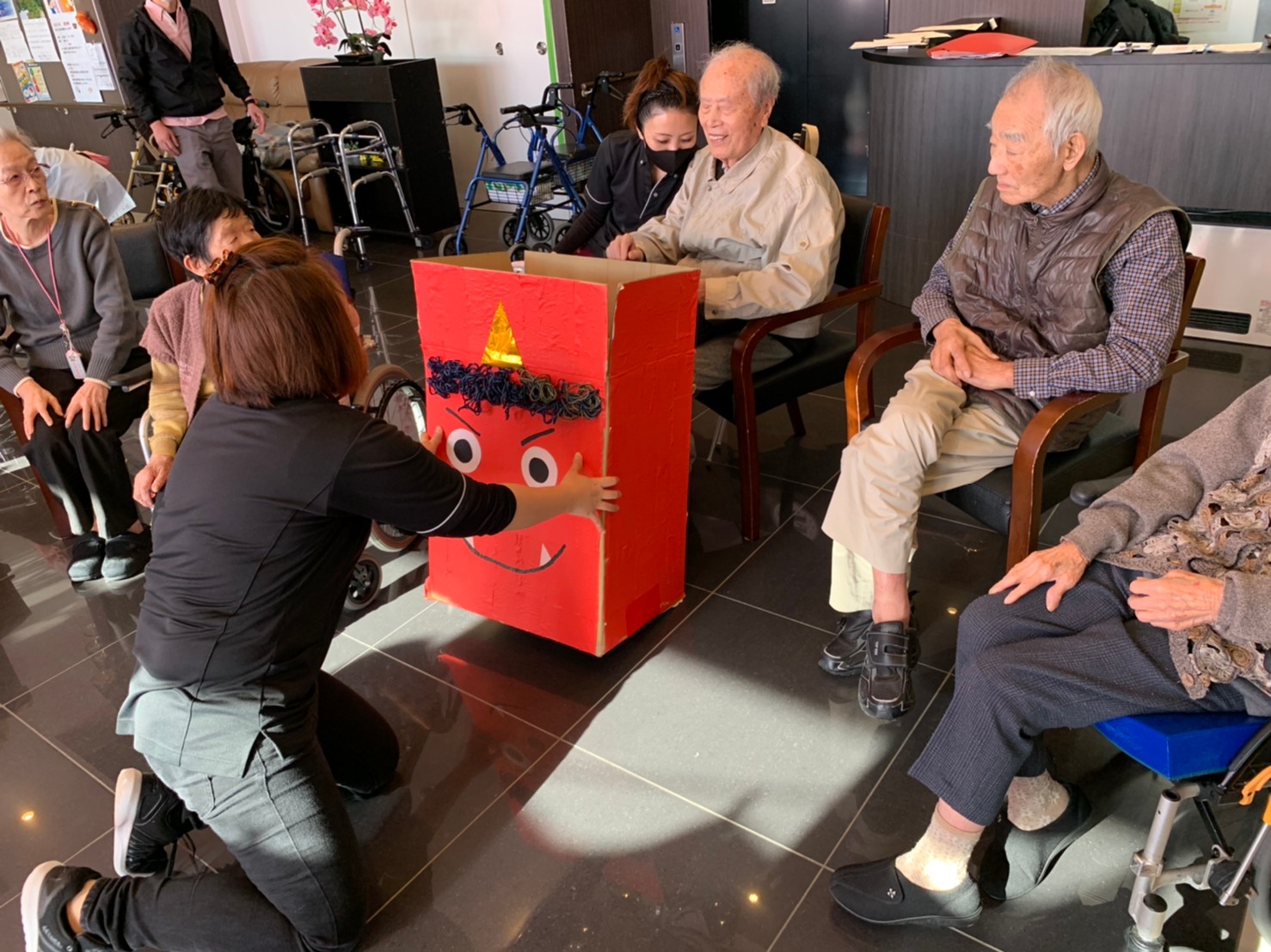 サニープレイス河瀬の月1イベントを本日開催いたしました。2月は節分祭として企画し、豆まきにちなんだミニ運動会を行いました。豆に見立てて玉入れやボーリングのピンを鬼に見立て倒しました。ちなみに玉入れに使った赤鬼のサニーちゃんと青鬼のプレイスくんは利用者さまとスタッフの共同制作です。そのあとは恒例の鬼退治です。今年から衣装も新調されたスタッフ扮する鬼に利用者さまに退治していただきました。悪さをする鬼がなぜか人気で利用者さまが握手をされました(笑)鬼の金棒は空気で膨らますビニール製ですのでご安心ください。最後はこのイベント大トリの福娘の登場です。社内選考会を何度もかさね、名誉ある今年の福娘に選ばれたスタッフが利用者さまとお一人ずつお話をしながら記念撮影をいたしました。ボクも来年の福娘選考会に応募すると言ったら、スタッフ全員から来年も鬼やで!と止められたのはここだけのお話です(‘Д’)
