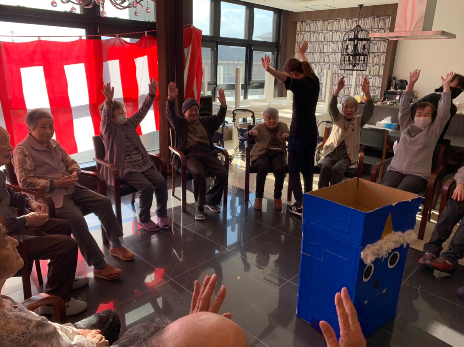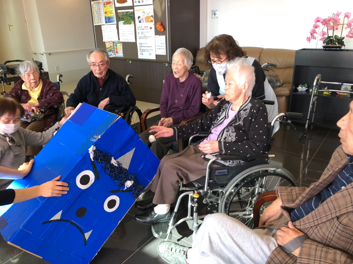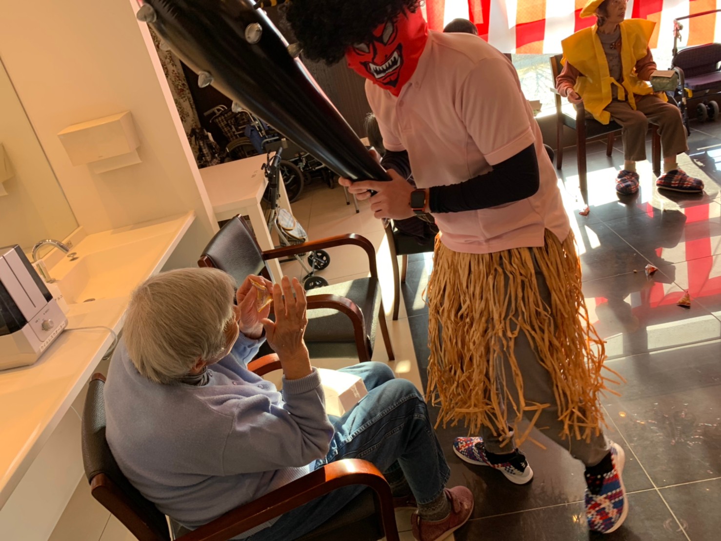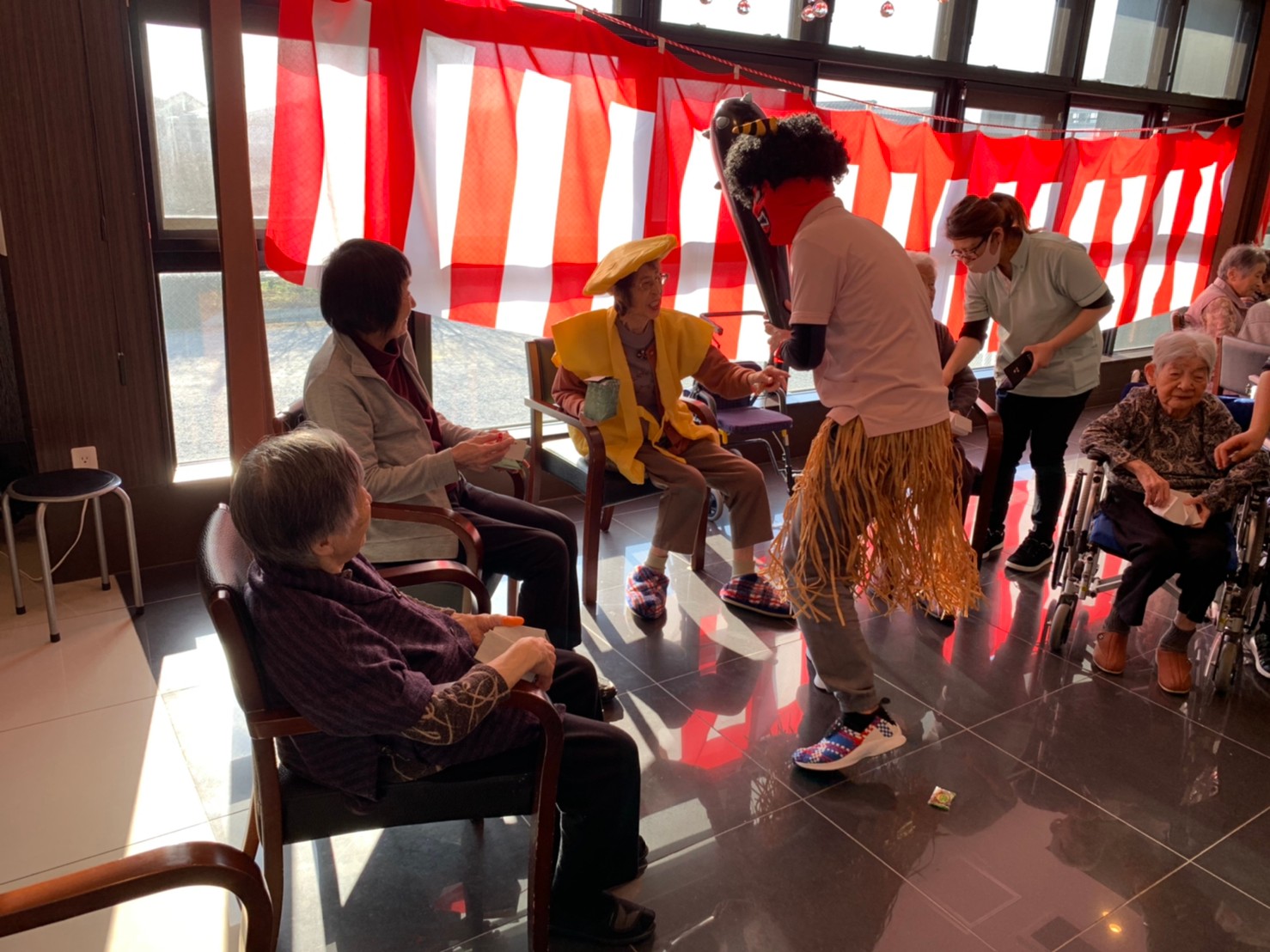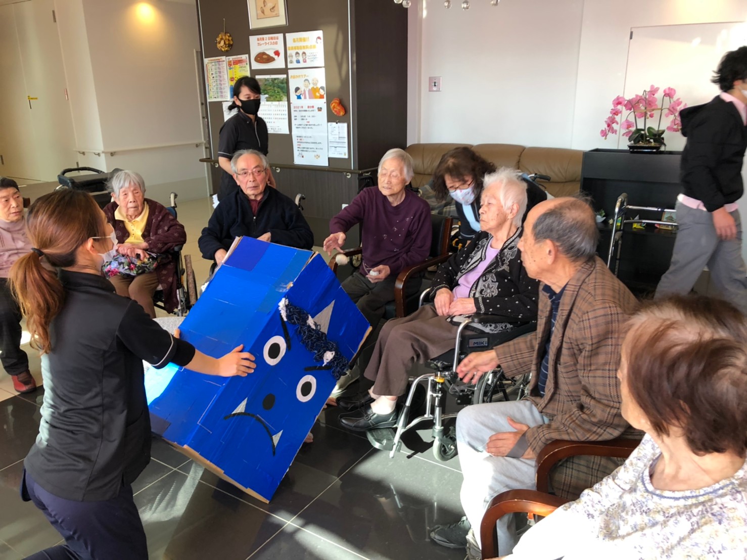 サニープレイス河瀬の月1イベントを本日開催いたしました。2月は節分祭として企画し、豆まきにちなんだミニ運動会を行いました。豆に見立てて玉入れやボーリングのピンを鬼に見立て倒しました。ちなみに玉入れに使った赤鬼のサニーちゃんと青鬼のプレイスくんは利用者さまとスタッフの共同制作です。そのあとは恒例の鬼退治です。今年から衣装も新調されたスタッフ扮する鬼に利用者さまに退治していただきました。悪さをする鬼がなぜか人気で利用者さまが握手をされました(笑)鬼の金棒は空気で膨らますビニール製ですのでご安心ください。最後はこのイベント大トリの福娘の登場です。社内選考会を何度もかさね、名誉ある今年の福娘に選ばれたスタッフが利用者さまとお一人ずつお話をしながら記念撮影をいたしました。ボクも来年の福娘選考会に応募すると言ったら、スタッフ全員から来年も鬼やで!と止められたのはここだけのお話です(‘Д’)