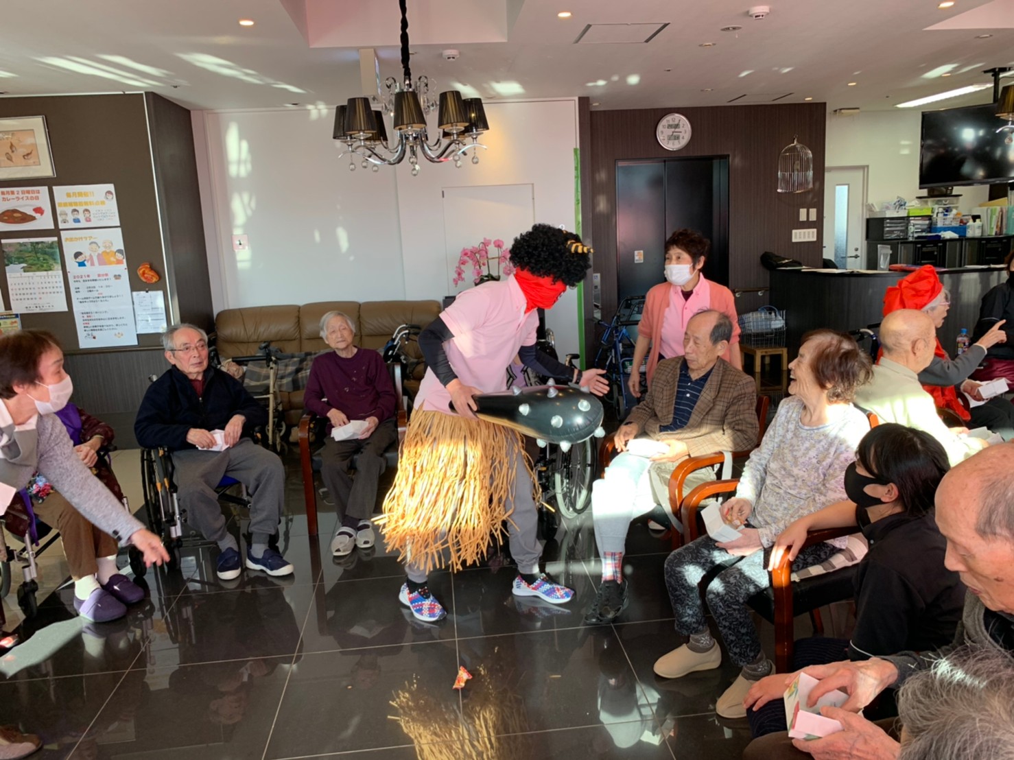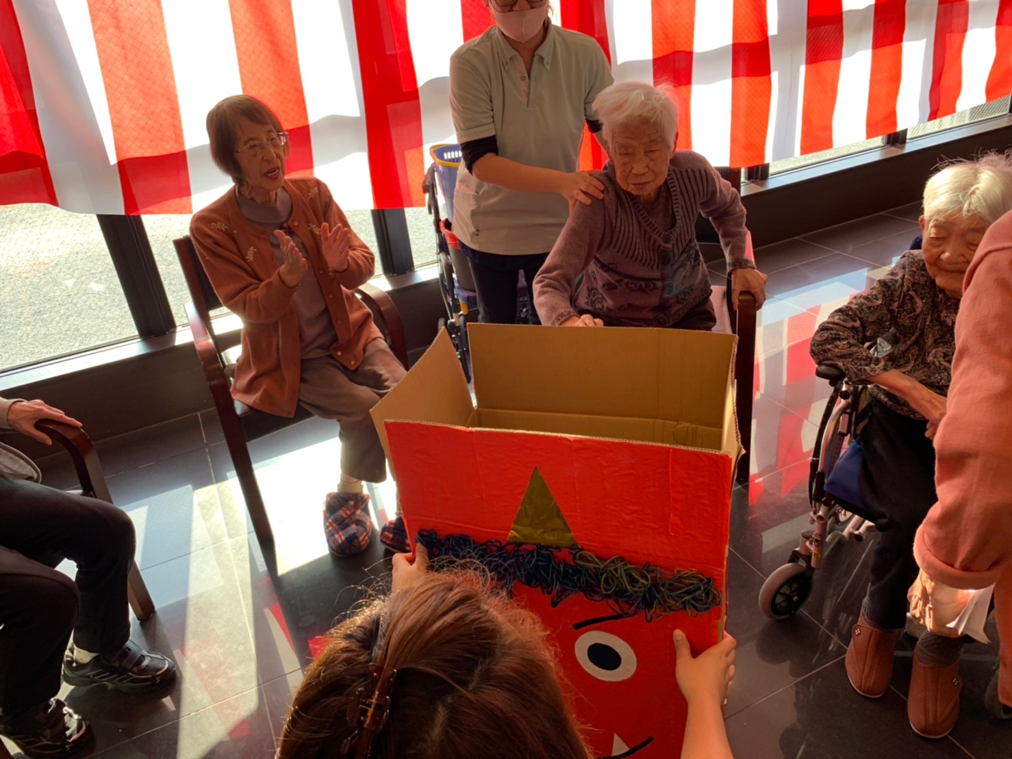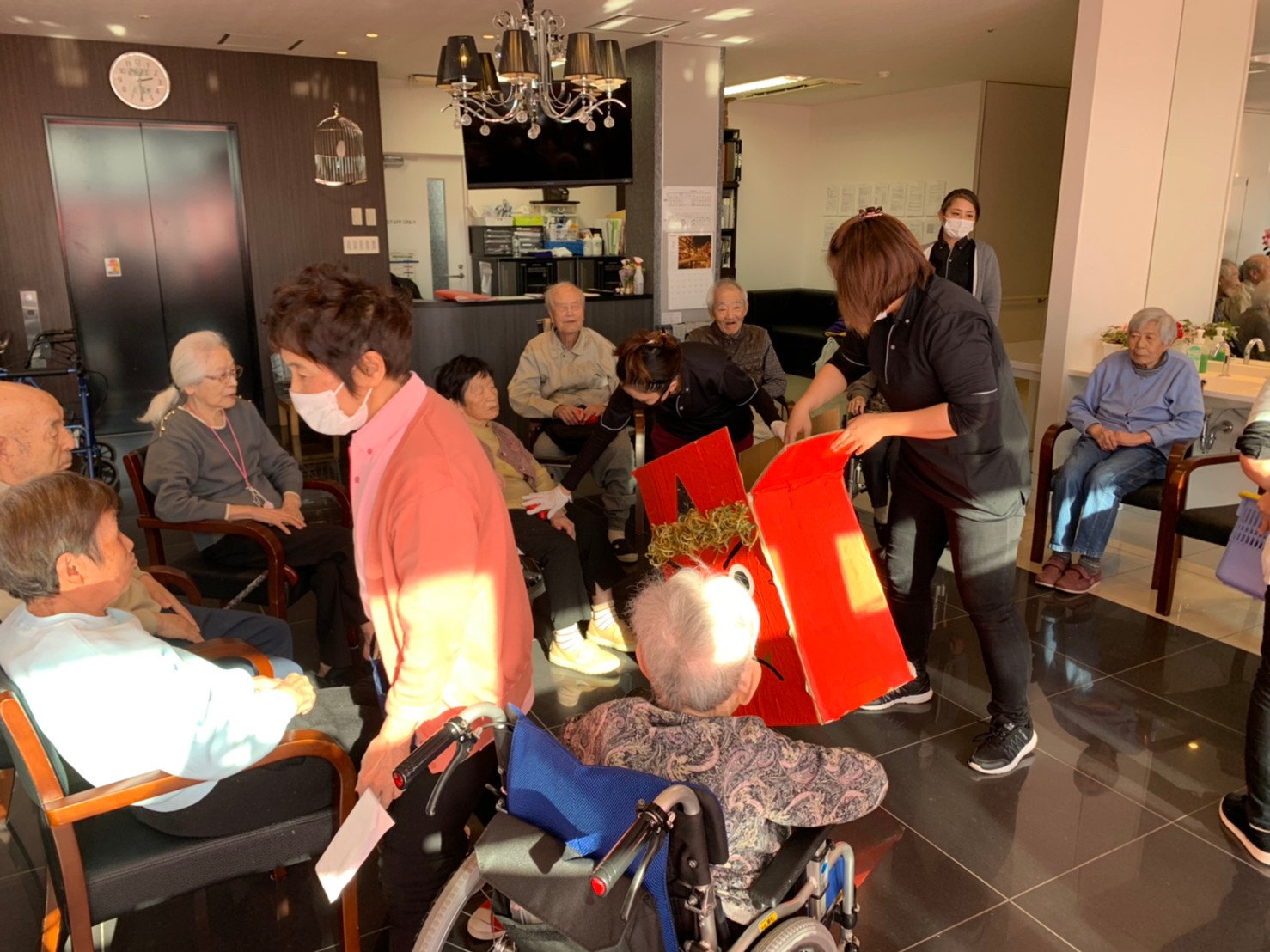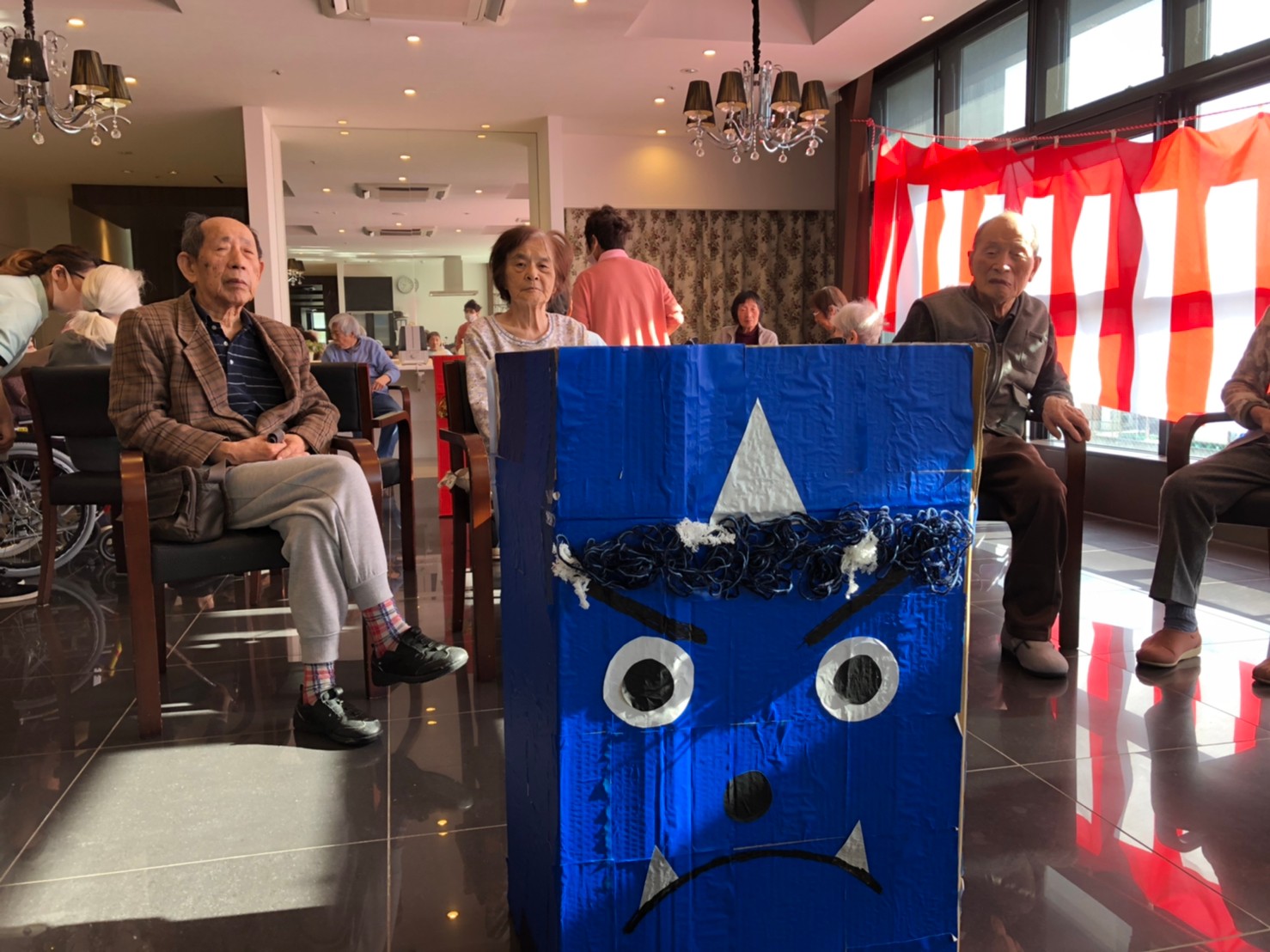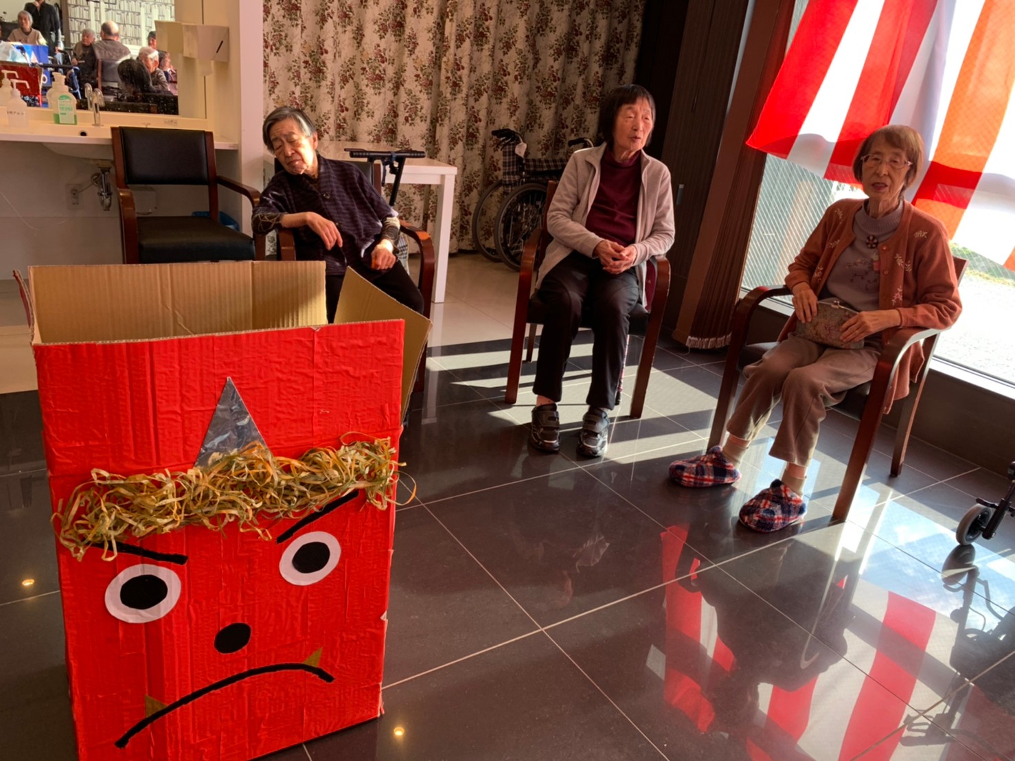 サニープレイス河瀬の月1イベントを本日開催いたしました。2月は節分祭として企画し、豆まきにちなんだミニ運動会を行いました。豆に見立てて玉入れやボーリングのピンを鬼に見立て倒しました。ちなみに玉入れに使った赤鬼のサニーちゃんと青鬼のプレイスくんは利用者さまとスタッフの共同制作です。そのあとは恒例の鬼退治です。今年から衣装も新調されたスタッフ扮する鬼に利用者さまに退治していただきました。悪さをする鬼がなぜか人気で利用者さまが握手をされました(笑)鬼の金棒は空気で膨らますビニール製ですのでご安心ください。最後はこのイベント大トリの福娘の登場です。社内選考会を何度もかさね、名誉ある今年の福娘に選ばれたスタッフが利用者さまとお一人ずつお話をしながら記念撮影をいたしました。ボクも来年の福娘選考会に応募すると言ったら、スタッフ全員から来年も鬼やで!と止められたのはここだけのお話です(‘Д’)