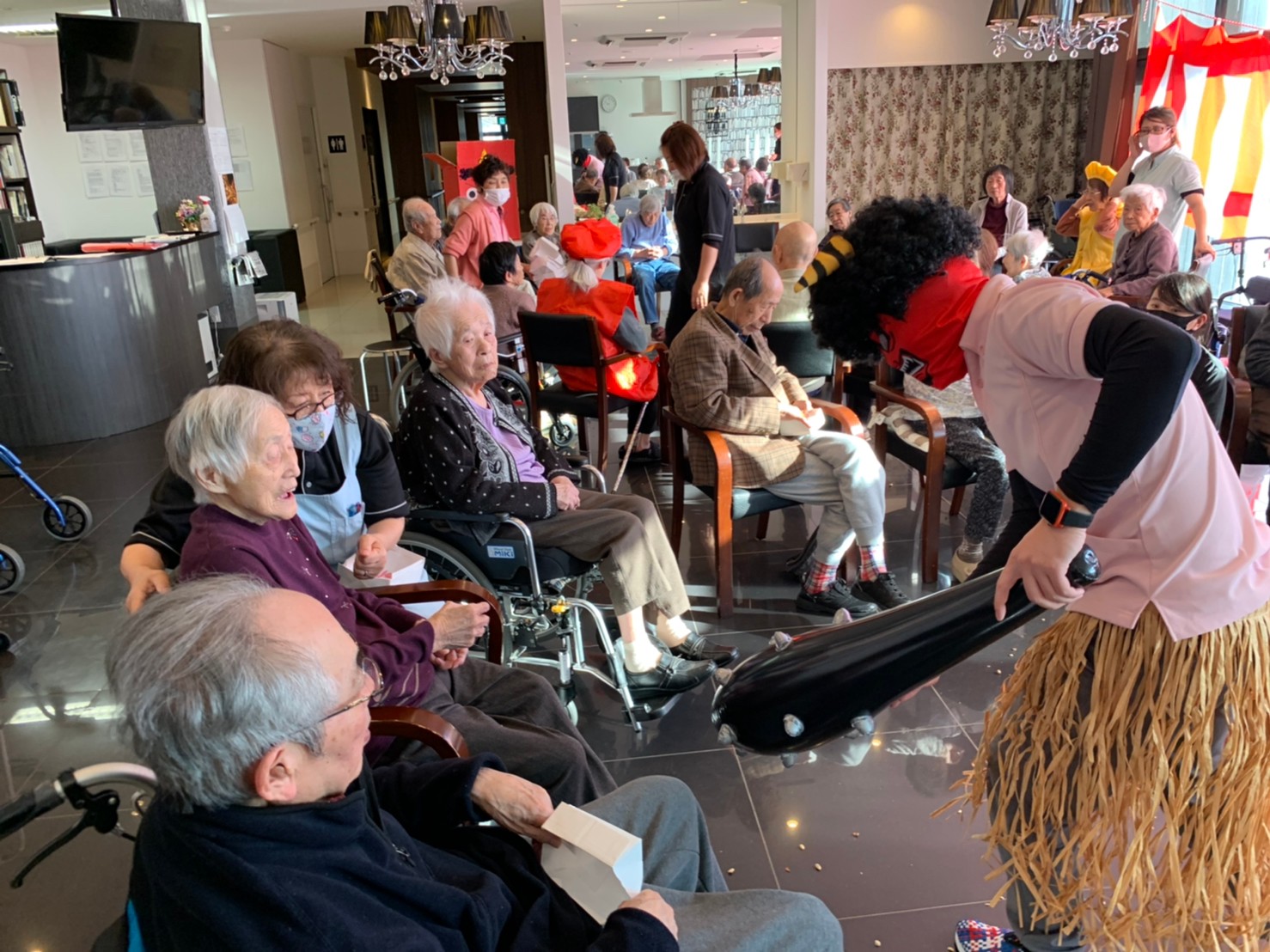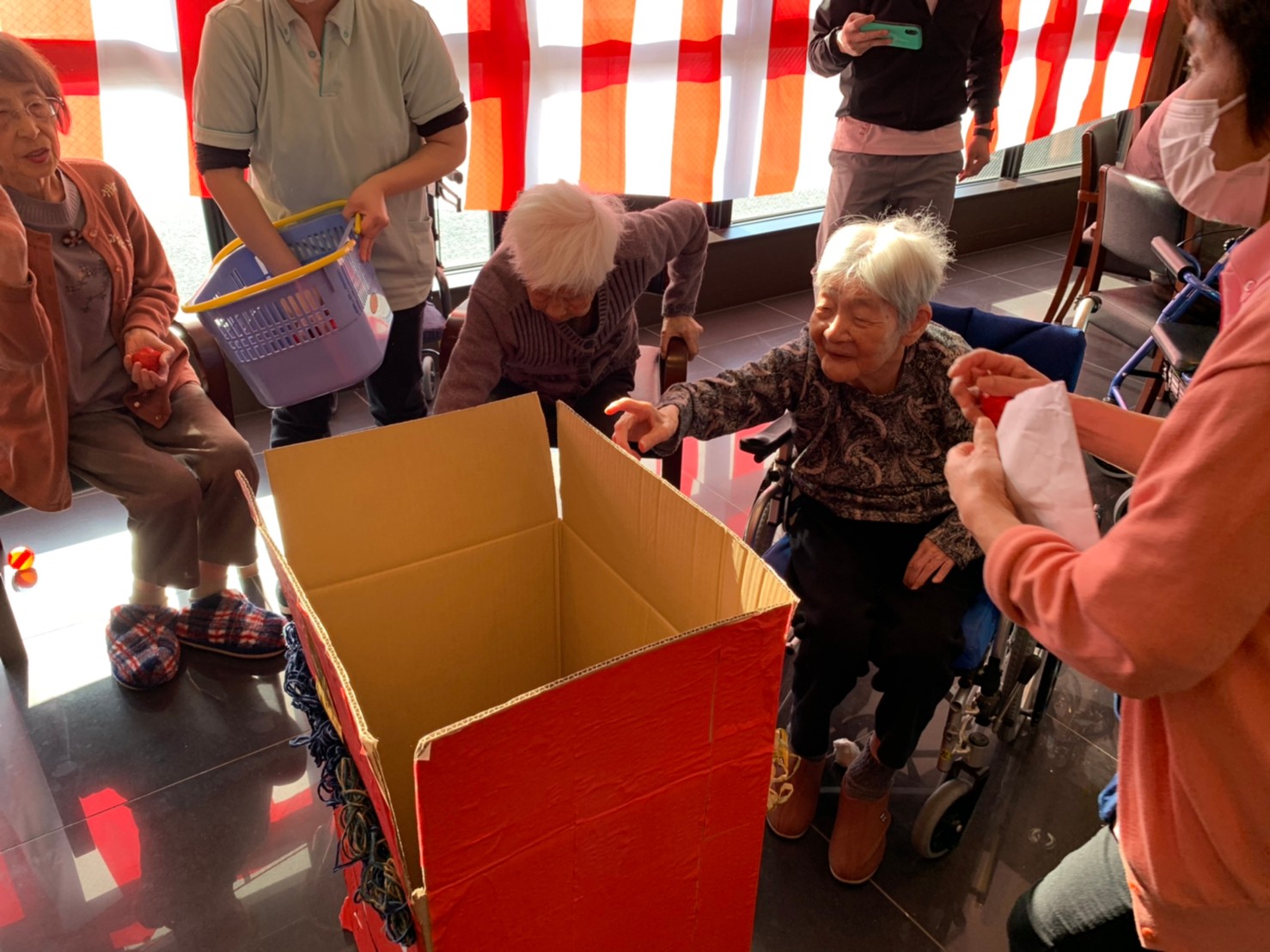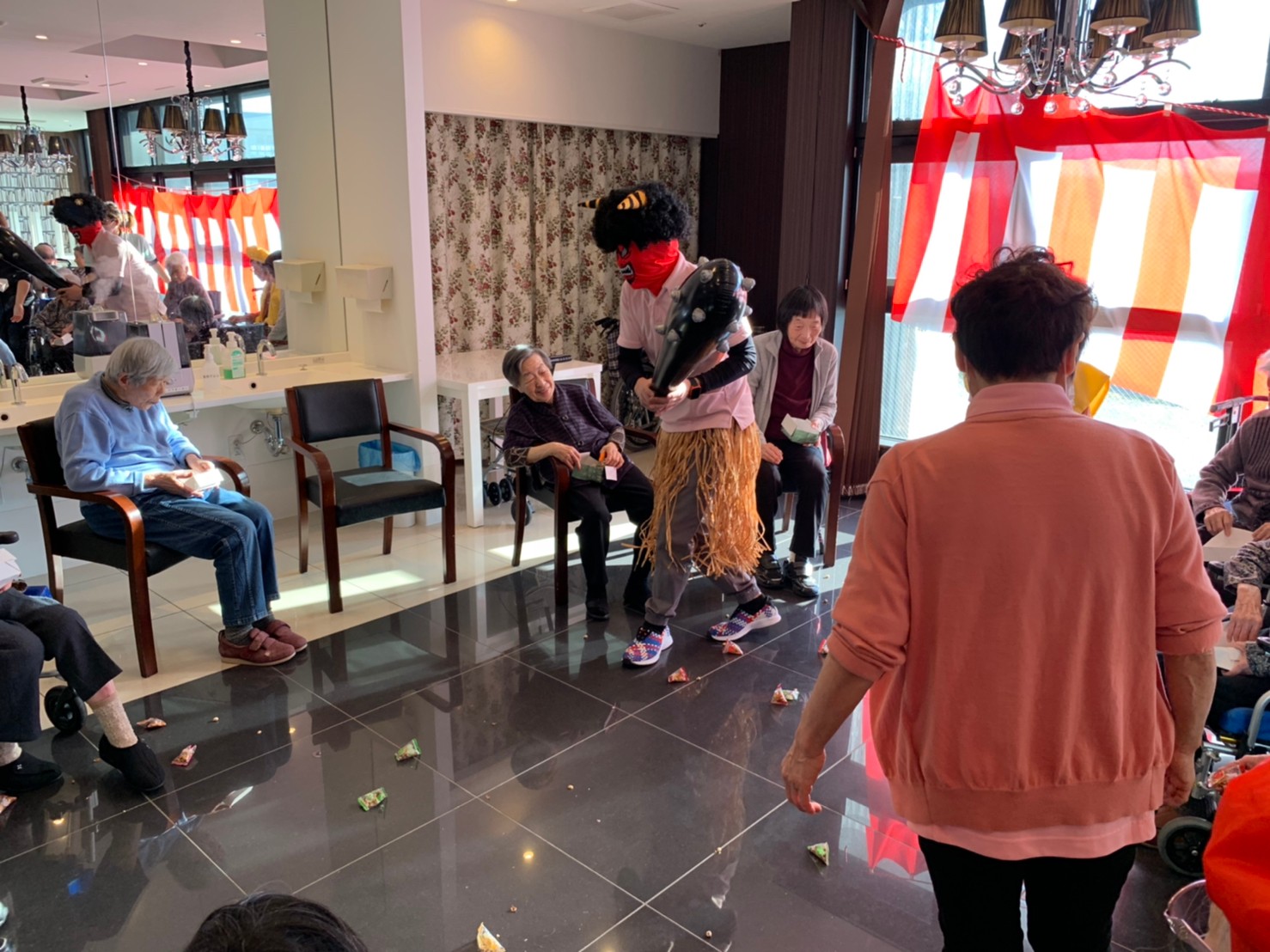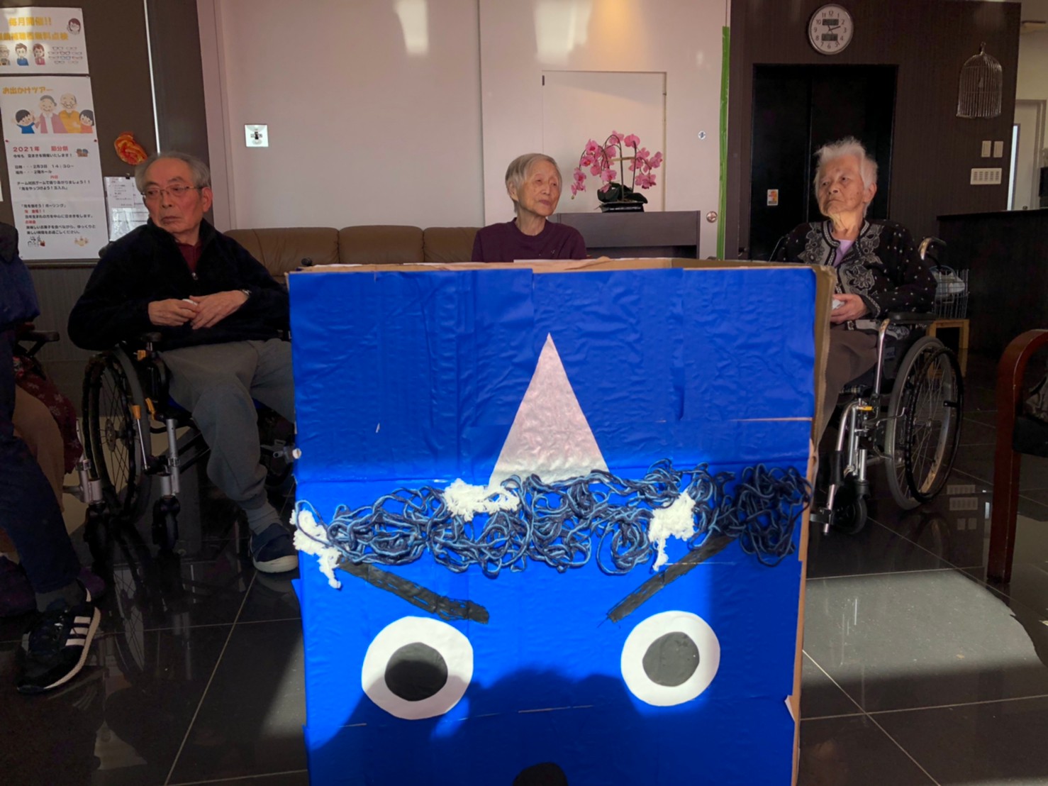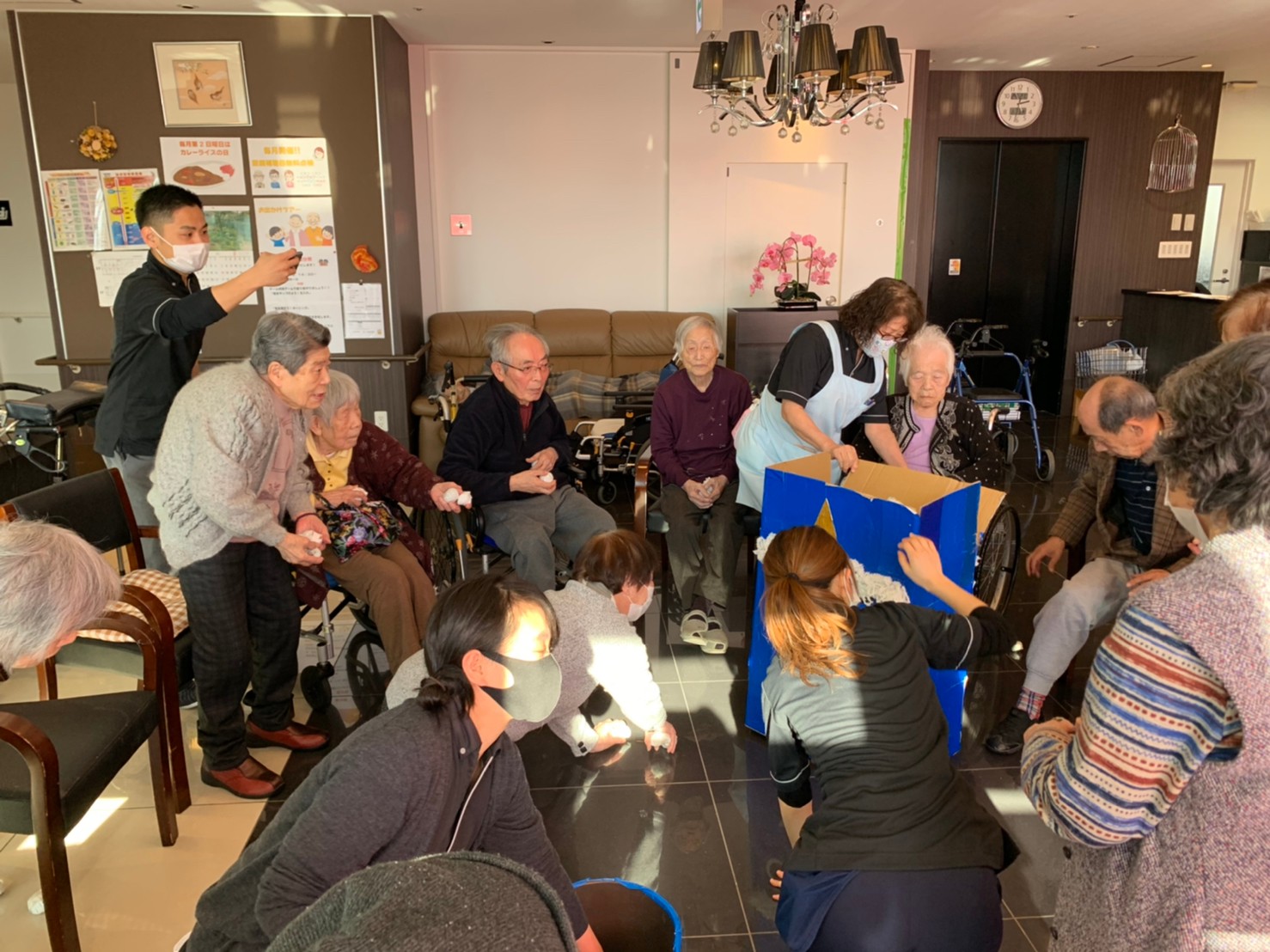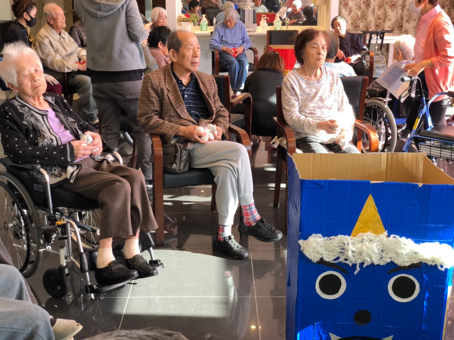 サニープレイス河瀬の月1イベントを本日開催いたしました。2月は節分祭として企画し、豆まきにちなんだミニ運動会を行いました。豆に見立てて玉入れやボーリングのピンを鬼に見立て倒しました。ちなみに玉入れに使った赤鬼のサニーちゃんと青鬼のプレイスくんは利用者さまとスタッフの共同制作です。そのあとは恒例の鬼退治です。今年から衣装も新調されたスタッフ扮する鬼に利用者さまに退治していただきました。悪さをする鬼がなぜか人気で利用者さまが握手をされました(笑)鬼の金棒は空気で膨らますビニール製ですのでご安心ください。最後はこのイベント大トリの福娘の登場です。社内選考会を何度もかさね、名誉ある今年の福娘に選ばれたスタッフが利用者さまとお一人ずつお話をしながら記念撮影をいたしました。ボクも来年の福娘選考会に応募すると言ったら、スタッフ全員から来年も鬼やで!と止められたのはここだけのお話です(‘Д’)