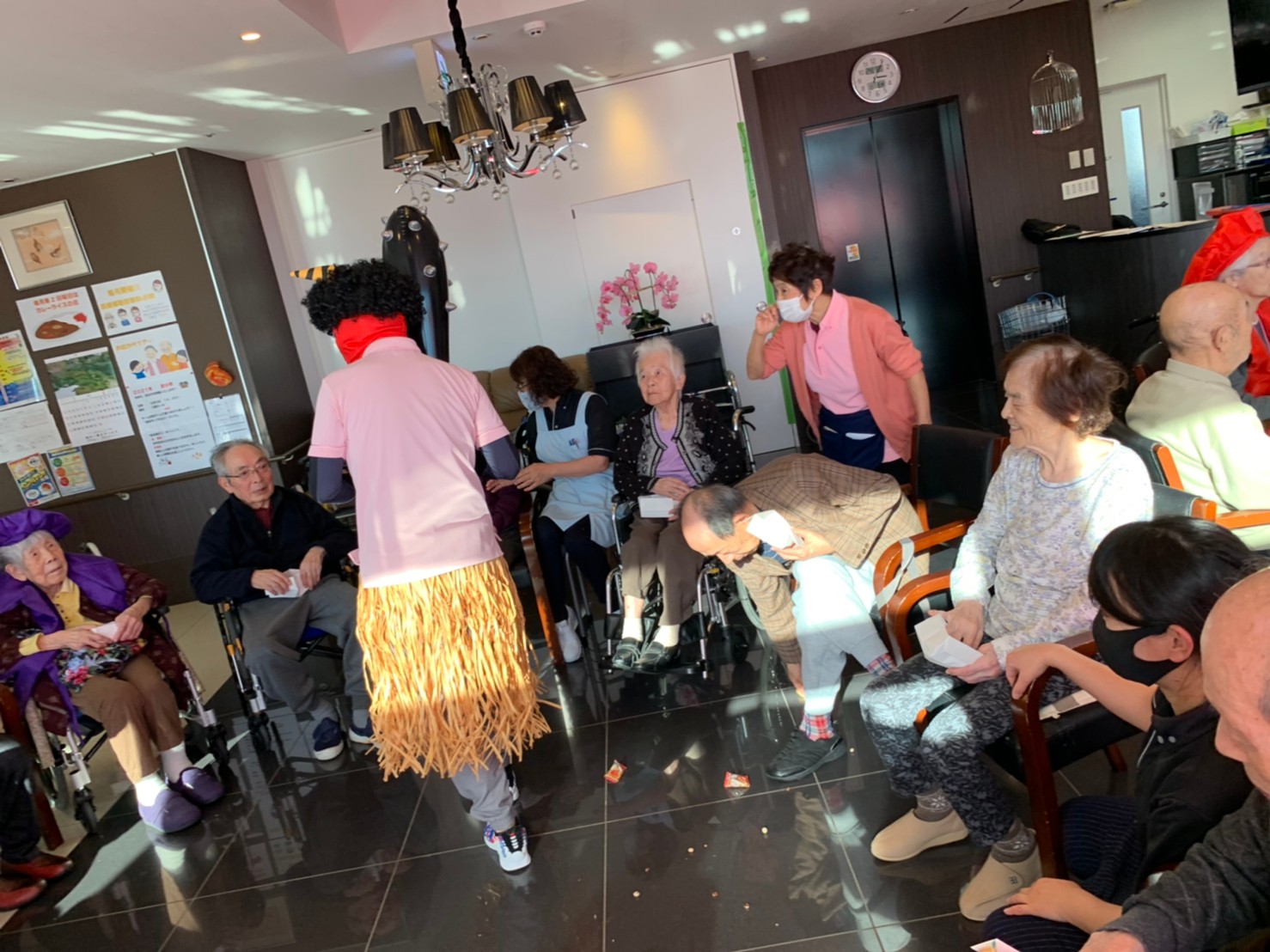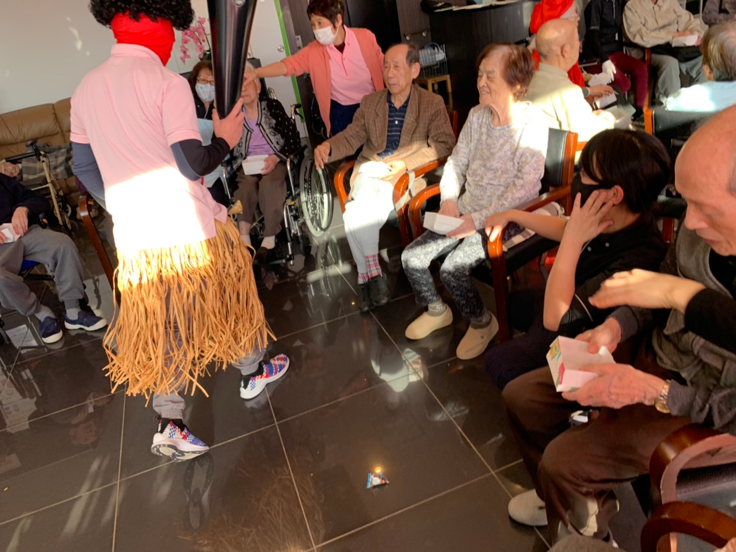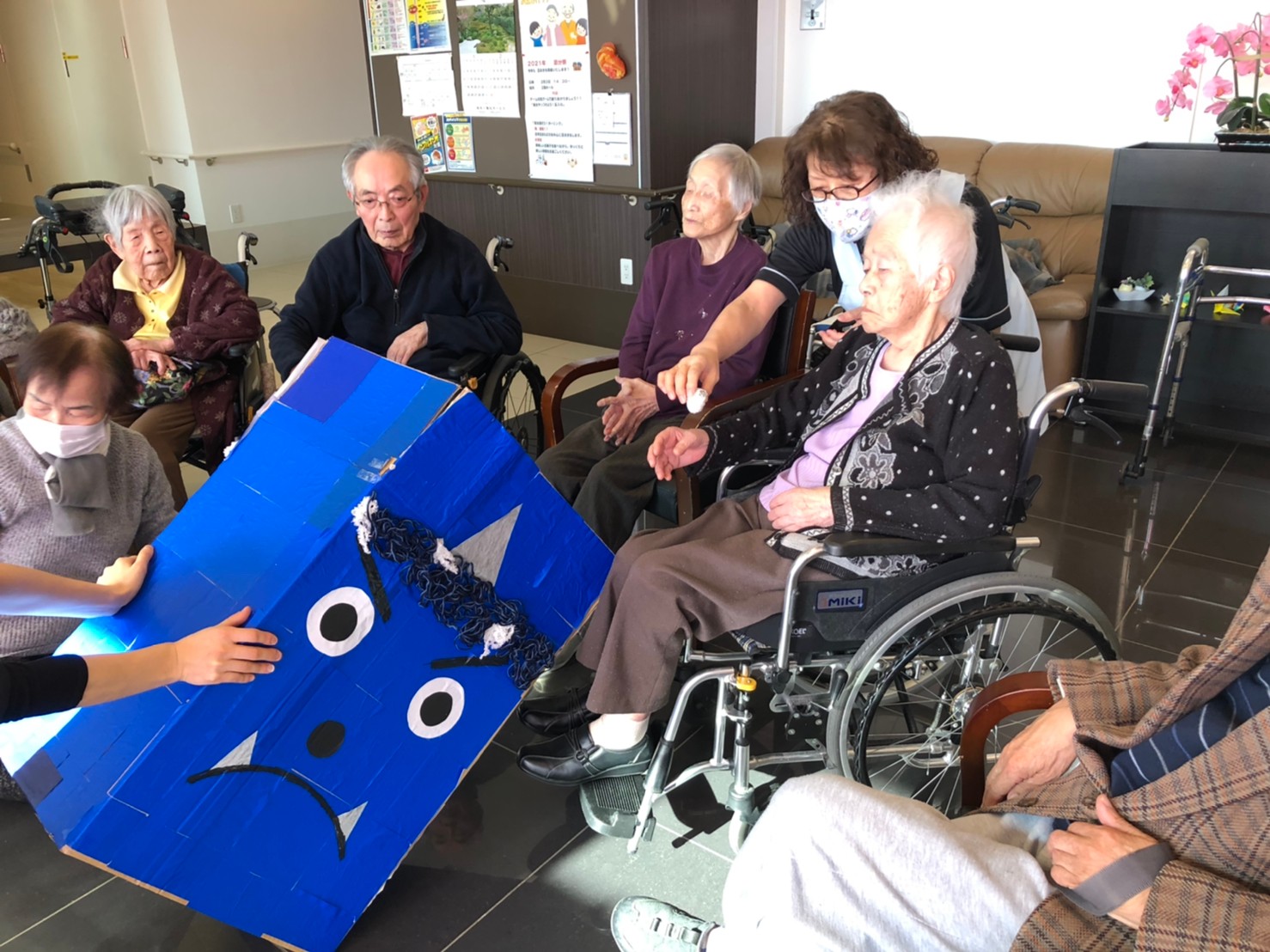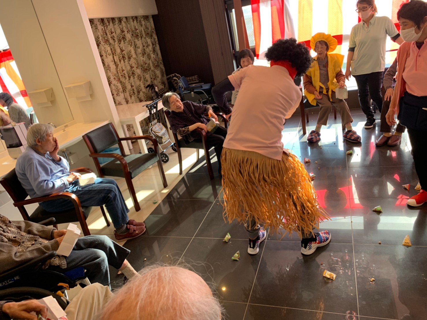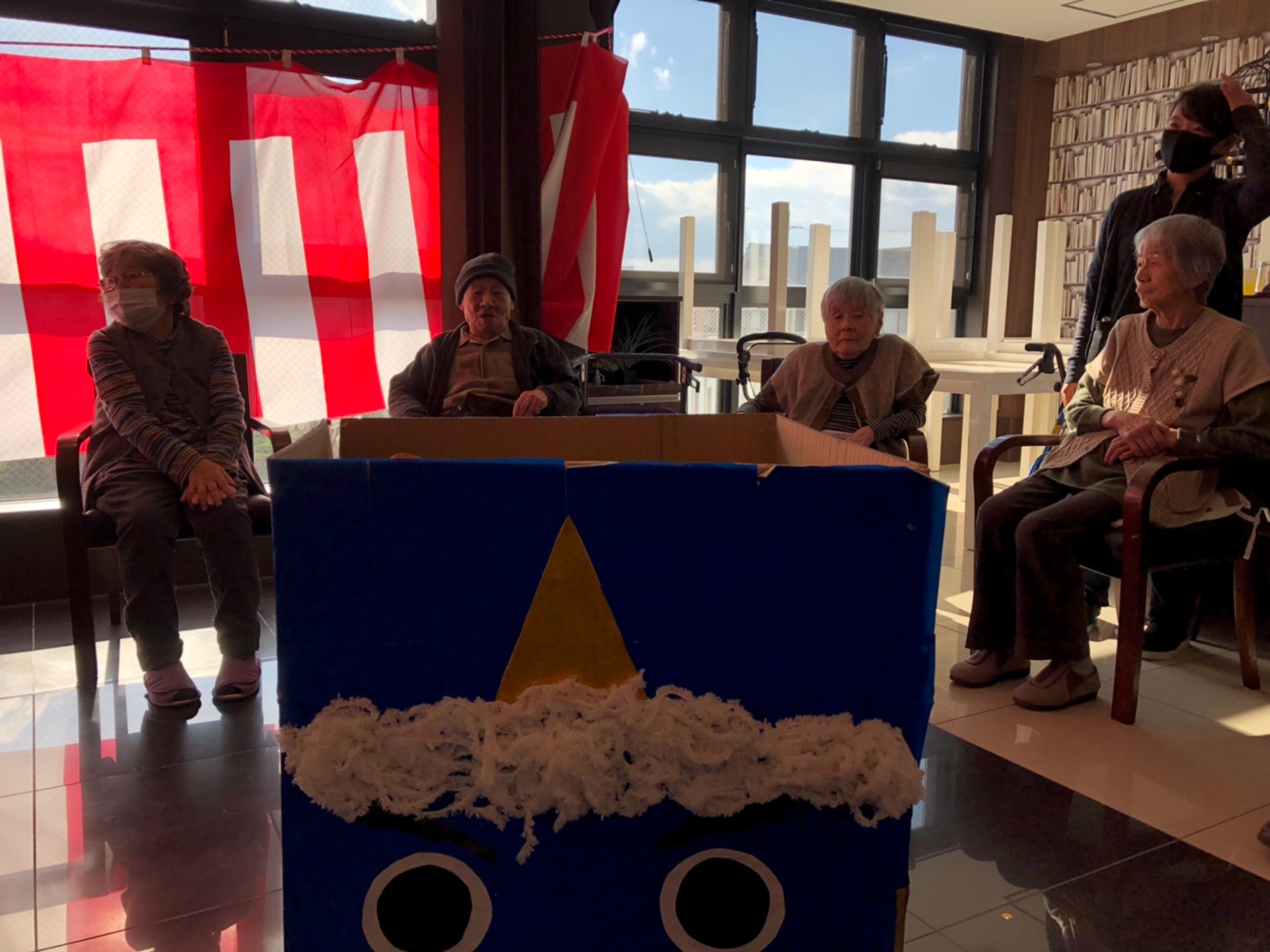サニープレイス河瀬の月1イベントを本日開催いたしました。2月は節分祭として企画し、豆まきにちなんだミニ運動会を行いました。豆に見立てて玉入れやボーリングのピンを鬼に見立て倒しました。ちなみに玉入れに使った赤鬼のサニーちゃんと青鬼のプレイスくんは利用者さまとスタッフの共同制作です。そのあとは恒例の鬼退治です。今年から衣装も新調されたスタッフ扮する鬼に利用者さまに退治していただきました。悪さをする鬼がなぜか人気で利用者さまが握手をされました(笑)鬼の金棒は空気で膨らますビニール製ですのでご安心ください。最後はこのイベント大トリの福娘の登場です。社内選考会を何度もかさね、名誉ある今年の福娘に選ばれたスタッフが利用者さまとお一人ずつお話をしながら記念撮影をいたしました。ボクも来年の福娘選考会に応募すると言ったら、スタッフ全員から来年も鬼やで!と止められたのはここだけのお話です(‘Д’)