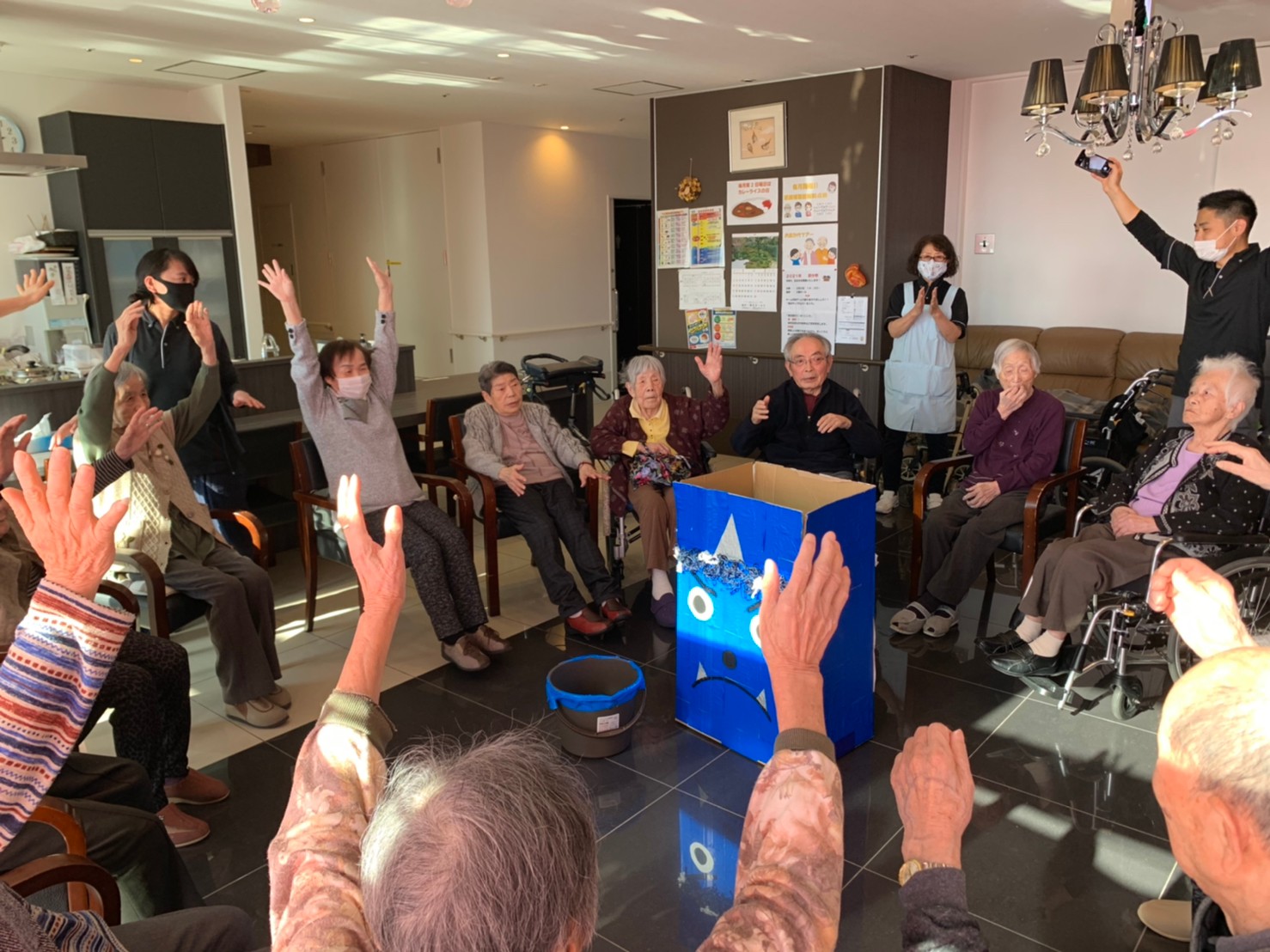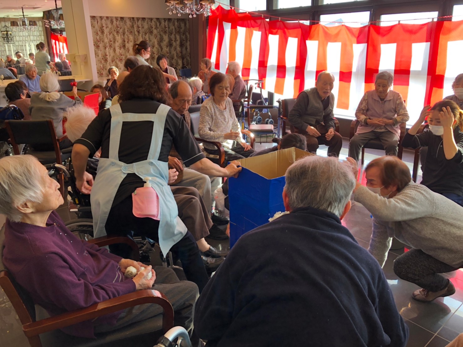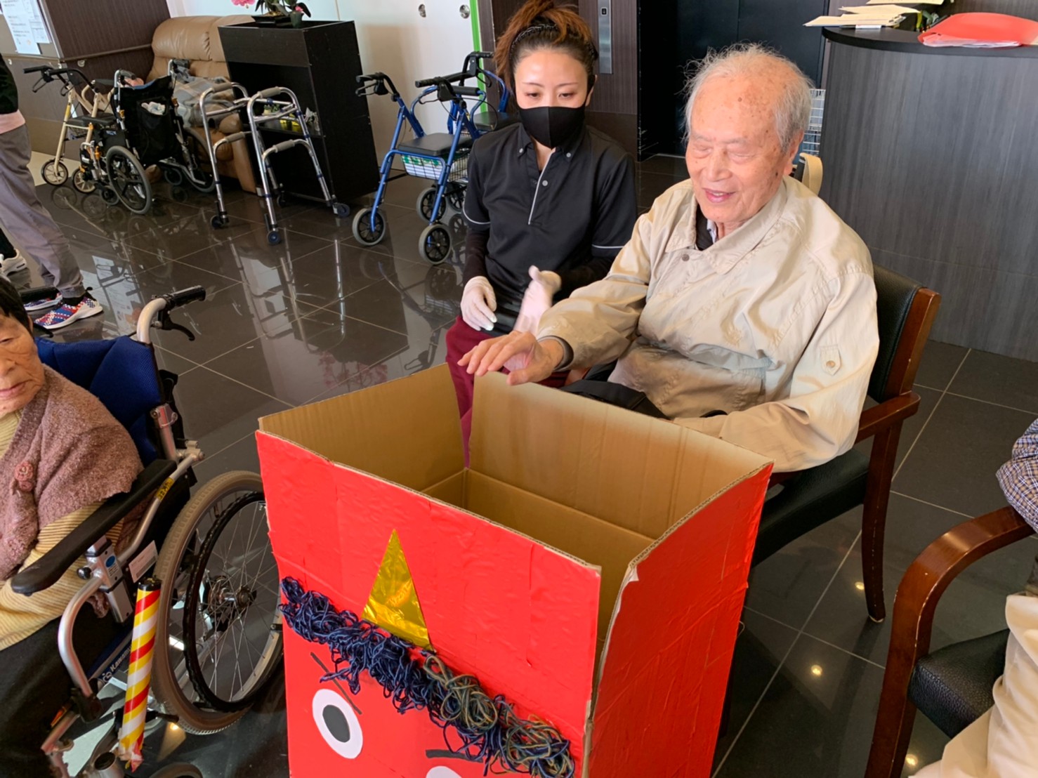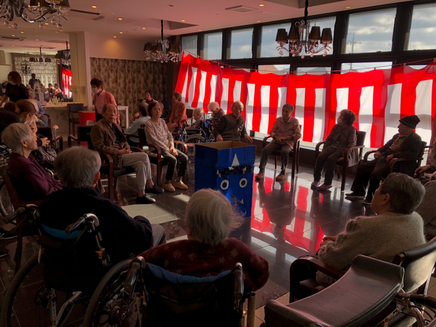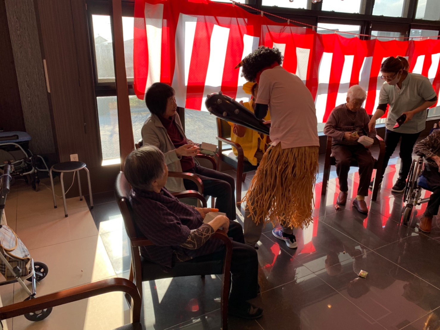 サニープレイス河瀬の月1イベントを本日開催いたしました。2月は節分祭として企画し、豆まきにちなんだミニ運動会を行いました。豆に見立てて玉入れやボーリングのピンを鬼に見立て倒しました。ちなみに玉入れに使った赤鬼のサニーちゃんと青鬼のプレイスくんは利用者さまとスタッフの共同制作です。そのあとは恒例の鬼退治です。今年から衣装も新調されたスタッフ扮する鬼に利用者さまに退治していただきました。悪さをする鬼がなぜか人気で利用者さまが握手をされました(笑)鬼の金棒は空気で膨らますビニール製ですのでご安心ください。最後はこのイベント大トリの福娘の登場です。社内選考会を何度もかさね、名誉ある今年の福娘に選ばれたスタッフが利用者さまとお一人ずつお話をしながら記念撮影をいたしました。ボクも来年の福娘選考会に応募すると言ったら、スタッフ全員から来年も鬼やで!と止められたのはここだけのお話です(‘Д’)