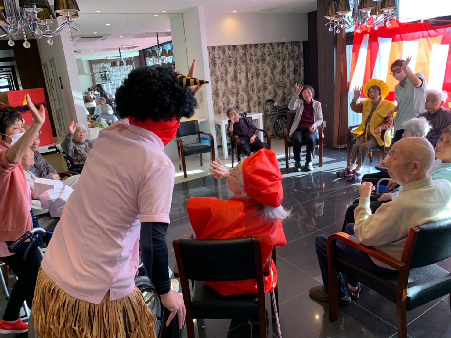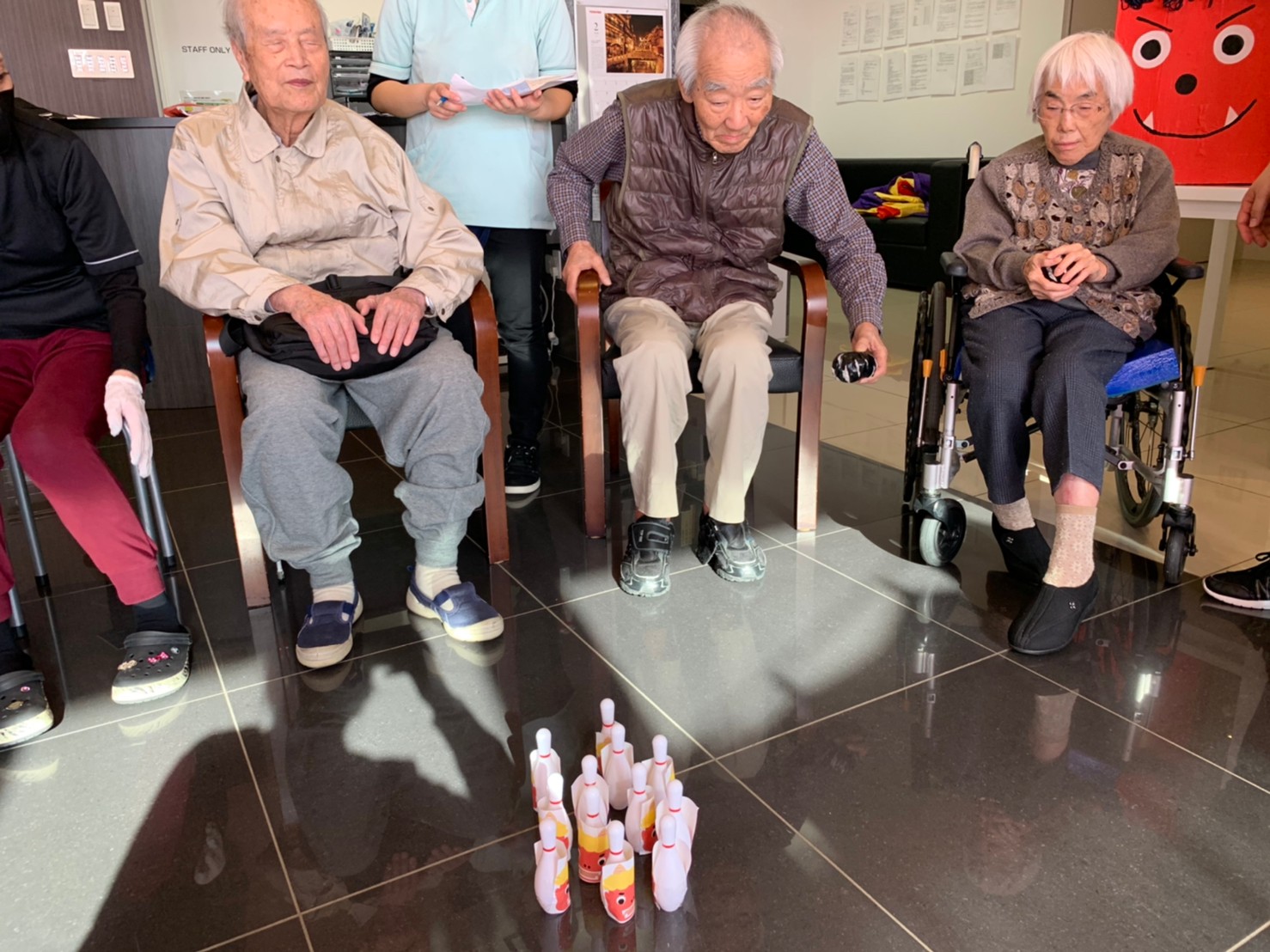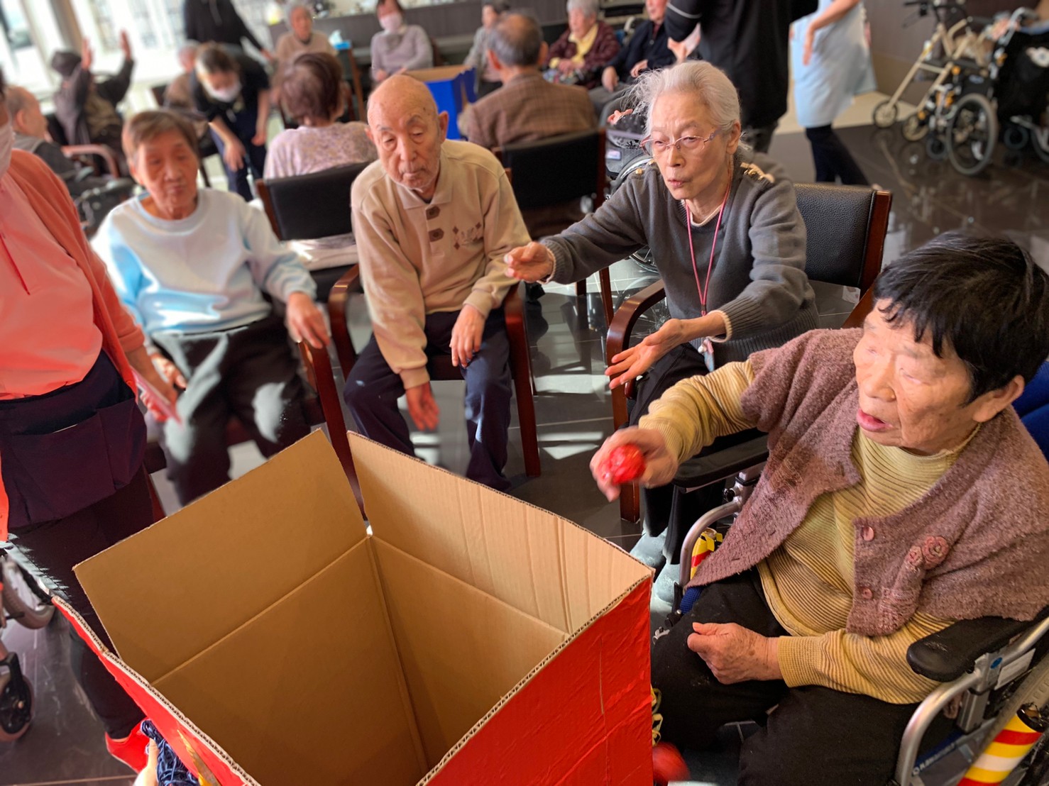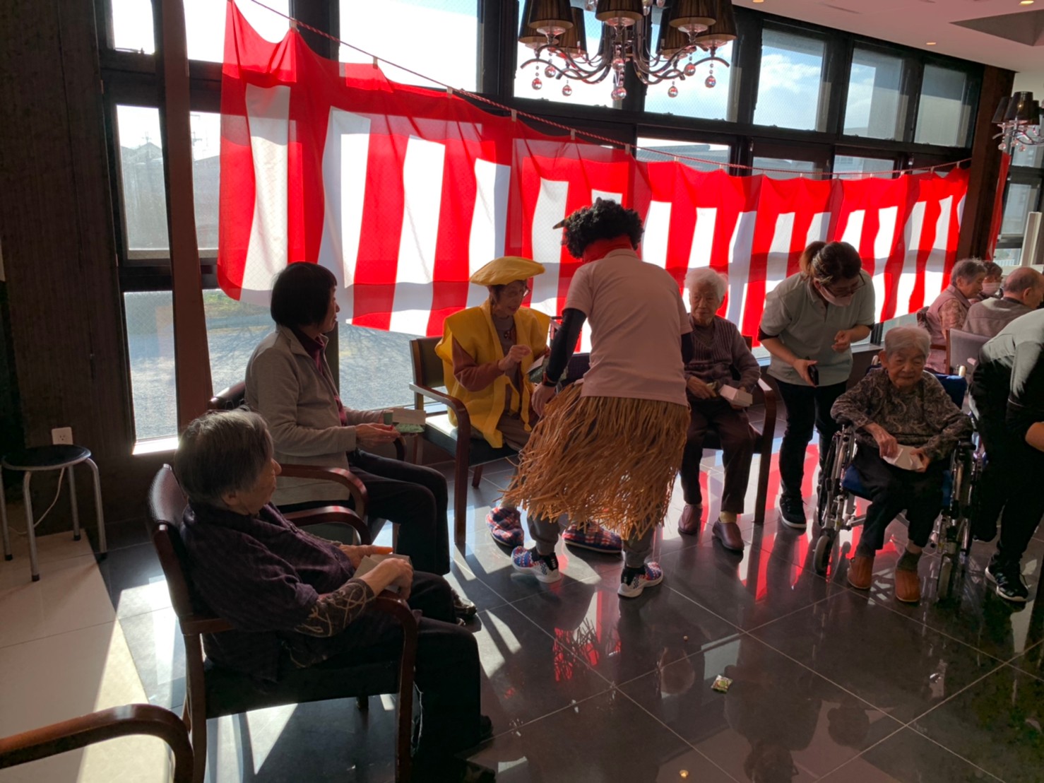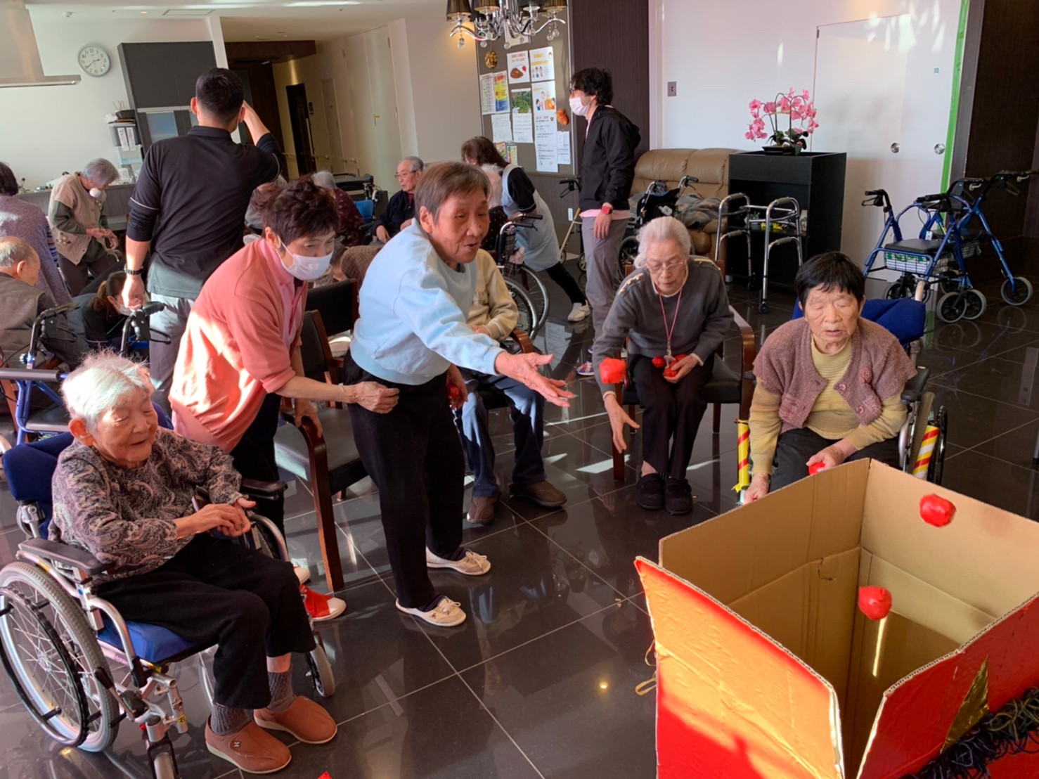 サニープレイス河瀬の月1イベントを本日開催いたしました。2月は節分祭として企画し、豆まきにちなんだミニ運動会を行いました。豆に見立てて玉入れやボーリングのピンを鬼に見立て倒しました。ちなみに玉入れに使った赤鬼のサニーちゃんと青鬼のプレイスくんは利用者さまとスタッフの共同制作です。そのあとは恒例の鬼退治です。今年から衣装も新調されたスタッフ扮する鬼に利用者さまに退治していただきました。悪さをする鬼がなぜか人気で利用者さまが握手をされました(笑)鬼の金棒は空気で膨らますビニール製ですのでご安心ください。最後はこのイベント大トリの福娘の登場です。社内選考会を何度もかさね、名誉ある今年の福娘に選ばれたスタッフが利用者さまとお一人ずつお話をしながら記念撮影をいたしました。ボクも来年の福娘選考会に応募すると言ったら、スタッフ全員から来年も鬼やで!と止められたのはここだけのお話です(‘Д’)
