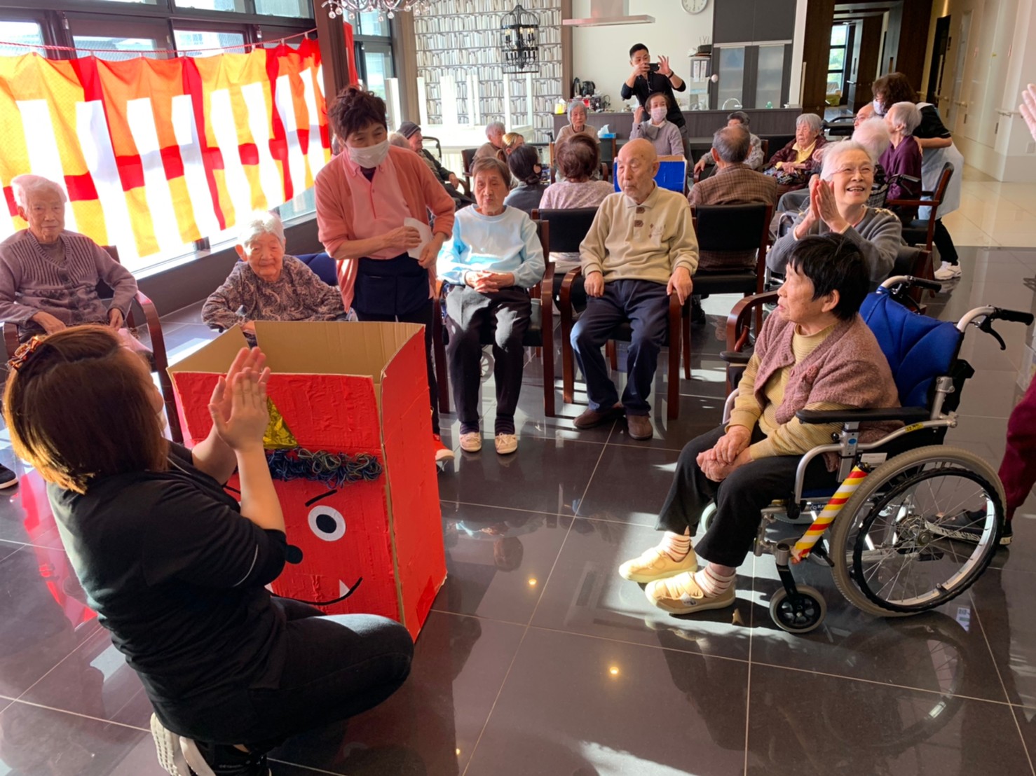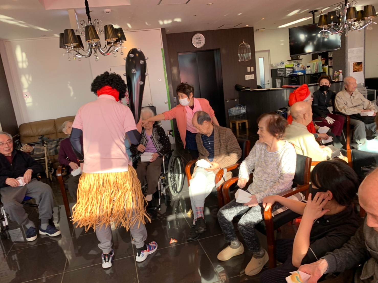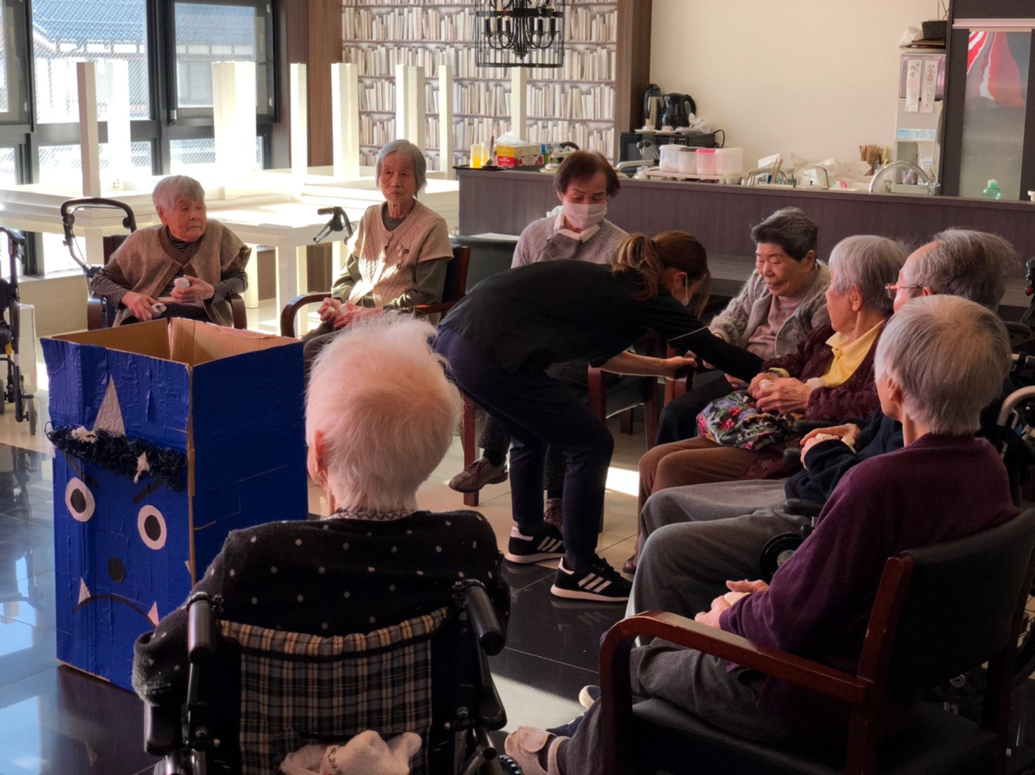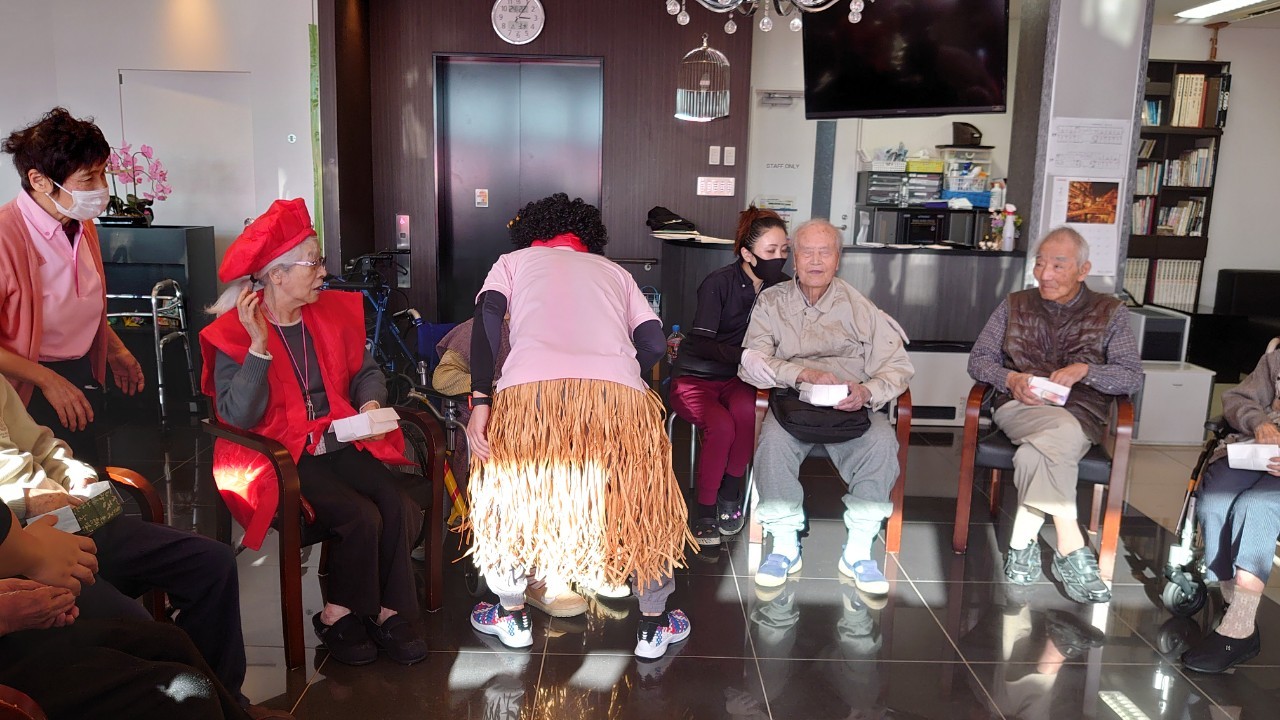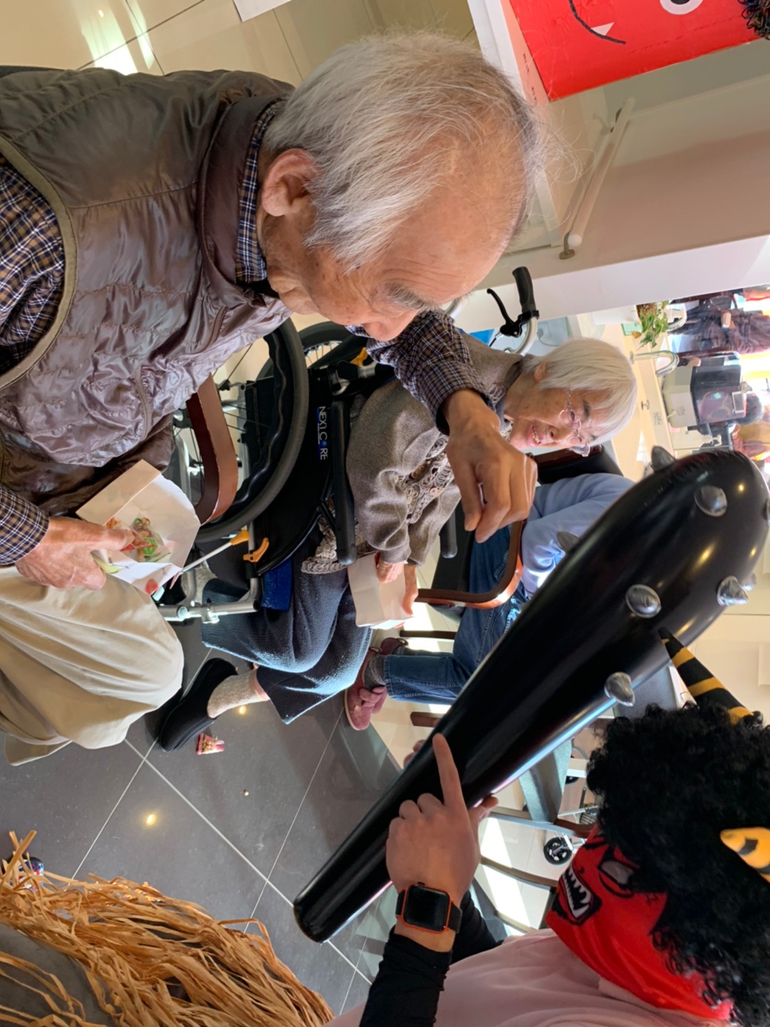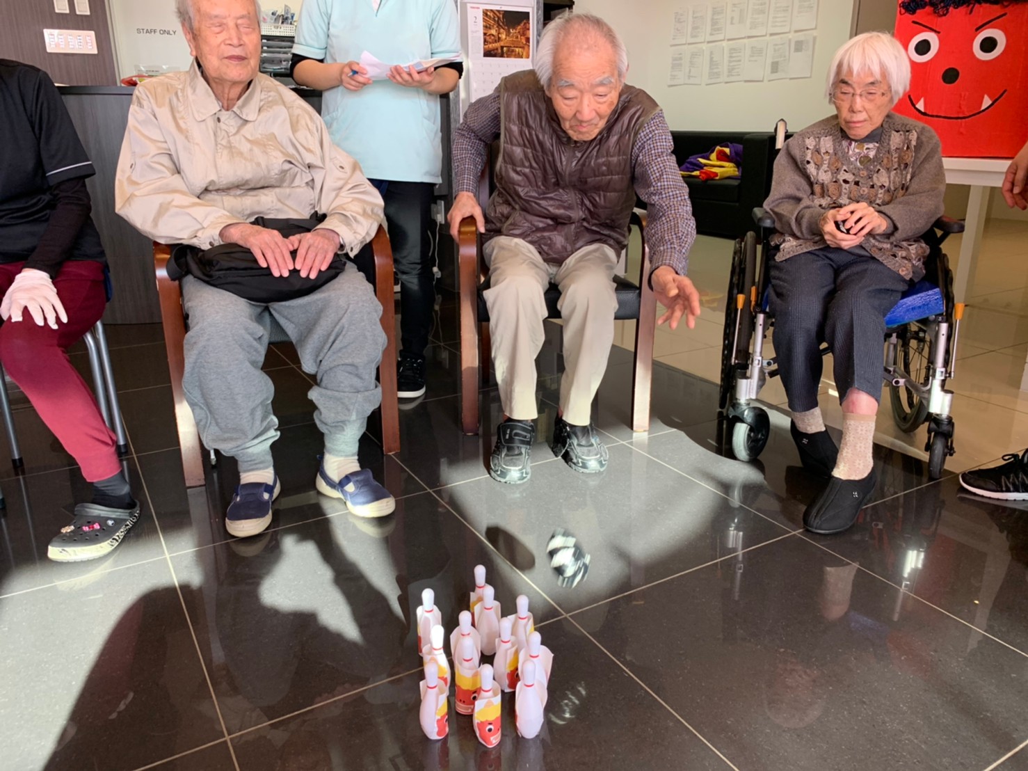 サニープレイス河瀬の月1イベントを本日開催いたしました。2月は節分祭として企画し、豆まきにちなんだミニ運動会を行いました。豆に見立てて玉入れやボーリングのピンを鬼に見立て倒しました。ちなみに玉入れに使った赤鬼のサニーちゃんと青鬼のプレイスくんは利用者さまとスタッフの共同制作です。そのあとは恒例の鬼退治です。今年から衣装も新調されたスタッフ扮する鬼に利用者さまに退治していただきました。悪さをする鬼がなぜか人気で利用者さまが握手をされました(笑)鬼の金棒は空気で膨らますビニール製ですのでご安心ください。最後はこのイベント大トリの福娘の登場です。社内選考会を何度もかさね、名誉ある今年の福娘に選ばれたスタッフが利用者さまとお一人ずつお話をしながら記念撮影をいたしました。ボクも来年の福娘選考会に応募すると言ったら、スタッフ全員から来年も鬼やで!と止められたのはここだけのお話です(‘Д’)