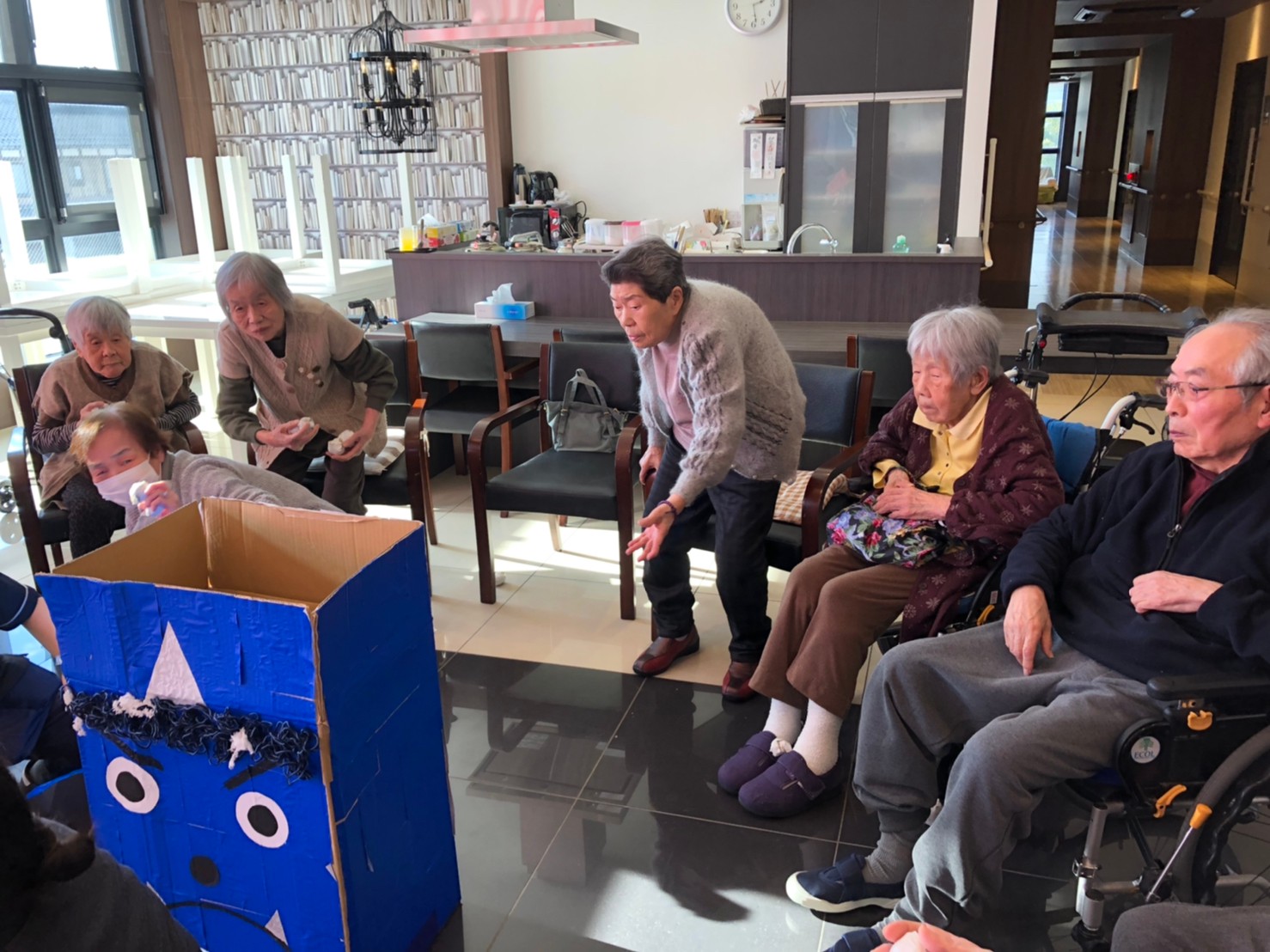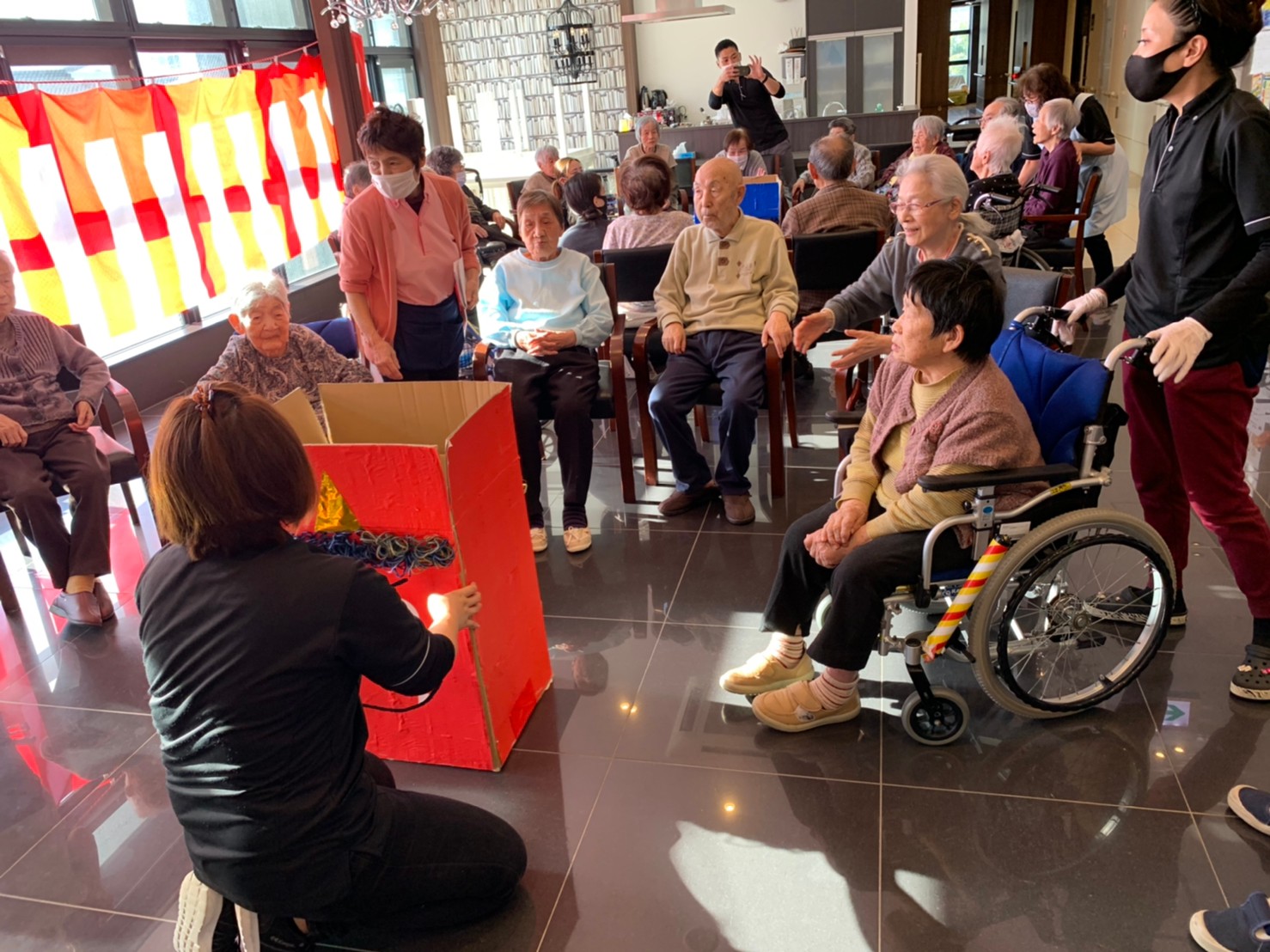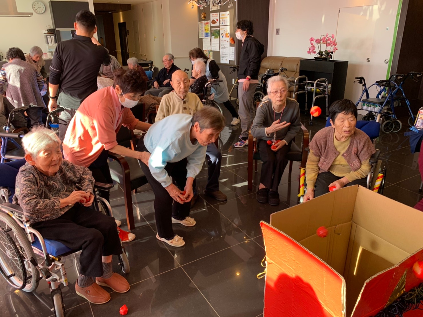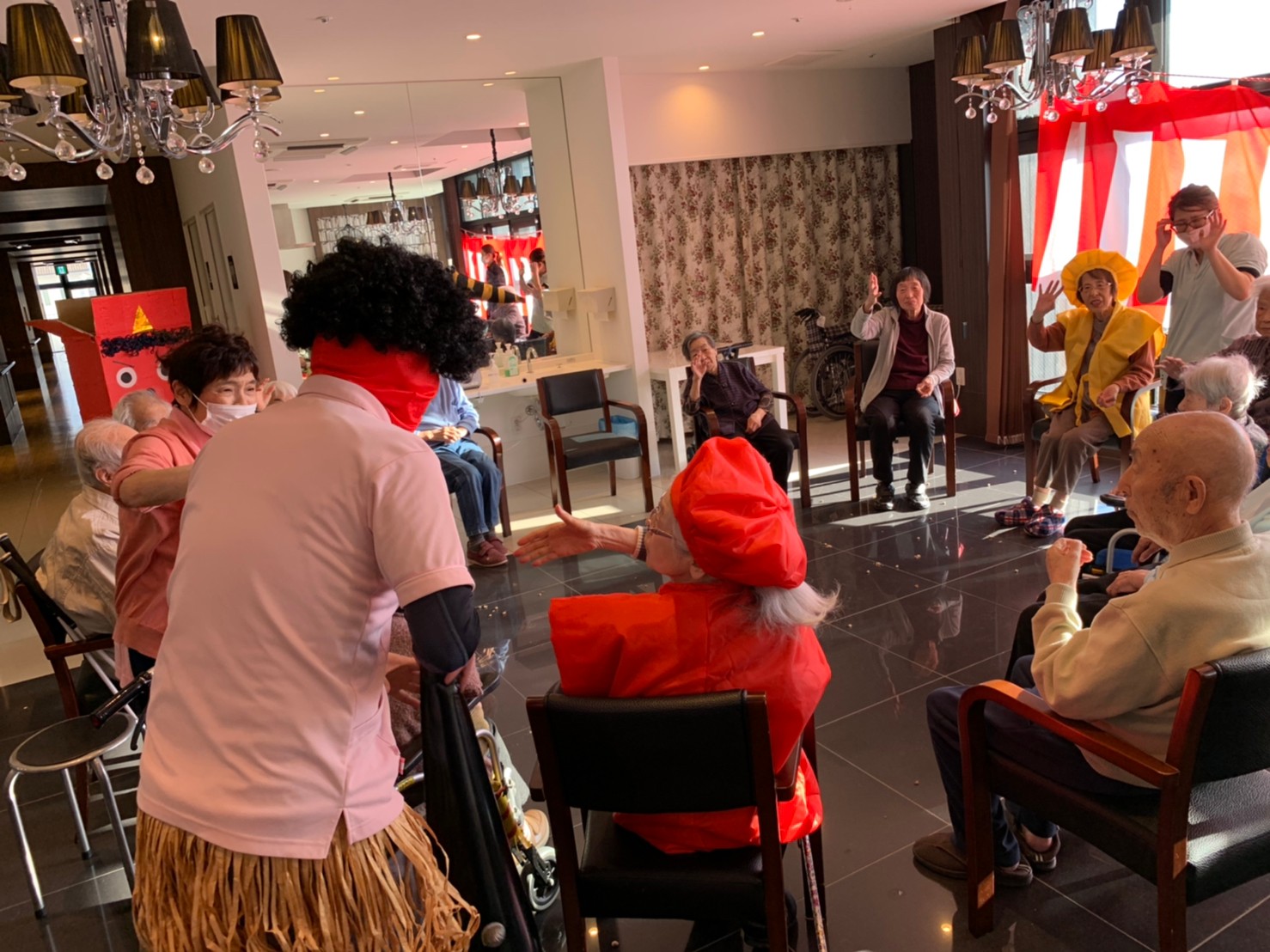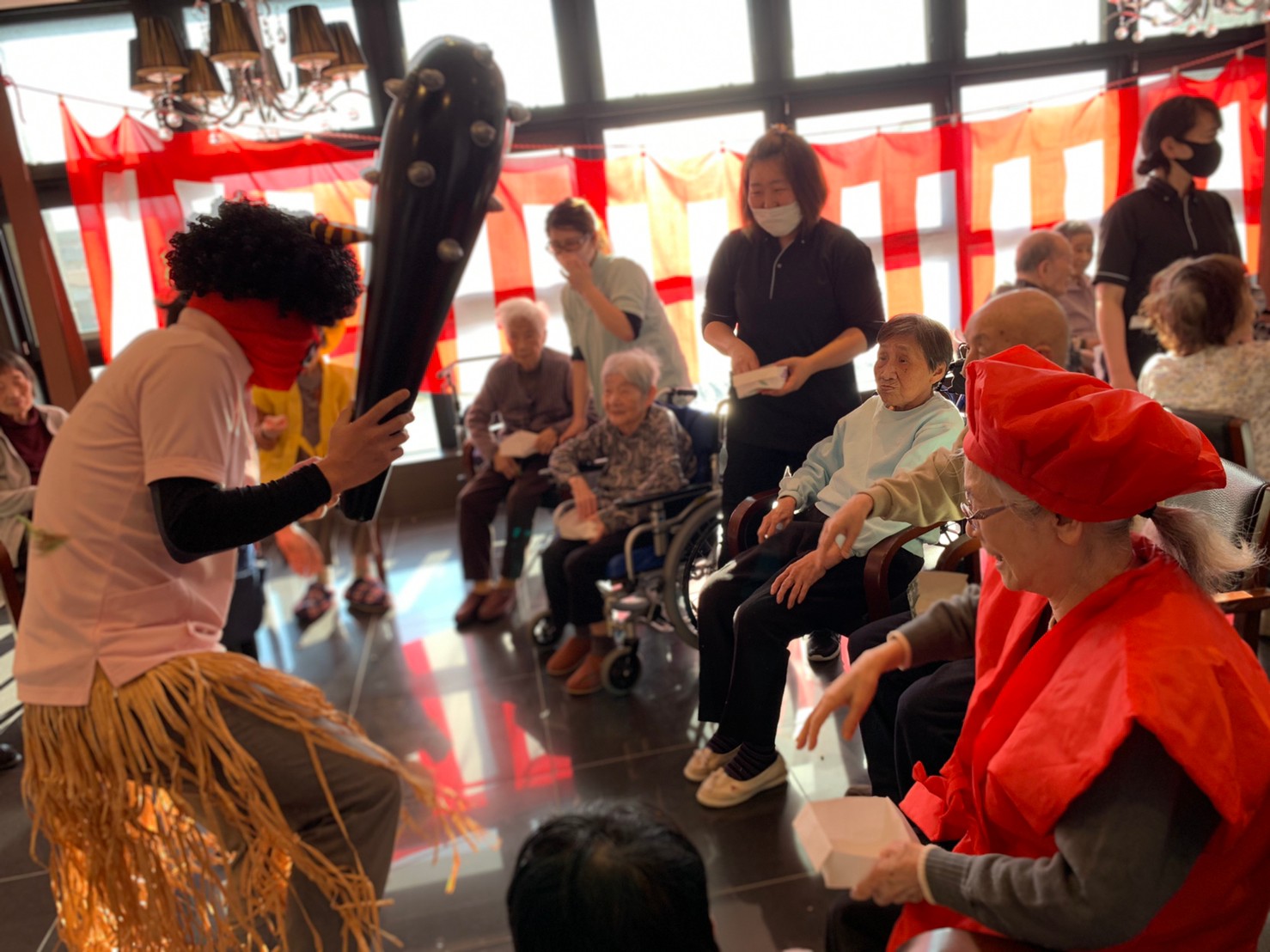 サニープレイス河瀬の月1イベントを本日開催いたしました。2月は節分祭として企画し、豆まきにちなんだミニ運動会を行いました。豆に見立てて玉入れやボーリングのピンを鬼に見立て倒しました。ちなみに玉入れに使った赤鬼のサニーちゃんと青鬼のプレイスくんは利用者さまとスタッフの共同制作です。そのあとは恒例の鬼退治です。今年から衣装も新調されたスタッフ扮する鬼に利用者さまに退治していただきました。悪さをする鬼がなぜか人気で利用者さまが握手をされました(笑)鬼の金棒は空気で膨らますビニール製ですのでご安心ください。最後はこのイベント大トリの福娘の登場です。社内選考会を何度もかさね、名誉ある今年の福娘に選ばれたスタッフが利用者さまとお一人ずつお話をしながら記念撮影をいたしました。ボクも来年の福娘選考会に応募すると言ったら、スタッフ全員から来年も鬼やで!と止められたのはここだけのお話です(‘Д’)