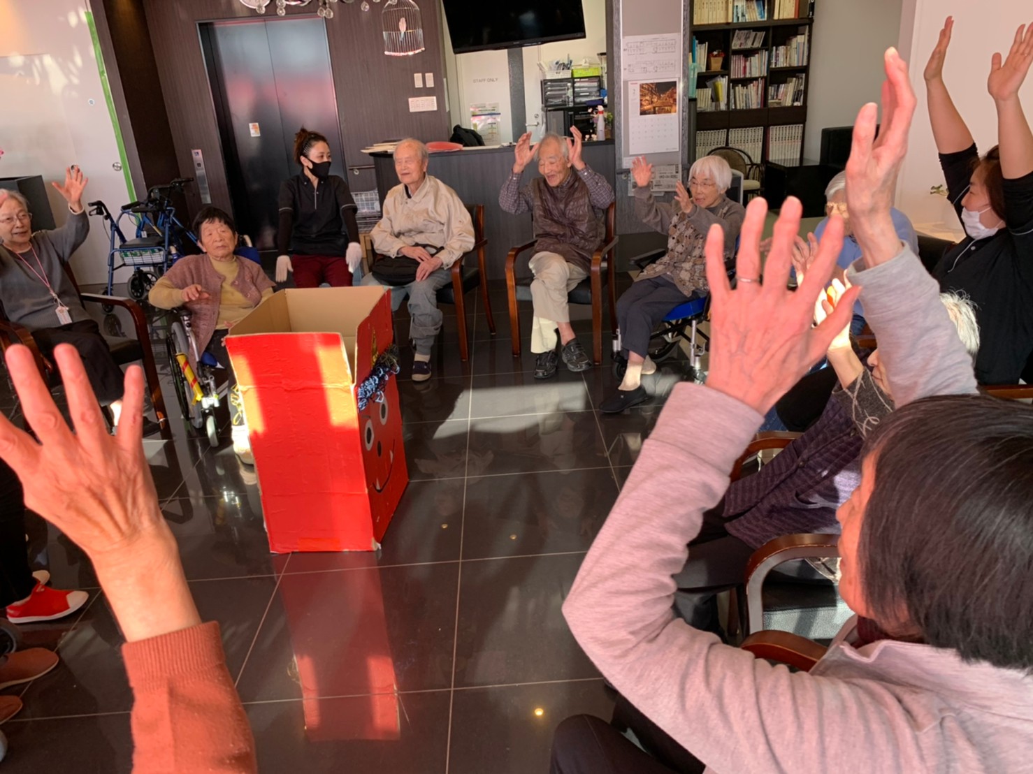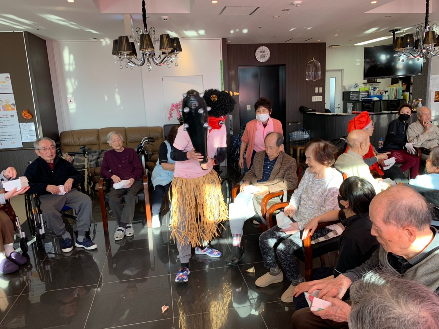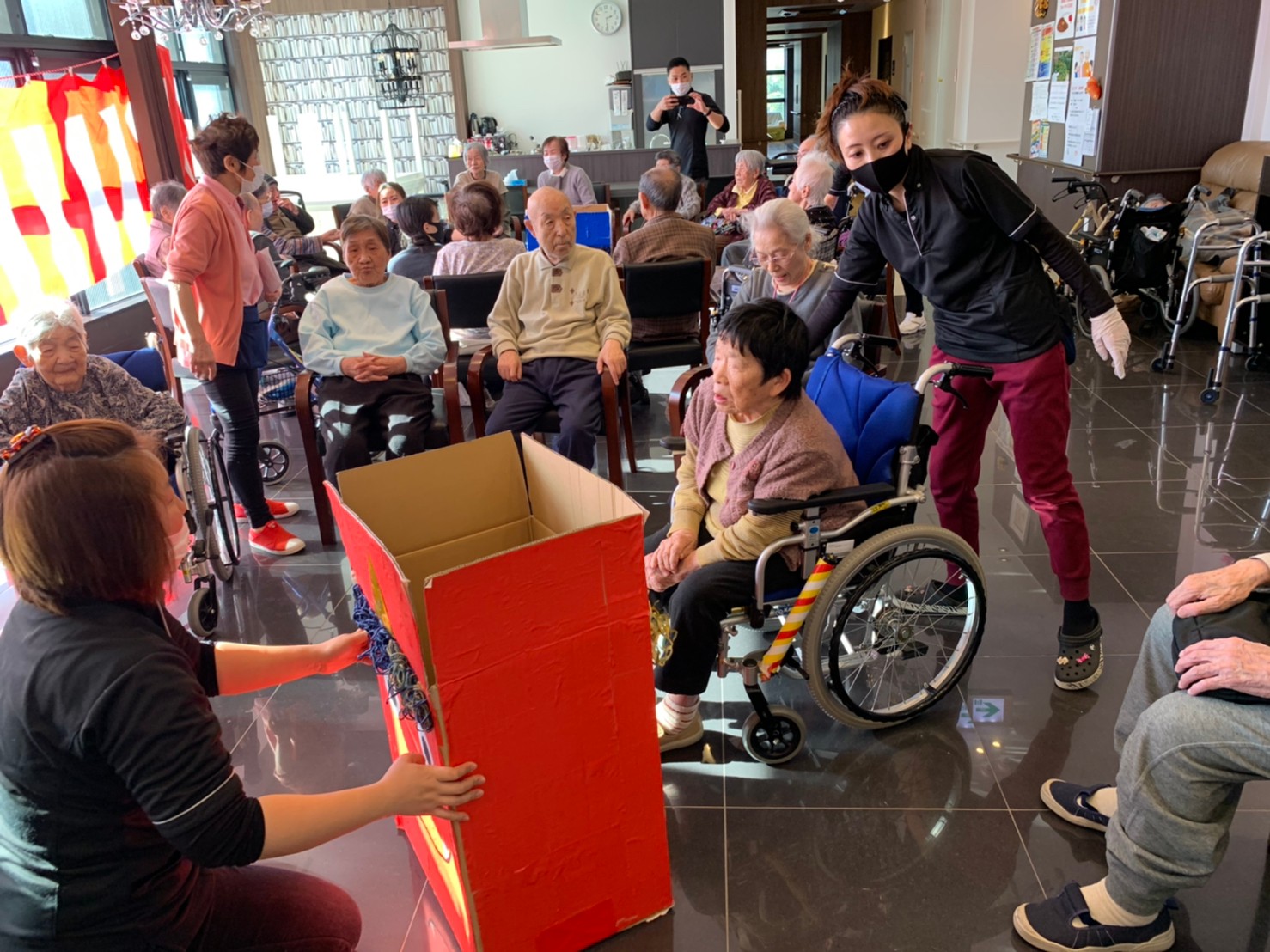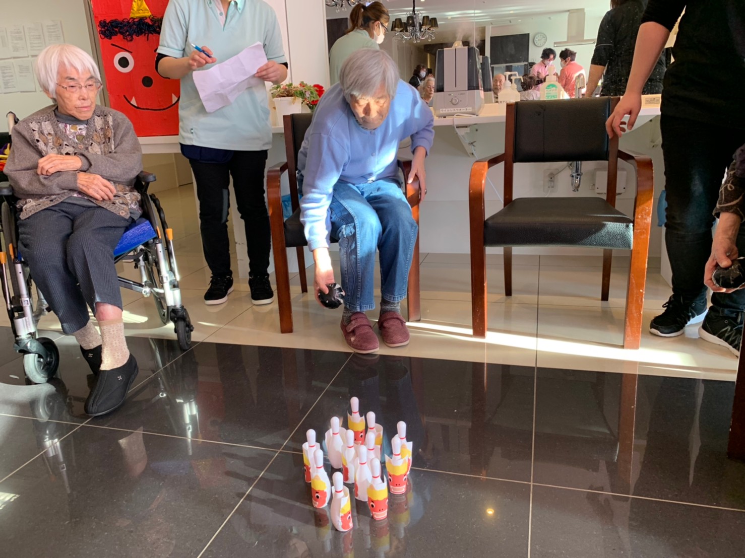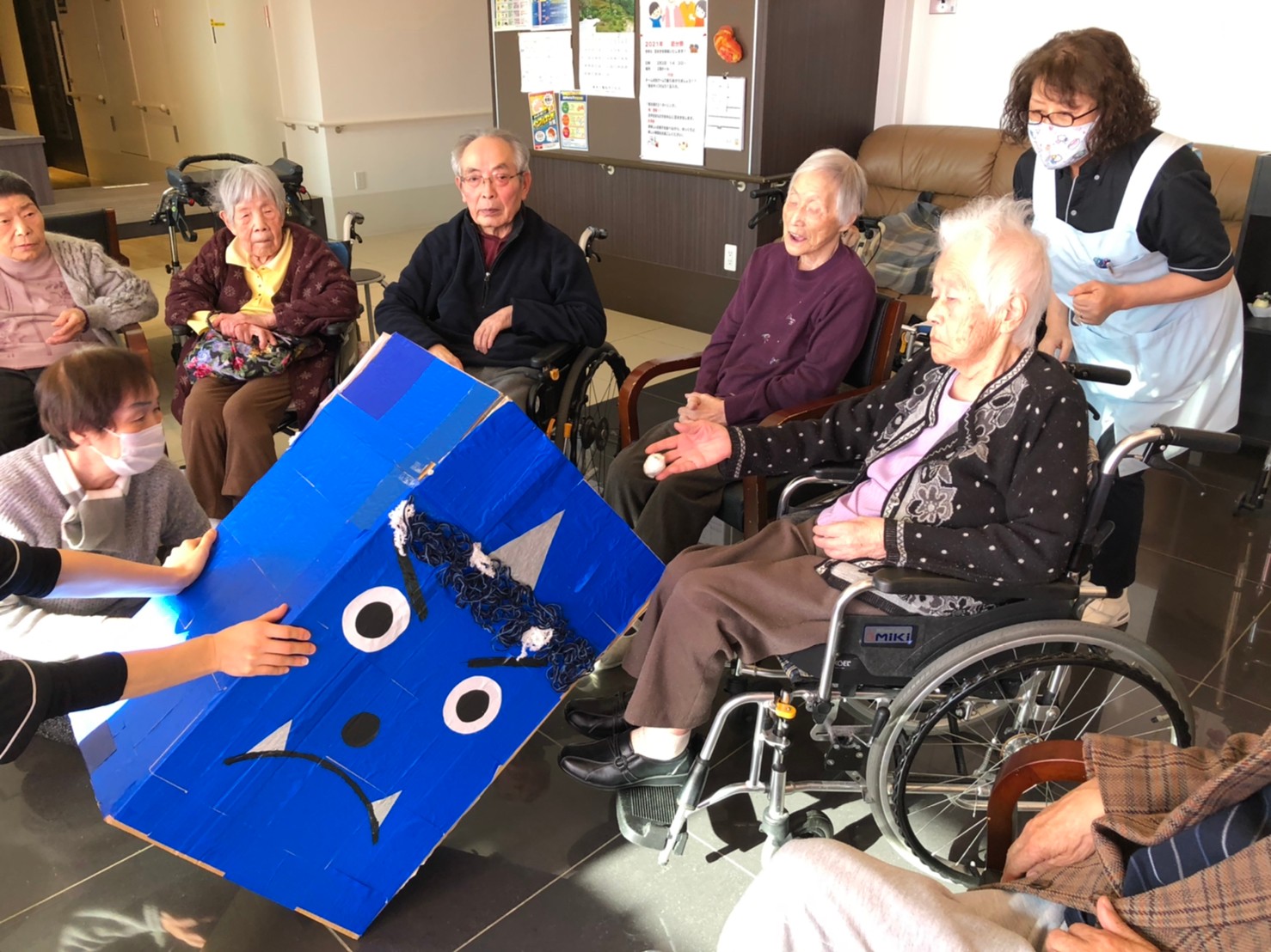 サニープレイス河瀬の月1イベントを本日開催いたしました。2月は節分祭として企画し、豆まきにちなんだミニ運動会を行いました。豆に見立てて玉入れやボーリングのピンを鬼に見立て倒しました。ちなみに玉入れに使った赤鬼のサニーちゃんと青鬼のプレイスくんは利用者さまとスタッフの共同制作です。そのあとは恒例の鬼退治です。今年から衣装も新調されたスタッフ扮する鬼に利用者さまに退治していただきました。悪さをする鬼がなぜか人気で利用者さまが握手をされました(笑)鬼の金棒は空気で膨らますビニール製ですのでご安心ください。最後はこのイベント大トリの福娘の登場です。社内選考会を何度もかさね、名誉ある今年の福娘に選ばれたスタッフが利用者さまとお一人ずつお話をしながら記念撮影をいたしました。ボクも来年の福娘選考会に応募すると言ったら、スタッフ全員から来年も鬼やで!と止められたのはここだけのお話です(‘Д’)