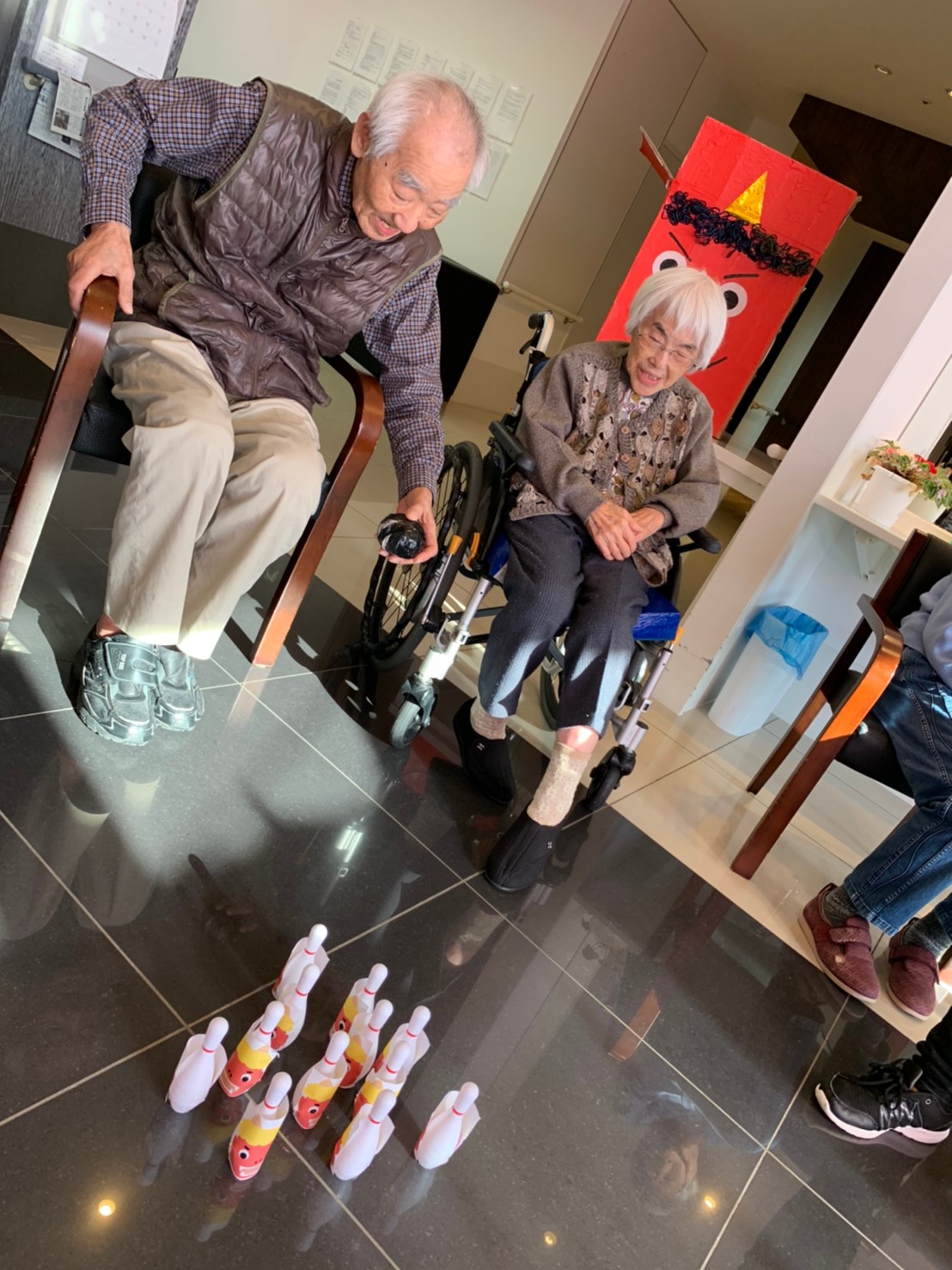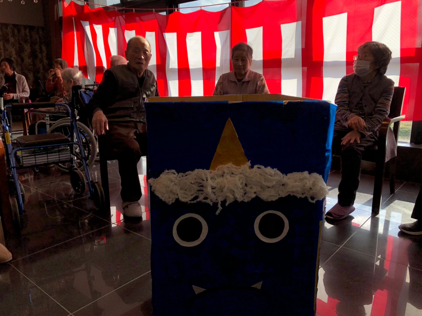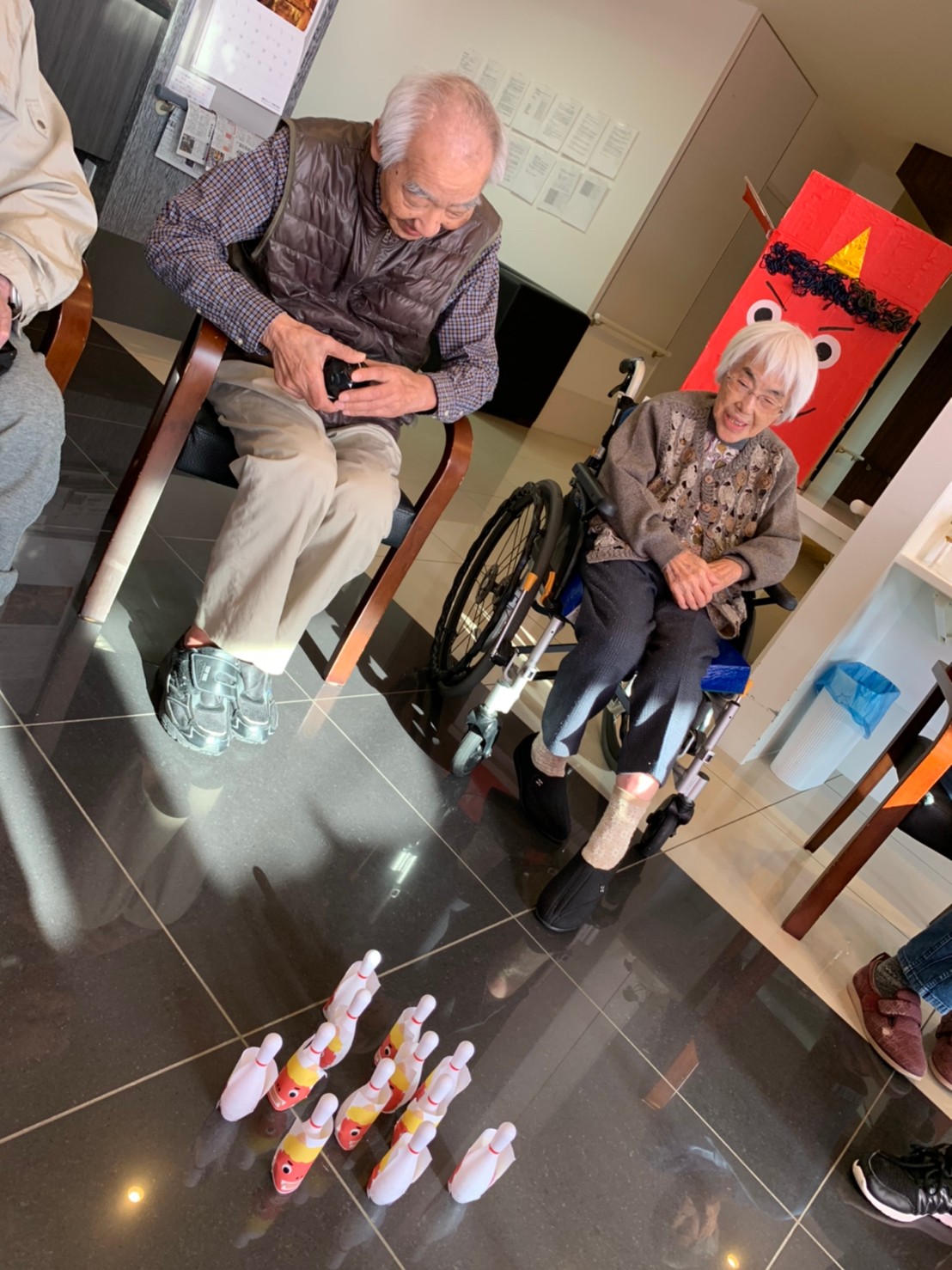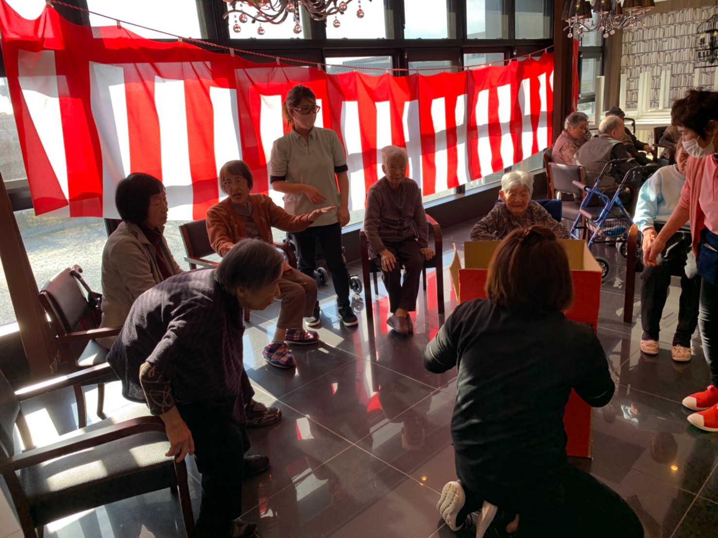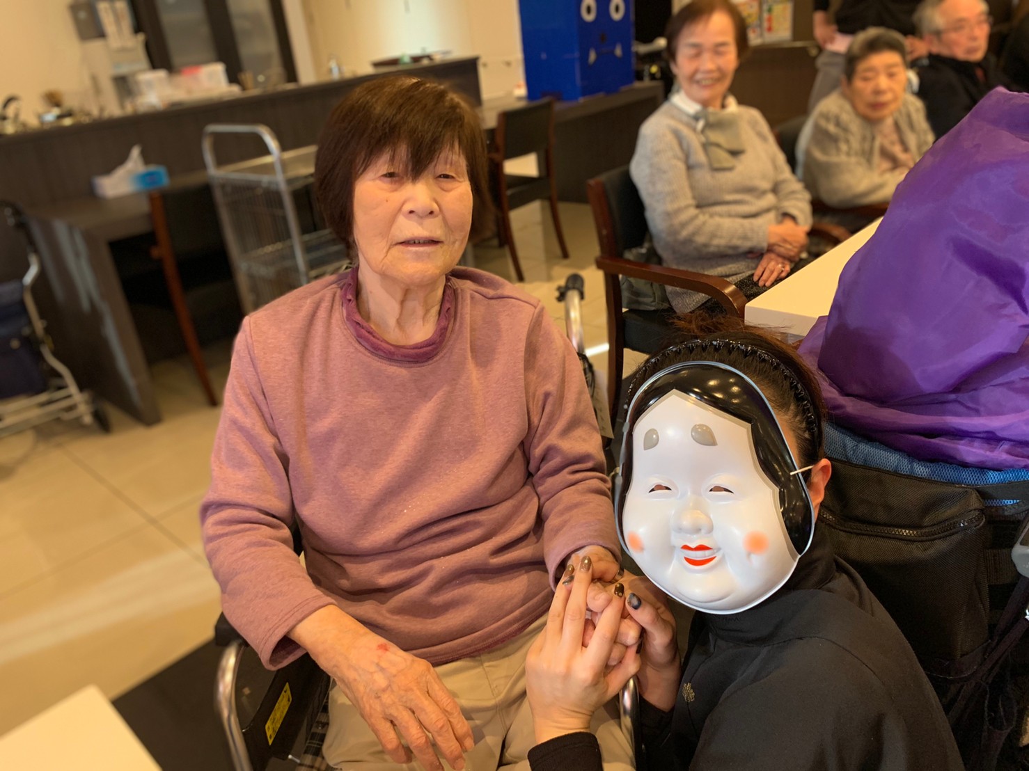 サニープレイス河瀬の月1イベントを本日開催いたしました。2月は節分祭として企画し、豆まきにちなんだミニ運動会を行いました。豆に見立てて玉入れやボーリングのピンを鬼に見立て倒しました。ちなみに玉入れに使った赤鬼のサニーちゃんと青鬼のプレイスくんは利用者さまとスタッフの共同制作です。そのあとは恒例の鬼退治です。今年から衣装も新調されたスタッフ扮する鬼に利用者さまに退治していただきました。悪さをする鬼がなぜか人気で利用者さまが握手をされました(笑)鬼の金棒は空気で膨らますビニール製ですのでご安心ください。最後はこのイベント大トリの福娘の登場です。社内選考会を何度もかさね、名誉ある今年の福娘に選ばれたスタッフが利用者さまとお一人ずつお話をしながら記念撮影をいたしました。ボクも来年の福娘選考会に応募すると言ったら、スタッフ全員から来年も鬼やで!と止められたのはここだけのお話です(‘Д’)