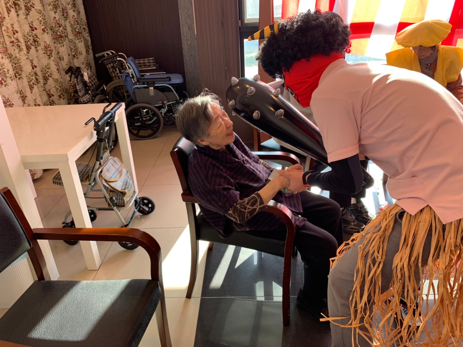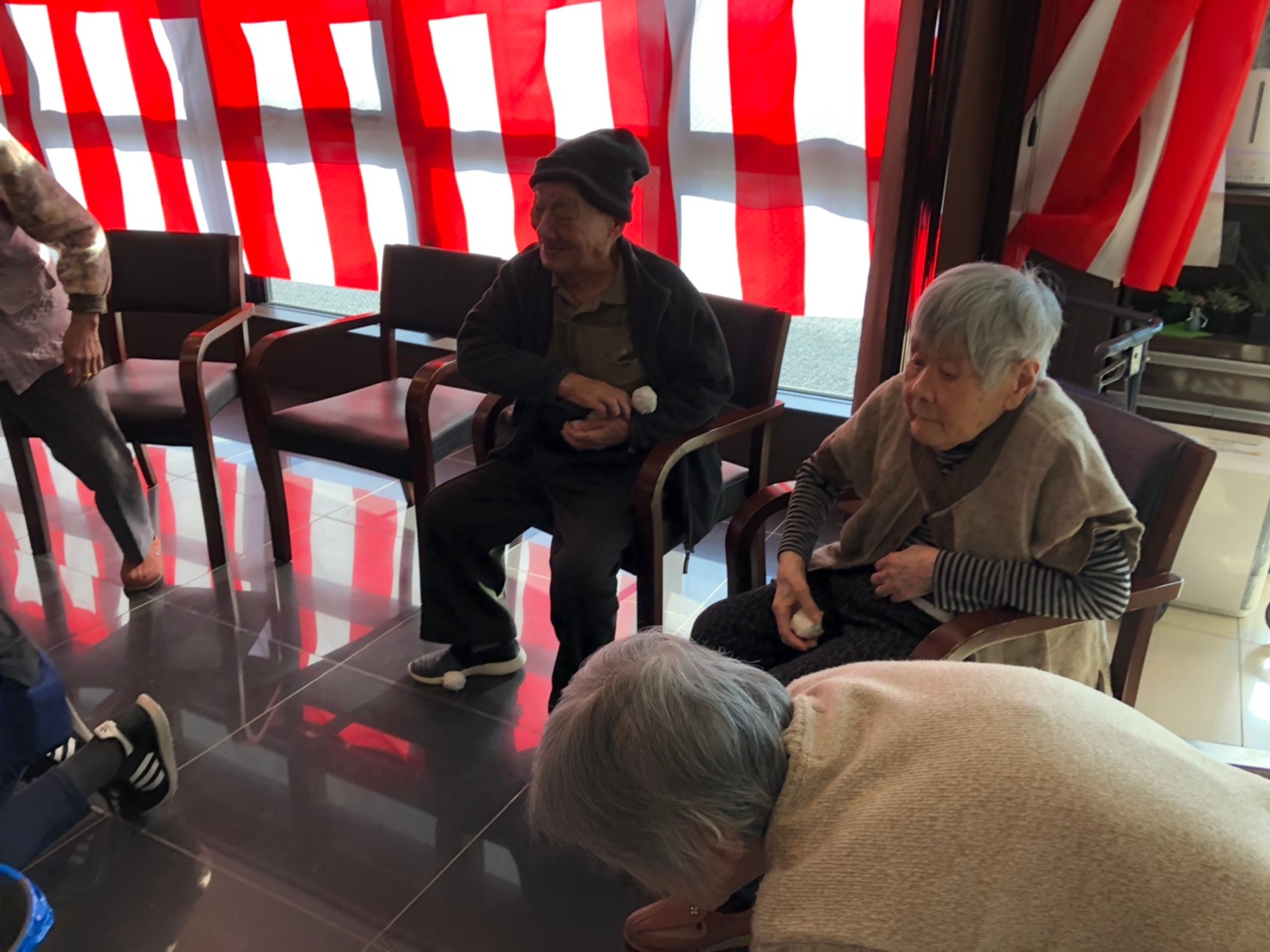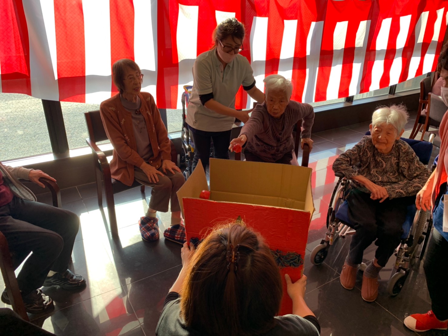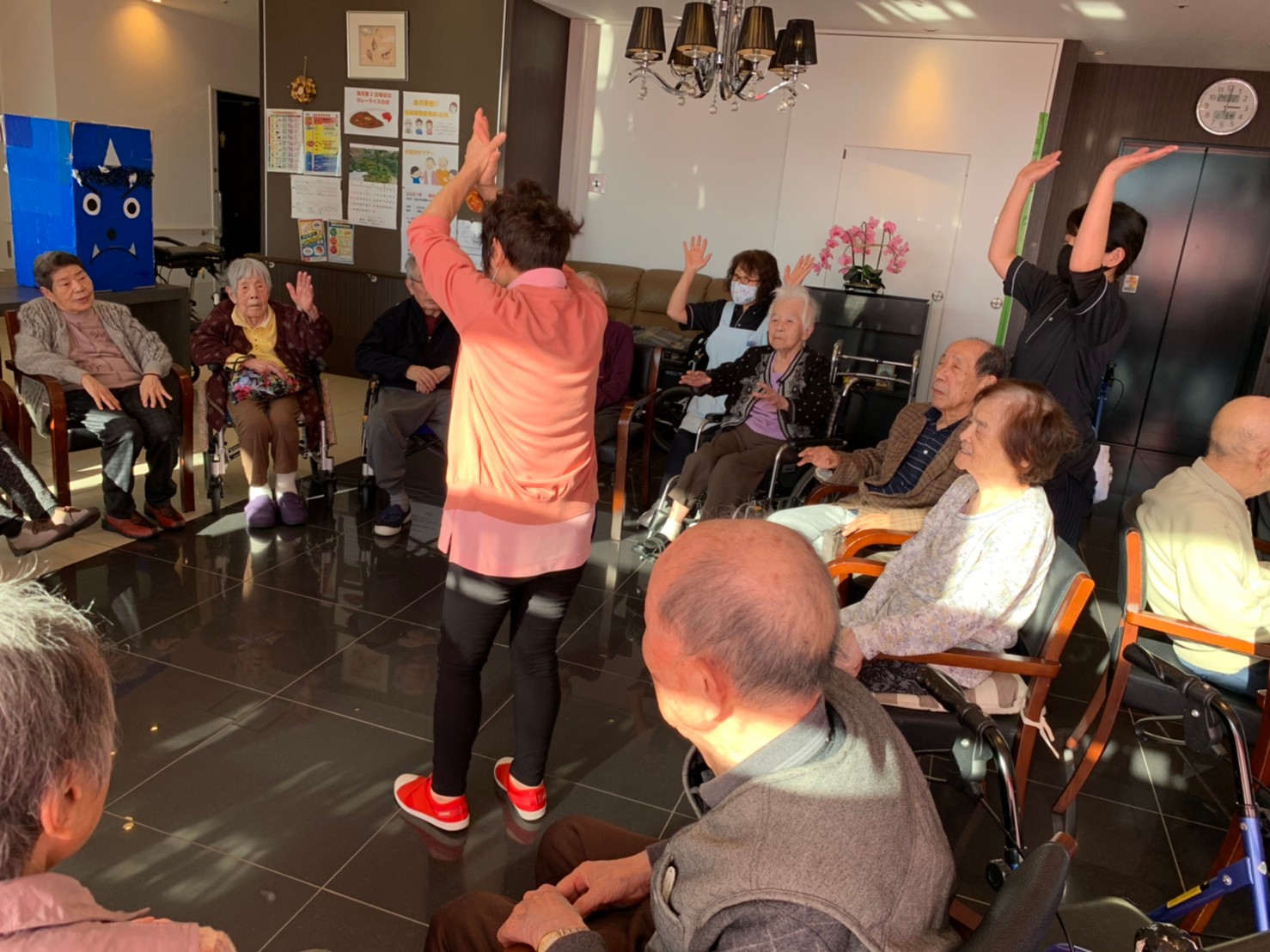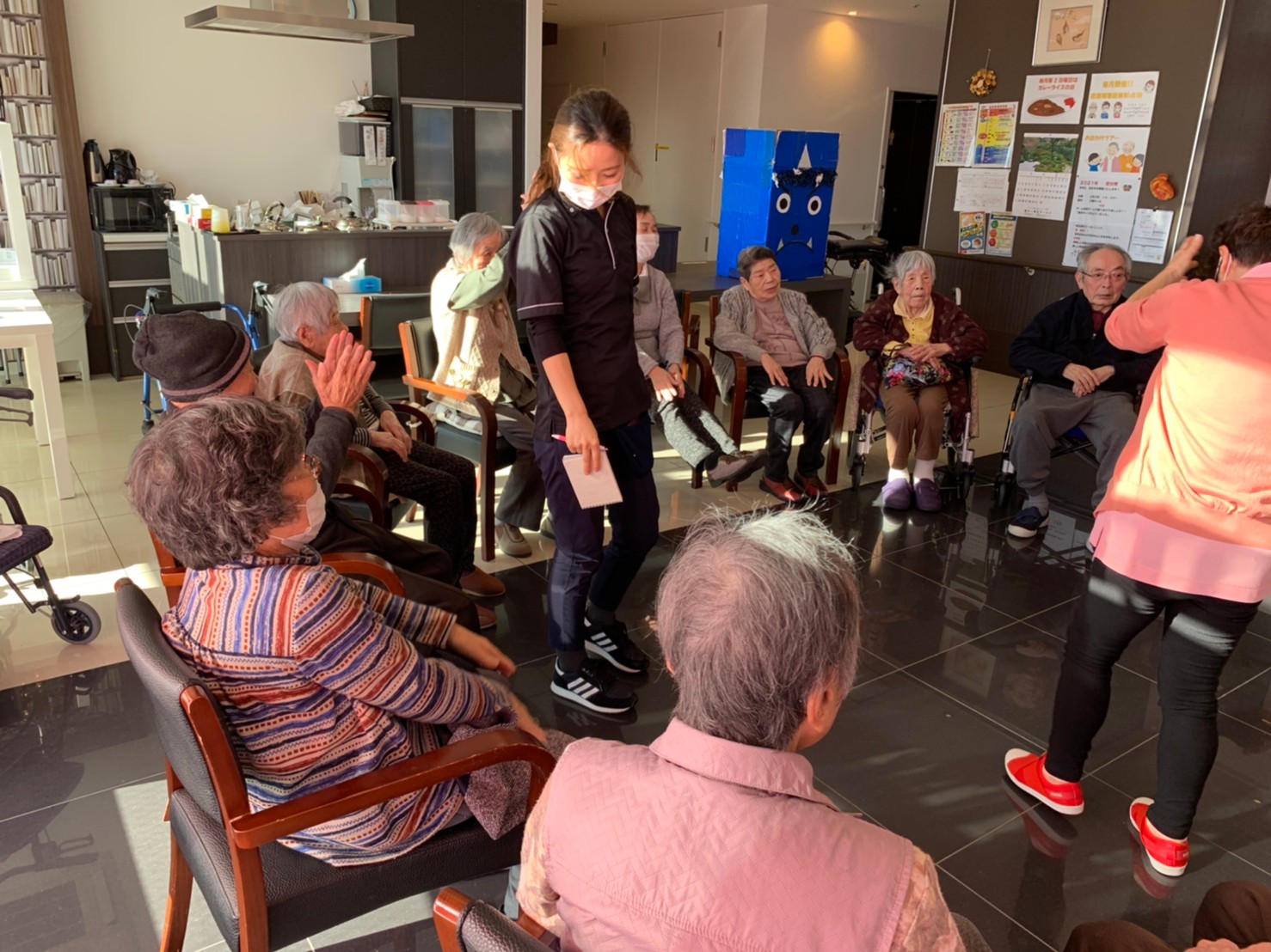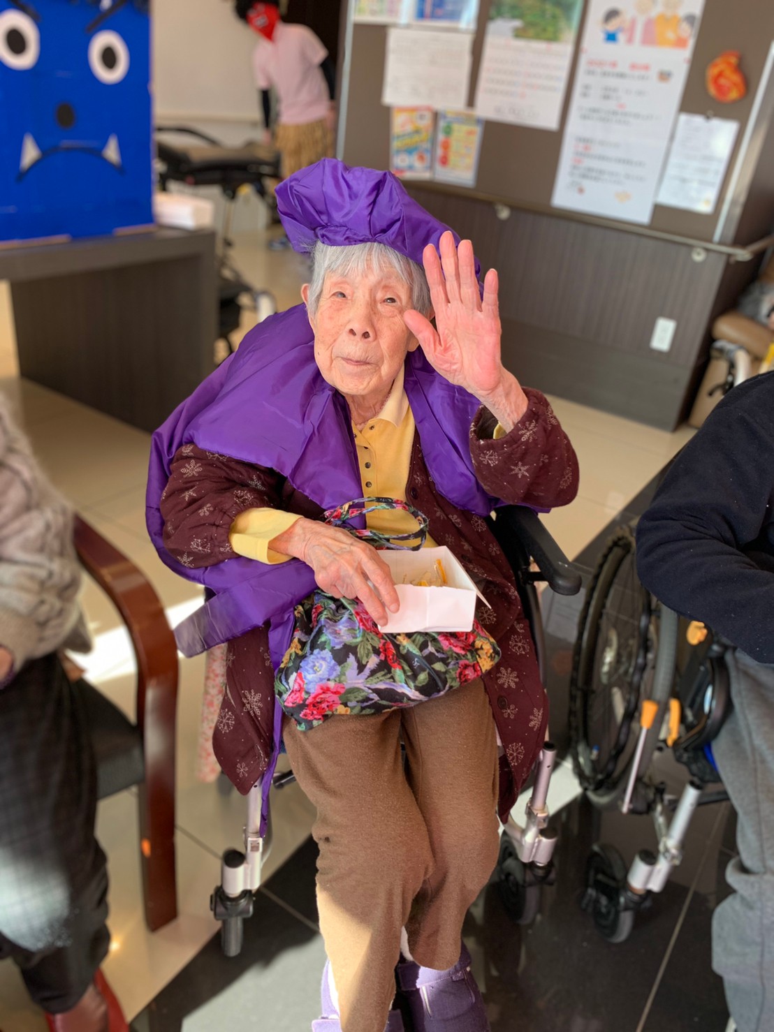 サニープレイス河瀬の月1イベントを本日開催いたしました。2月は節分祭として企画し、豆まきにちなんだミニ運動会を行いました。豆に見立てて玉入れやボーリングのピンを鬼に見立て倒しました。ちなみに玉入れに使った赤鬼のサニーちゃんと青鬼のプレイスくんは利用者さまとスタッフの共同制作です。そのあとは恒例の鬼退治です。今年から衣装も新調されたスタッフ扮する鬼に利用者さまに退治していただきました。悪さをする鬼がなぜか人気で利用者さまが握手をされました(笑)鬼の金棒は空気で膨らますビニール製ですのでご安心ください。最後はこのイベント大トリの福娘の登場です。社内選考会を何度もかさね、名誉ある今年の福娘に選ばれたスタッフが利用者さまとお一人ずつお話をしながら記念撮影をいたしました。ボクも来年の福娘選考会に応募すると言ったら、スタッフ全員から来年も鬼やで!と止められたのはここだけのお話です(‘Д’)