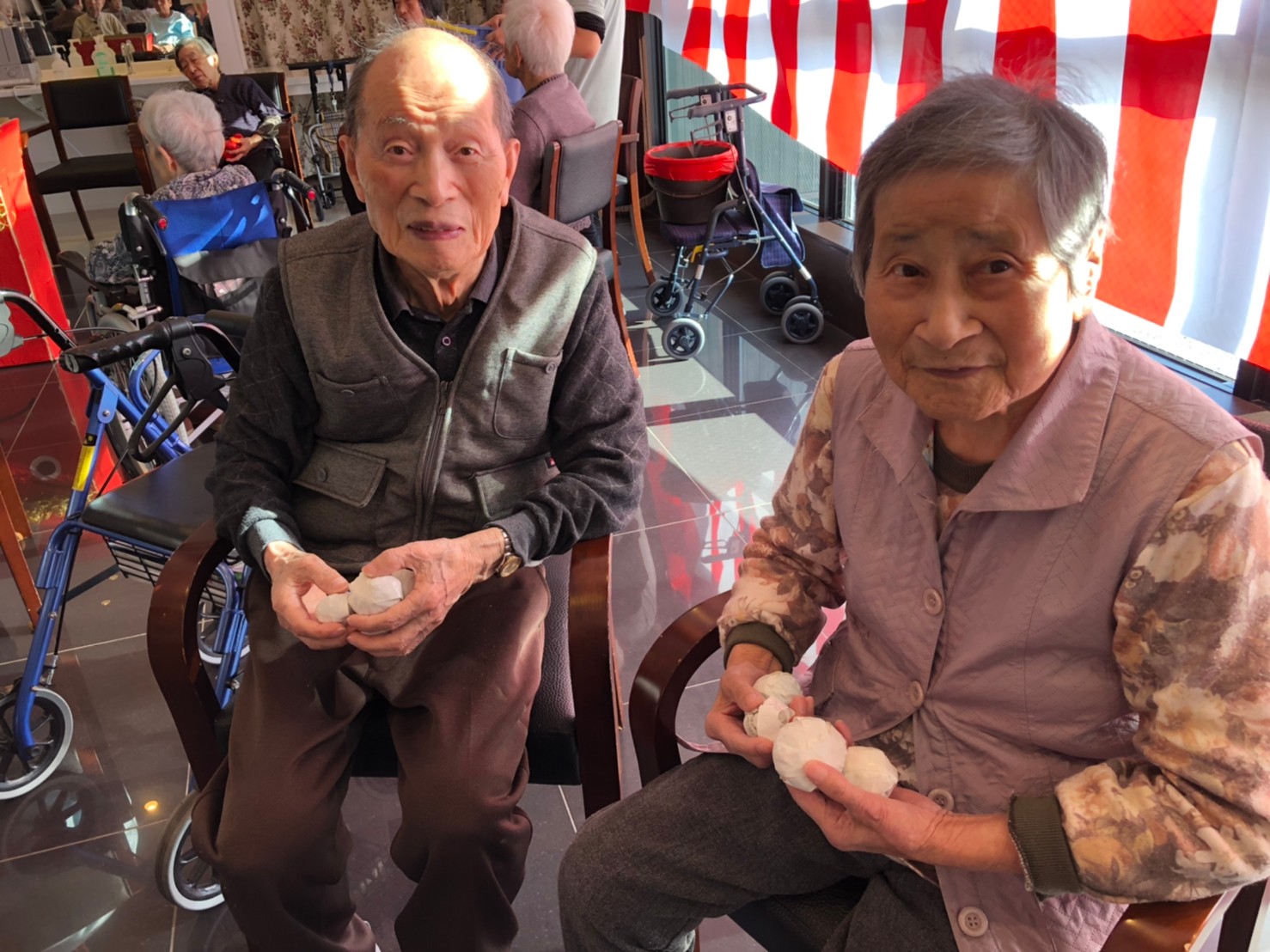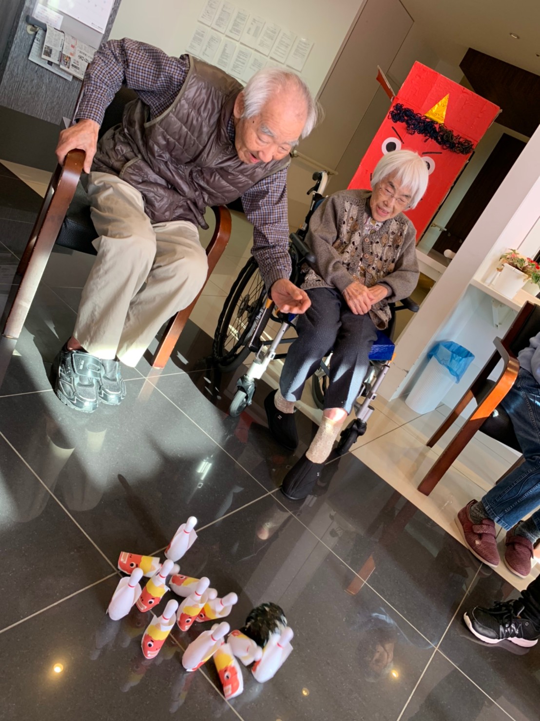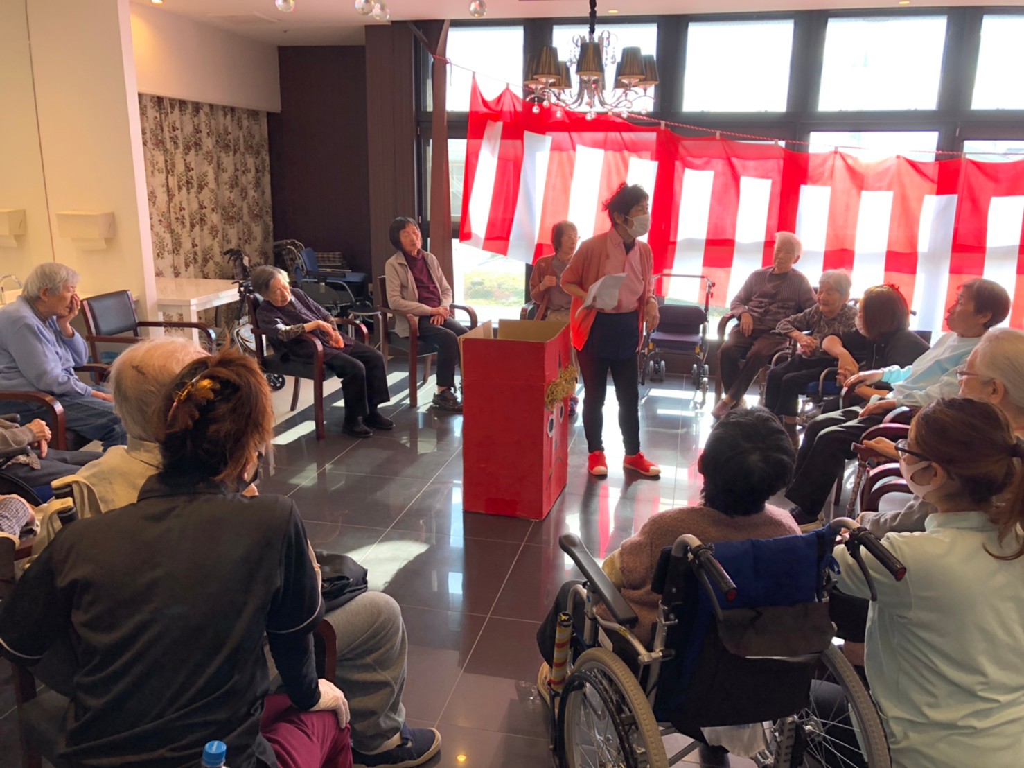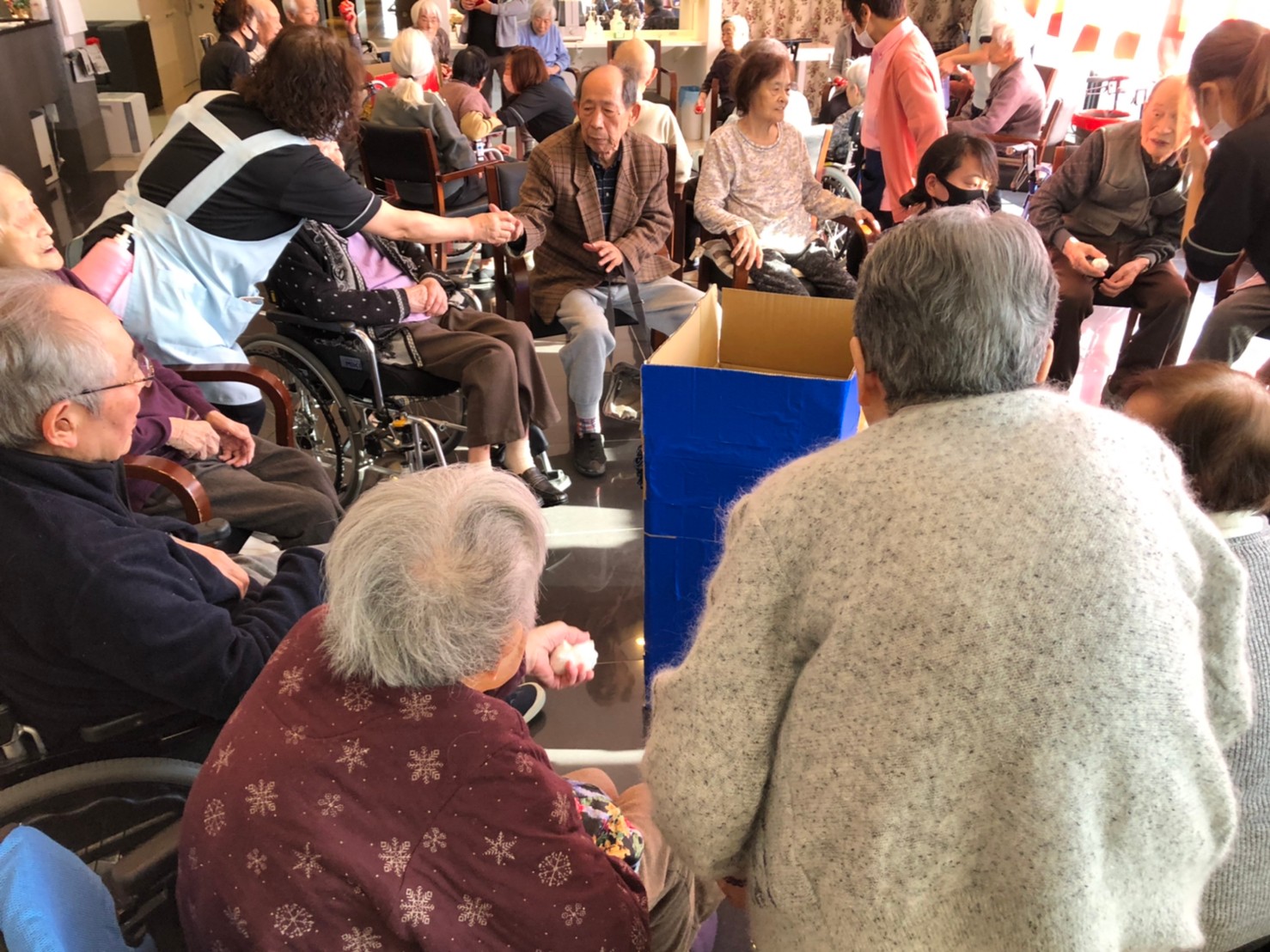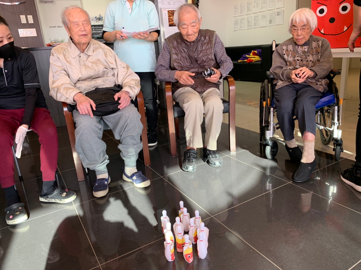 サニープレイス河瀬の月1イベントを本日開催いたしました。2月は節分祭として企画し、豆まきにちなんだミニ運動会を行いました。豆に見立てて玉入れやボーリングのピンを鬼に見立て倒しました。ちなみに玉入れに使った赤鬼のサニーちゃんと青鬼のプレイスくんは利用者さまとスタッフの共同制作です。そのあとは恒例の鬼退治です。今年から衣装も新調されたスタッフ扮する鬼に利用者さまに退治していただきました。悪さをする鬼がなぜか人気で利用者さまが握手をされました(笑)鬼の金棒は空気で膨らますビニール製ですのでご安心ください。最後はこのイベント大トリの福娘の登場です。社内選考会を何度もかさね、名誉ある今年の福娘に選ばれたスタッフが利用者さまとお一人ずつお話をしながら記念撮影をいたしました。ボクも来年の福娘選考会に応募すると言ったら、スタッフ全員から来年も鬼やで!と止められたのはここだけのお話です(‘Д’)