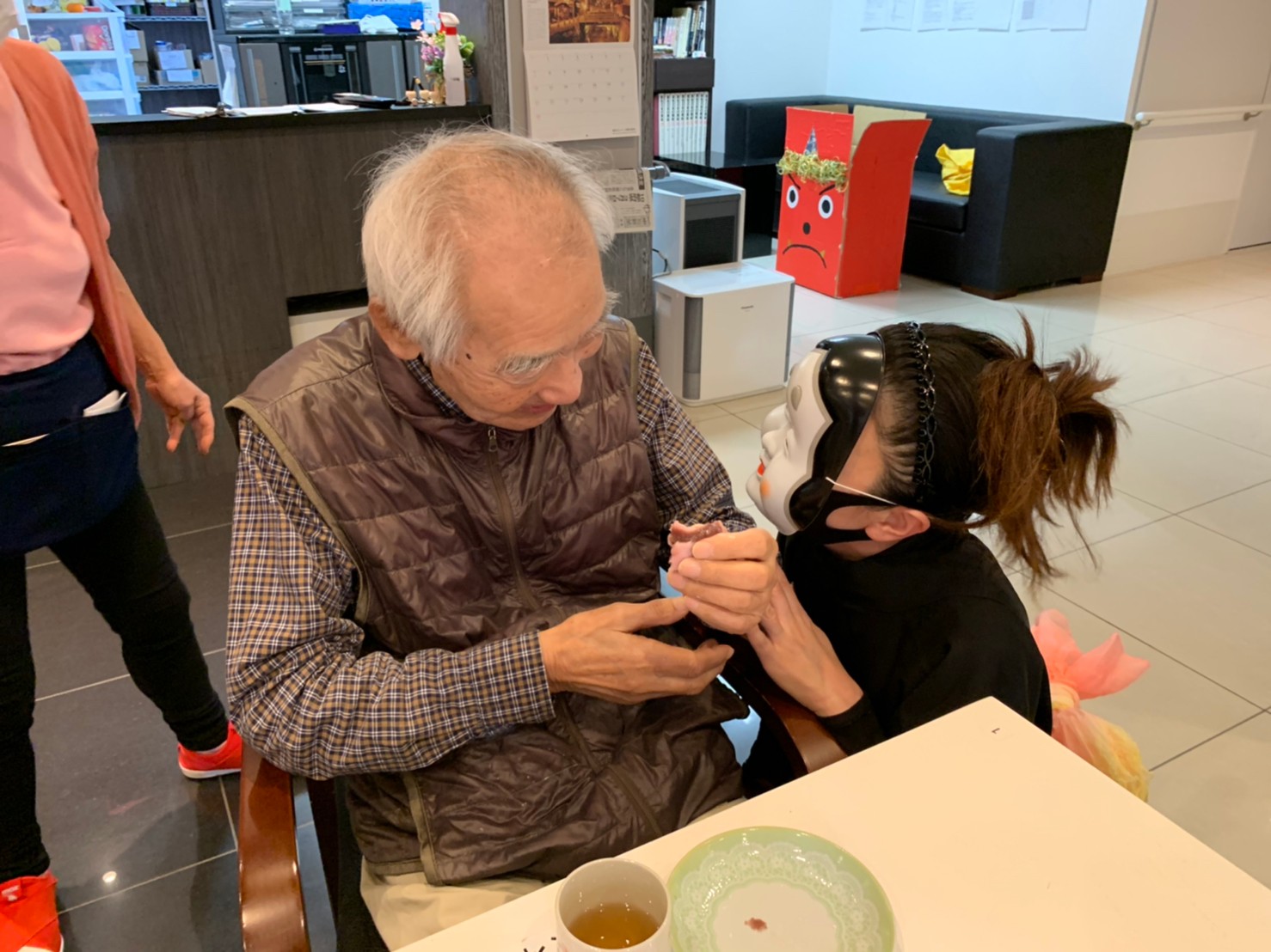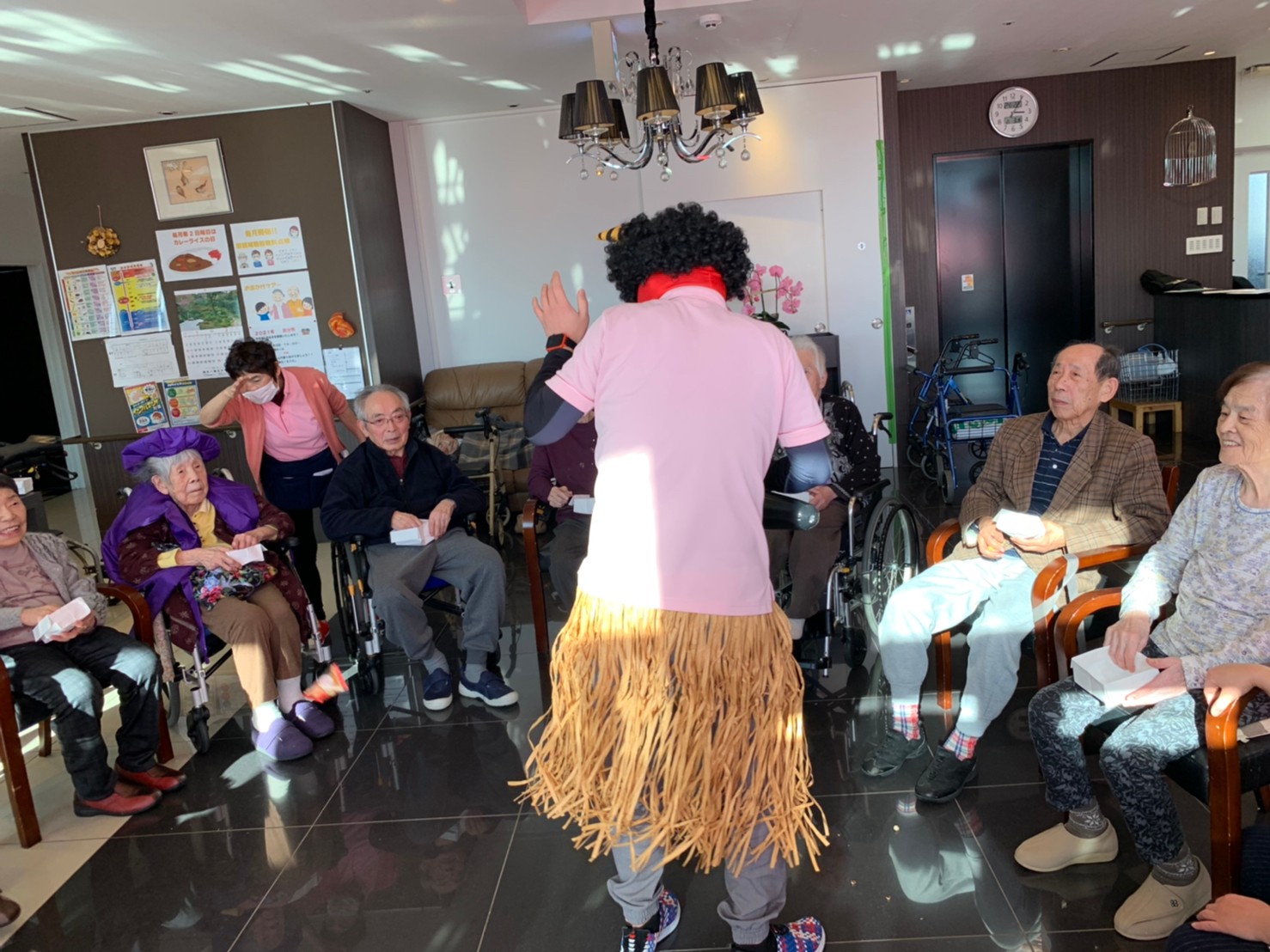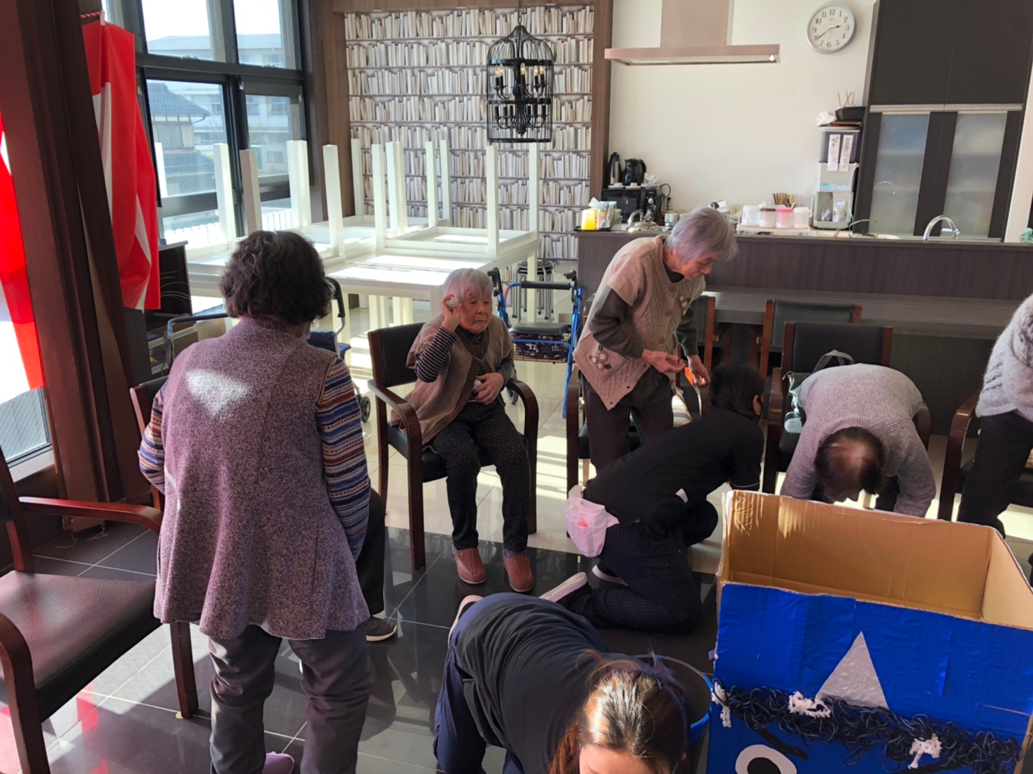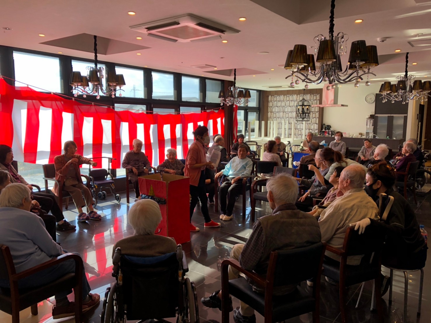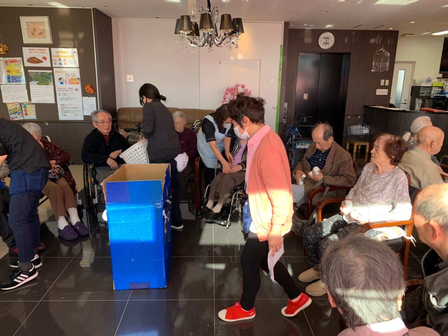 サニープレイス河瀬の月1イベントを本日開催いたしました。2月は節分祭として企画し、豆まきにちなんだミニ運動会を行いました。豆に見立てて玉入れやボーリングのピンを鬼に見立て倒しました。ちなみに玉入れに使った赤鬼のサニーちゃんと青鬼のプレイスくんは利用者さまとスタッフの共同制作です。そのあとは恒例の鬼退治です。今年から衣装も新調されたスタッフ扮する鬼に利用者さまに退治していただきました。悪さをする鬼がなぜか人気で利用者さまが握手をされました(笑)鬼の金棒は空気で膨らますビニール製ですのでご安心ください。最後はこのイベント大トリの福娘の登場です。社内選考会を何度もかさね、名誉ある今年の福娘に選ばれたスタッフが利用者さまとお一人ずつお話をしながら記念撮影をいたしました。ボクも来年の福娘選考会に応募すると言ったら、スタッフ全員から来年も鬼やで!と止められたのはここだけのお話です(‘Д’)