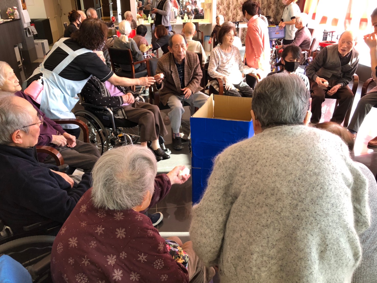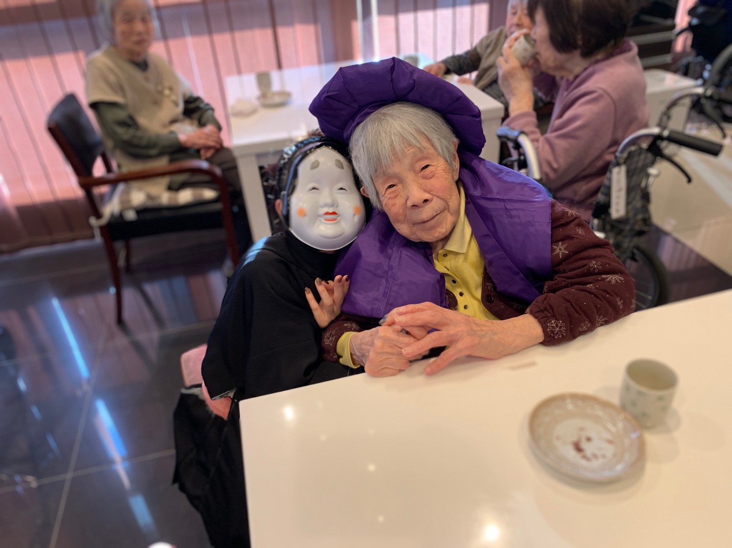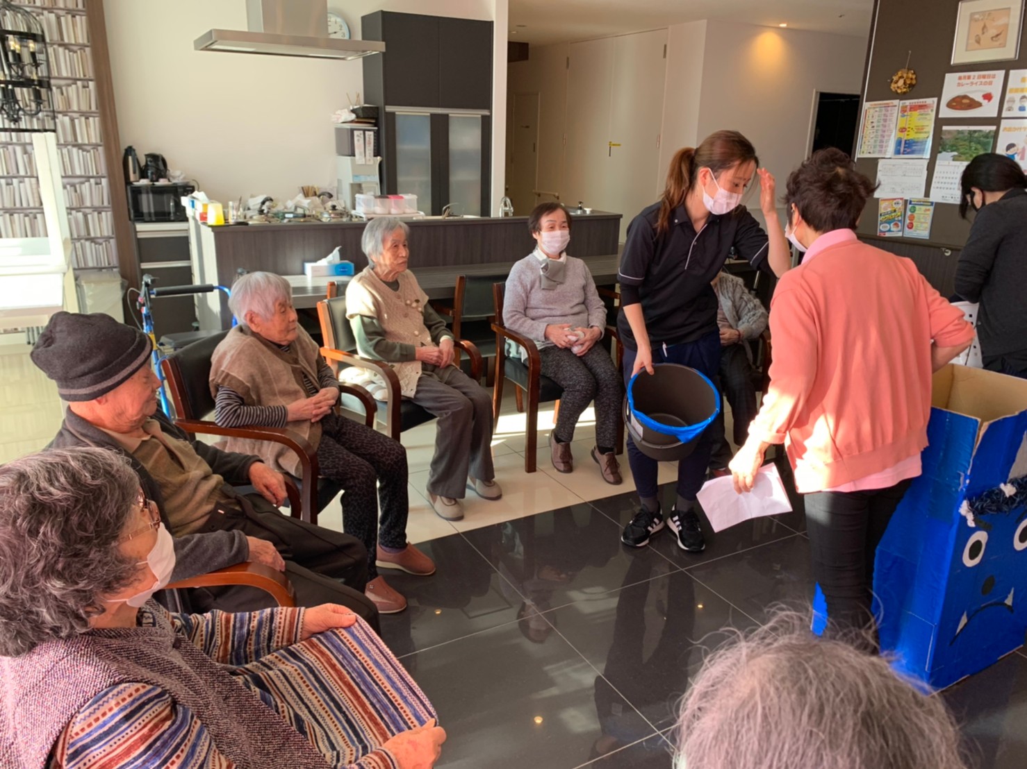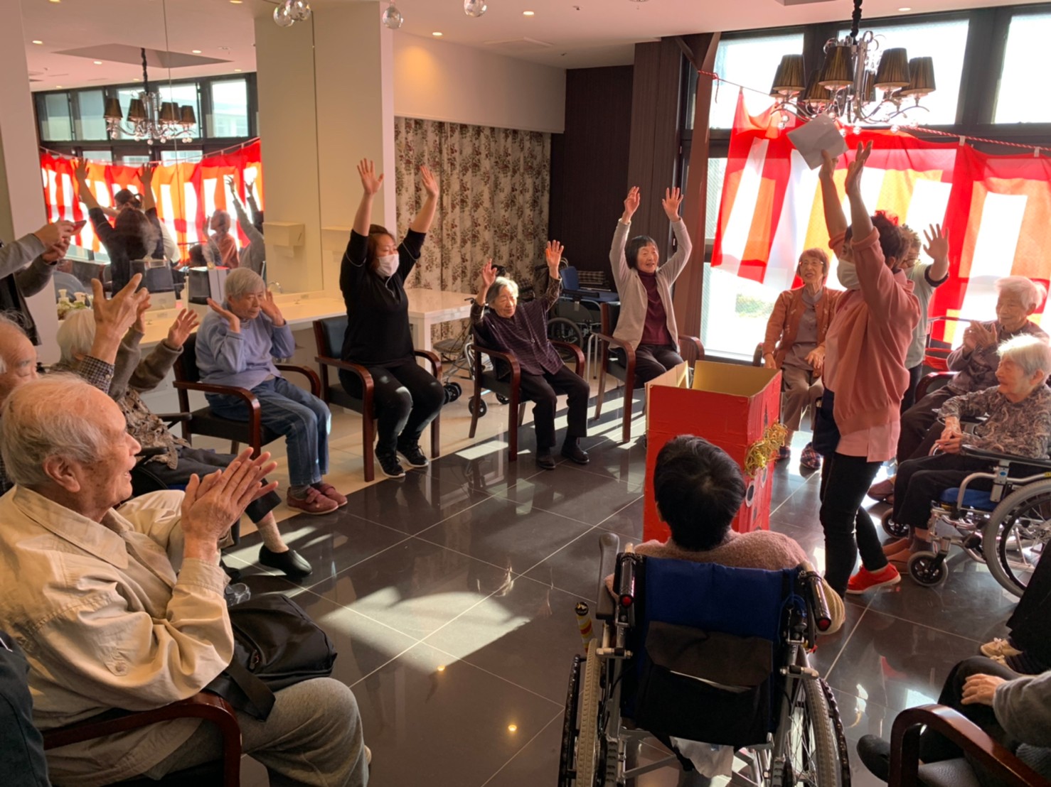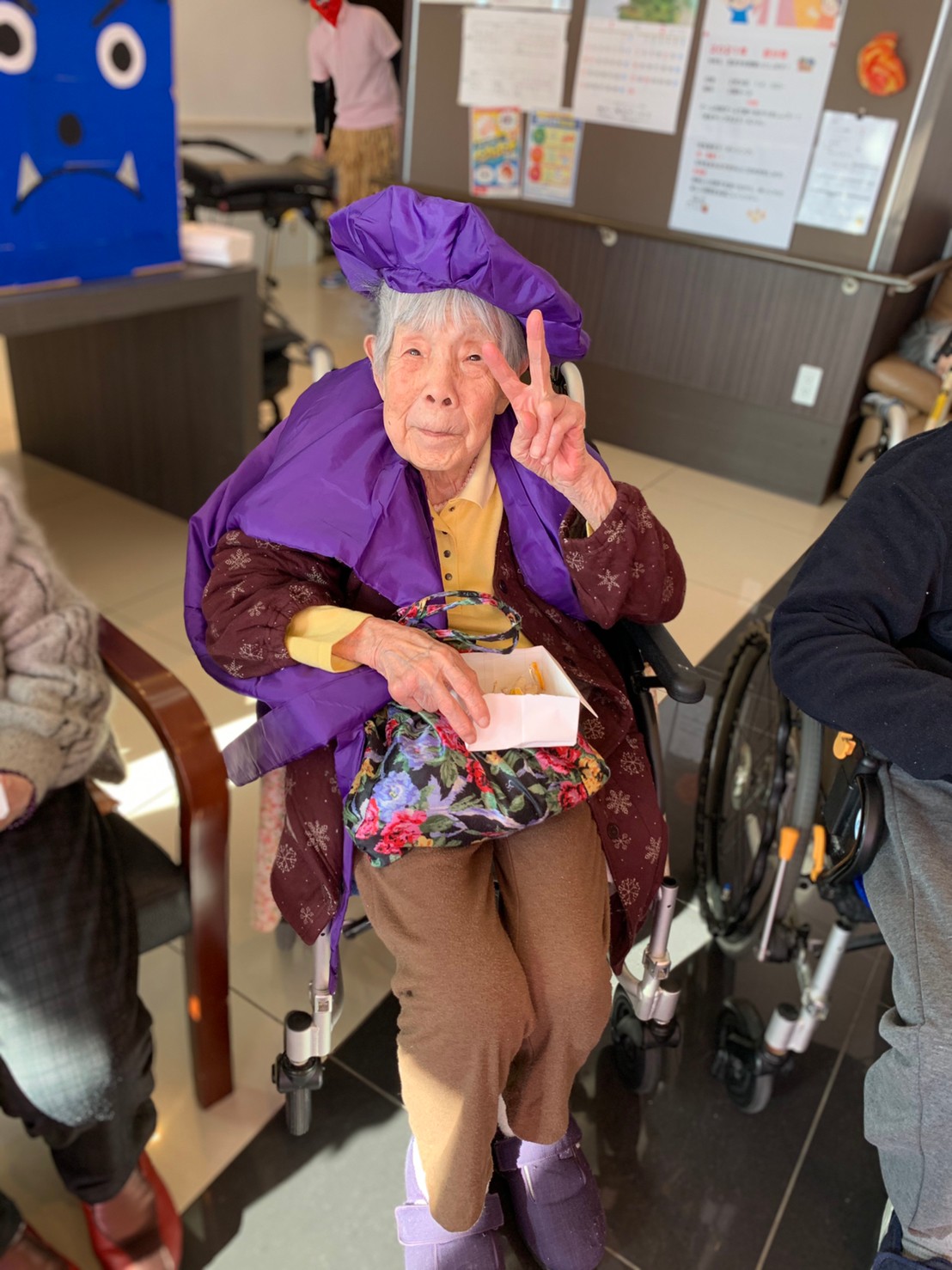 サニープレイス河瀬の月1イベントを本日開催いたしました。2月は節分祭として企画し、豆まきにちなんだミニ運動会を行いました。豆に見立てて玉入れやボーリングのピンを鬼に見立て倒しました。ちなみに玉入れに使った赤鬼のサニーちゃんと青鬼のプレイスくんは利用者さまとスタッフの共同制作です。そのあとは恒例の鬼退治です。今年から衣装も新調されたスタッフ扮する鬼に利用者さまに退治していただきました。悪さをする鬼がなぜか人気で利用者さまが握手をされました(笑)鬼の金棒は空気で膨らますビニール製ですのでご安心ください。最後はこのイベント大トリの福娘の登場です。社内選考会を何度もかさね、名誉ある今年の福娘に選ばれたスタッフが利用者さまとお一人ずつお話をしながら記念撮影をいたしました。ボクも来年の福娘選考会に応募すると言ったら、スタッフ全員から来年も鬼やで!と止められたのはここだけのお話です(‘Д’)