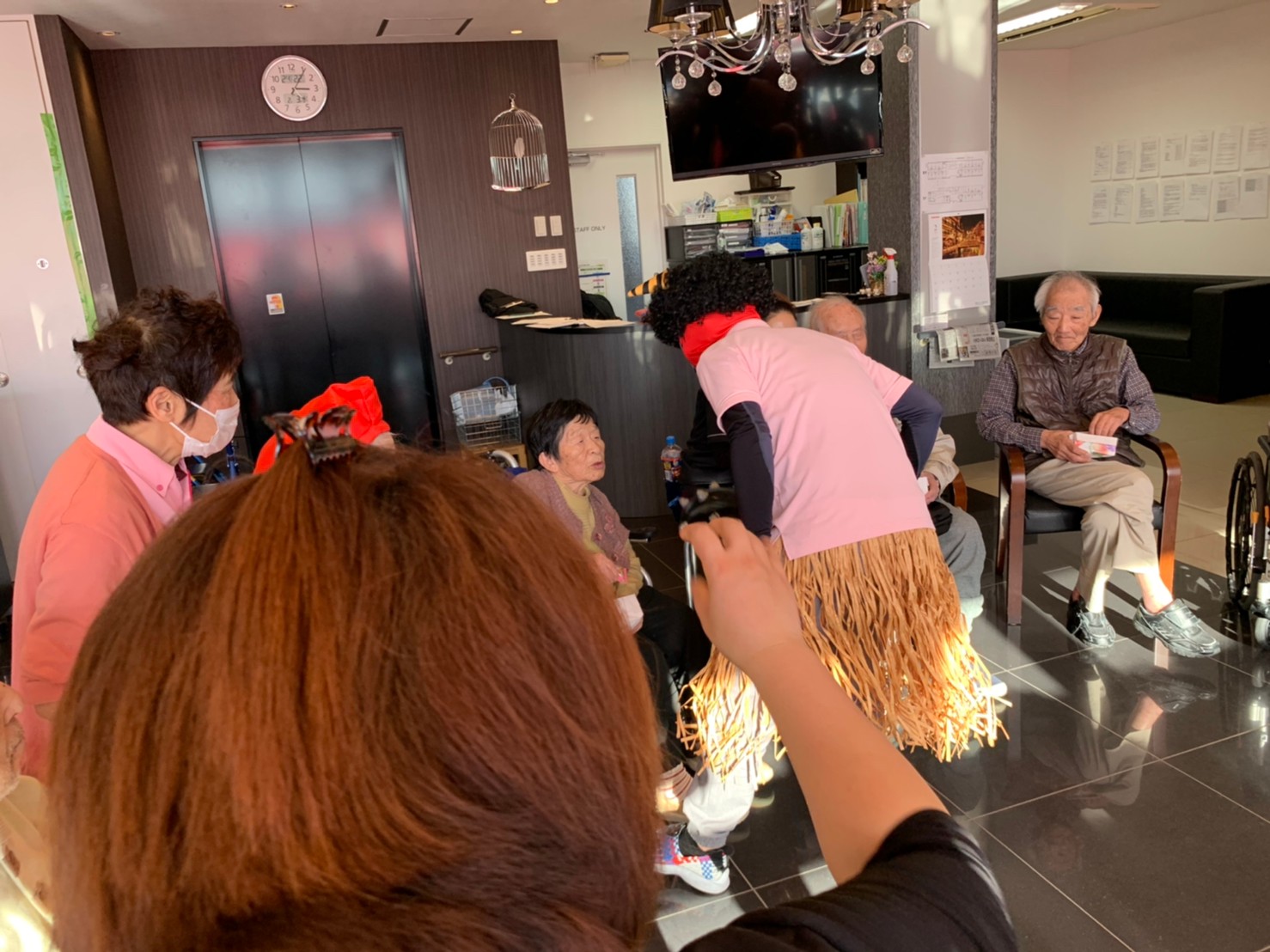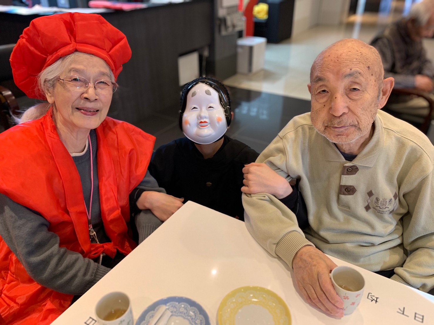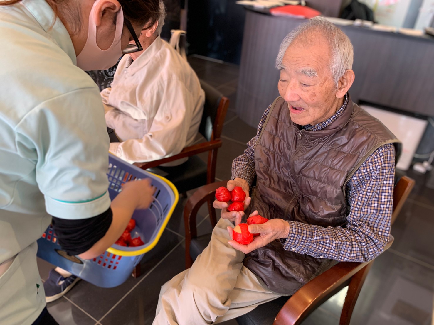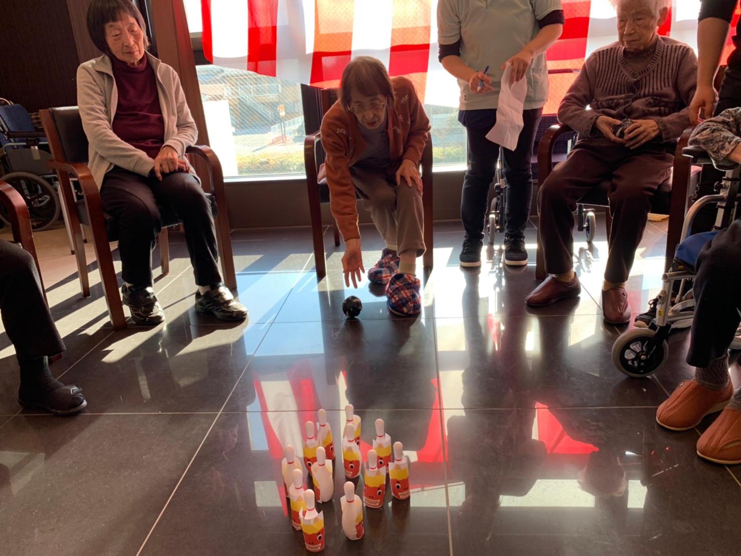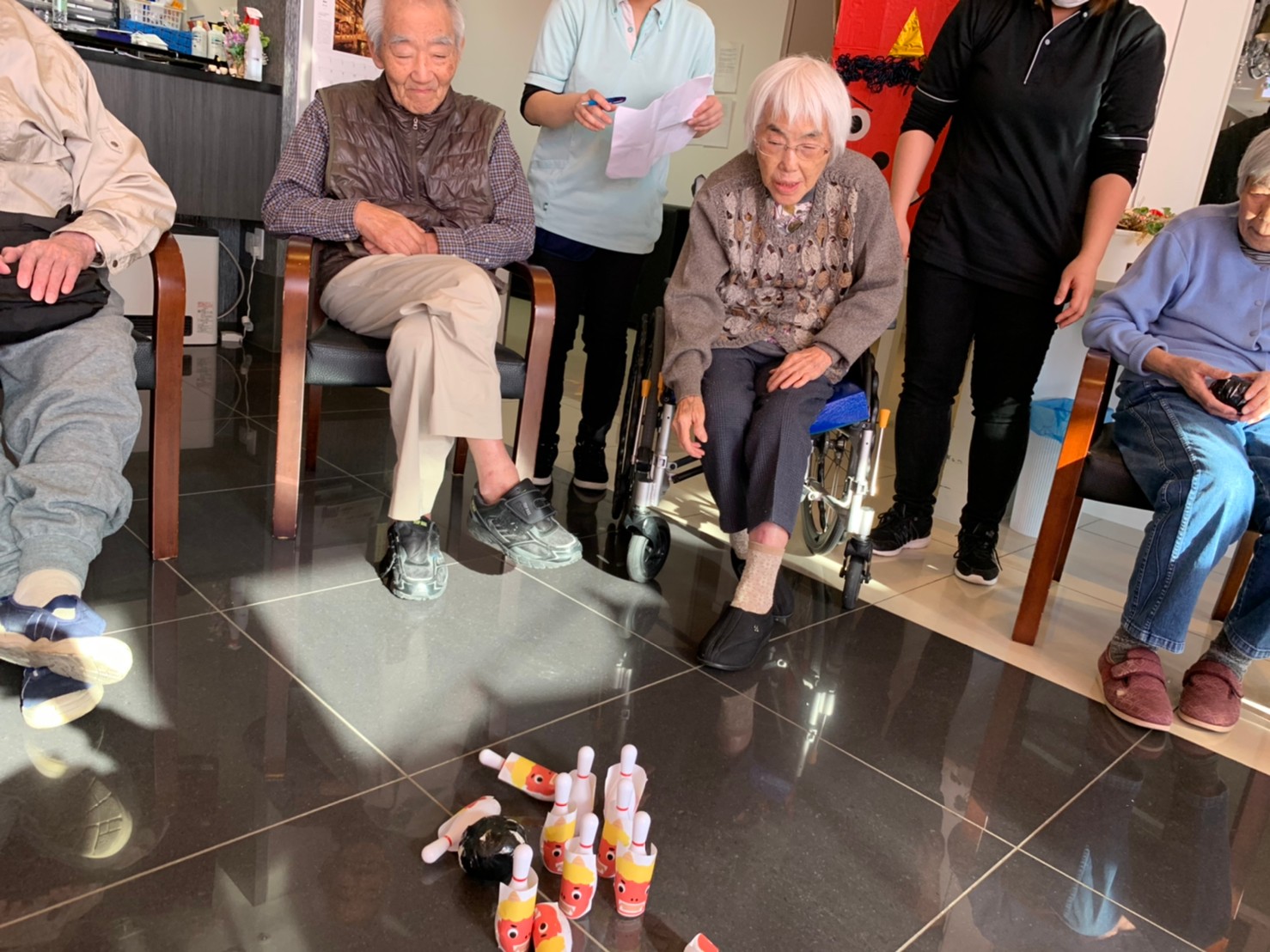 サニープレイス河瀬の月1イベントを本日開催いたしました。2月は節分祭として企画し、豆まきにちなんだミニ運動会を行いました。豆に見立てて玉入れやボーリングのピンを鬼に見立て倒しました。ちなみに玉入れに使った赤鬼のサニーちゃんと青鬼のプレイスくんは利用者さまとスタッフの共同制作です。そのあとは恒例の鬼退治です。今年から衣装も新調されたスタッフ扮する鬼に利用者さまに退治していただきました。悪さをする鬼がなぜか人気で利用者さまが握手をされました(笑)鬼の金棒は空気で膨らますビニール製ですのでご安心ください。最後はこのイベント大トリの福娘の登場です。社内選考会を何度もかさね、名誉ある今年の福娘に選ばれたスタッフが利用者さまとお一人ずつお話をしながら記念撮影をいたしました。ボクも来年の福娘選考会に応募すると言ったら、スタッフ全員から来年も鬼やで!と止められたのはここだけのお話です(‘Д’)