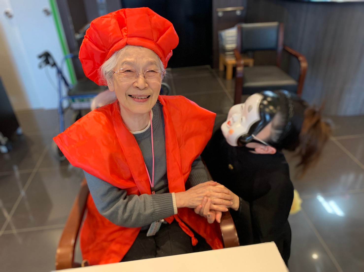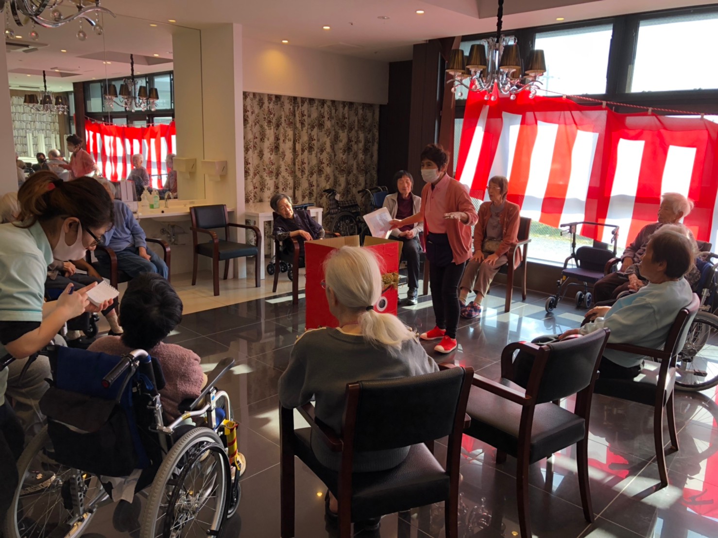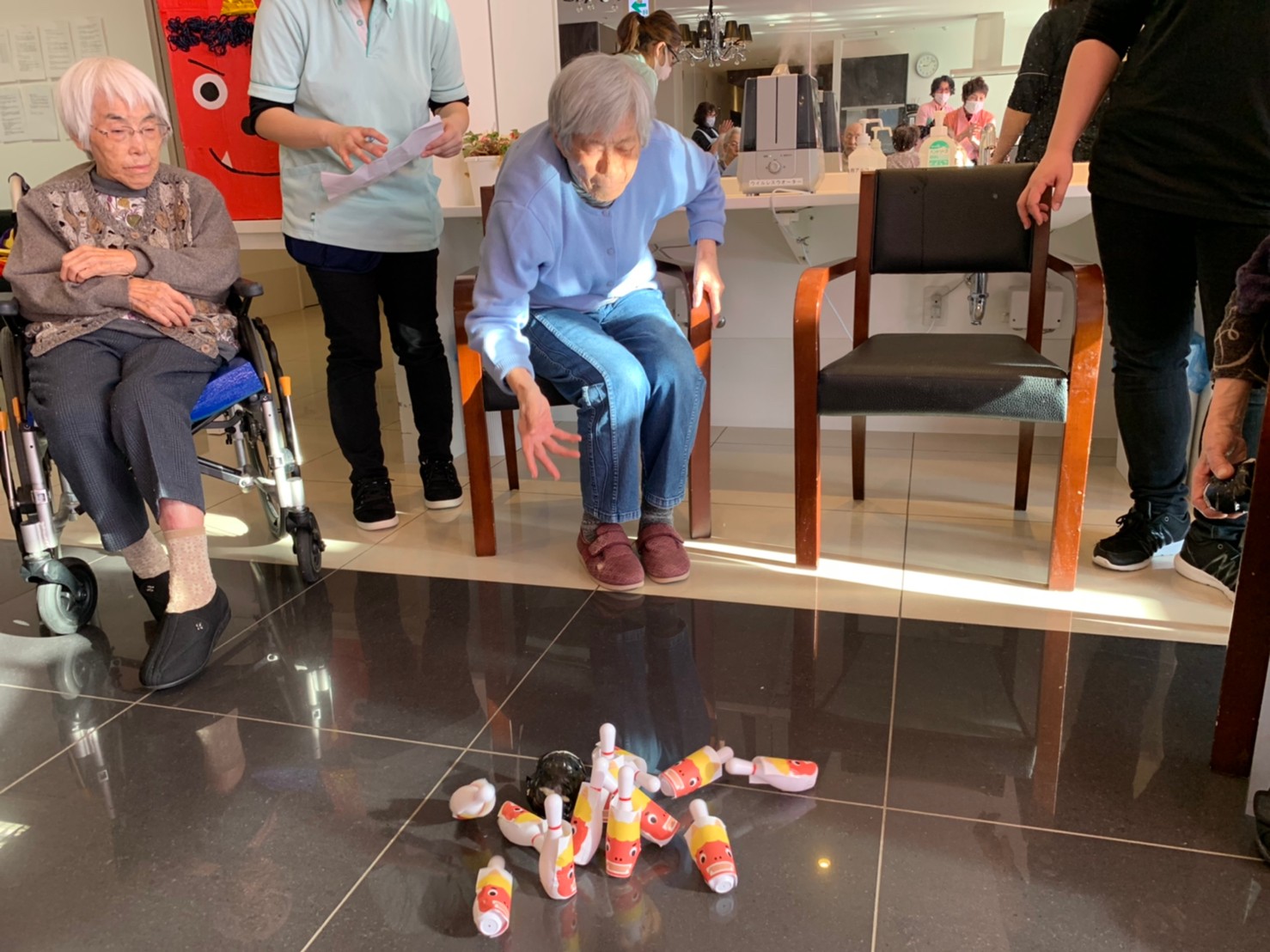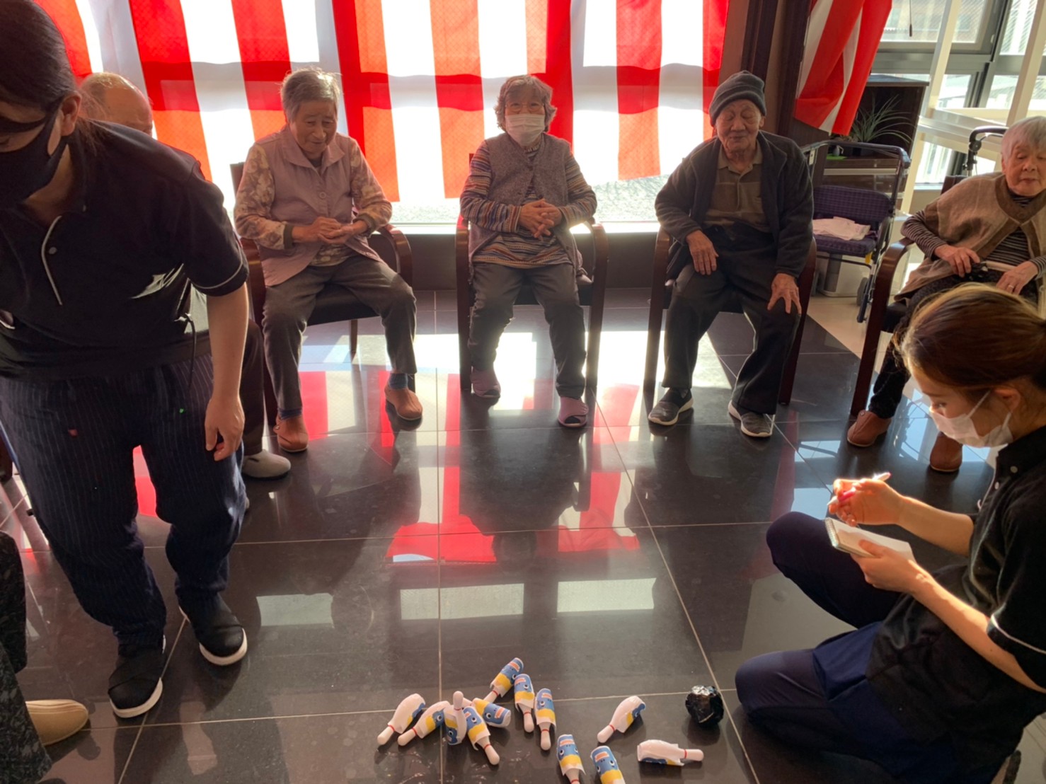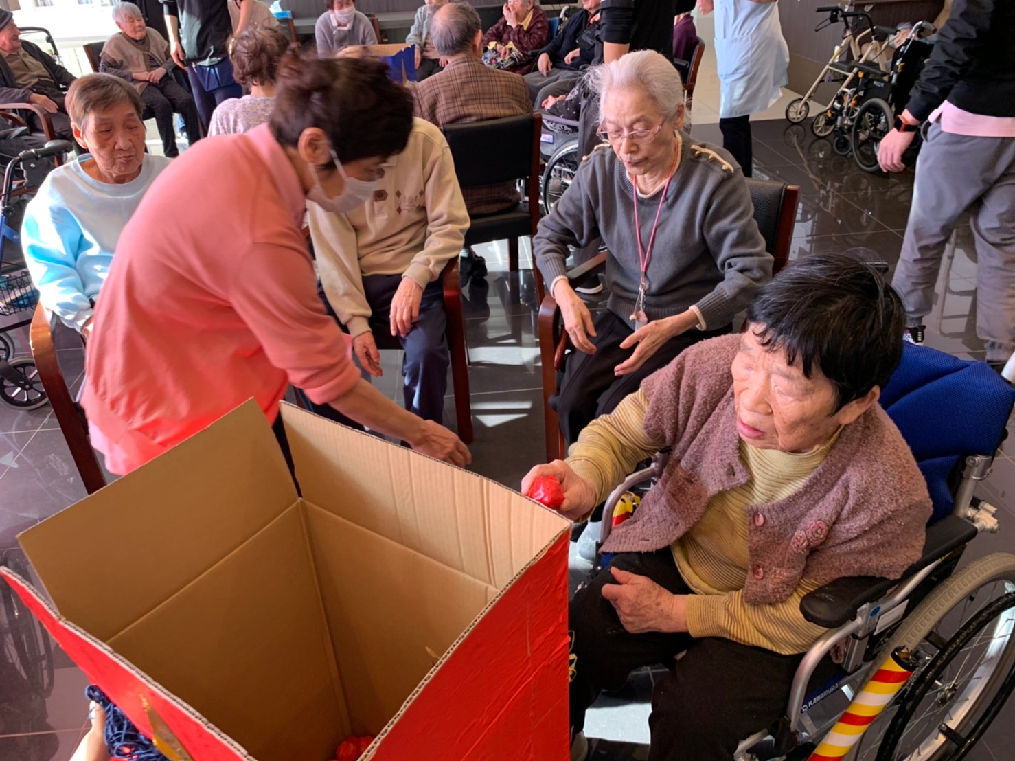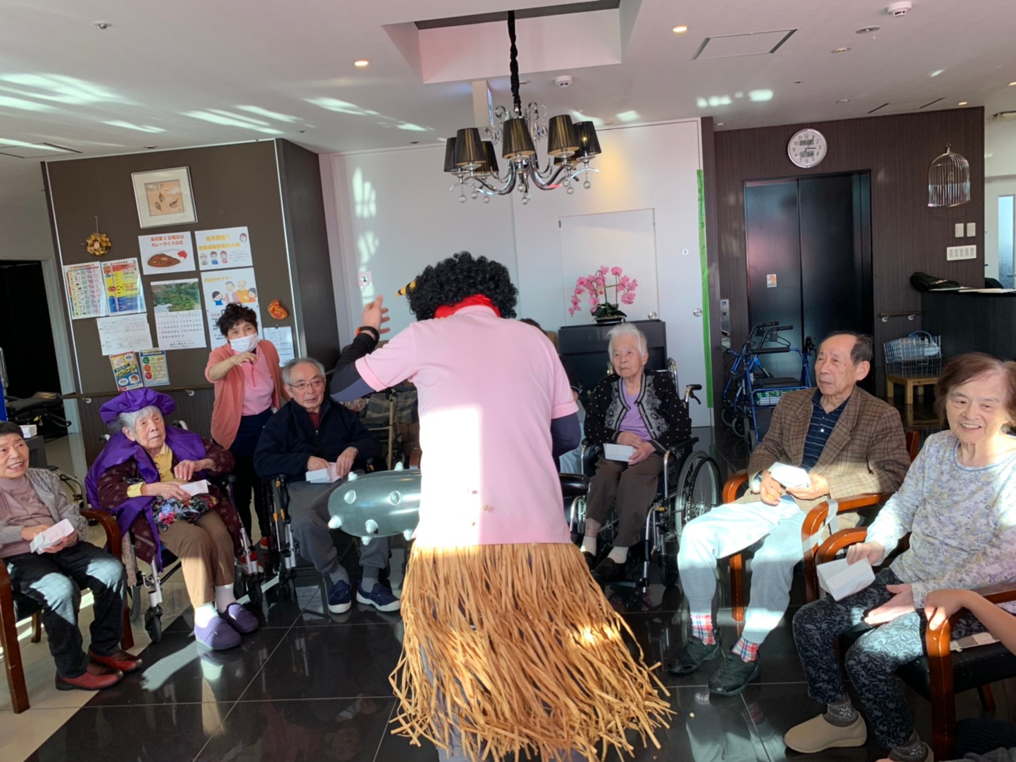 サニープレイス河瀬の月1イベントを本日開催いたしました。2月は節分祭として企画し、豆まきにちなんだミニ運動会を行いました。豆に見立てて玉入れやボーリングのピンを鬼に見立て倒しました。ちなみに玉入れに使った赤鬼のサニーちゃんと青鬼のプレイスくんは利用者さまとスタッフの共同制作です。そのあとは恒例の鬼退治です。今年から衣装も新調されたスタッフ扮する鬼に利用者さまに退治していただきました。悪さをする鬼がなぜか人気で利用者さまが握手をされました(笑)鬼の金棒は空気で膨らますビニール製ですのでご安心ください。最後はこのイベント大トリの福娘の登場です。社内選考会を何度もかさね、名誉ある今年の福娘に選ばれたスタッフが利用者さまとお一人ずつお話をしながら記念撮影をいたしました。ボクも来年の福娘選考会に応募すると言ったら、スタッフ全員から来年も鬼やで!と止められたのはここだけのお話です(‘Д’)