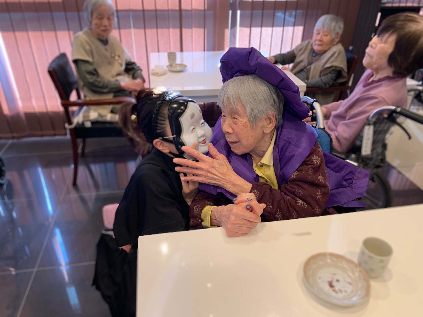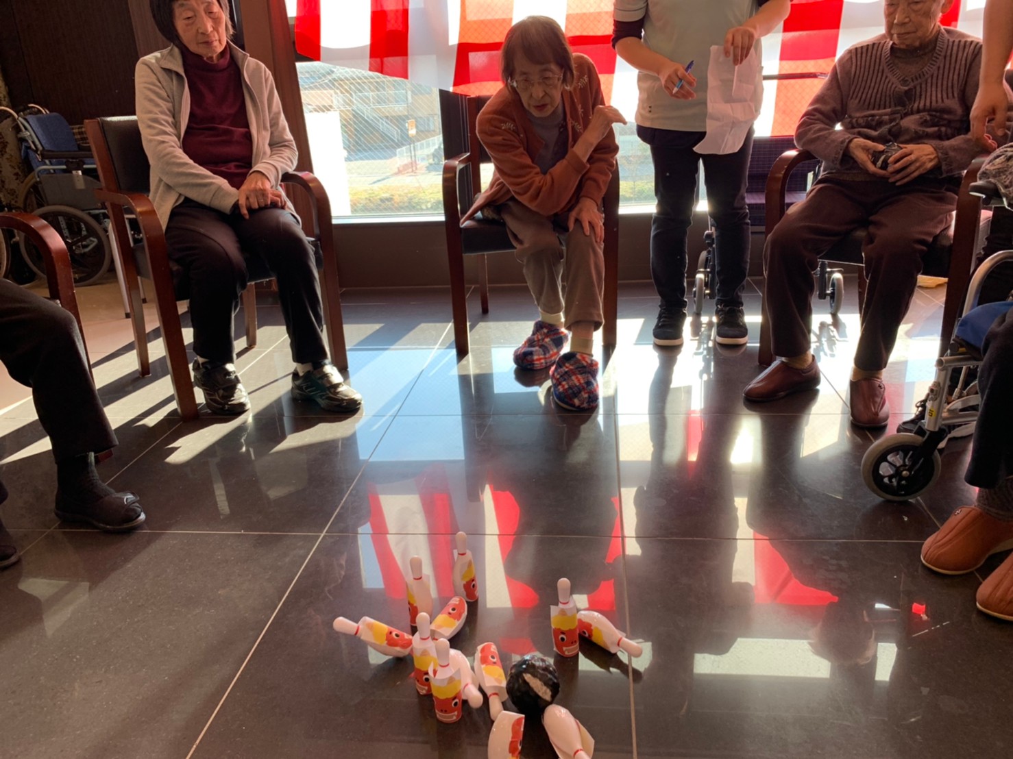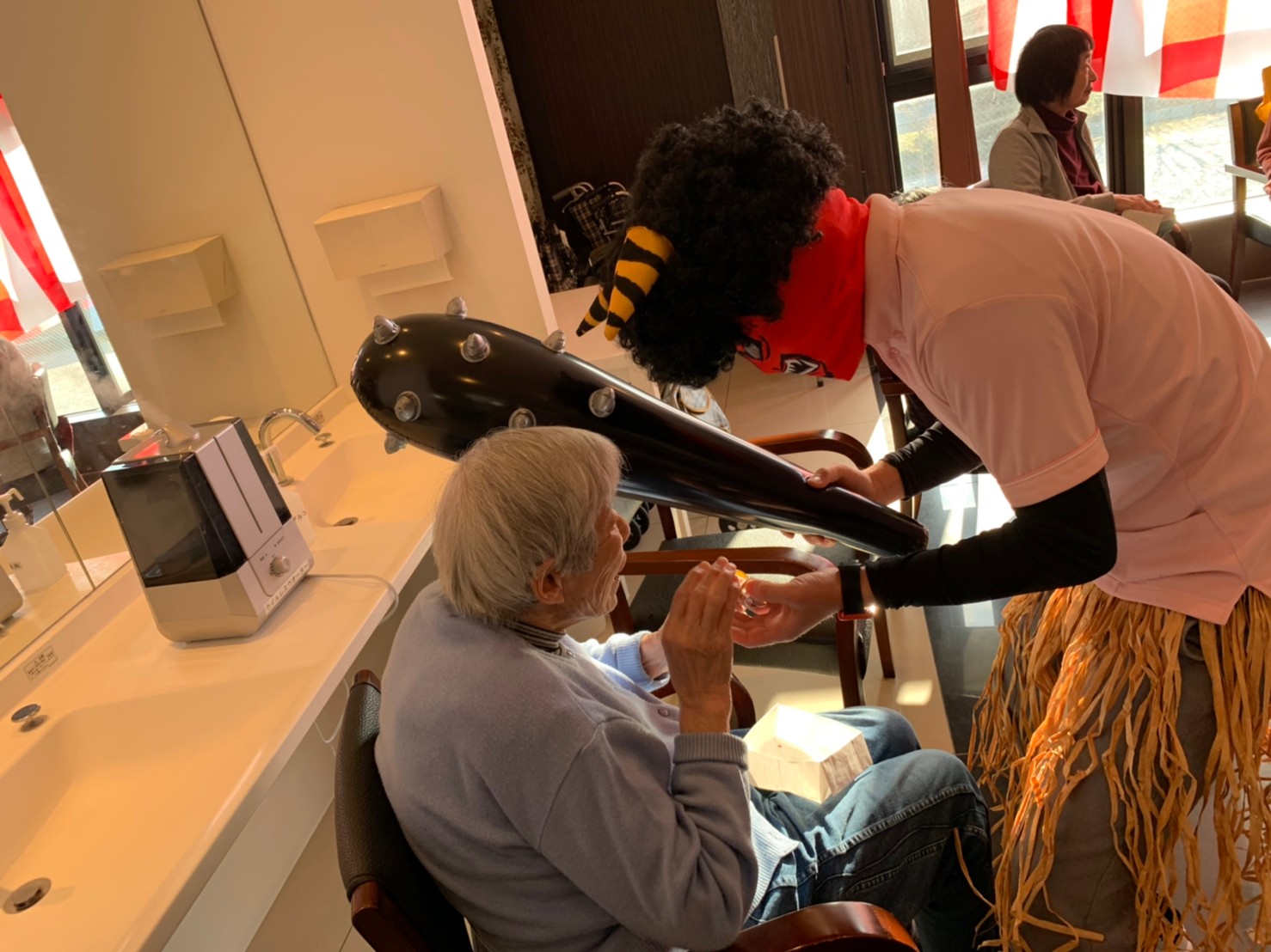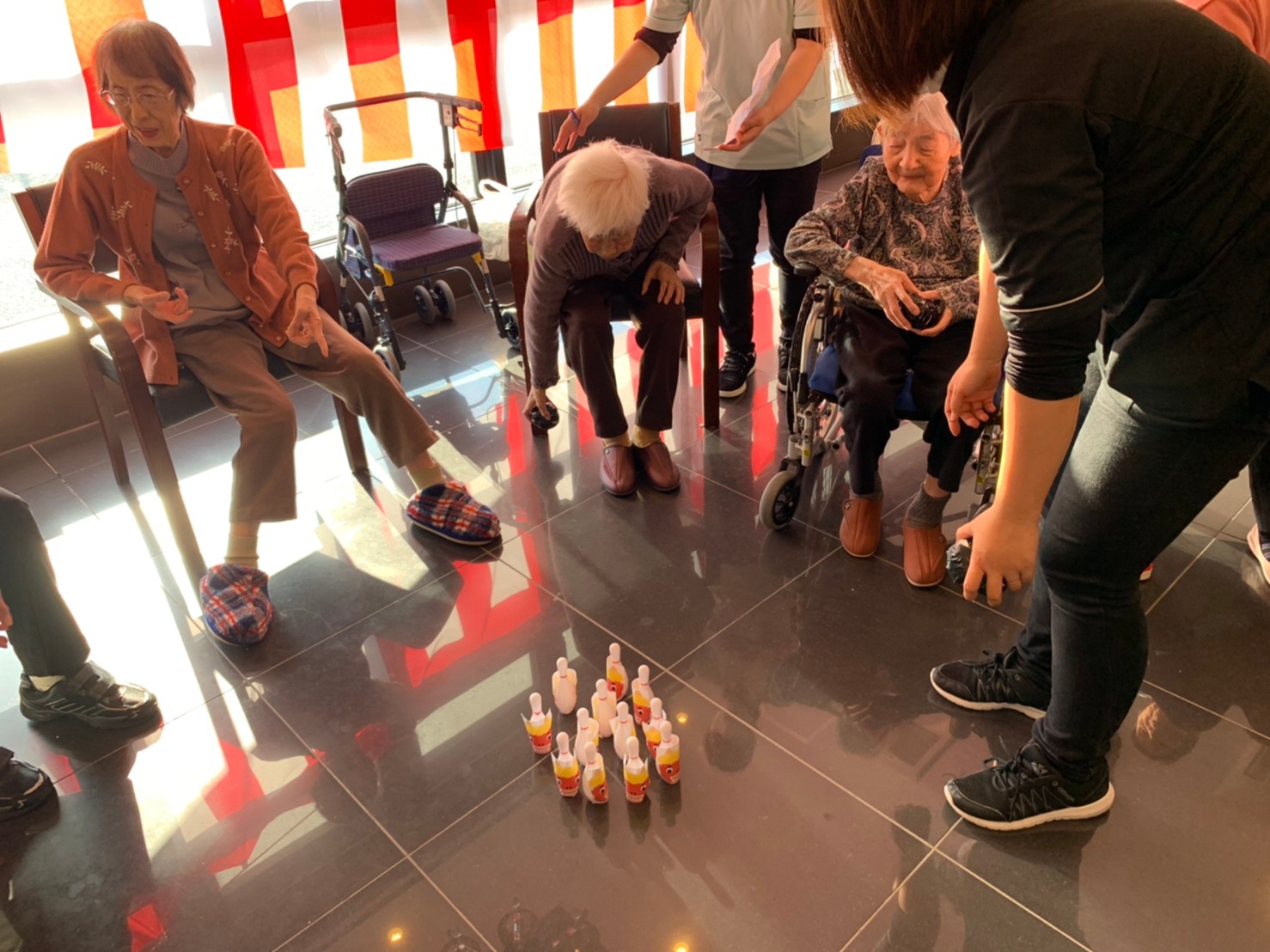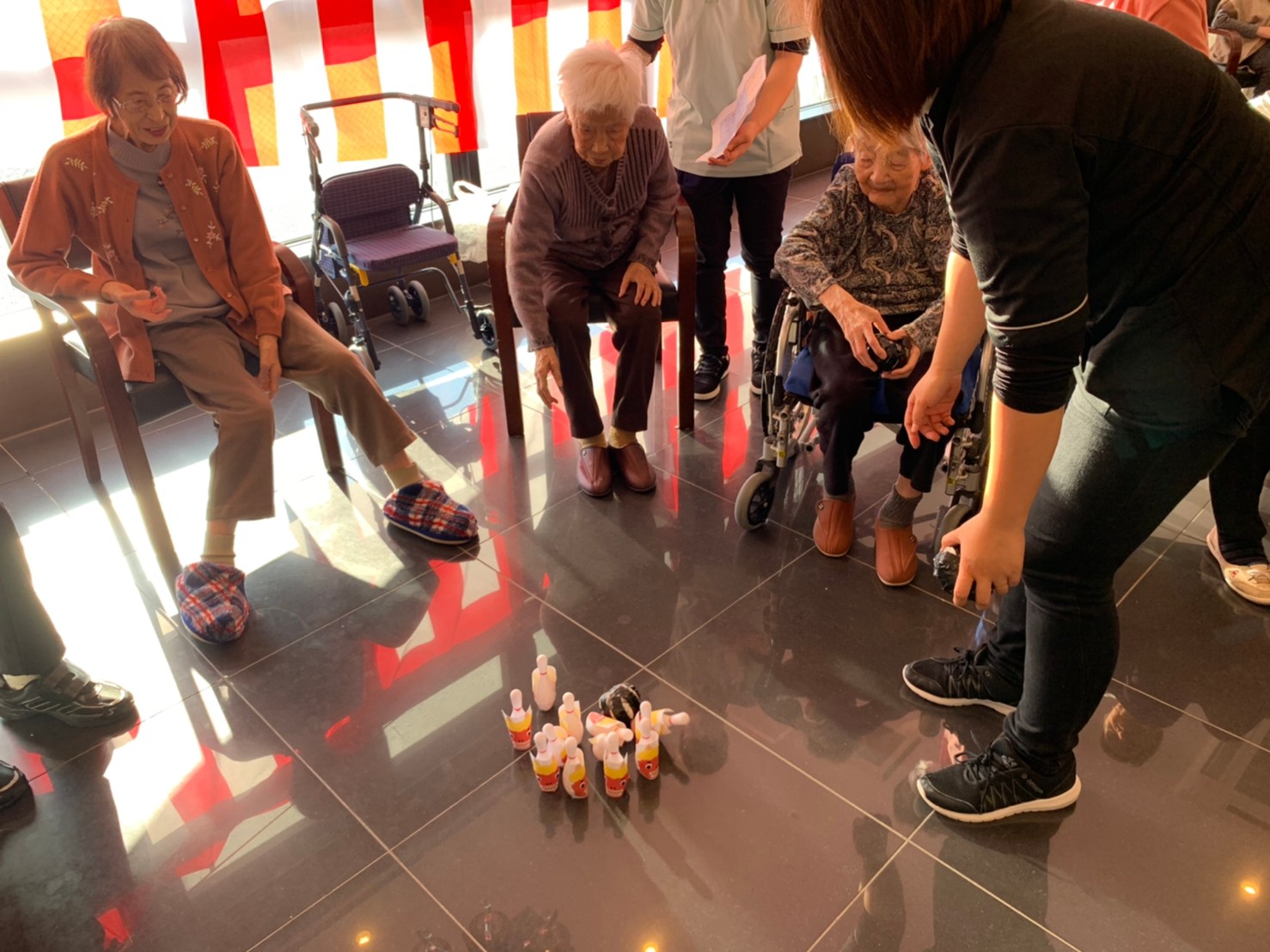 サニープレイス河瀬の月1イベントを本日開催いたしました。2月は節分祭として企画し、豆まきにちなんだミニ運動会を行いました。豆に見立てて玉入れやボーリングのピンを鬼に見立て倒しました。ちなみに玉入れに使った赤鬼のサニーちゃんと青鬼のプレイスくんは利用者さまとスタッフの共同制作です。そのあとは恒例の鬼退治です。今年から衣装も新調されたスタッフ扮する鬼に利用者さまに退治していただきました。悪さをする鬼がなぜか人気で利用者さまが握手をされました(笑)鬼の金棒は空気で膨らますビニール製ですのでご安心ください。最後はこのイベント大トリの福娘の登場です。社内選考会を何度もかさね、名誉ある今年の福娘に選ばれたスタッフが利用者さまとお一人ずつお話をしながら記念撮影をいたしました。ボクも来年の福娘選考会に応募すると言ったら、スタッフ全員から来年も鬼やで!と止められたのはここだけのお話です(‘Д’)