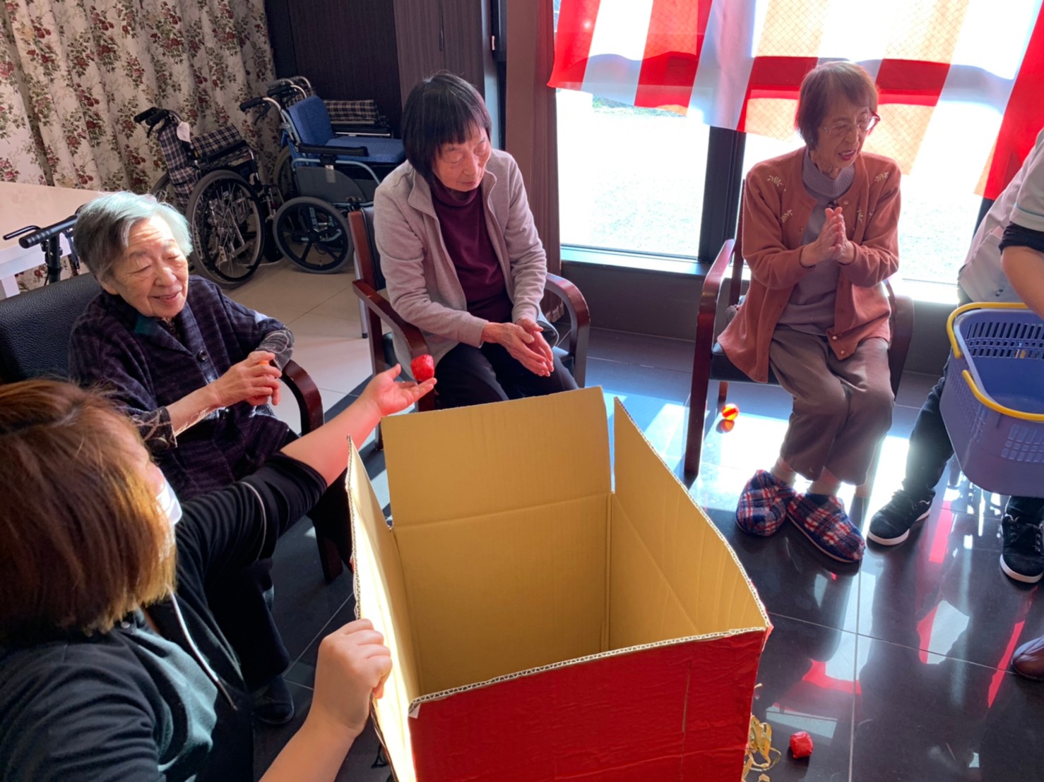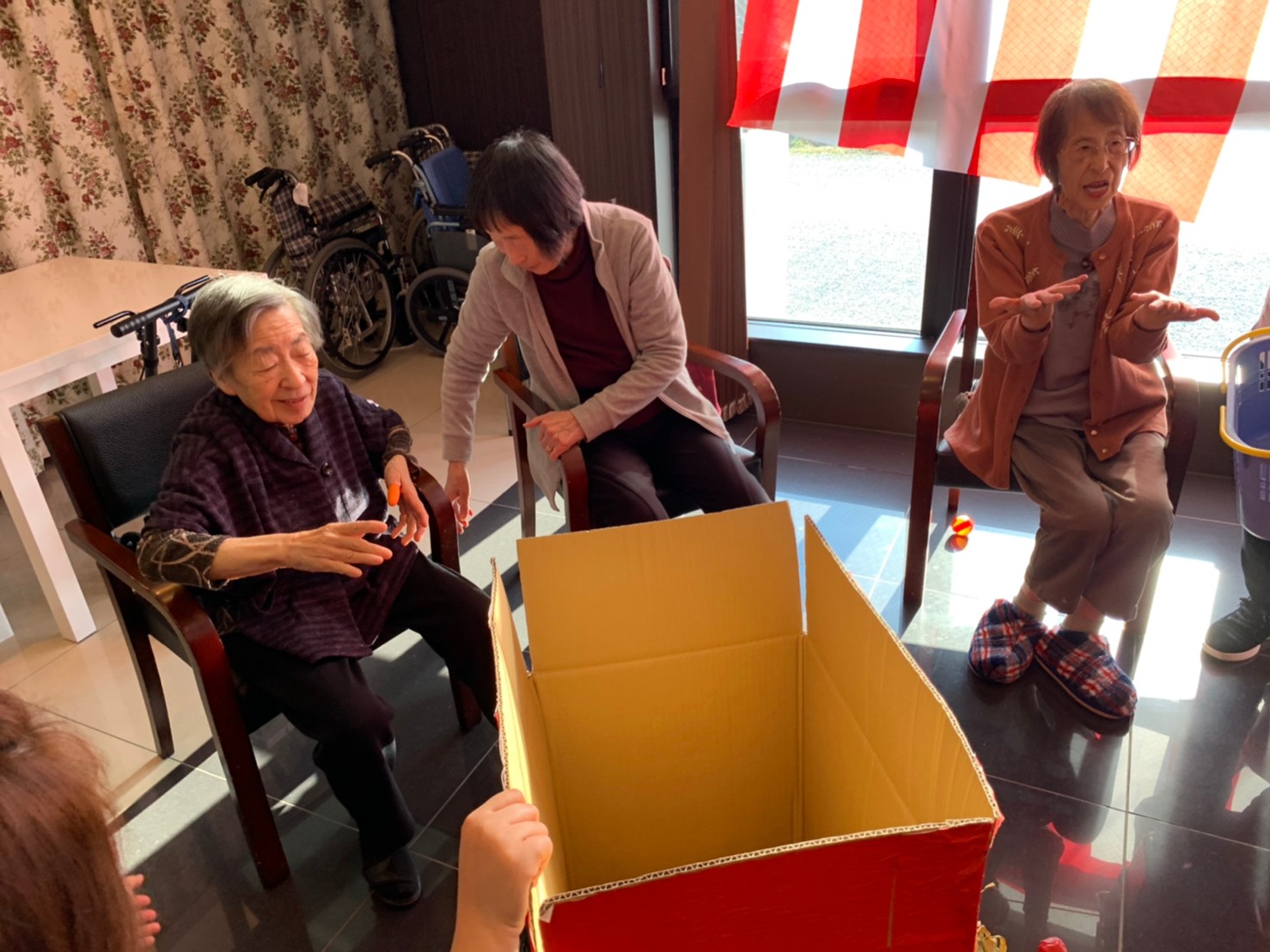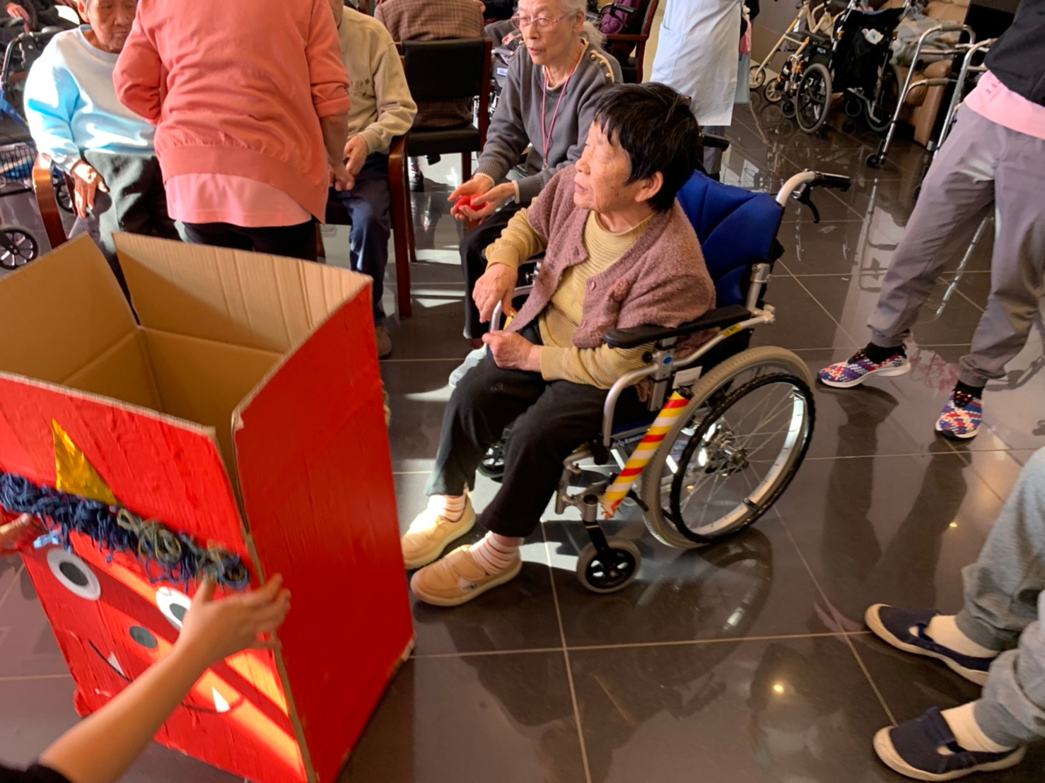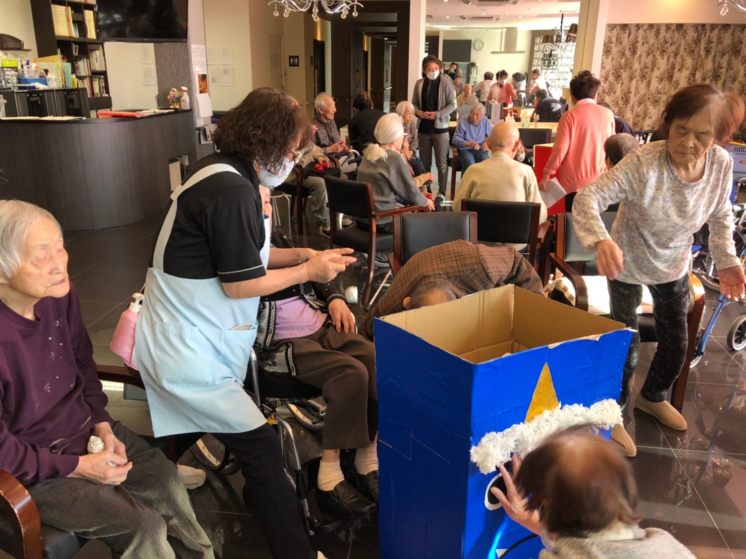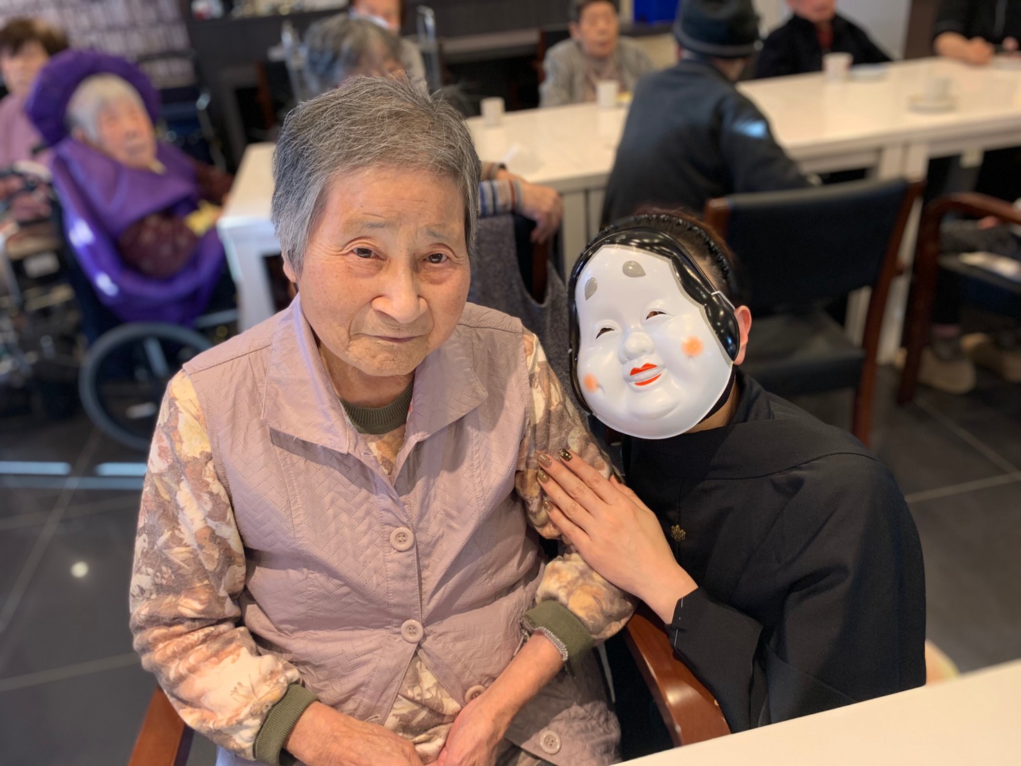 サニープレイス河瀬の月1イベントを本日開催いたしました。2月は節分祭として企画し、豆まきにちなんだミニ運動会を行いました。豆に見立てて玉入れやボーリングのピンを鬼に見立て倒しました。ちなみに玉入れに使った赤鬼のサニーちゃんと青鬼のプレイスくんは利用者さまとスタッフの共同制作です。そのあとは恒例の鬼退治です。今年から衣装も新調されたスタッフ扮する鬼に利用者さまに退治していただきました。悪さをする鬼がなぜか人気で利用者さまが握手をされました(笑)鬼の金棒は空気で膨らますビニール製ですのでご安心ください。最後はこのイベント大トリの福娘の登場です。社内選考会を何度もかさね、名誉ある今年の福娘に選ばれたスタッフが利用者さまとお一人ずつお話をしながら記念撮影をいたしました。ボクも来年の福娘選考会に応募すると言ったら、スタッフ全員から来年も鬼やで!と止められたのはここだけのお話です(‘Д’)