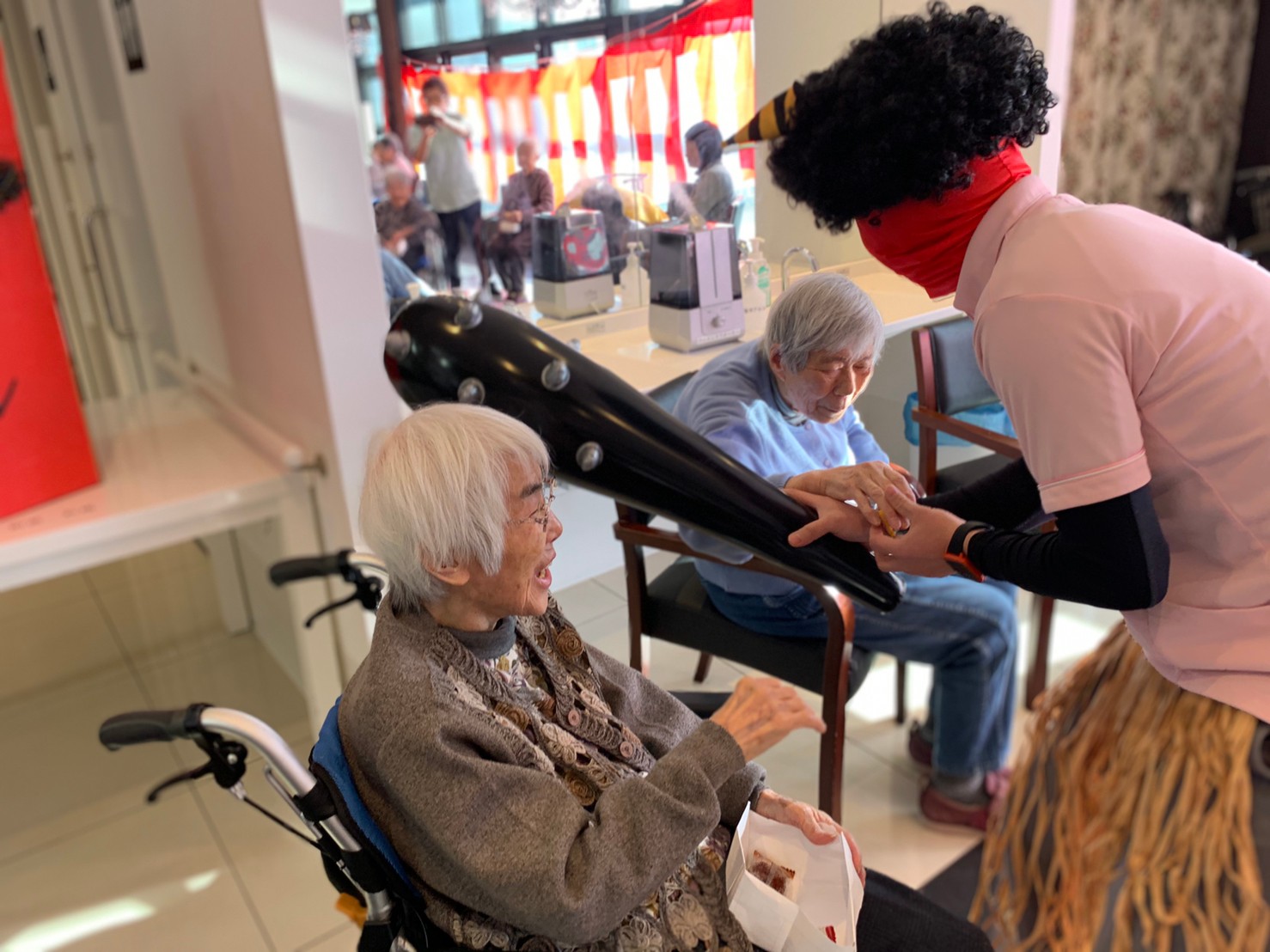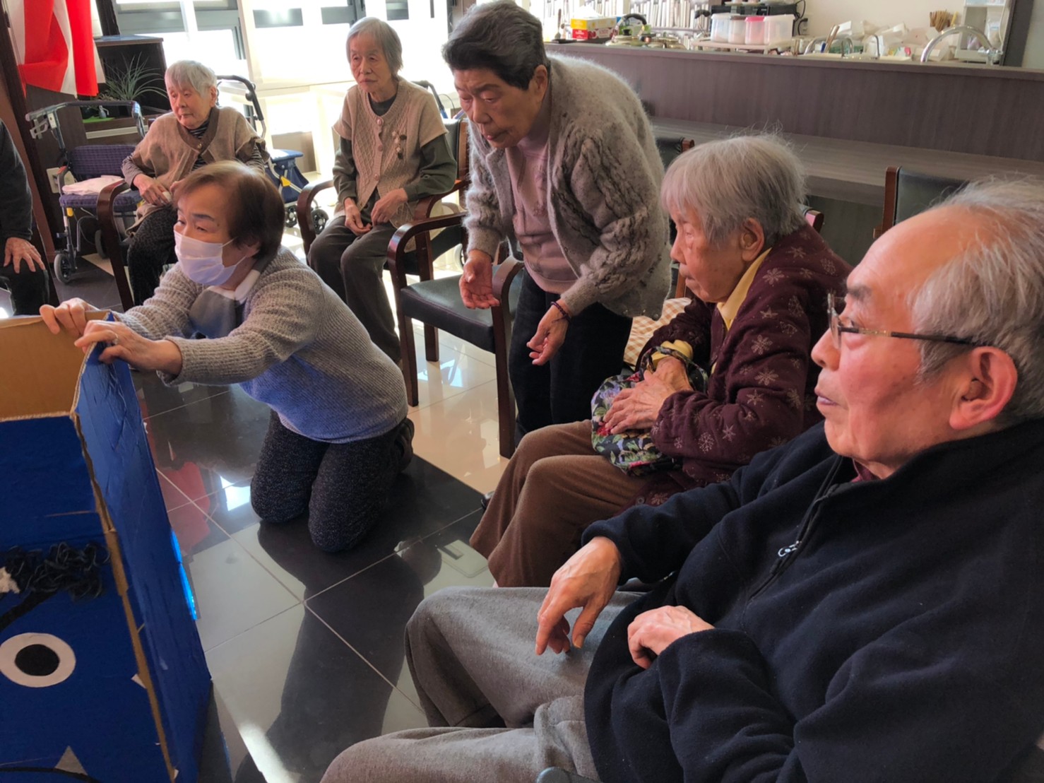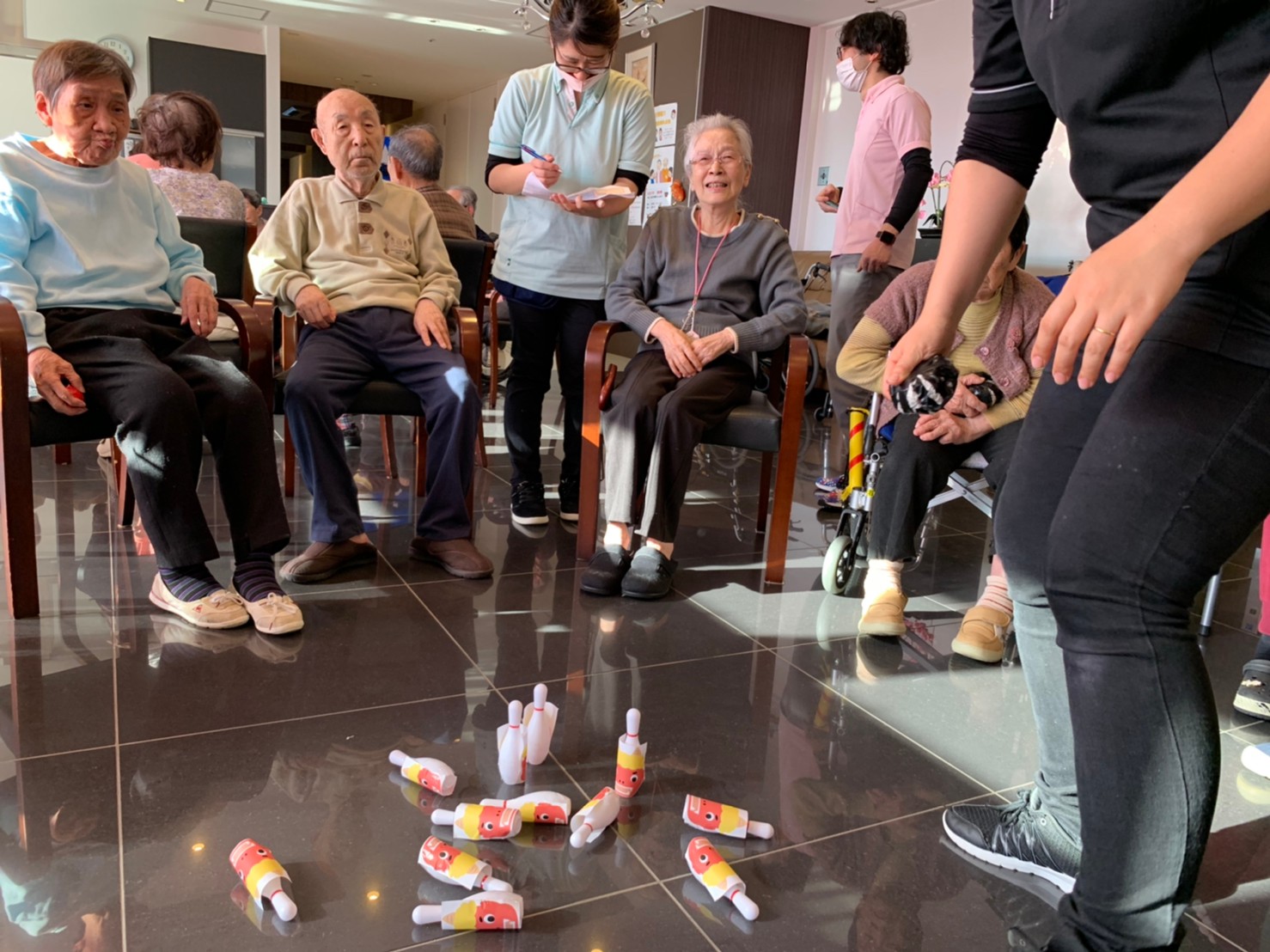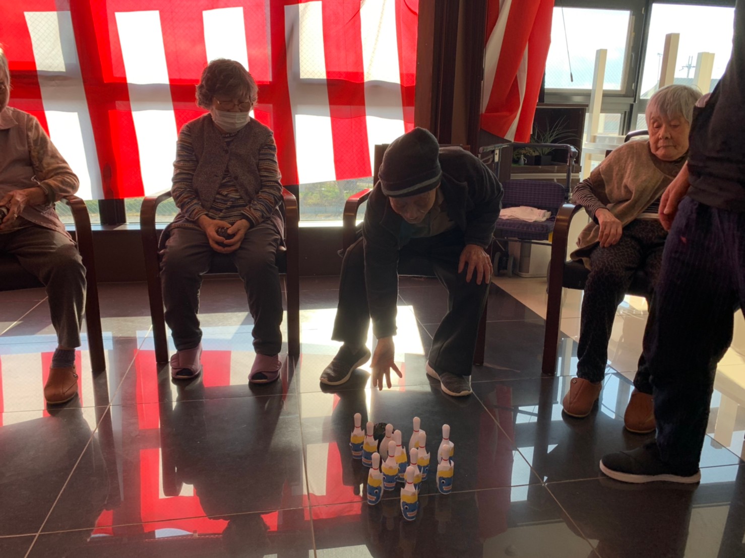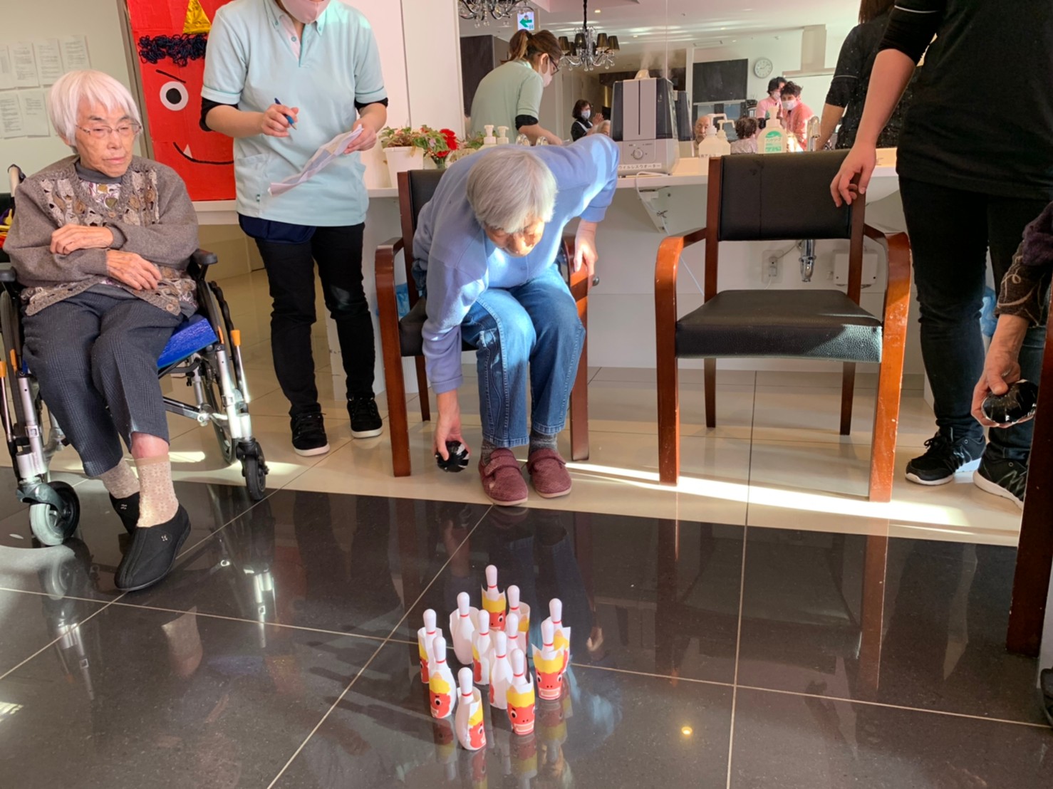 サニープレイス河瀬の月1イベントを本日開催いたしました。2月は節分祭として企画し、豆まきにちなんだミニ運動会を行いました。豆に見立てて玉入れやボーリングのピンを鬼に見立て倒しました。ちなみに玉入れに使った赤鬼のサニーちゃんと青鬼のプレイスくんは利用者さまとスタッフの共同制作です。そのあとは恒例の鬼退治です。今年から衣装も新調されたスタッフ扮する鬼に利用者さまに退治していただきました。悪さをする鬼がなぜか人気で利用者さまが握手をされました(笑)鬼の金棒は空気で膨らますビニール製ですのでご安心ください。最後はこのイベント大トリの福娘の登場です。社内選考会を何度もかさね、名誉ある今年の福娘に選ばれたスタッフが利用者さまとお一人ずつお話をしながら記念撮影をいたしました。ボクも来年の福娘選考会に応募すると言ったら、スタッフ全員から来年も鬼やで!と止められたのはここだけのお話です(‘Д’)