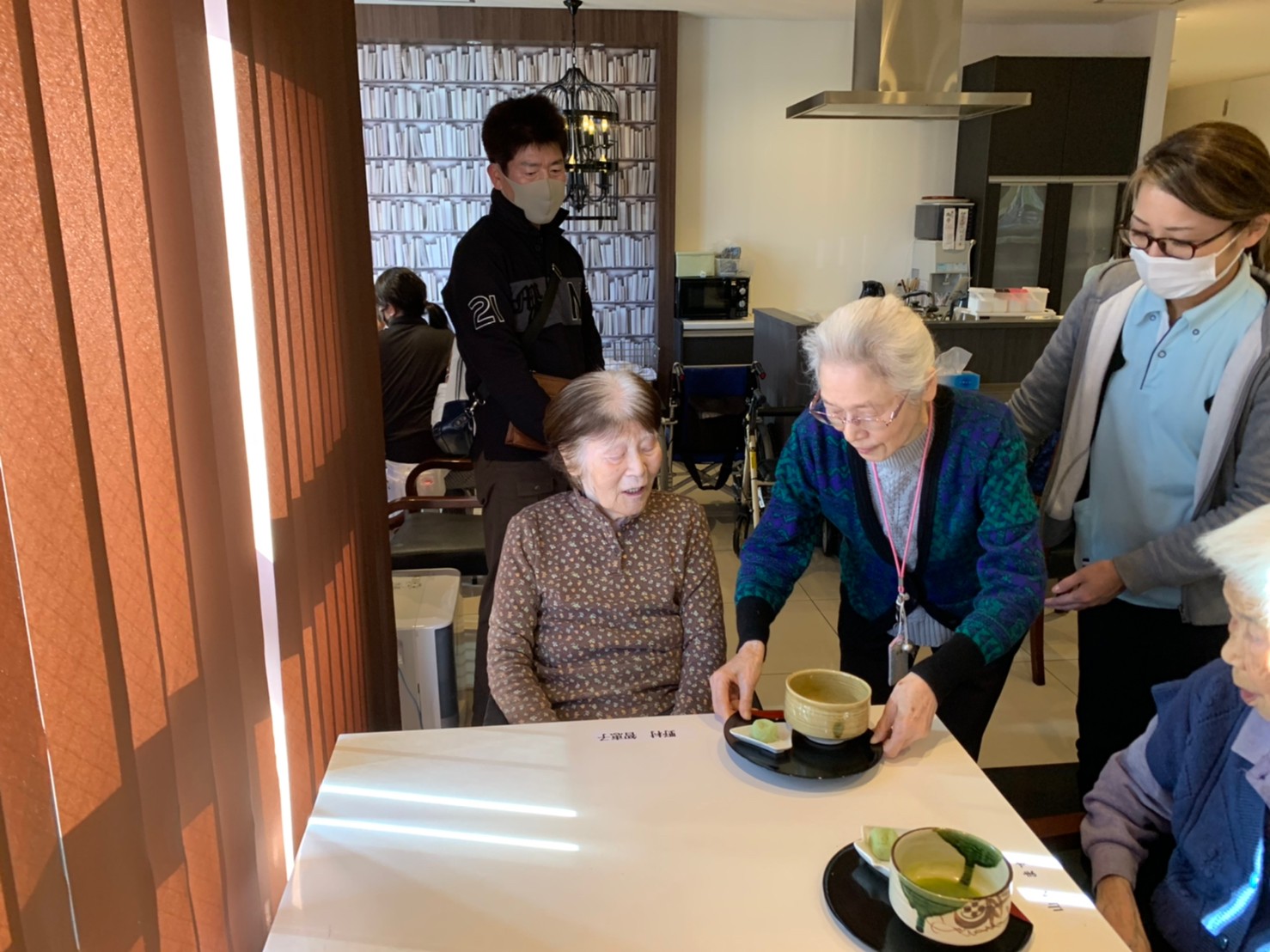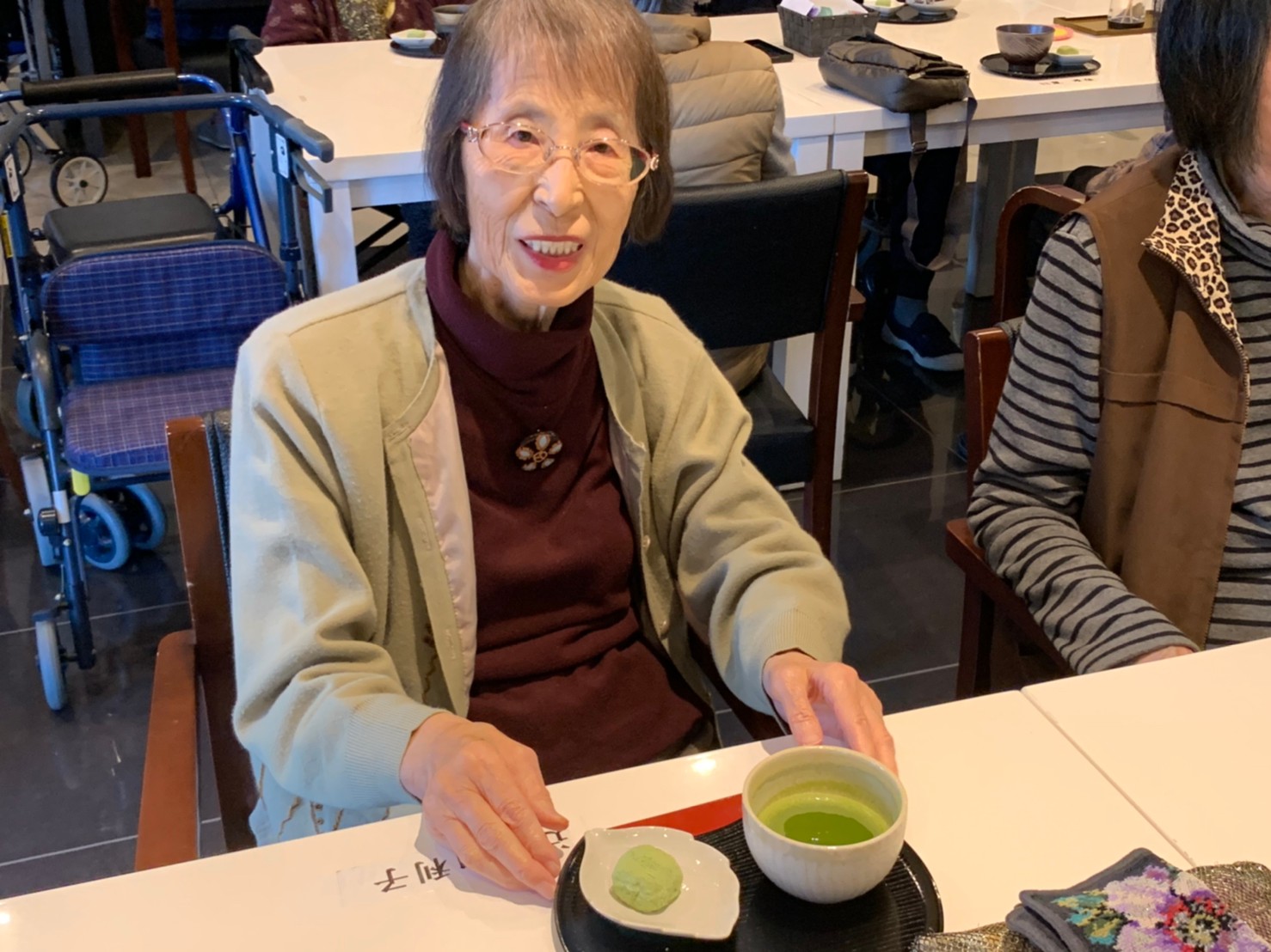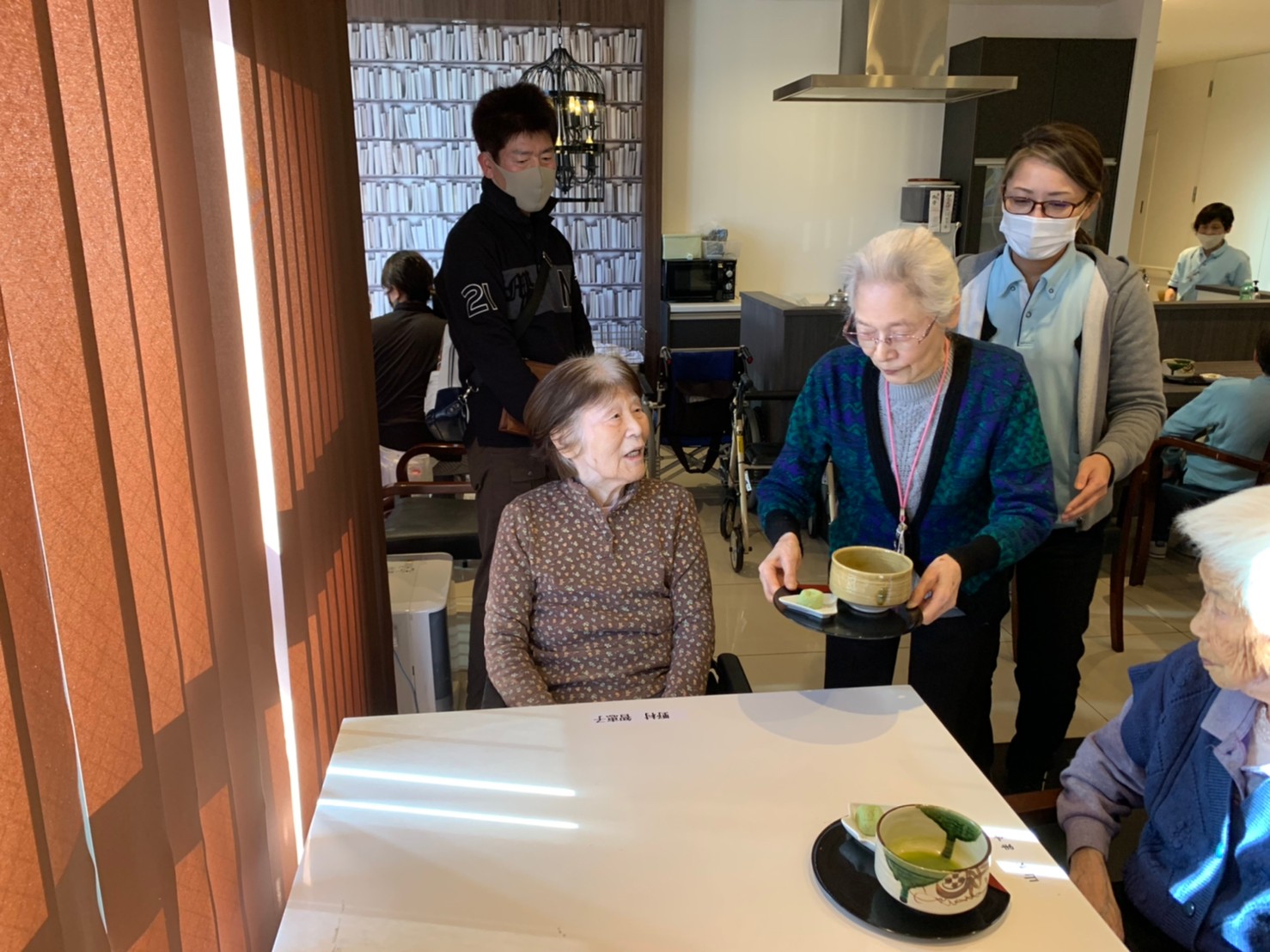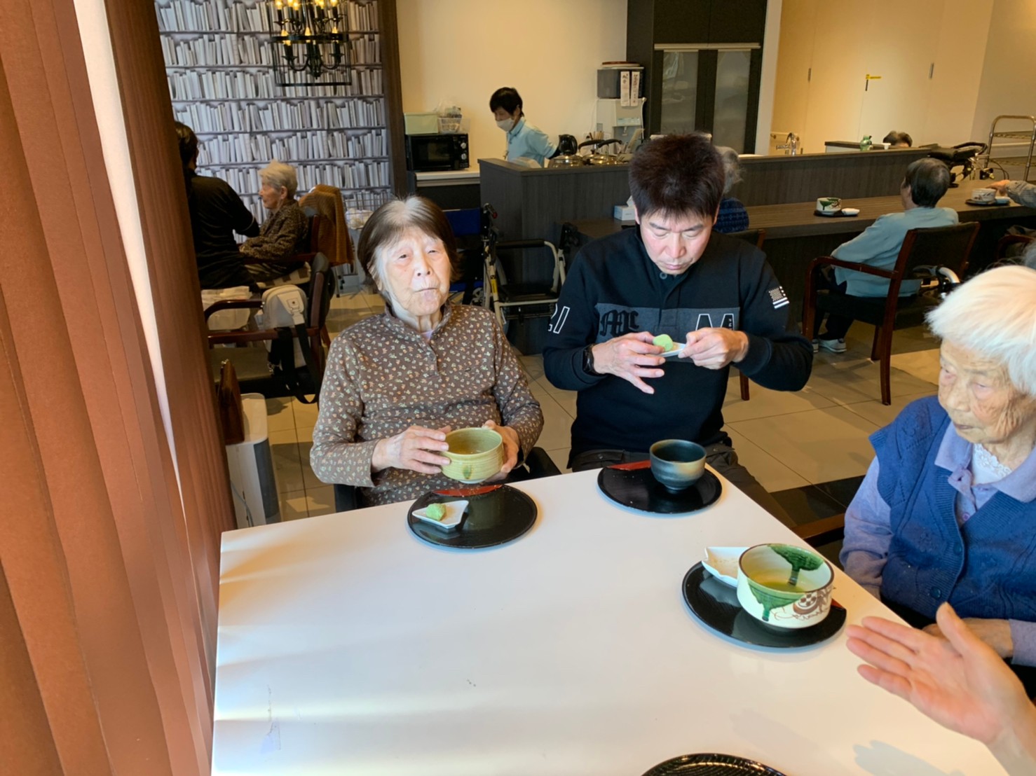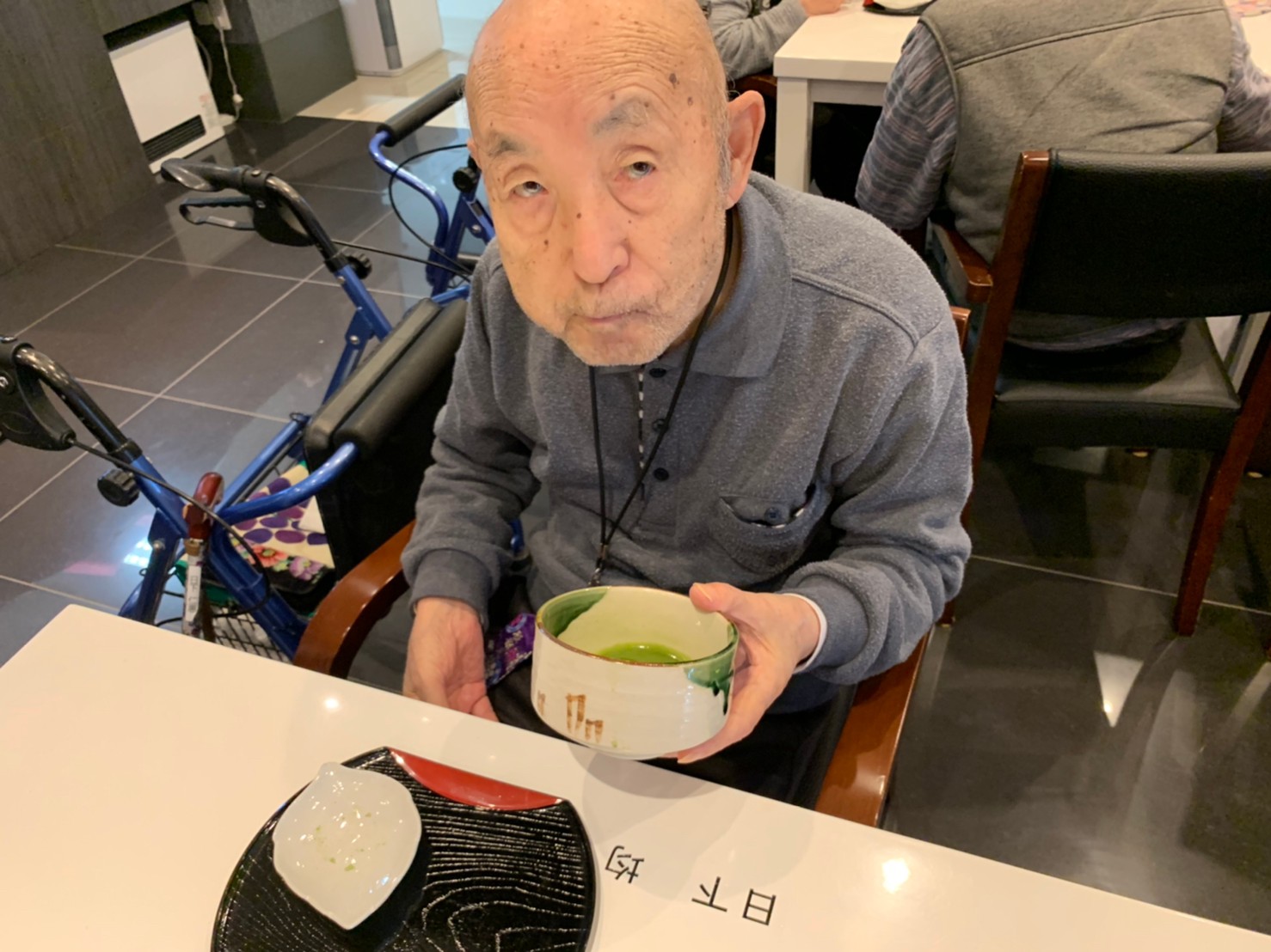 本日からサニープレイス河瀬に新しい利用者さまがご入居されました。ウェルカムパーティーとしてお茶会を開催いたしました。お茶をたてるのがお上手な利用者さまが代表してお抹茶をお持ちしていただきました。