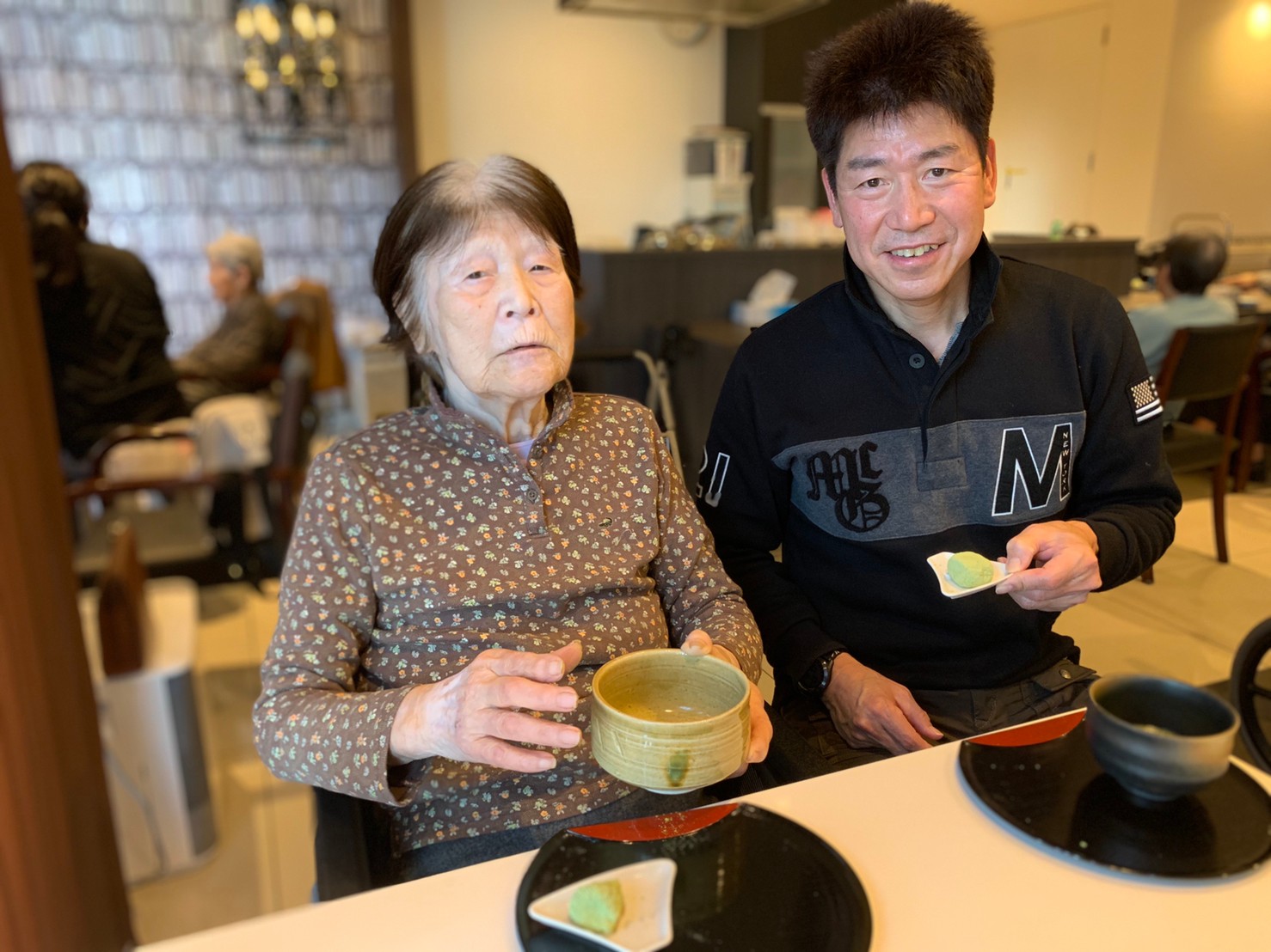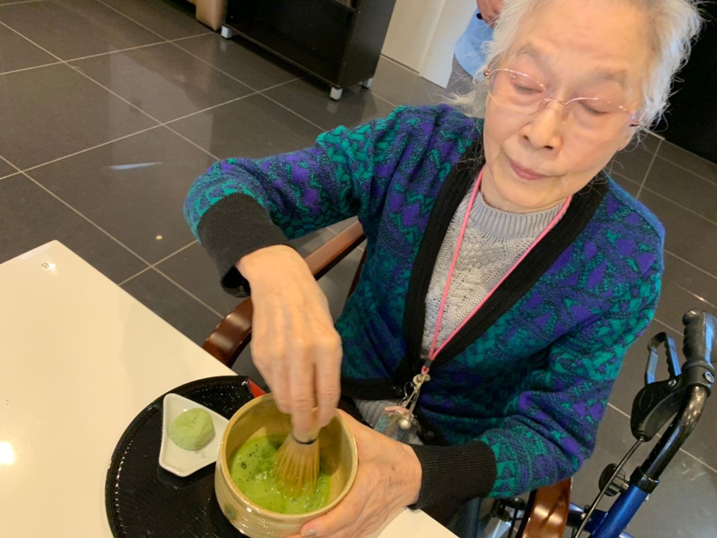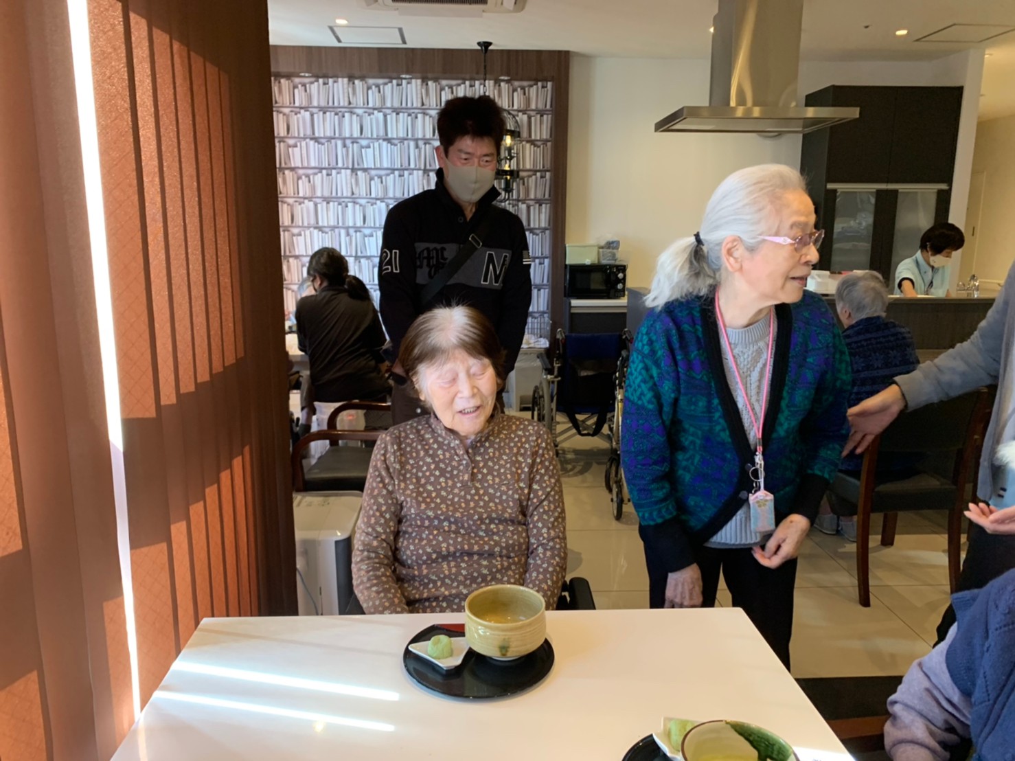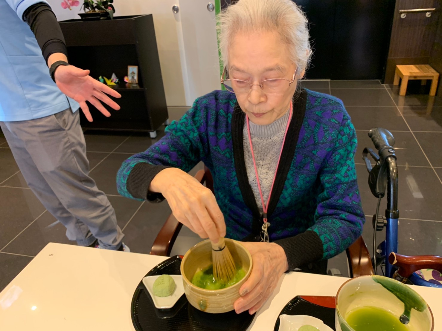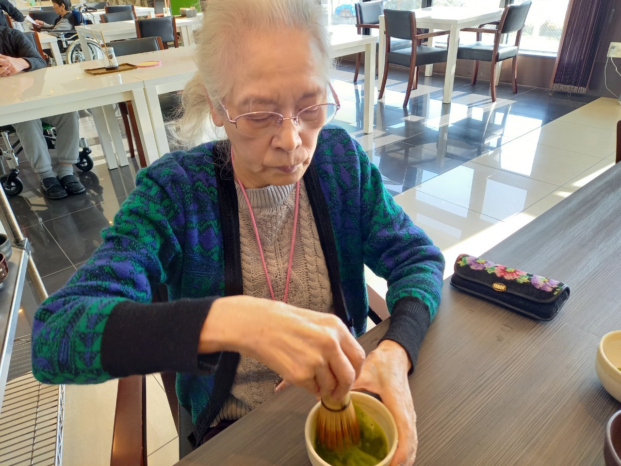本日からサニープレイス河瀬に新しい利用者さまがご入居されました。ウェルカムパーティーとしてお茶会を開催いたしました。お茶をたてるのがお上手な利用者さまが代表してお抹茶をお持ちしていただきました。