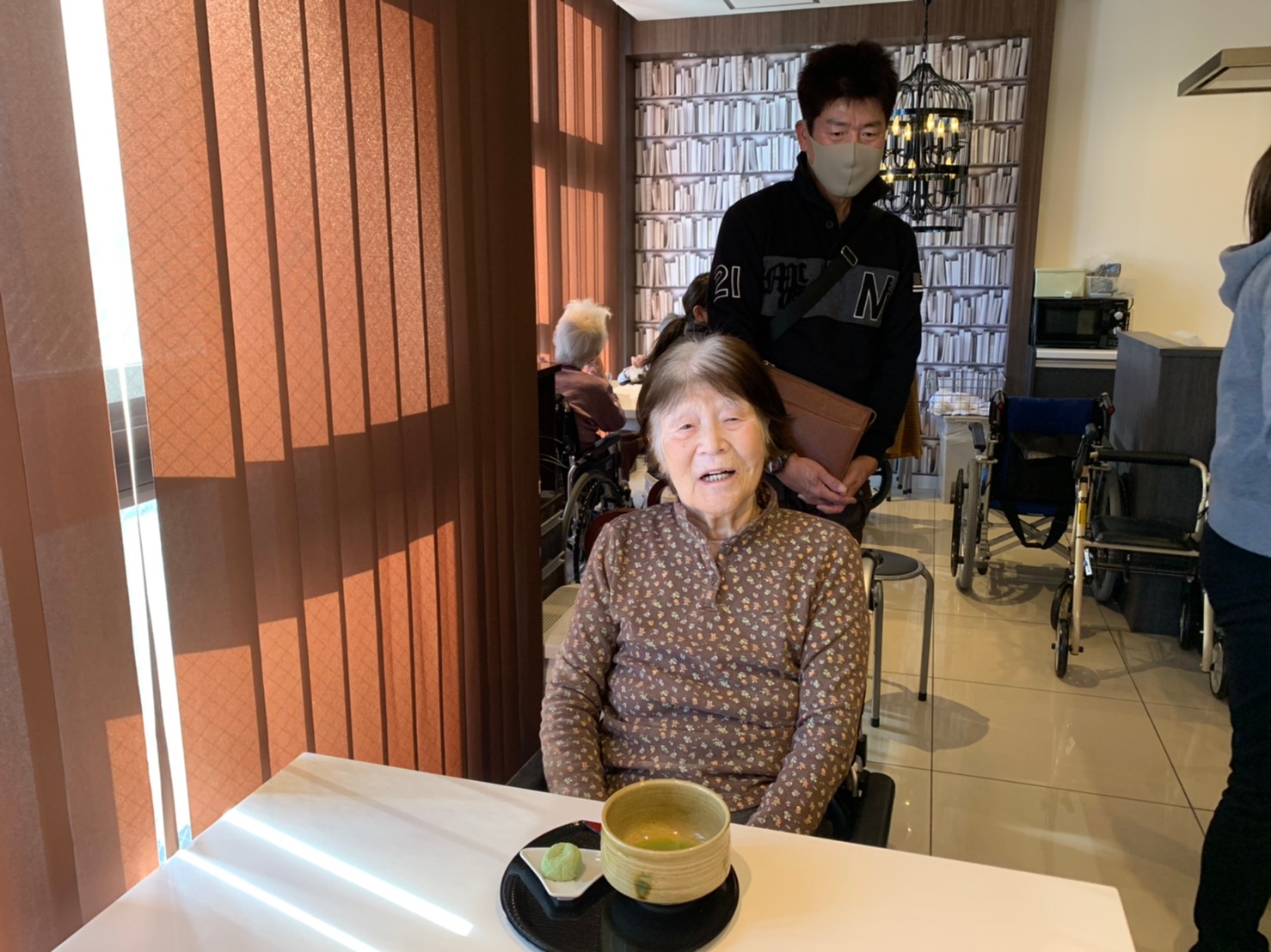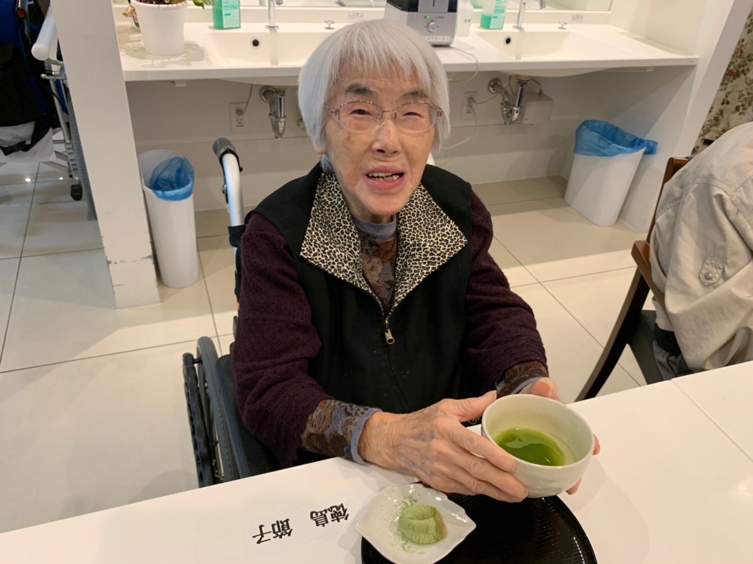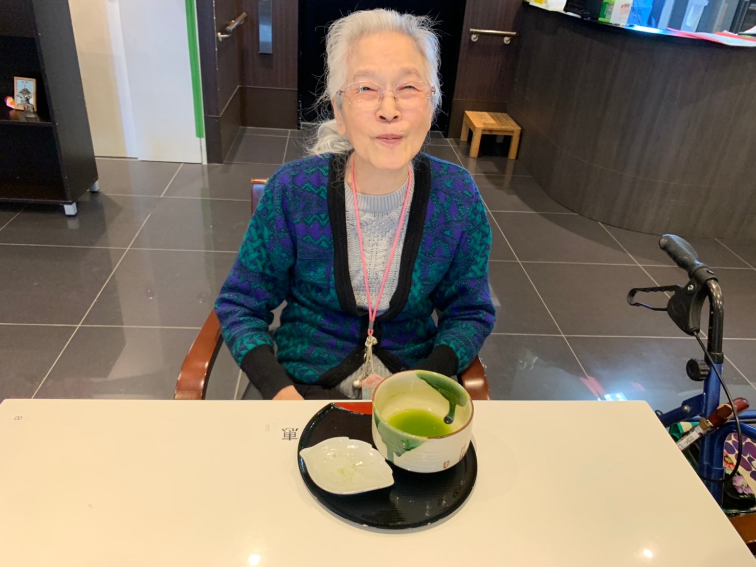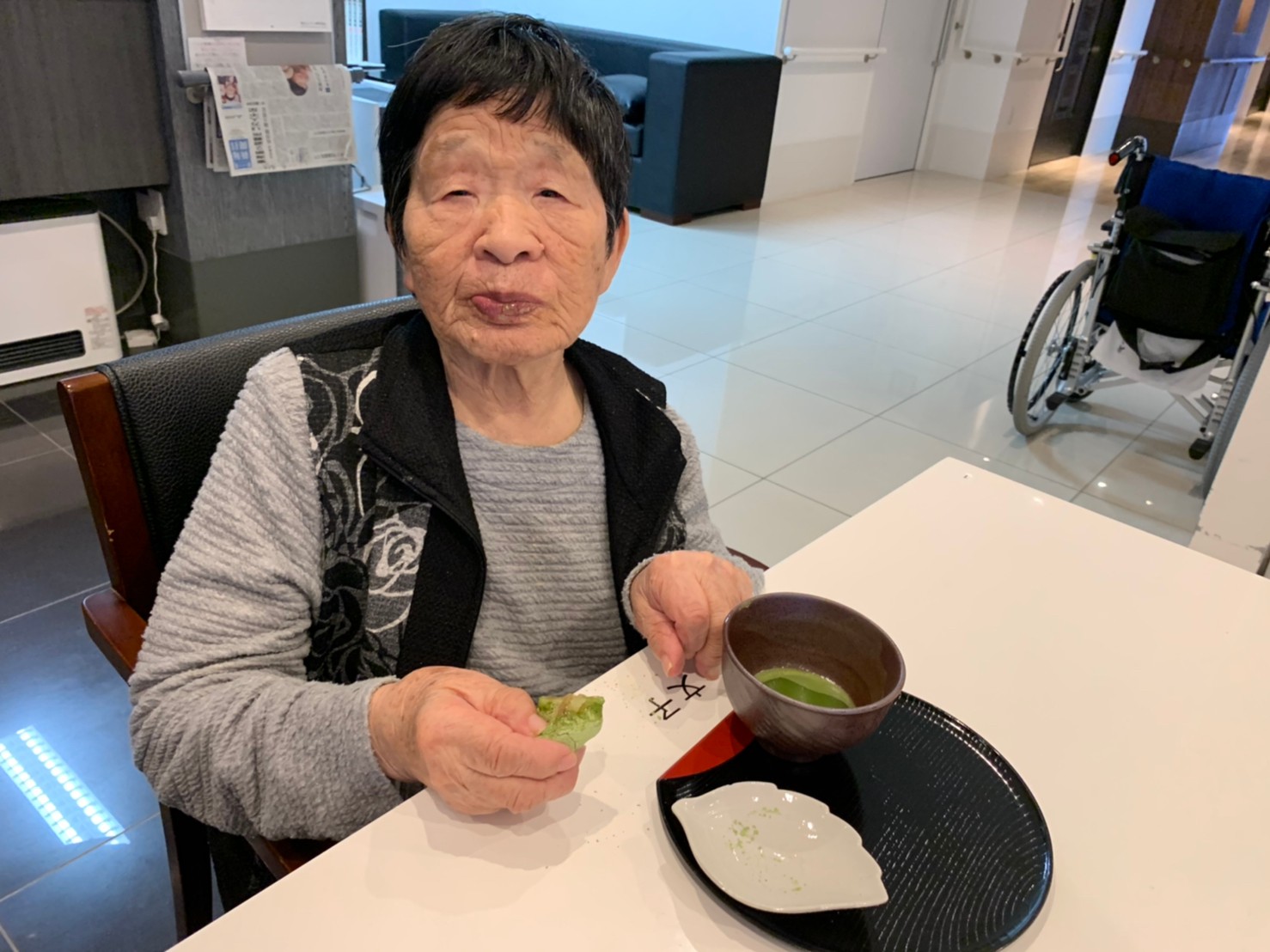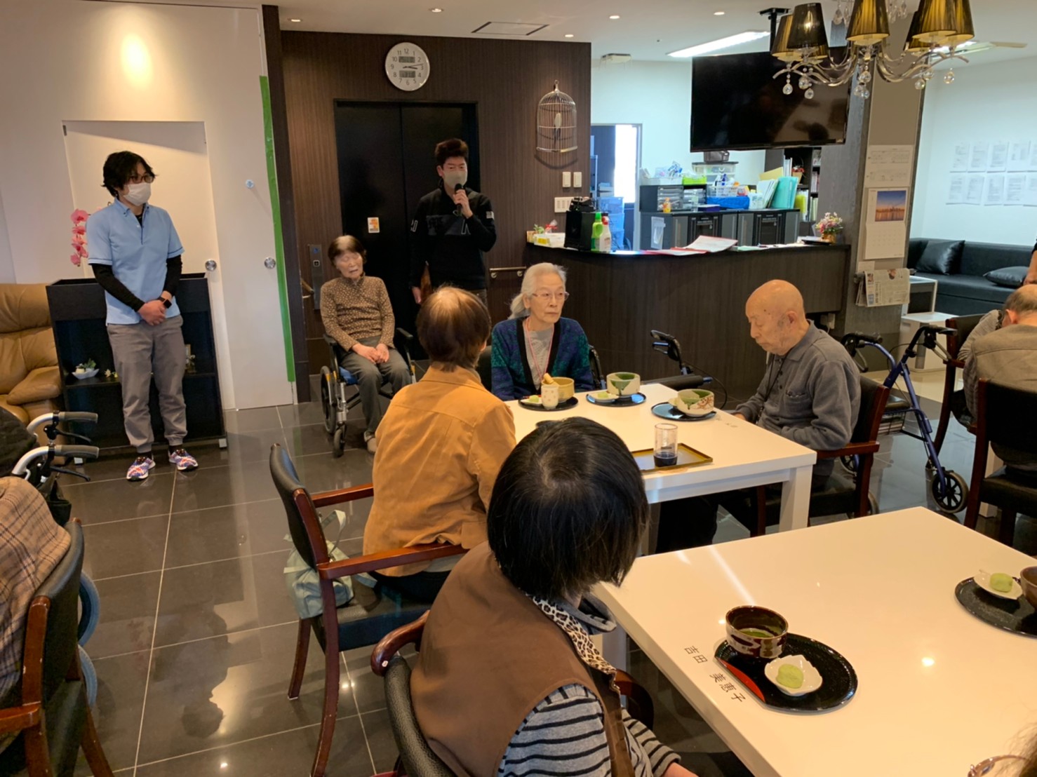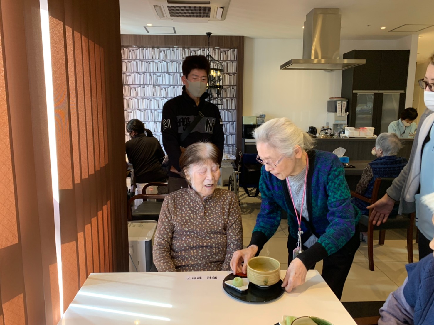 本日からサニープレイス河瀬に新しい利用者さまがご入居されました。ウェルカムパーティーとしてお茶会を開催いたしました。お茶をたてるのがお上手な利用者さまが代表してお抹茶をお持ちしていただきました。