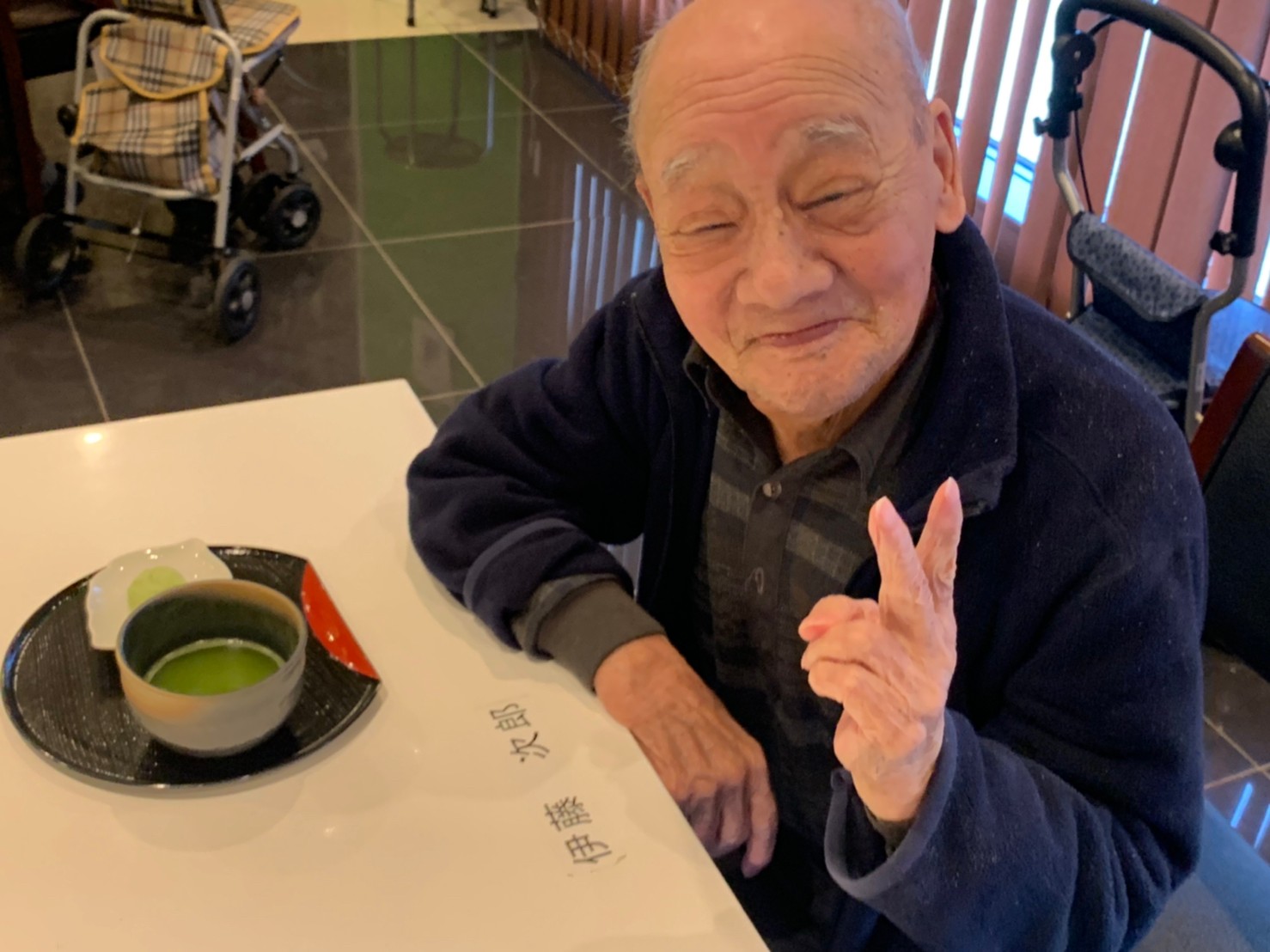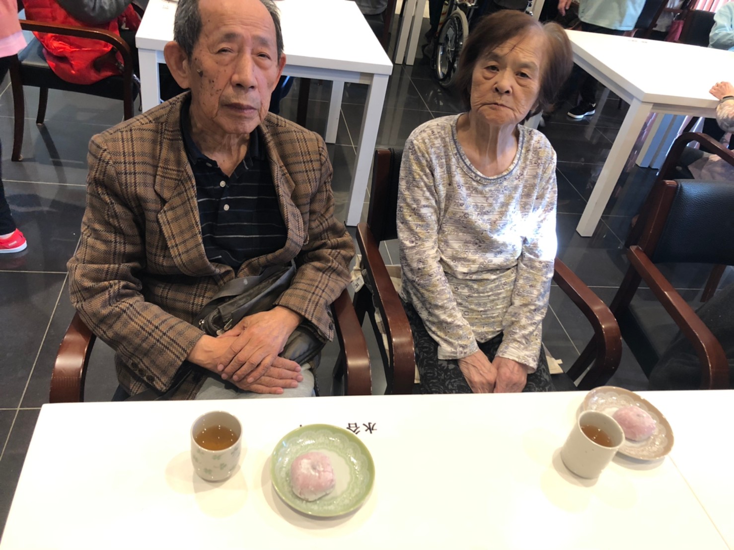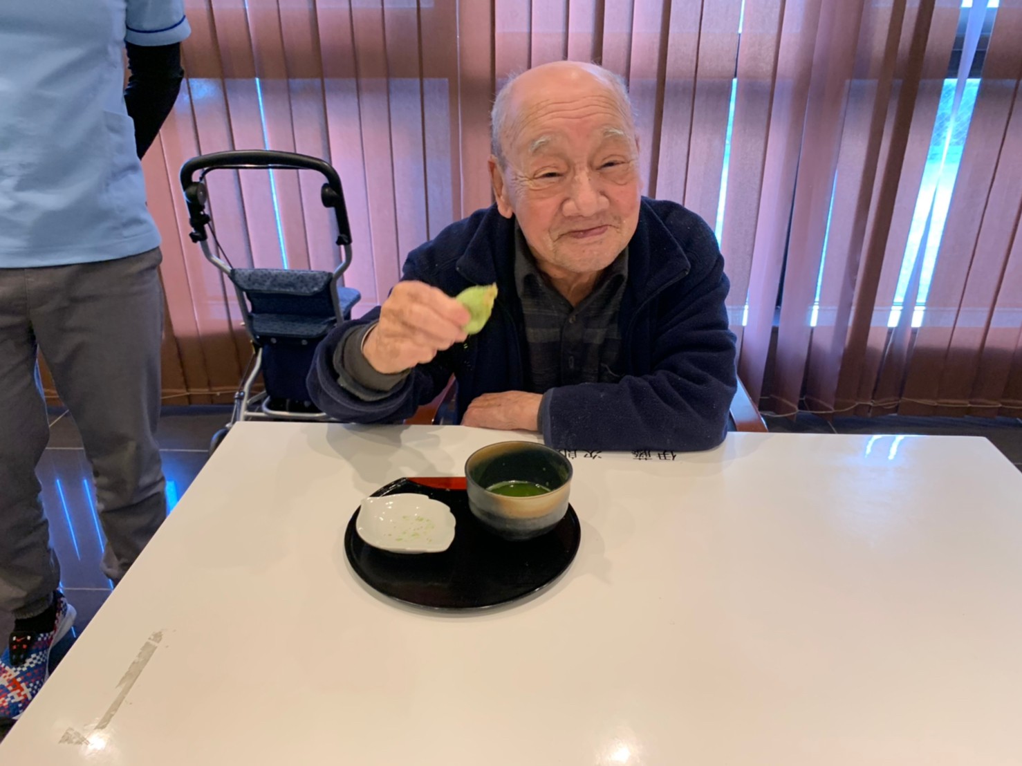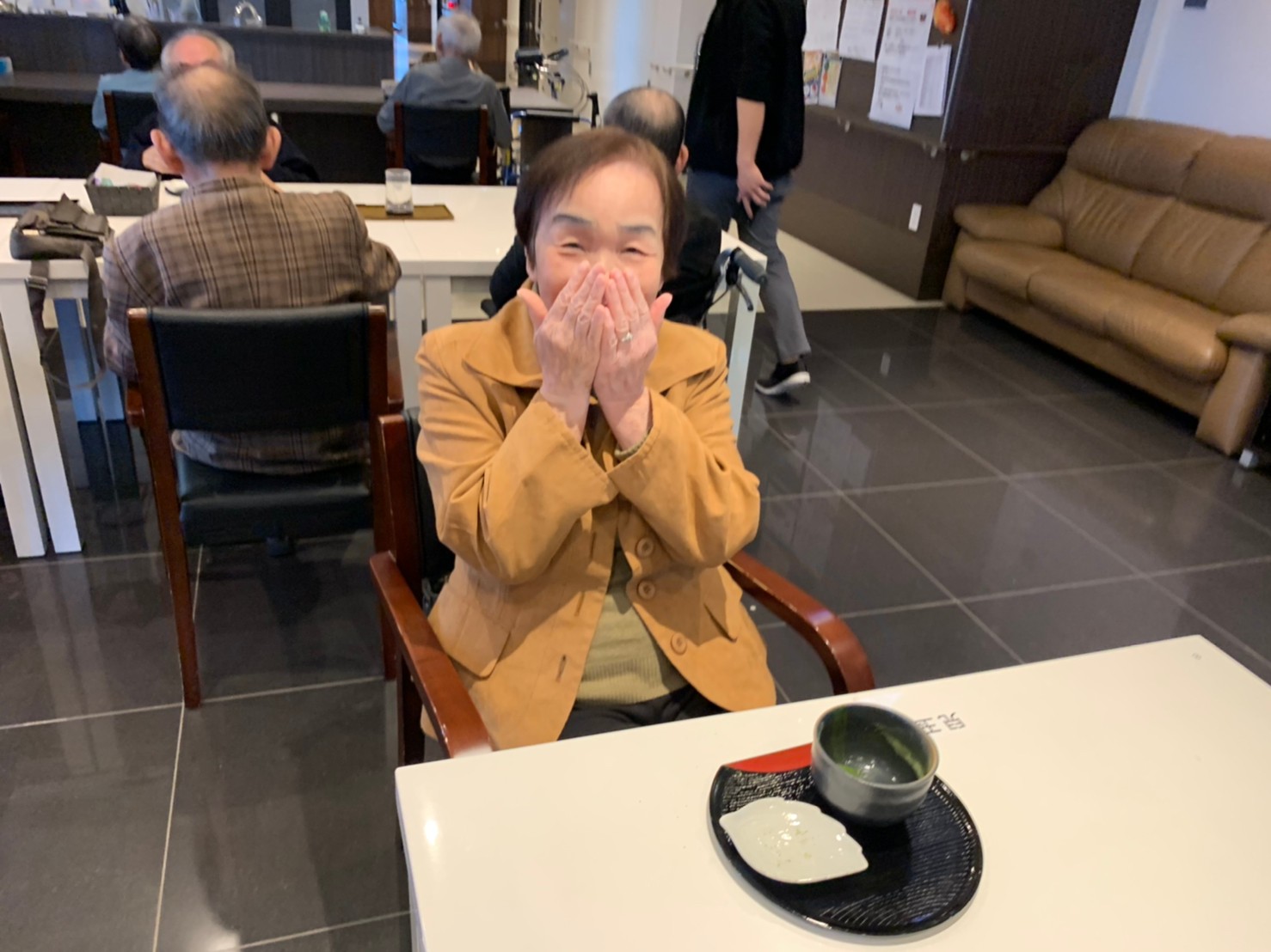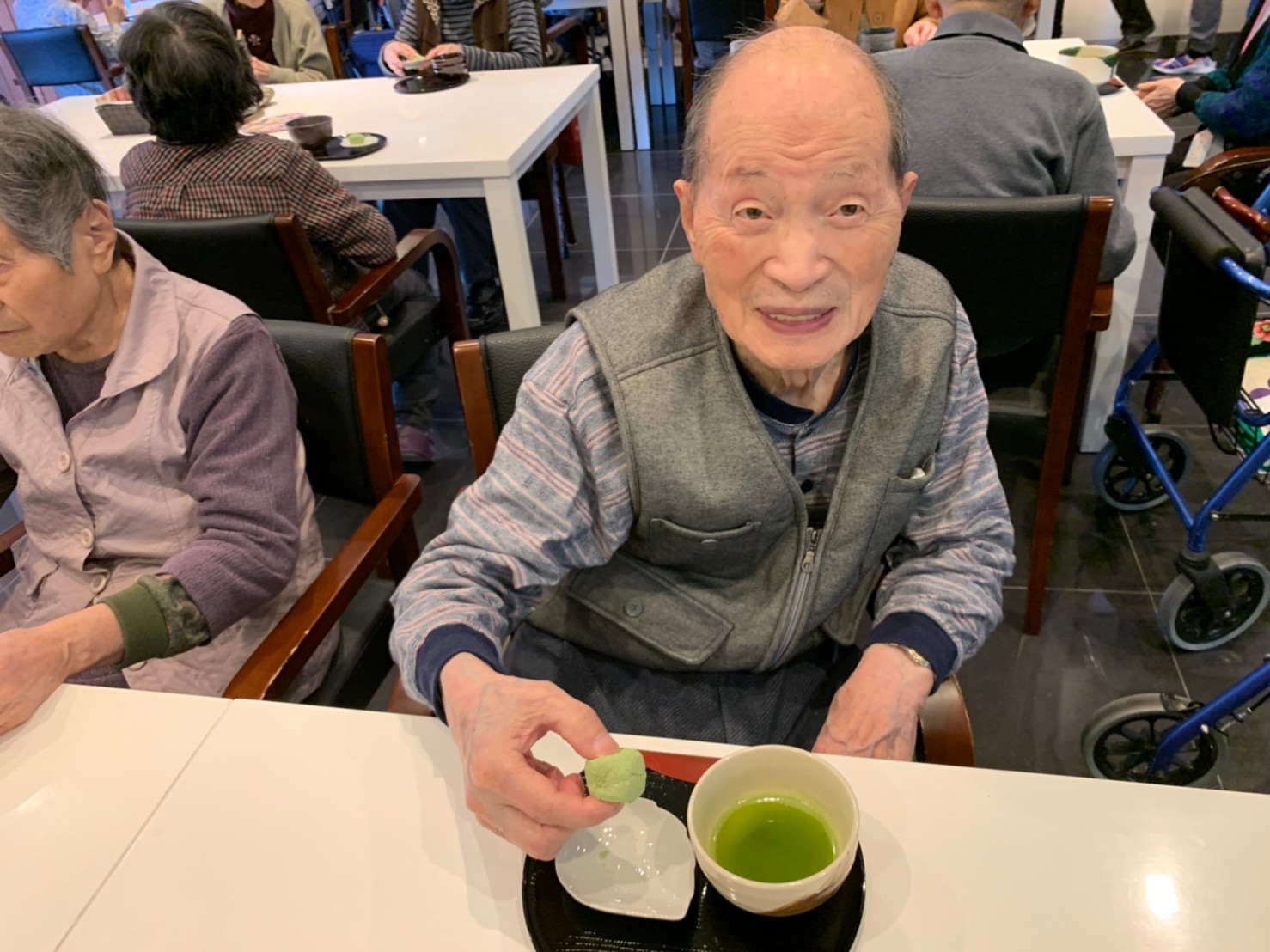 本日からサニープレイス河瀬に新しい利用者さまがご入居されました。ウェルカムパーティーとしてお茶会を開催いたしました。お茶をたてるのがお上手な利用者さまが代表してお抹茶をお持ちしていただきました。