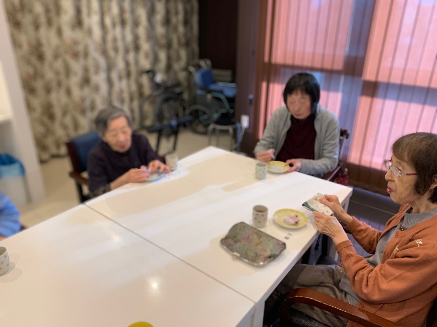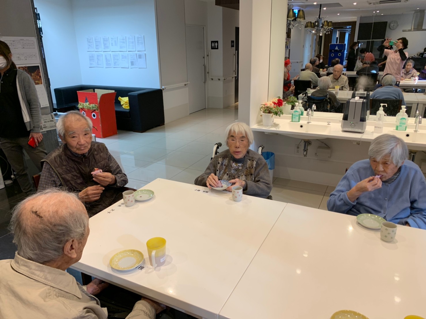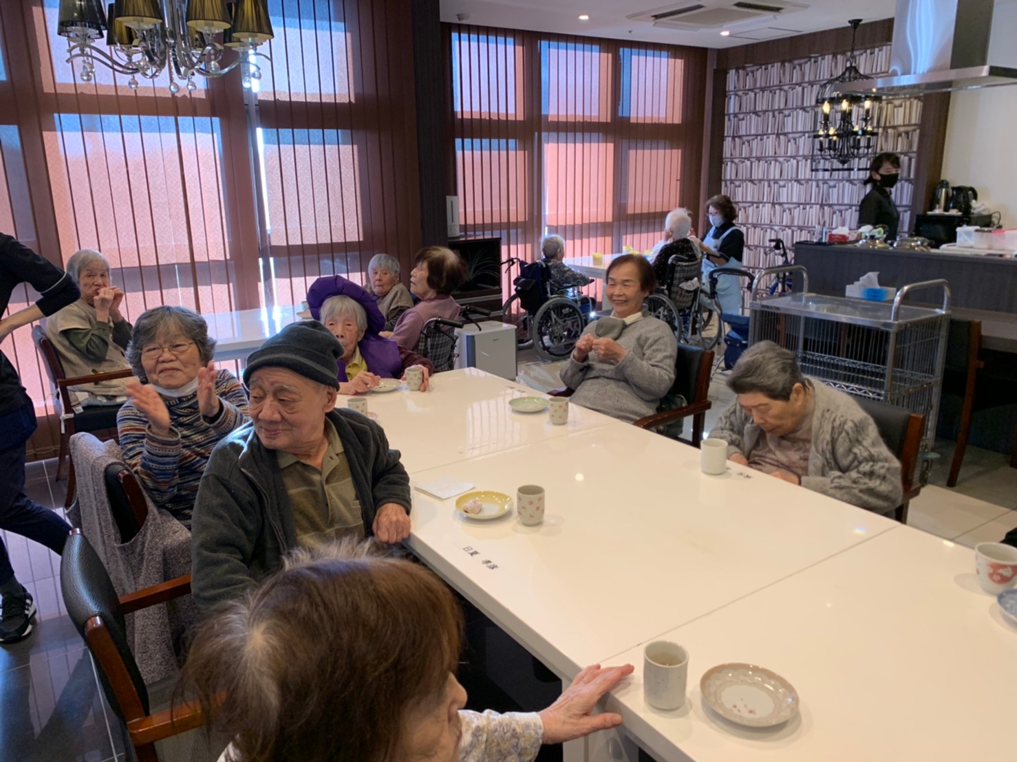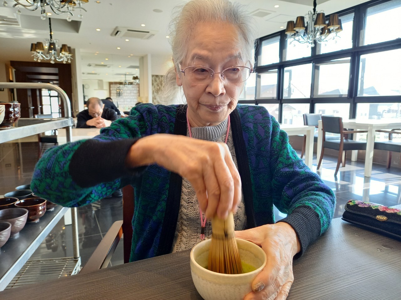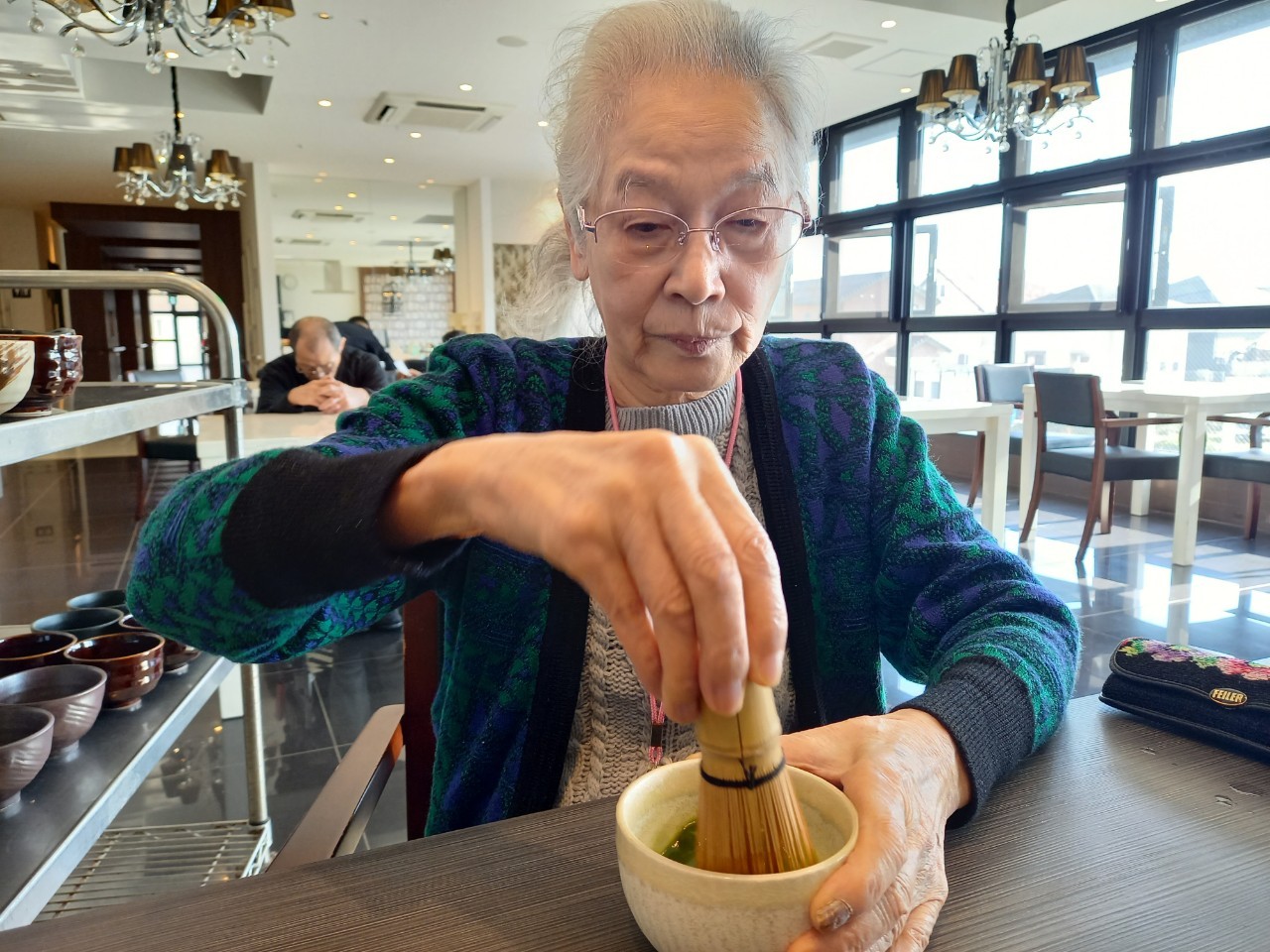 本日からサニープレイス河瀬に新しい利用者さまがご入居されました。ウェルカムパーティーとしてお茶会を開催いたしました。お茶をたてるのがお上手な利用者さまが代表してお抹茶をお持ちしていただきました。