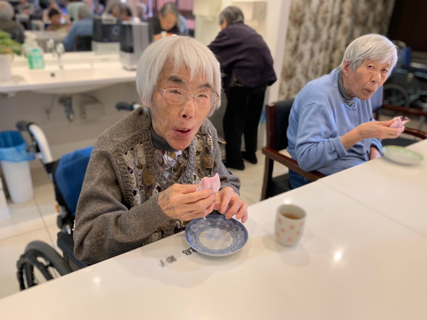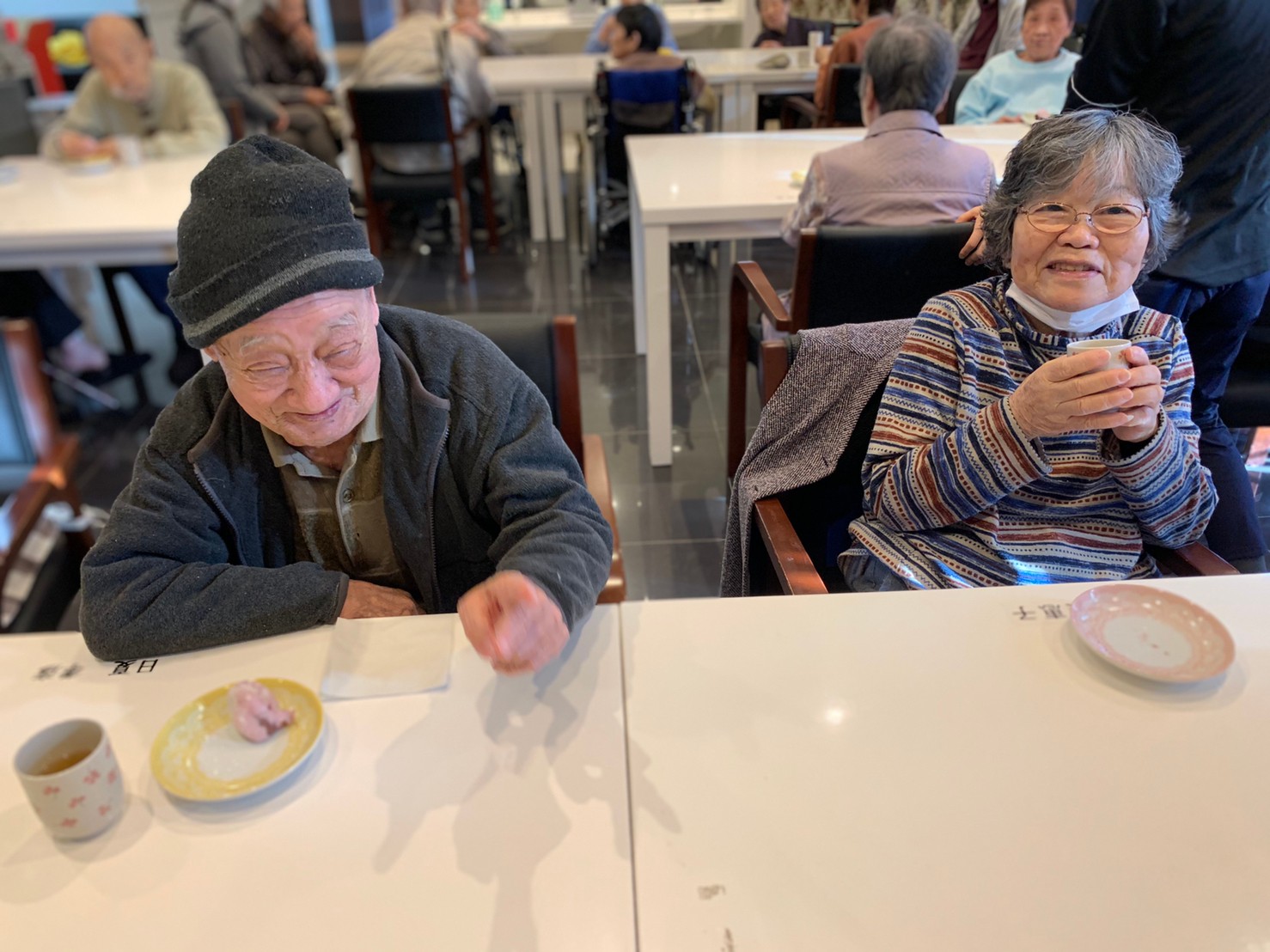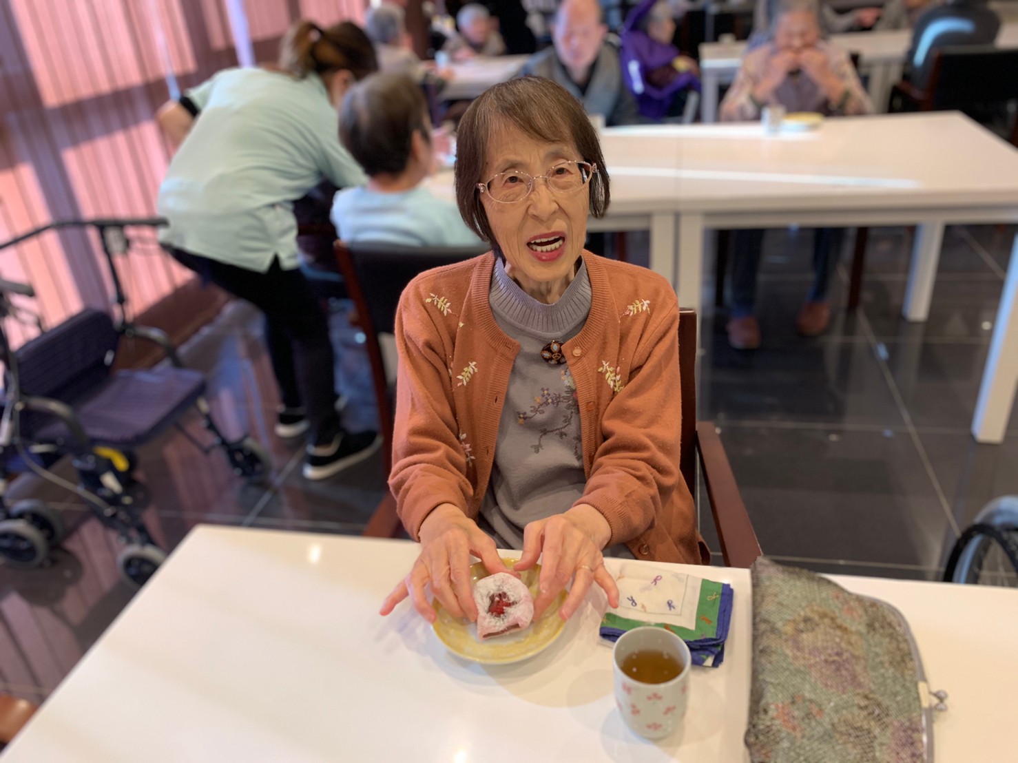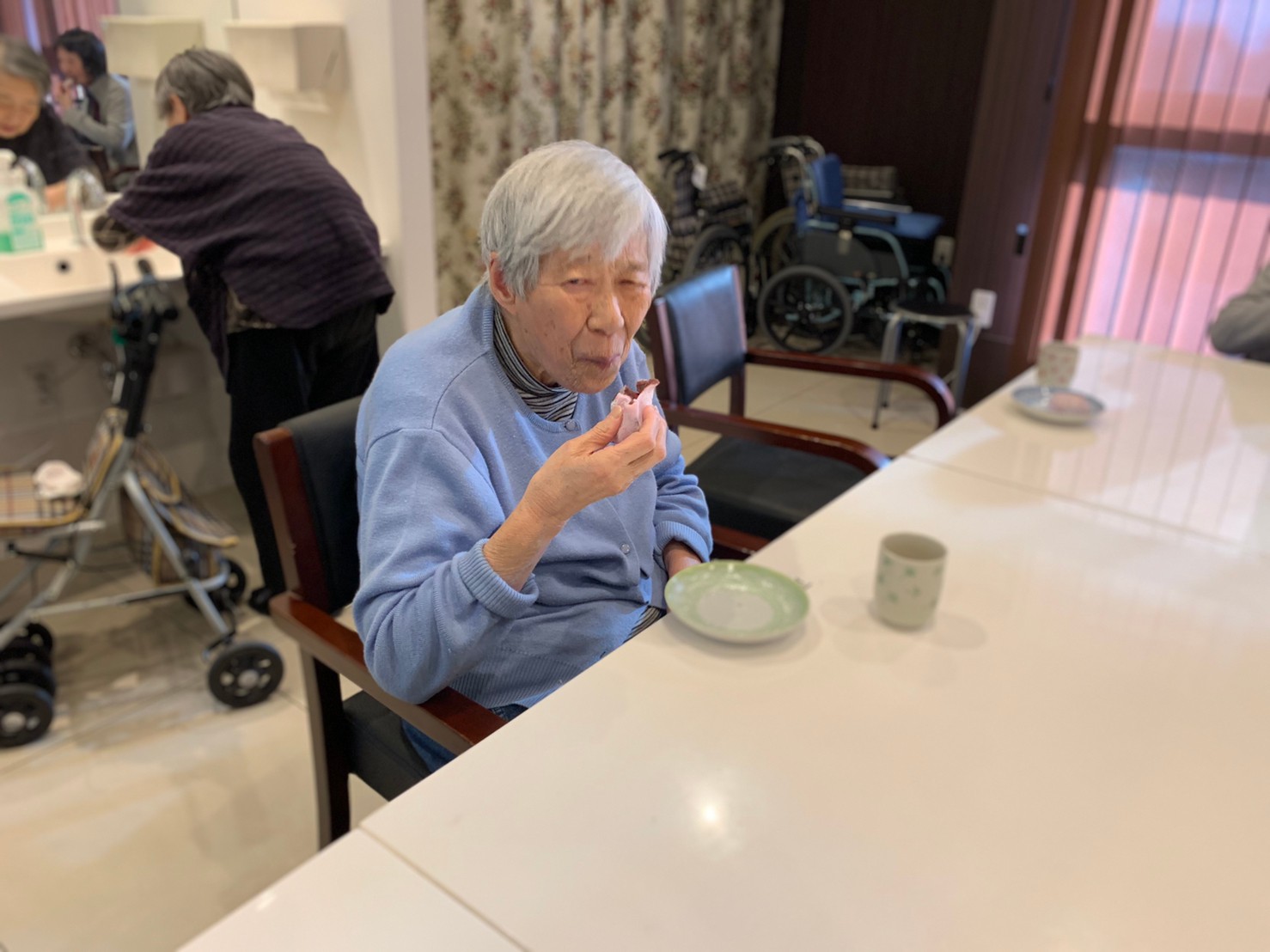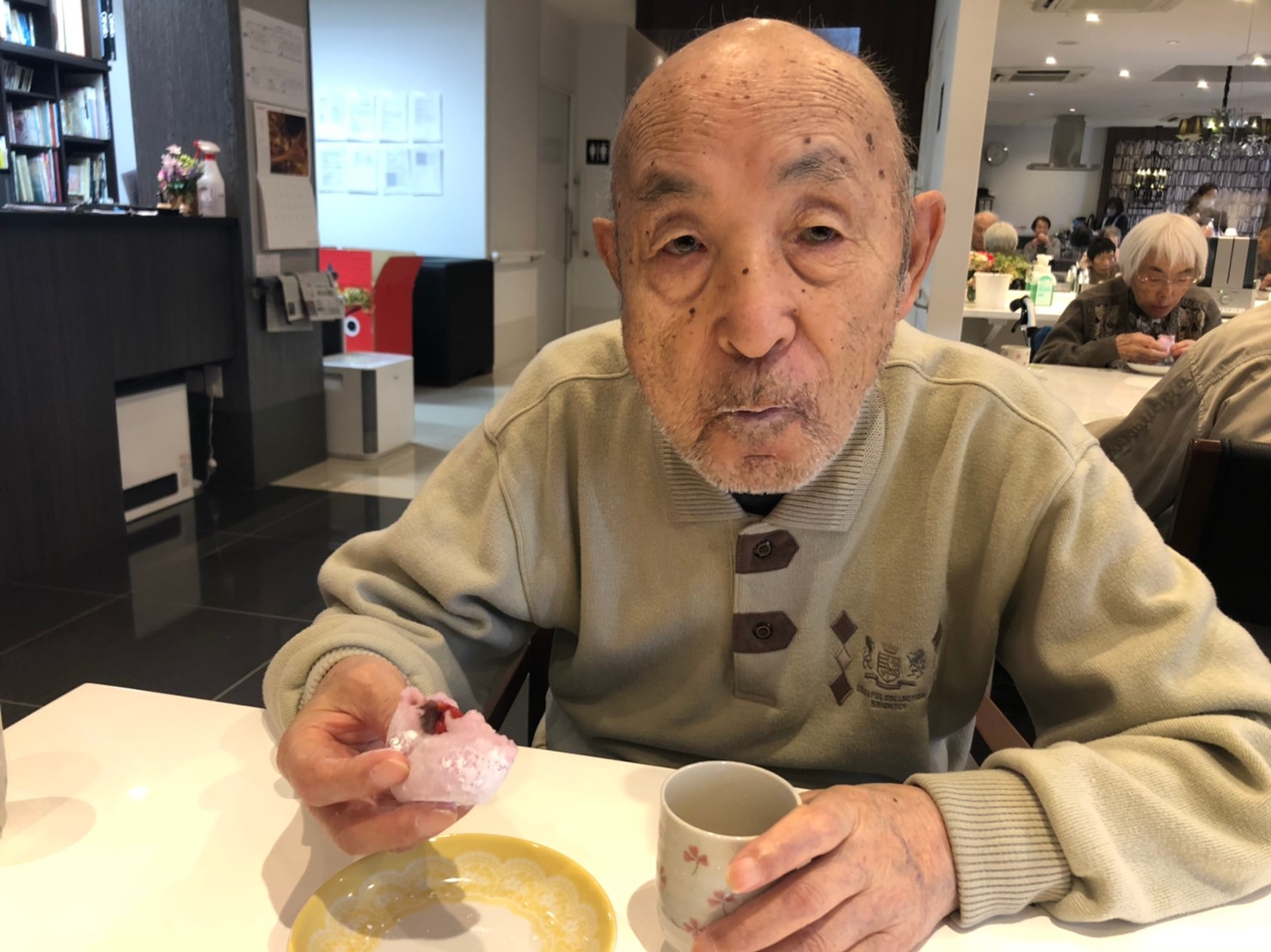 本日からサニープレイス河瀬に新しい利用者さまがご入居されました。ウェルカムパーティーとしてお茶会を開催いたしました。お茶をたてるのがお上手な利用者さまが代表してお抹茶をお持ちしていただきました。