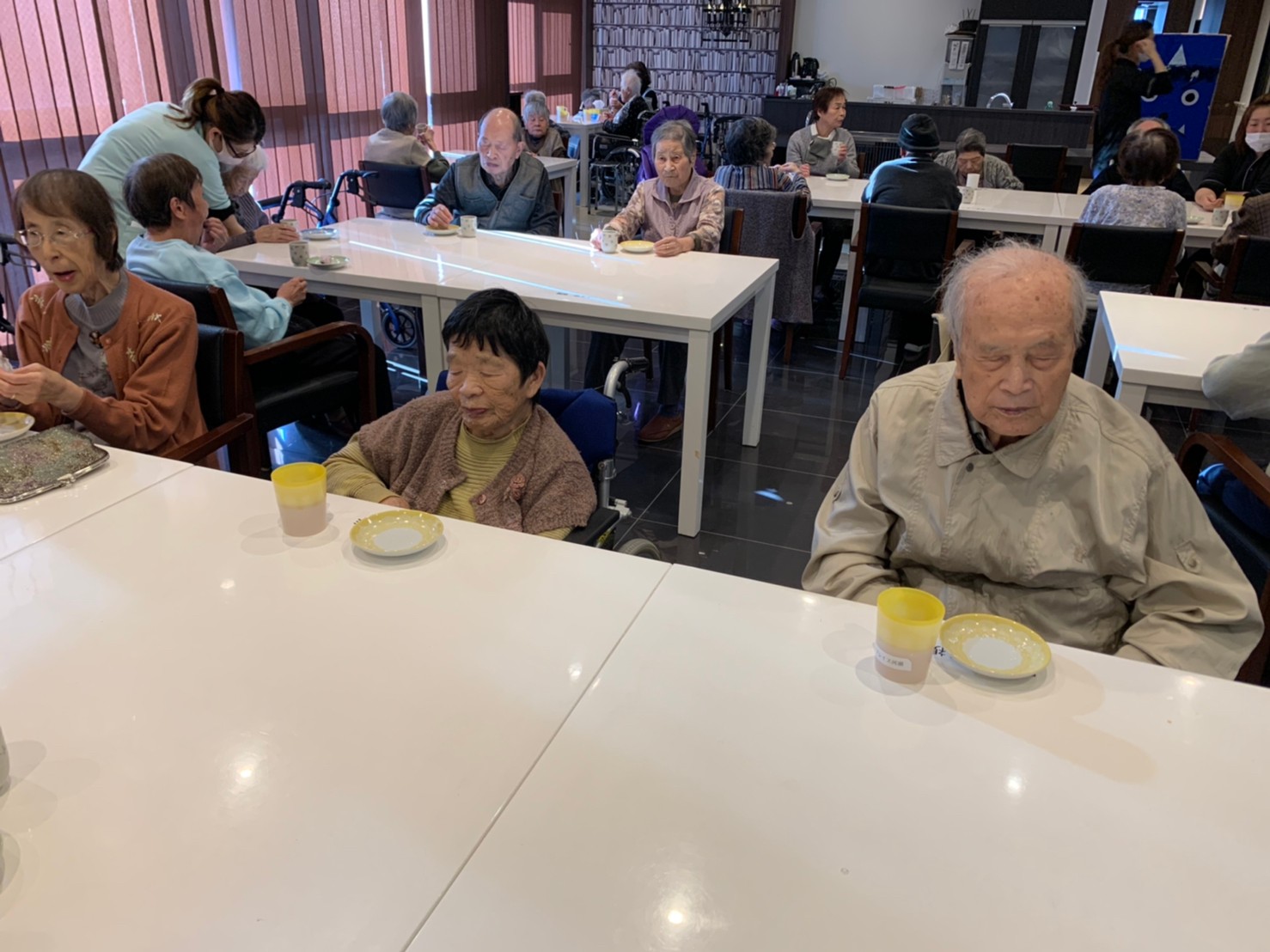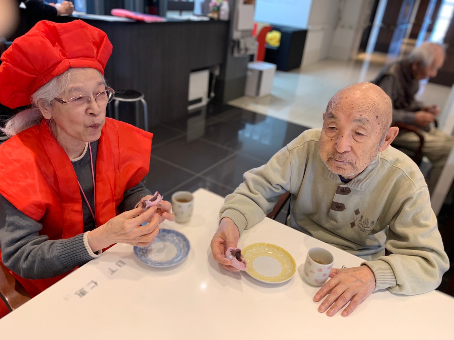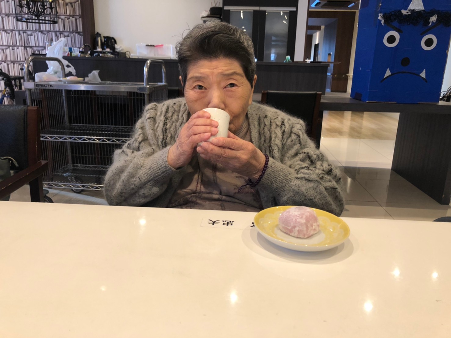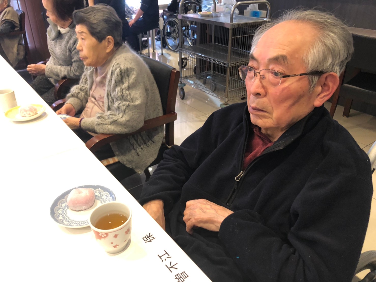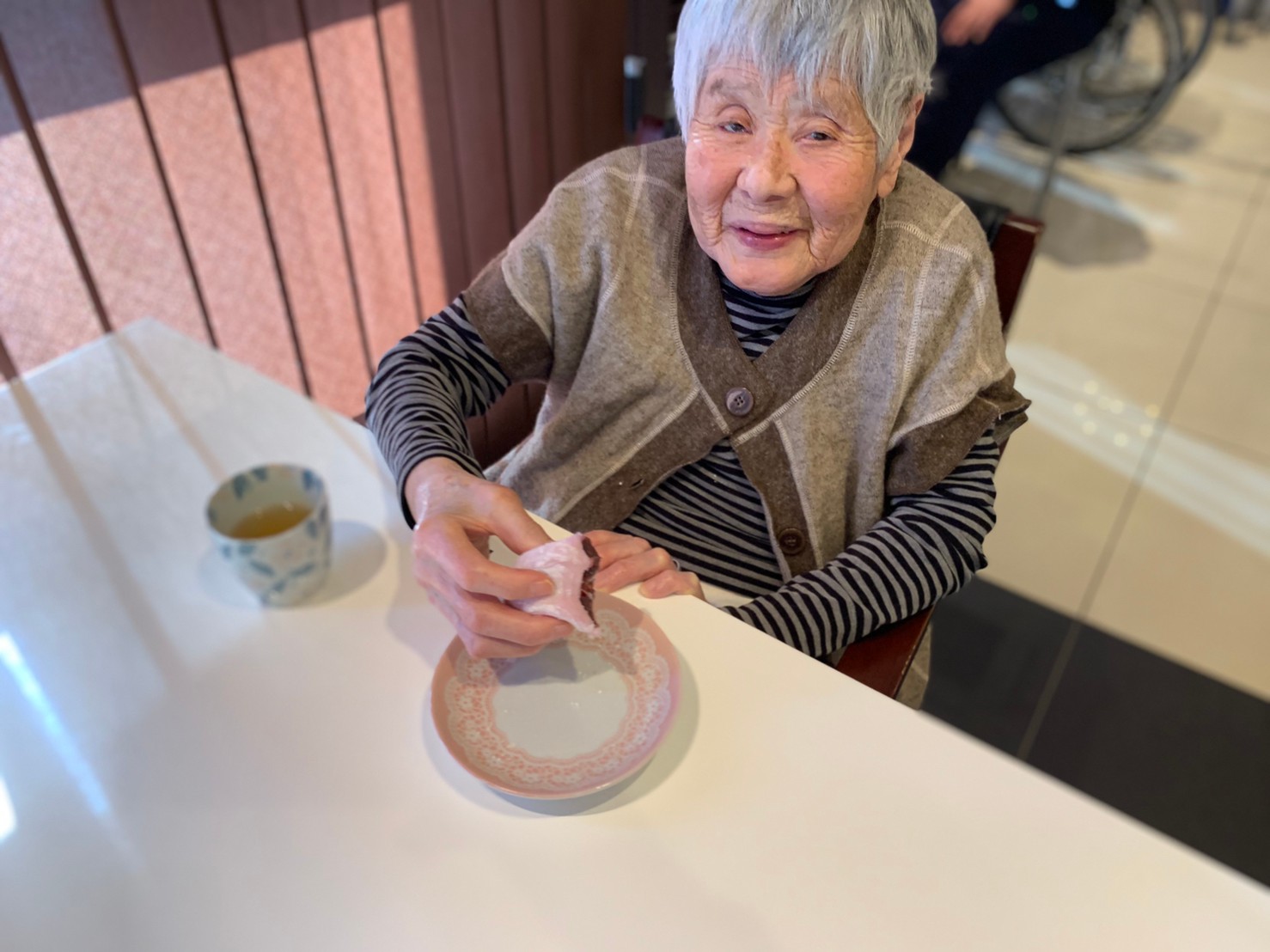 本日からサニープレイス河瀬に新しい利用者さまがご入居されました。ウェルカムパーティーとしてお茶会を開催いたしました。お茶をたてるのがお上手な利用者さまが代表してお抹茶をお持ちしていただきました。