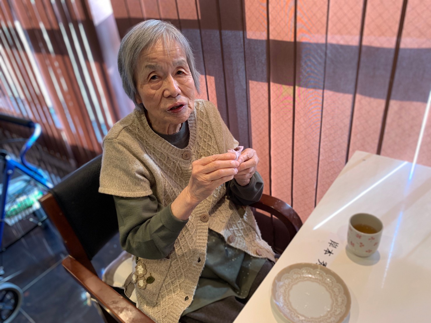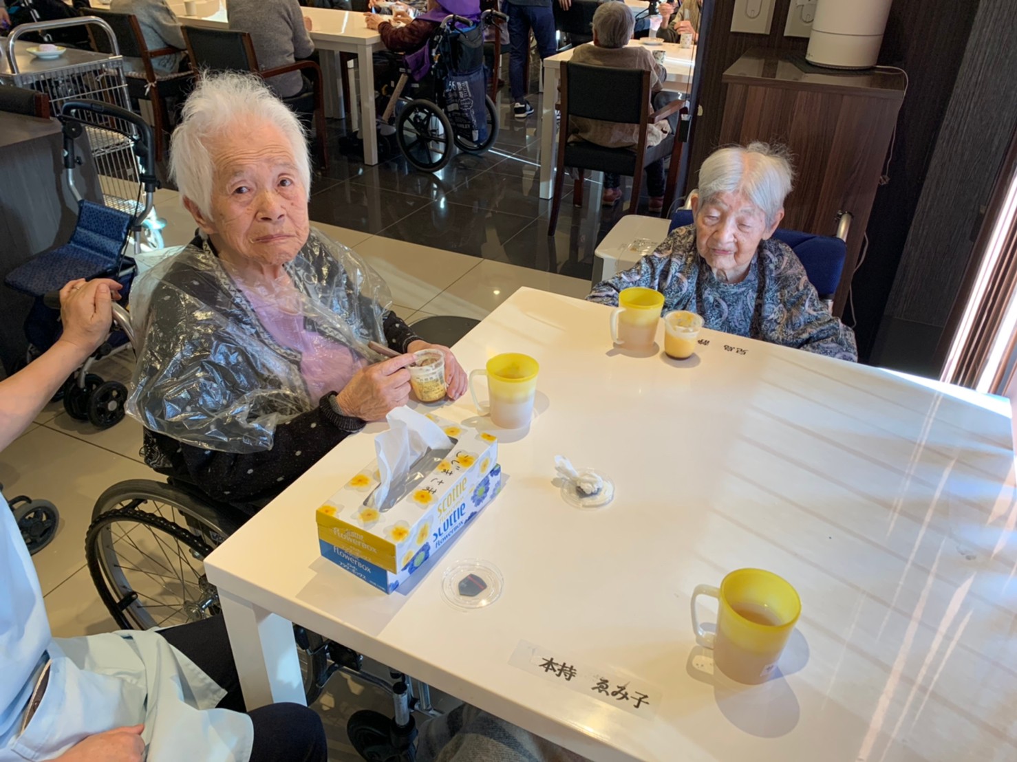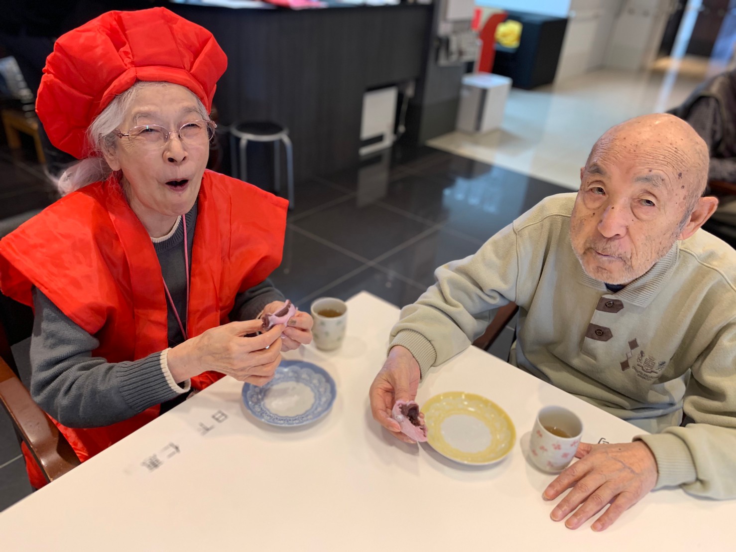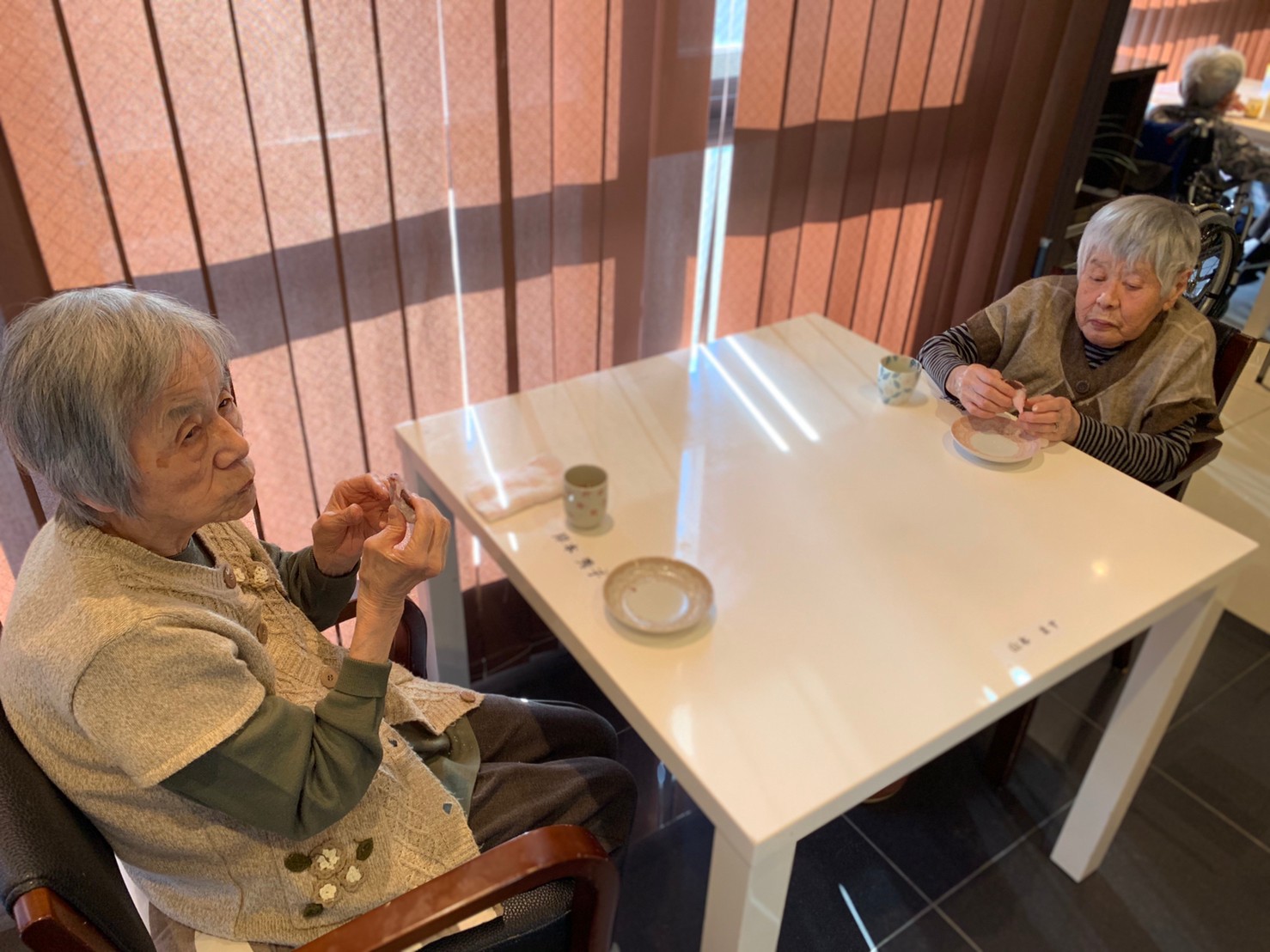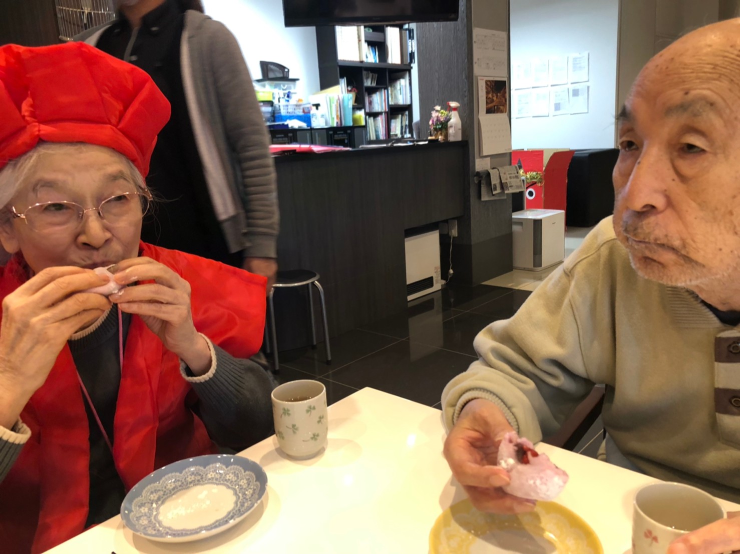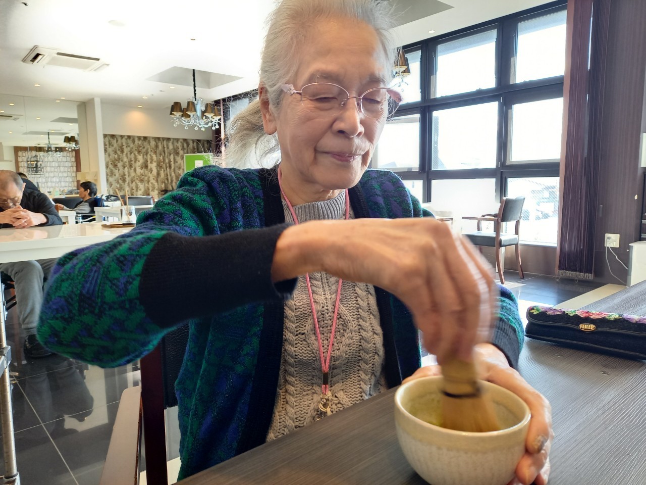 本日からサニープレイス河瀬に新しい利用者さまがご入居されました。ウェルカムパーティーとしてお茶会を開催いたしました。お茶をたてるのがお上手な利用者さまが代表してお抹茶をお持ちしていただきました。