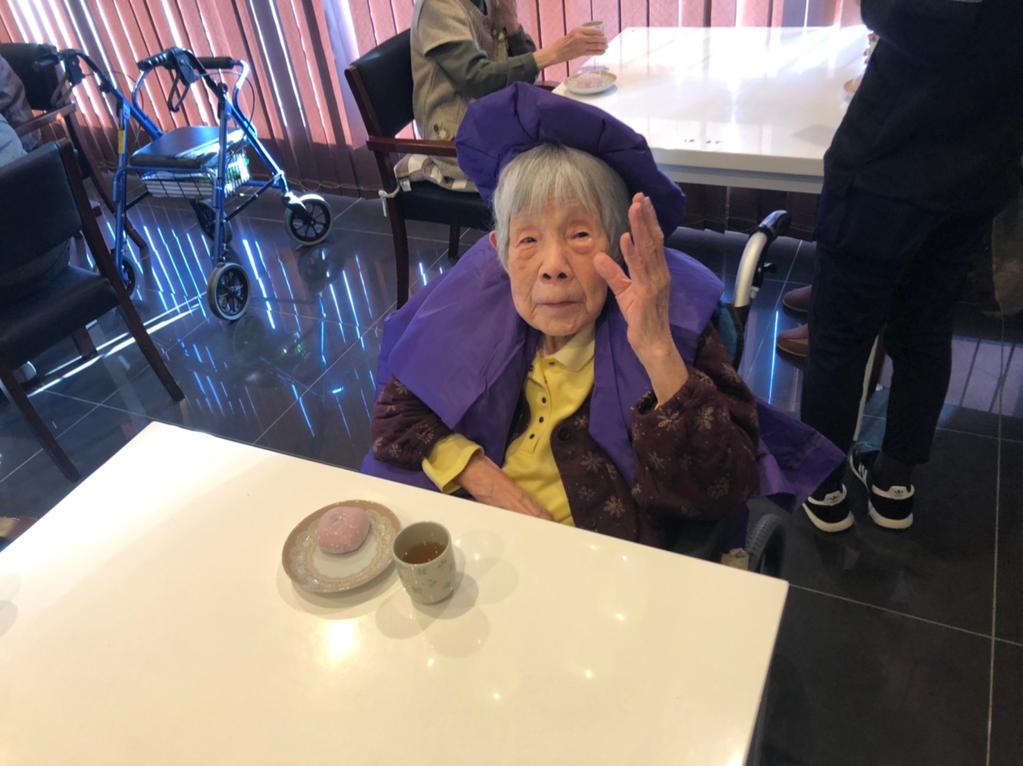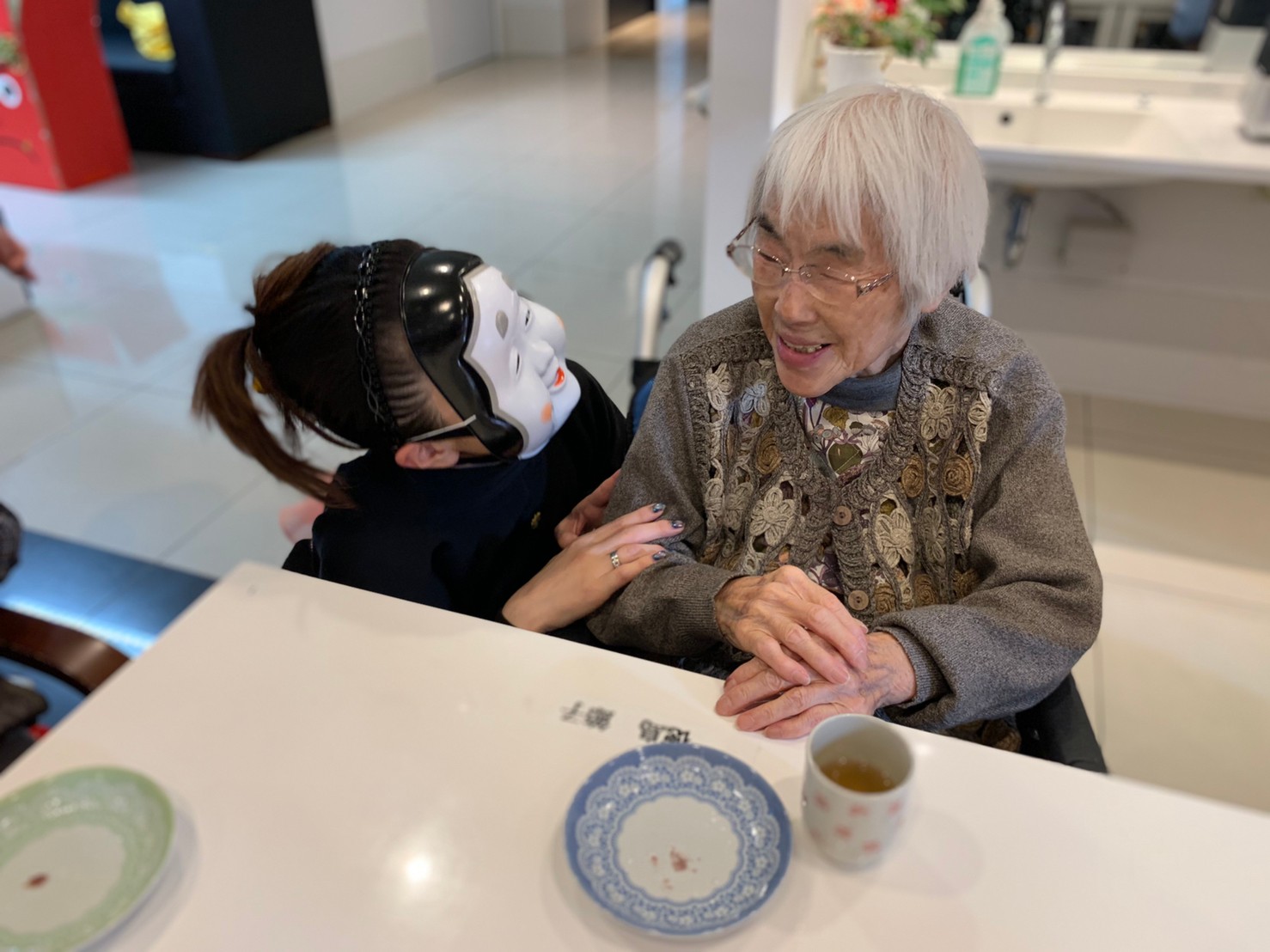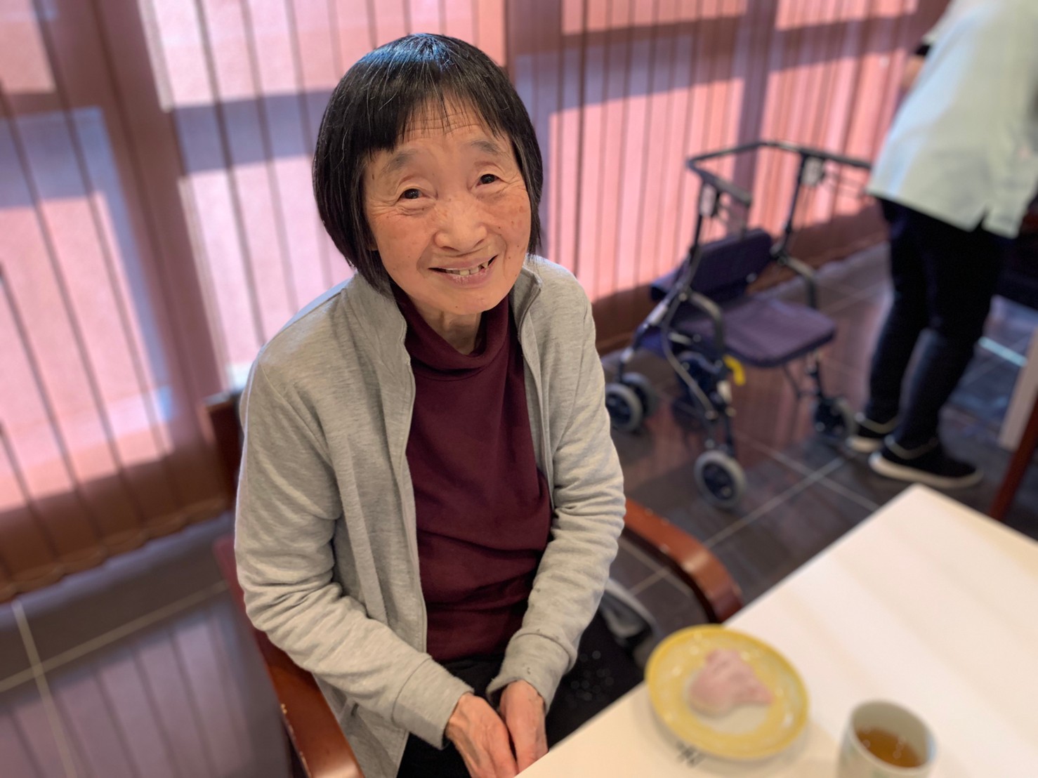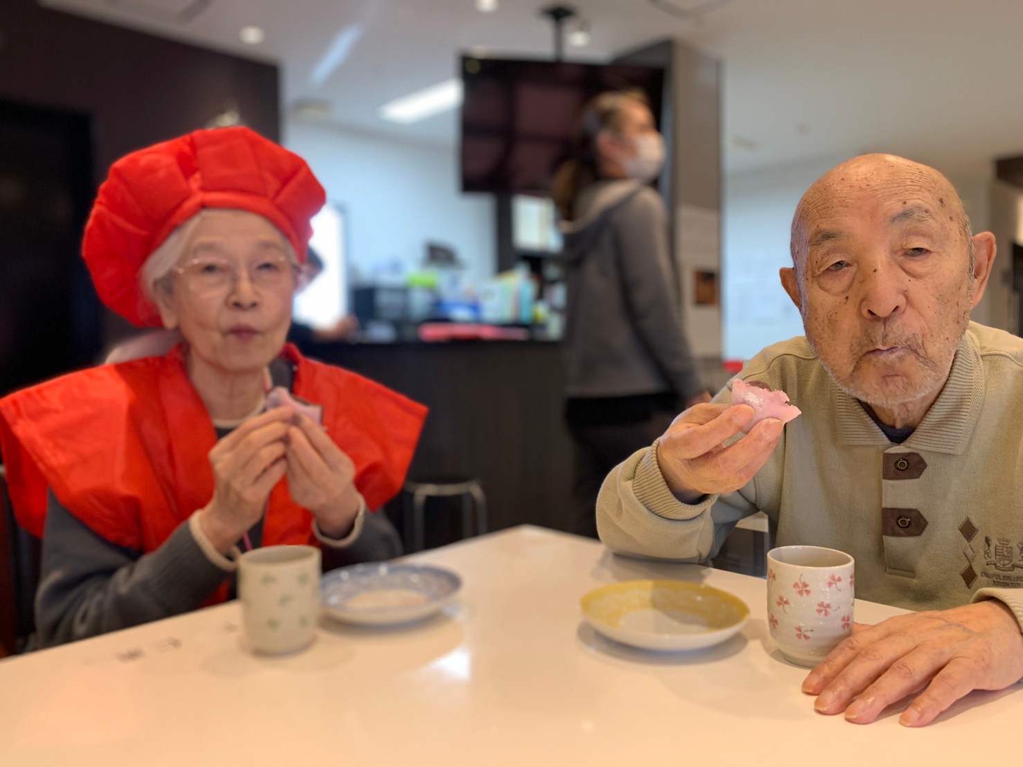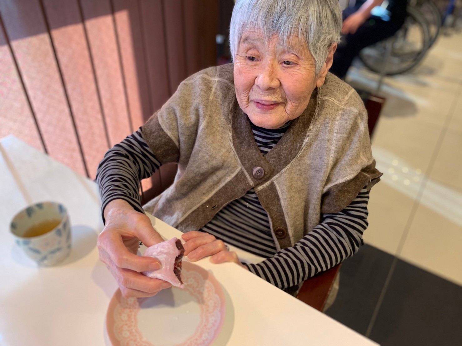 本日からサニープレイス河瀬に新しい利用者さまがご入居されました。ウェルカムパーティーとしてお茶会を開催いたしました。お茶をたてるのがお上手な利用者さまが代表してお抹茶をお持ちしていただきました。