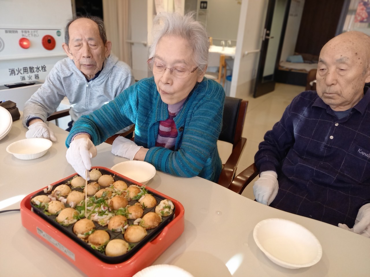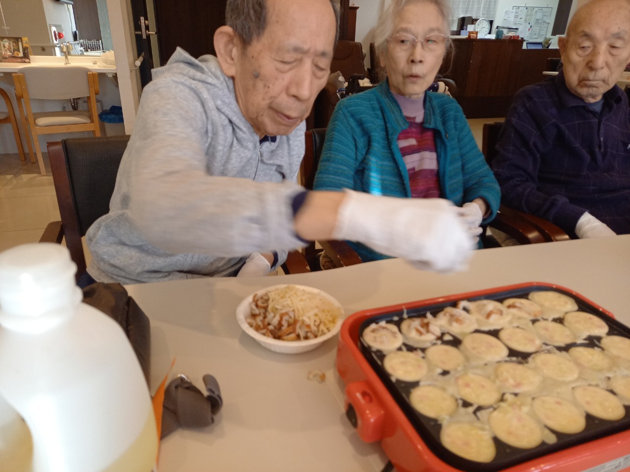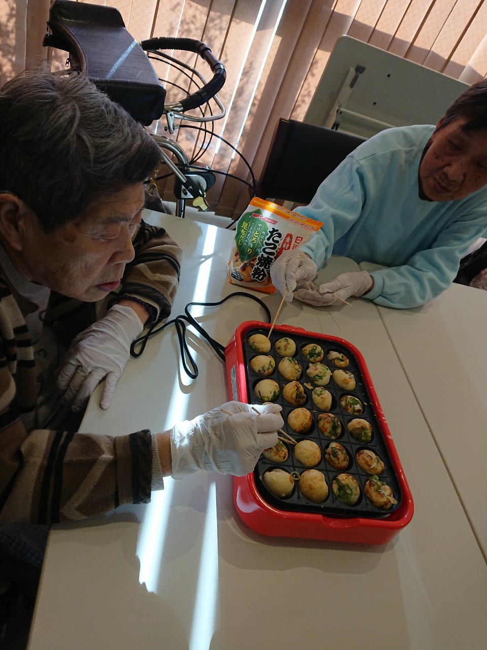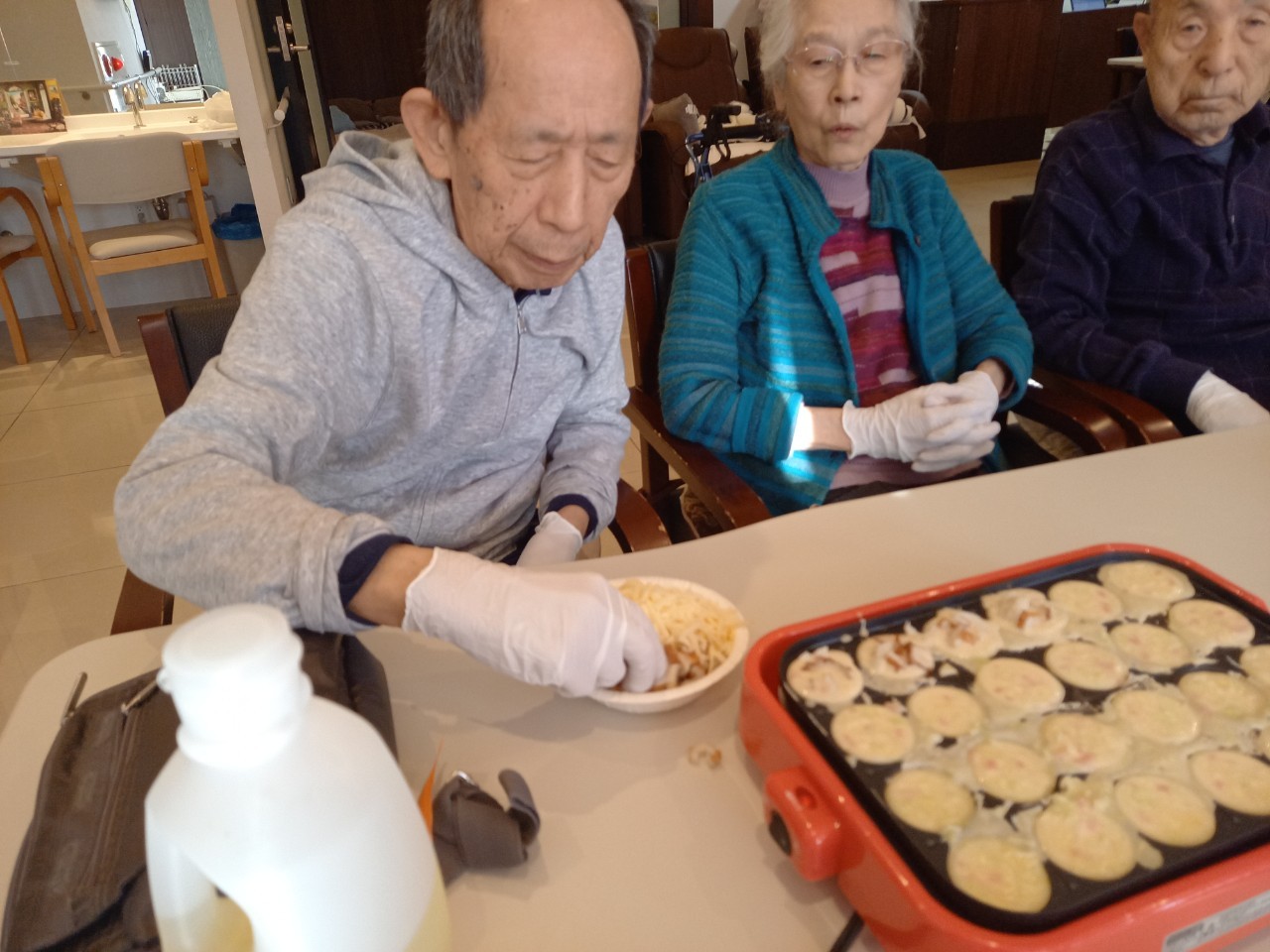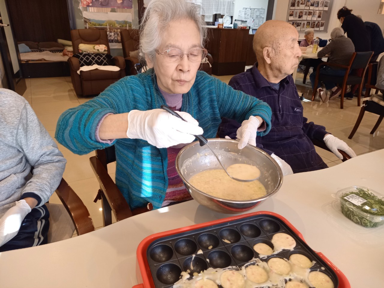 本日は手作りおやつの日でたこやき二日目になります。今日もお昼からデイサービスではおいしい香りに誘われてついつい見に行ってしまいました。(;´Д`)