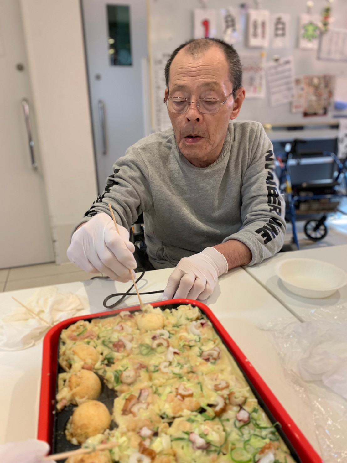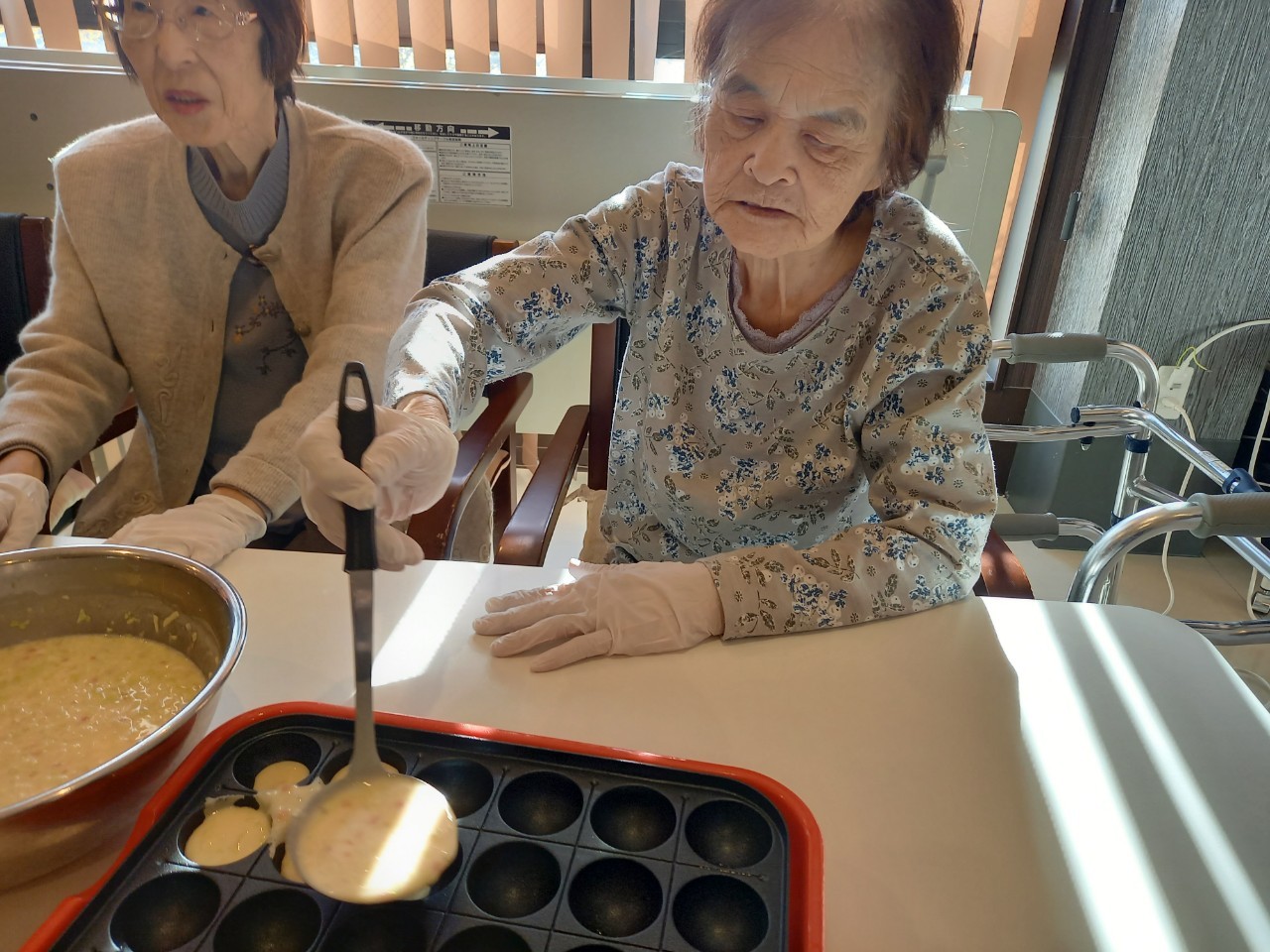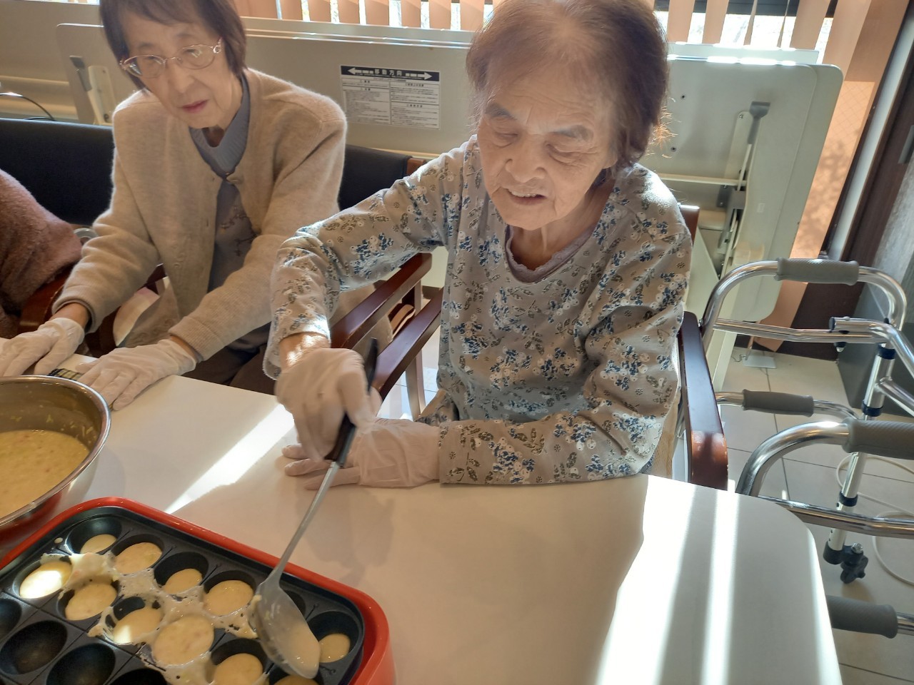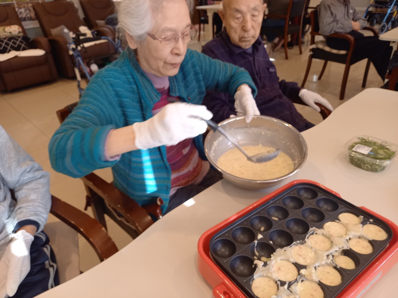 本日は手作りおやつの日でたこやき二日目になります。今日もお昼からデイサービスではおいしい香りに誘われてついつい見に行ってしまいました。(;´Д`)