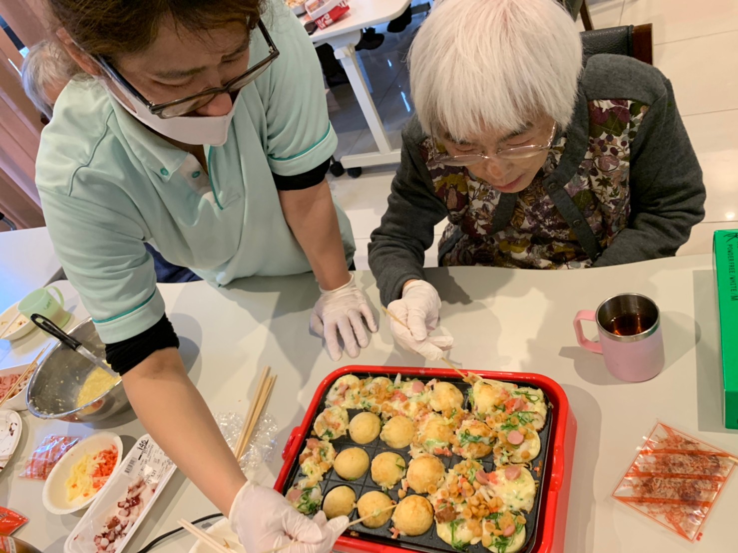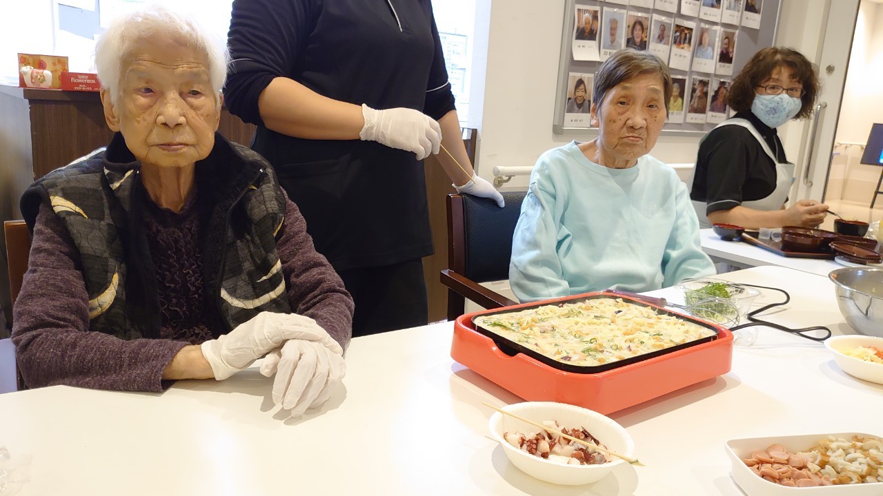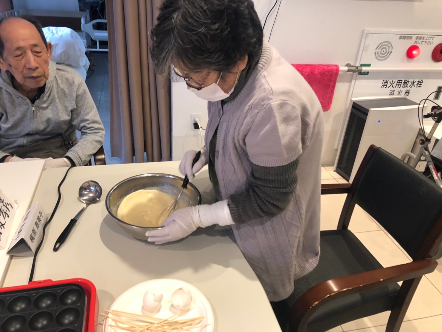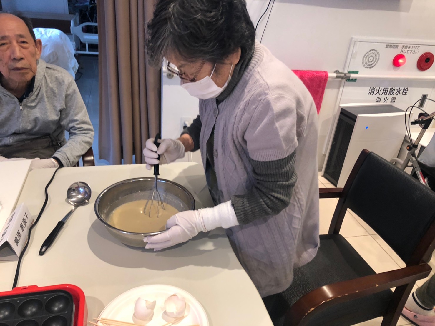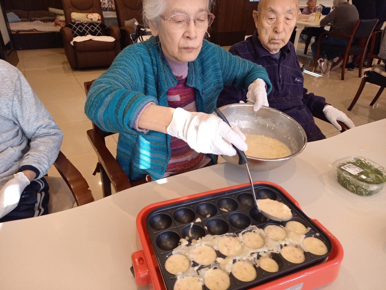 本日は手作りおやつの日でたこやき二日目になります。今日もお昼からデイサービスではおいしい香りに誘われてついつい見に行ってしまいました。(;´Д`)