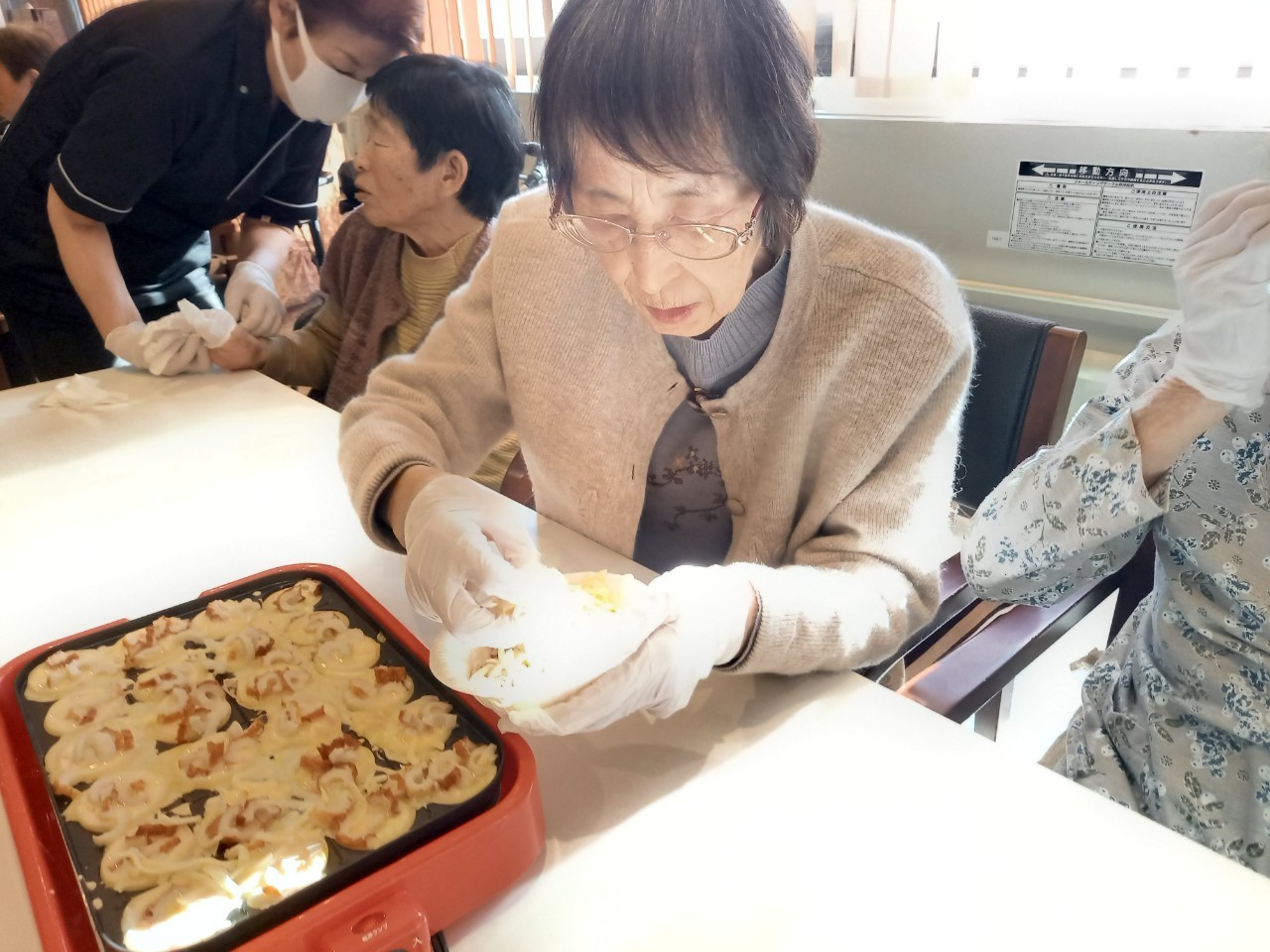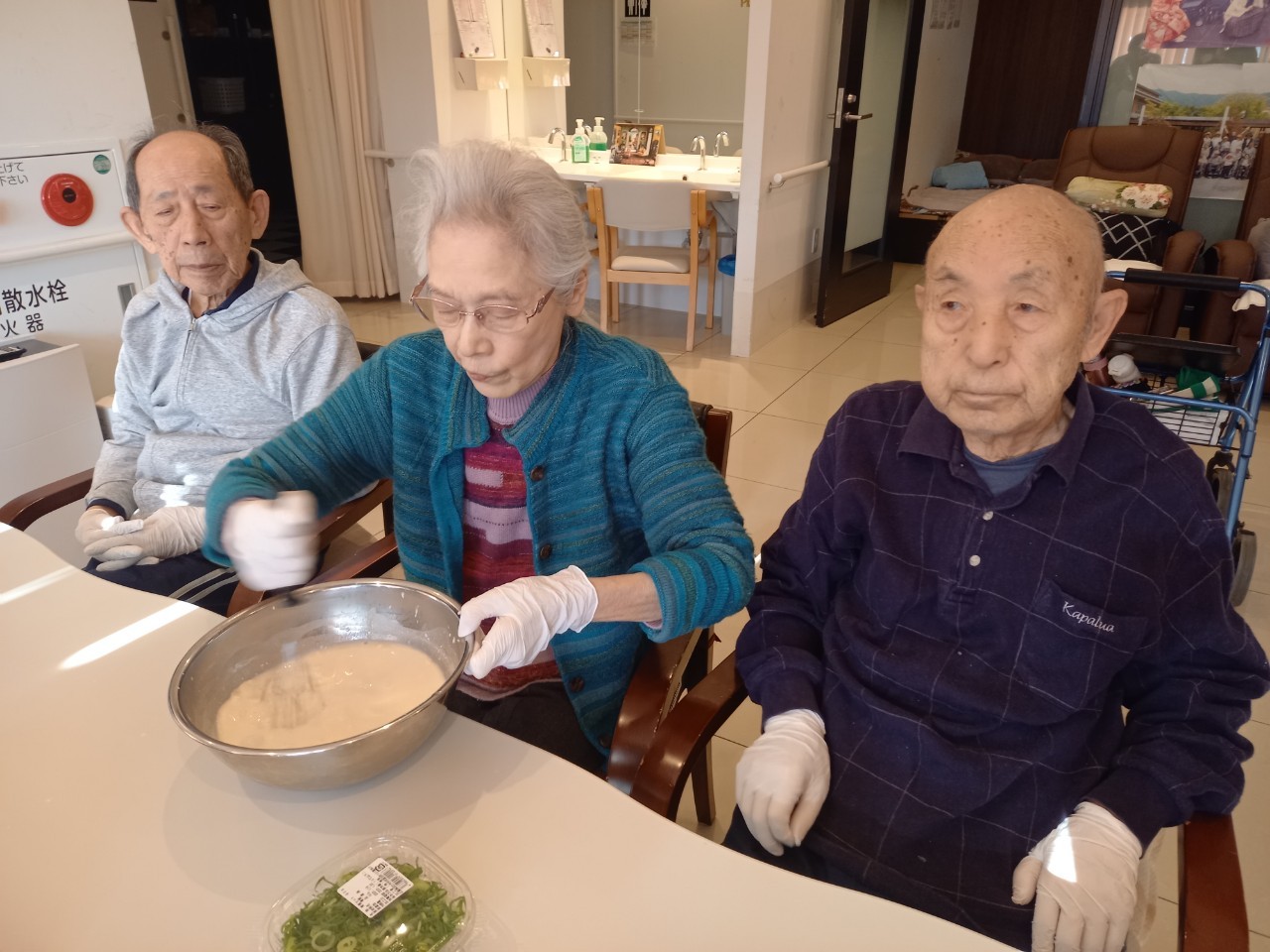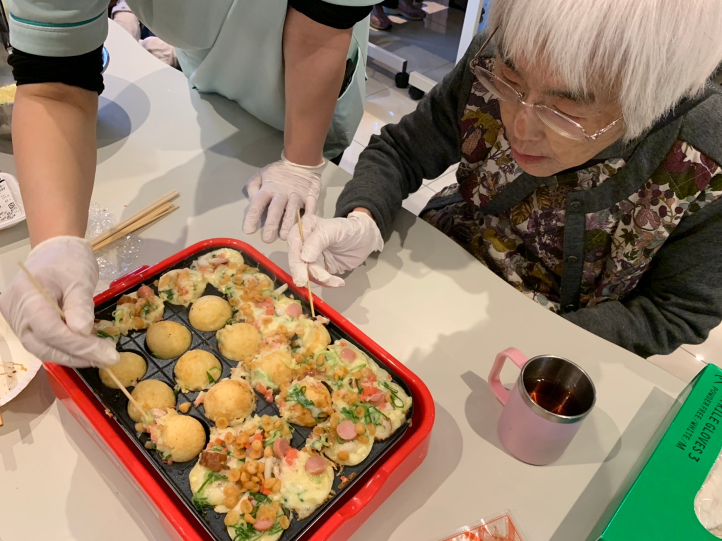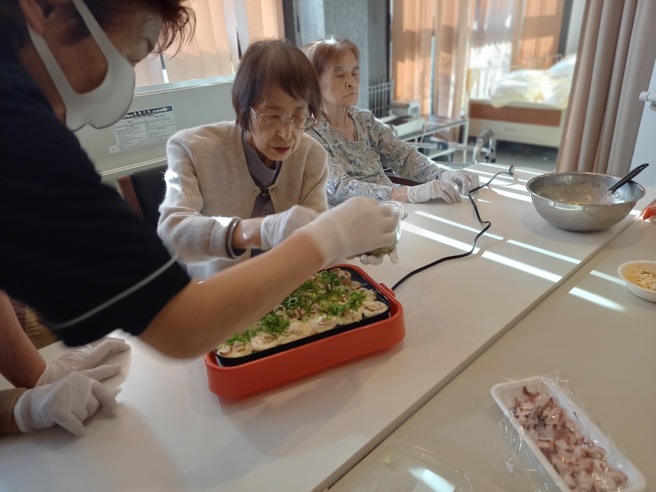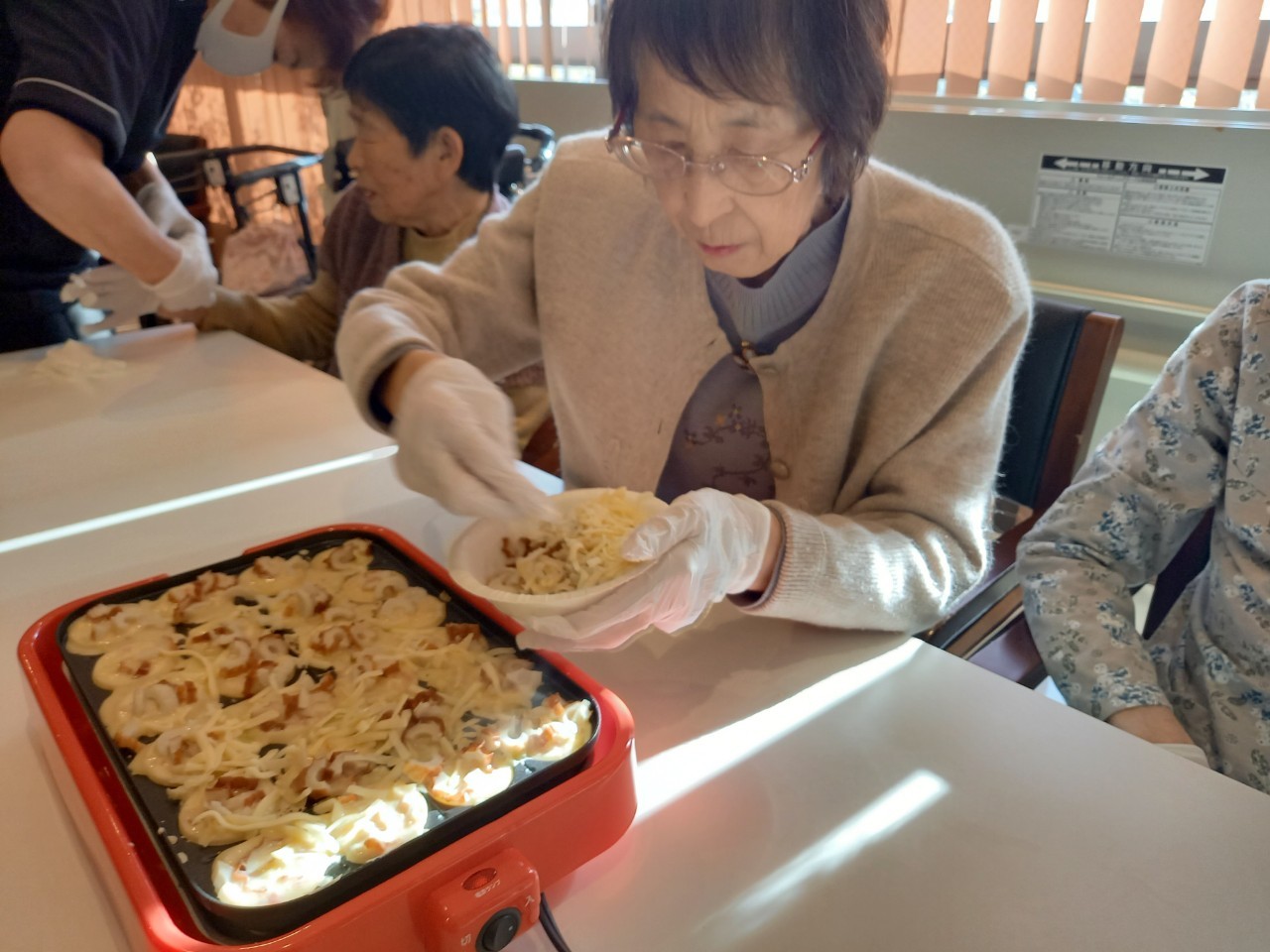 本日は手作りおやつの日でたこやき二日目になります。今日もお昼からデイサービスではおいしい香りに誘われてついつい見に行ってしまいました。(;´Д`)