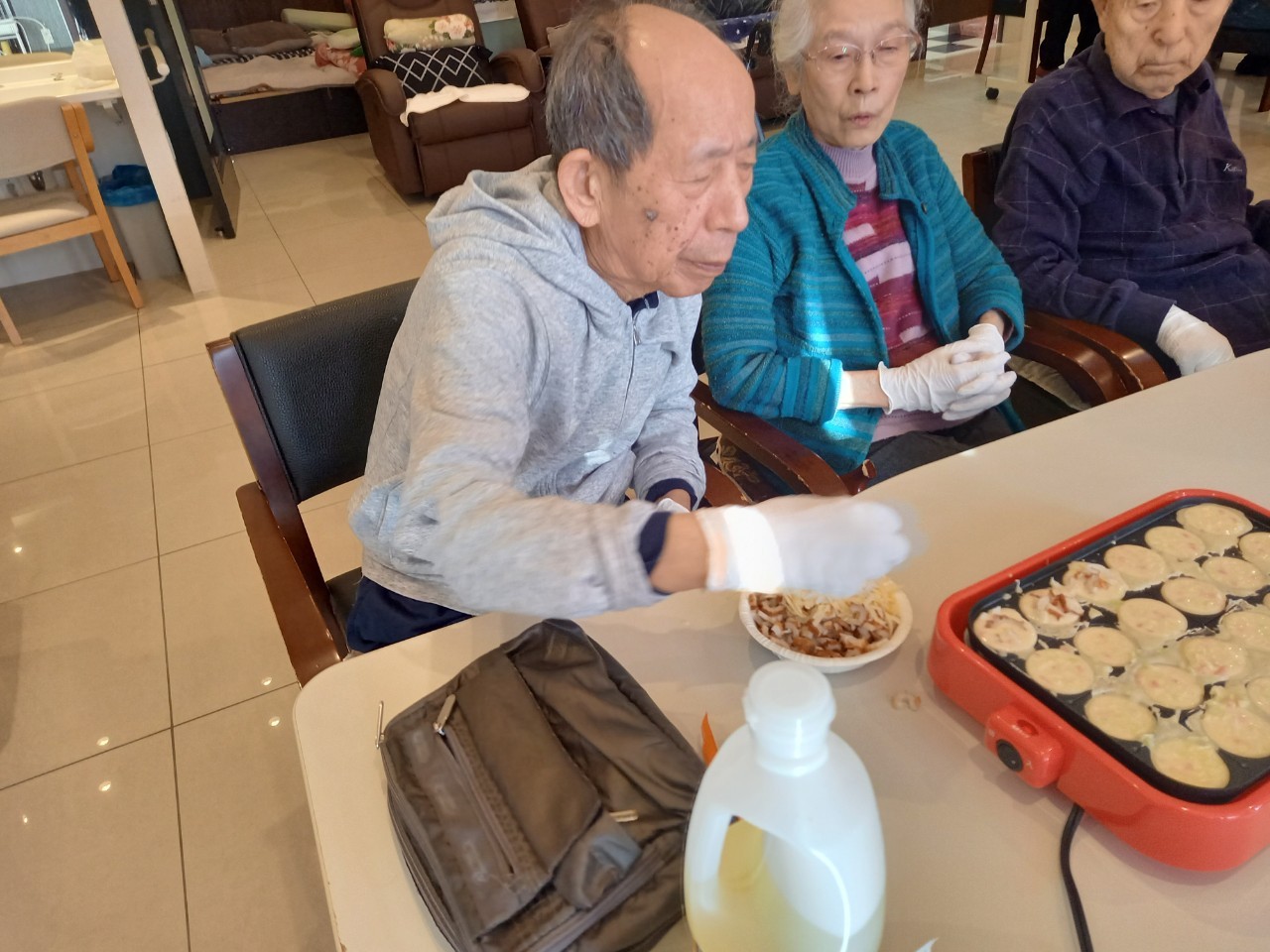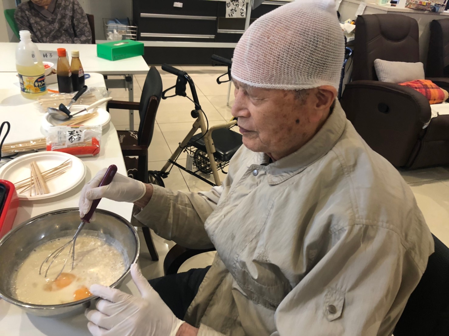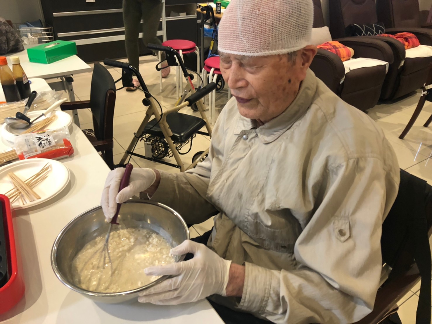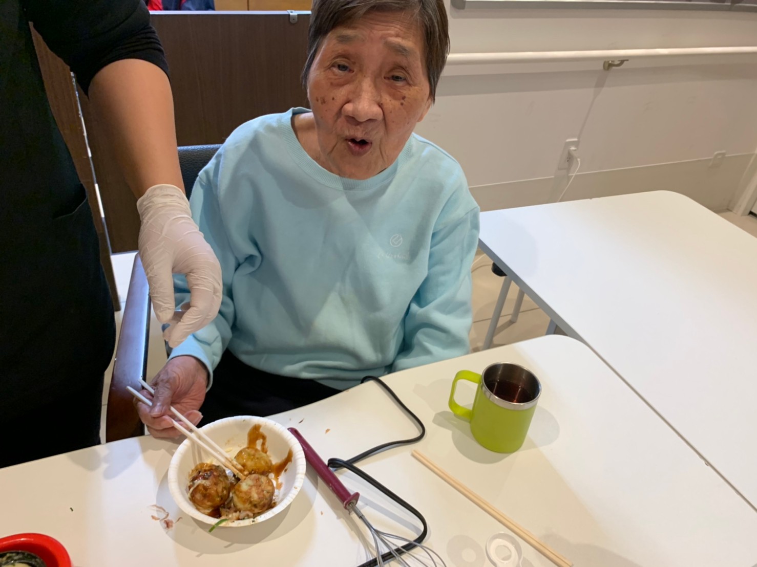 本日は手作りおやつの日でたこやき二日目になります。今日もお昼からデイサービスではおいしい香りに誘われてついつい見に行ってしまいました。(;´Д`)
