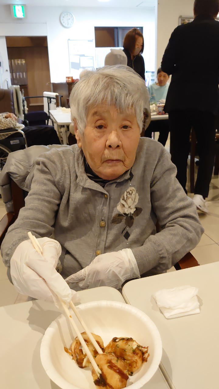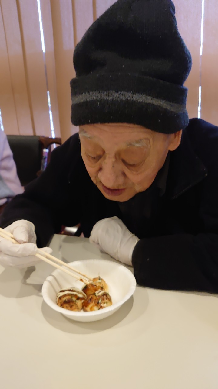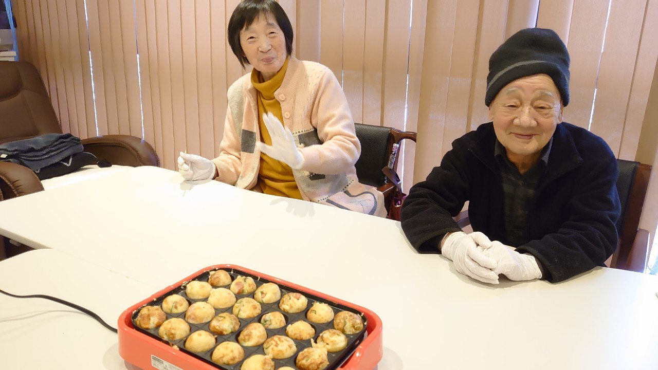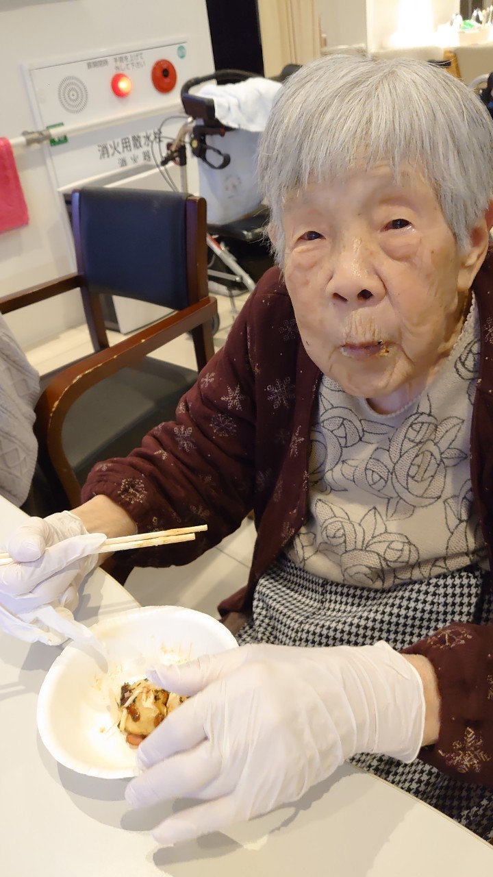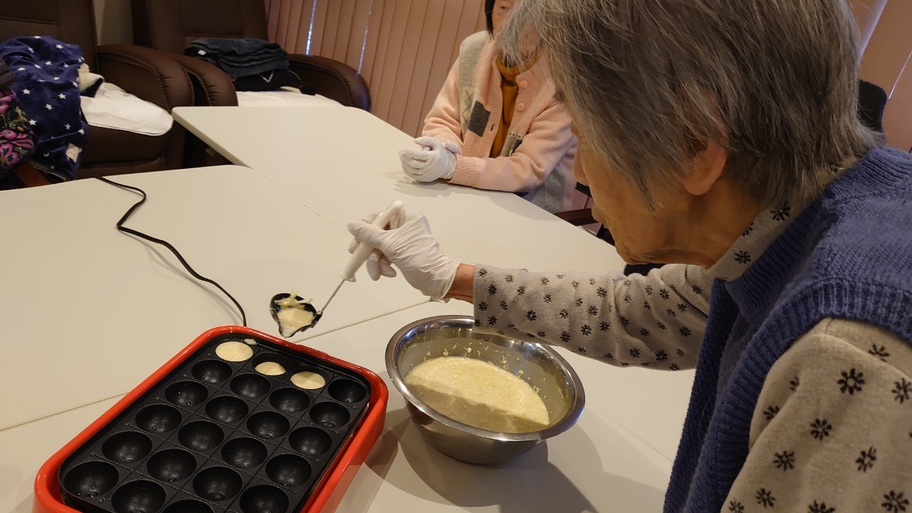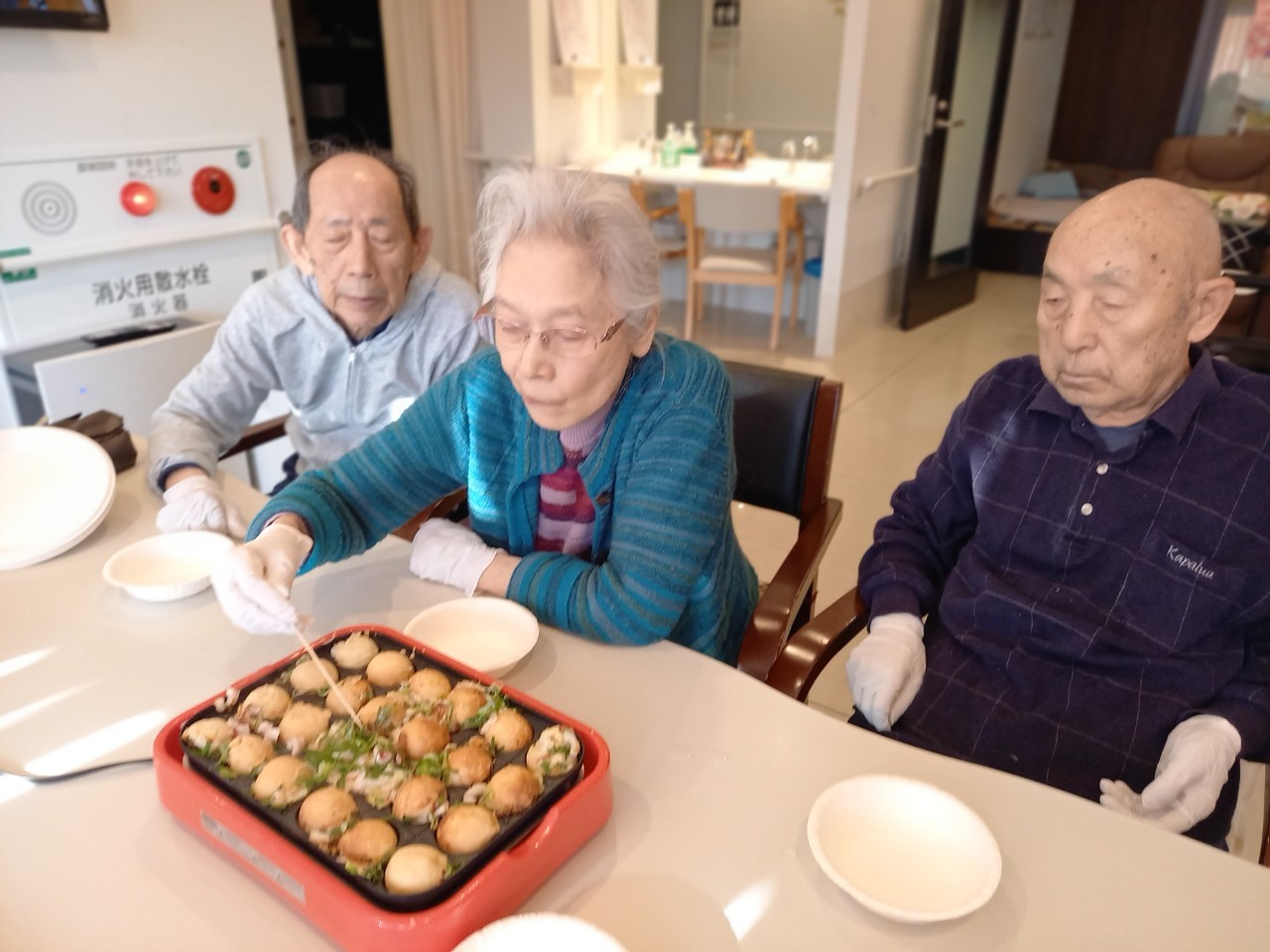 新年1発目の手作りおやつはたこやきをしました。同じ食材で同じ機材で作るのに味が変わるのが不思議なたこ焼き。小さいころから焼かれていた粉もん文化のご出身の利用者さまはさすが手つきも違って美味しいたこやきをお作りになられてました。