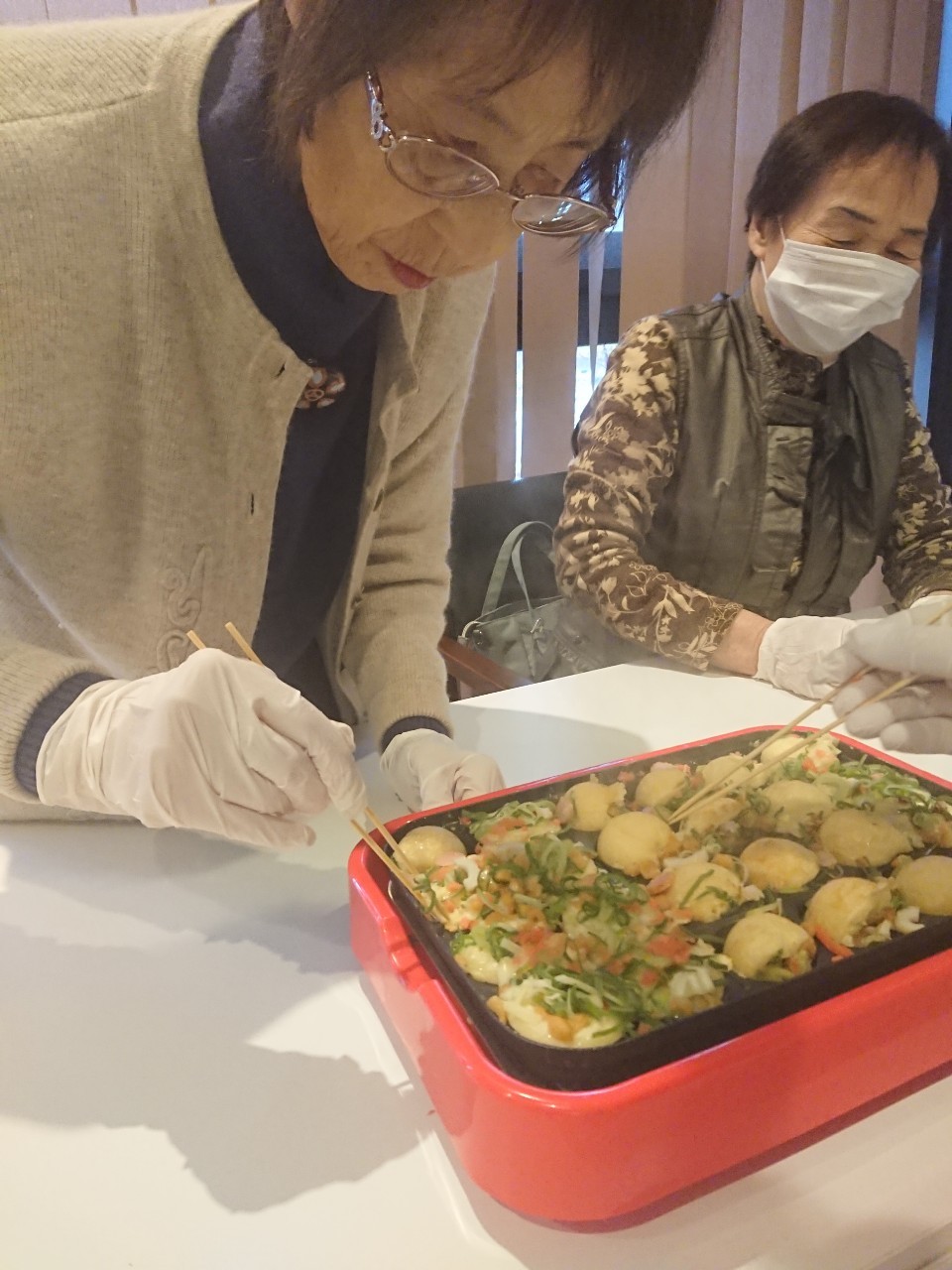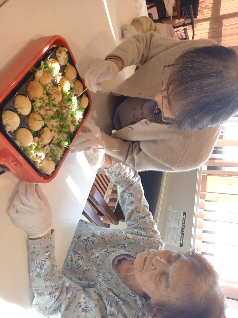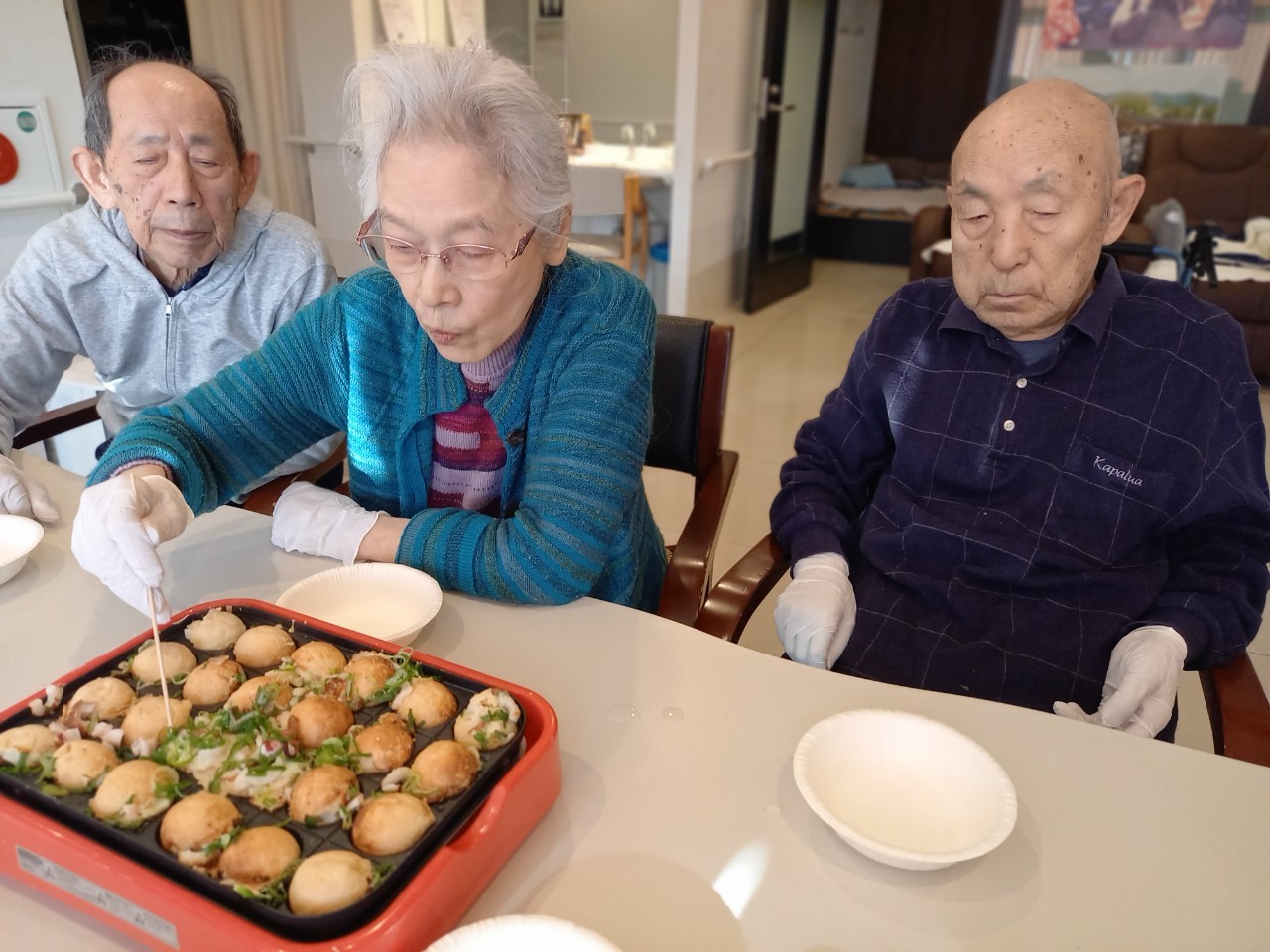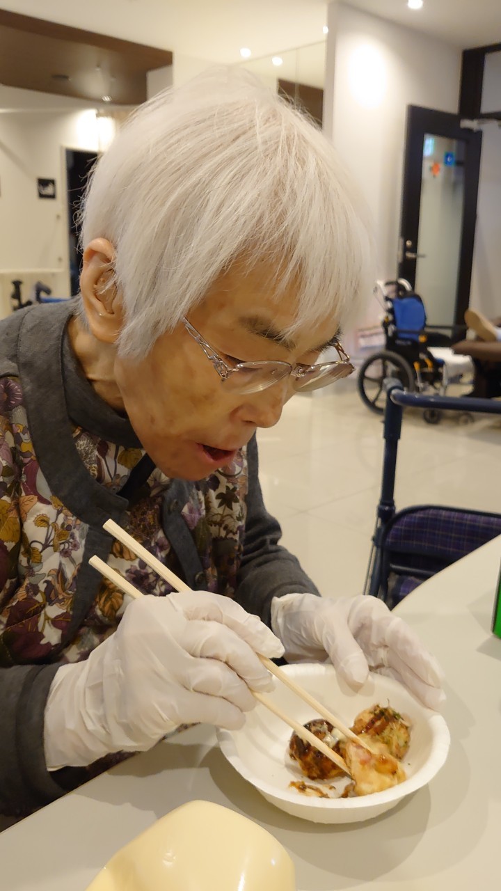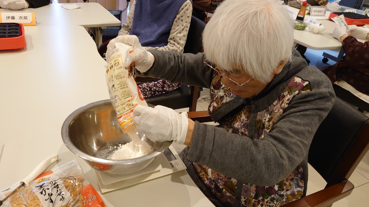 新年1発目の手作りおやつはたこやきをしました。同じ食材で同じ機材で作るのに味が変わるのが不思議なたこ焼き。小さいころから焼かれていた粉もん文化のご出身の利用者さまはさすが手つきも違って美味しいたこやきをお作りになられてました。