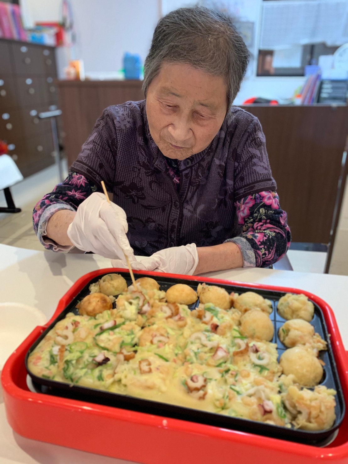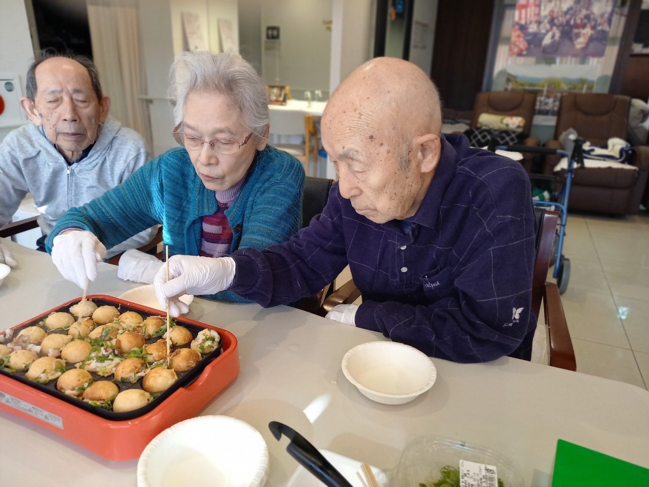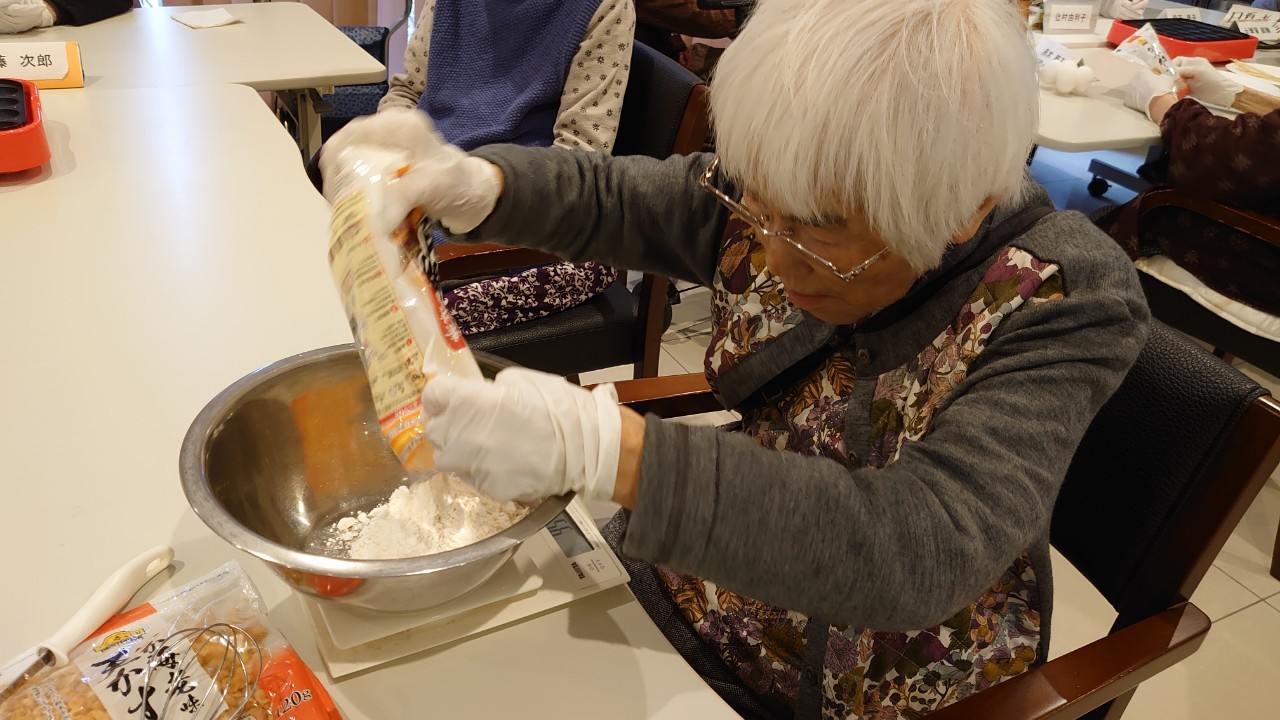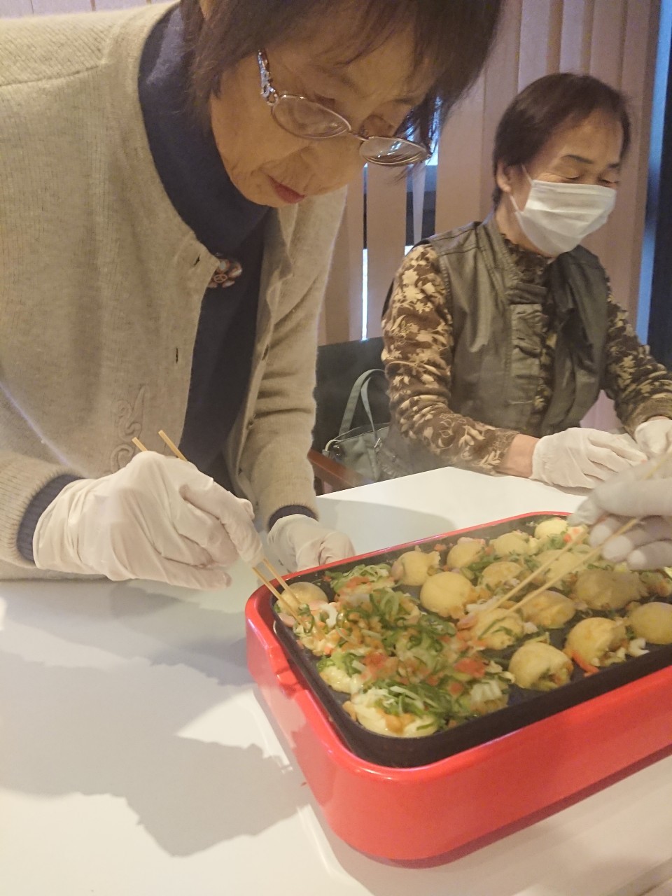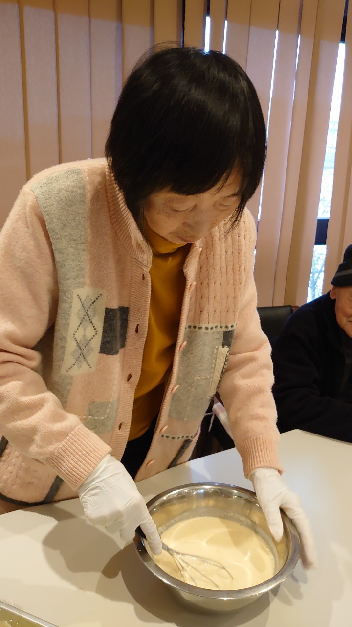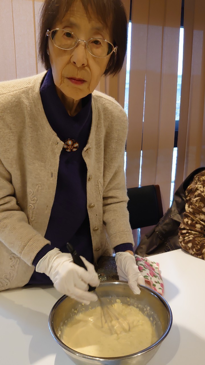 新年1発目の手作りおやつはたこやきをしました。同じ食材で同じ機材で作るのに味が変わるのが不思議なたこ焼き。小さいころから焼かれていた粉もん文化のご出身の利用者さまはさすが手つきも違って美味しいたこやきをお作りになられてました。