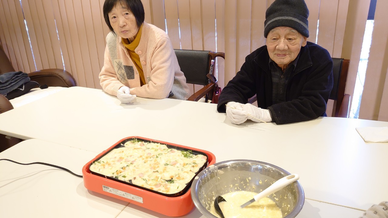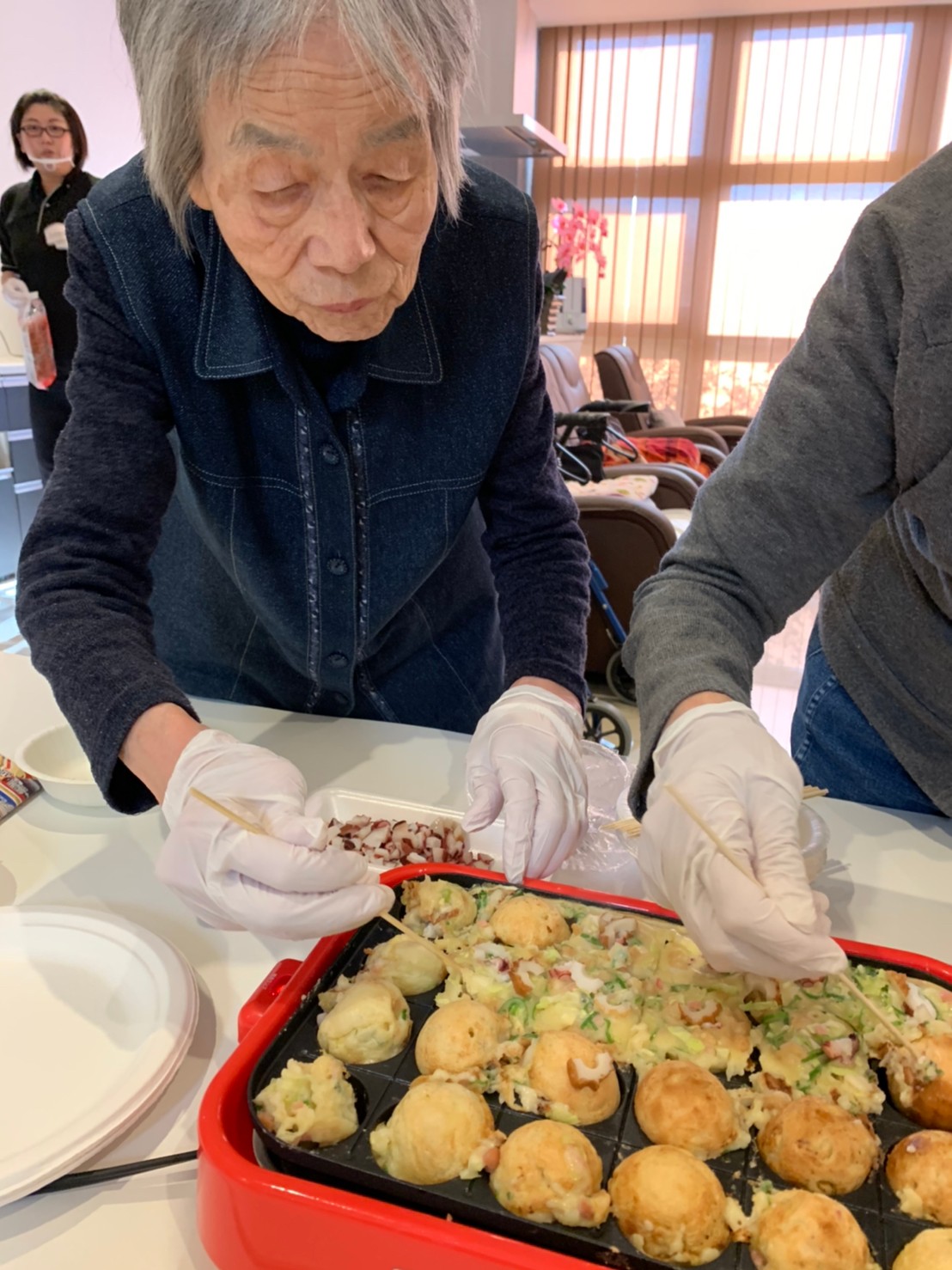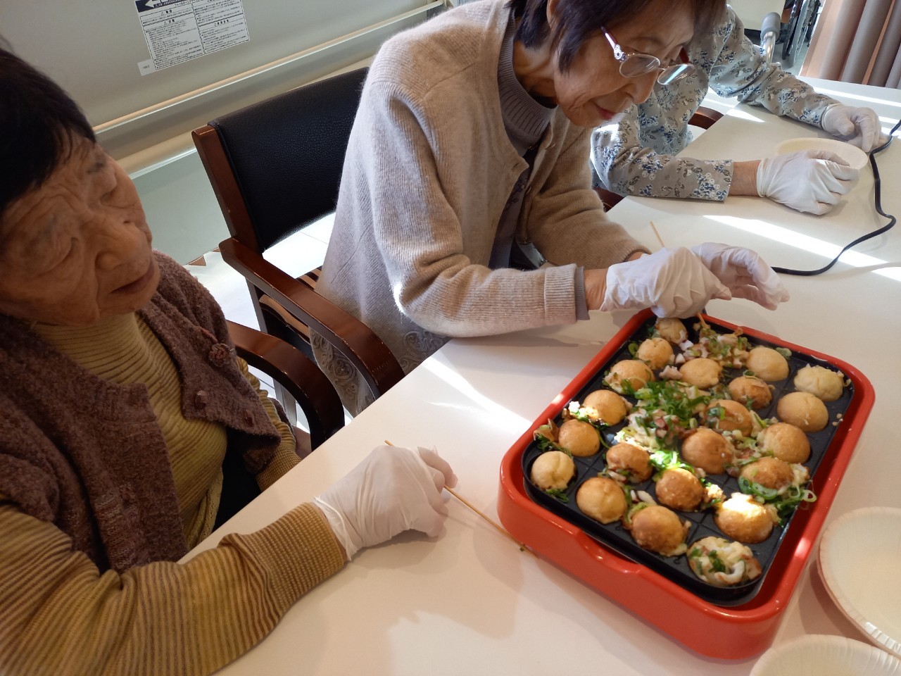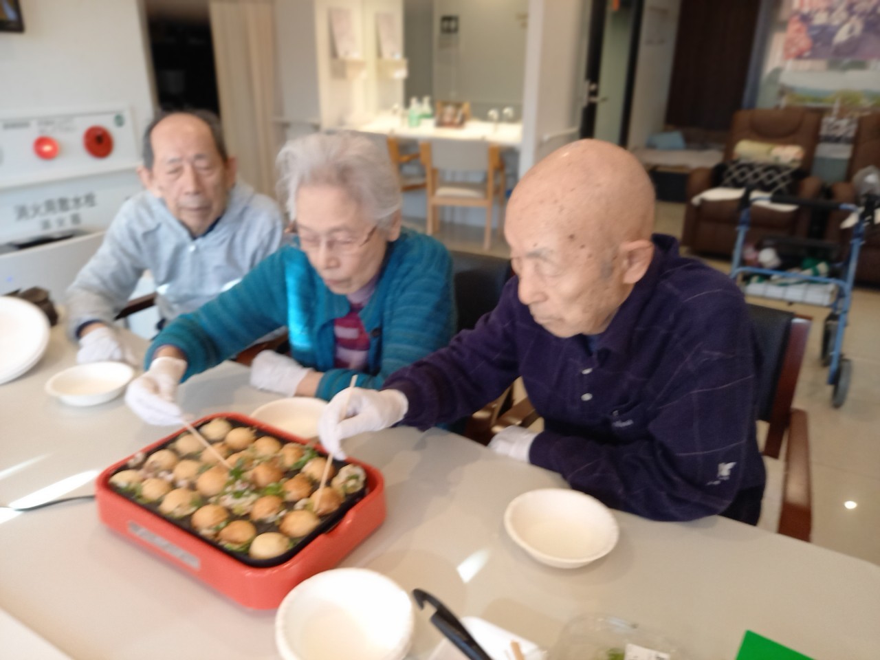 新年1発目の手作りおやつはたこやきをしました。同じ食材で同じ機材で作るのに味が変わるのが不思議なたこ焼き。小さいころから焼かれていた粉もん文化のご出身の利用者さまはさすが手つきも違って美味しいたこやきをお作りになられてました。