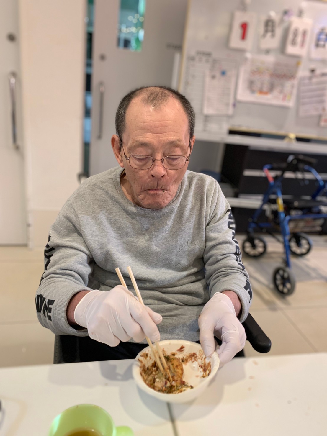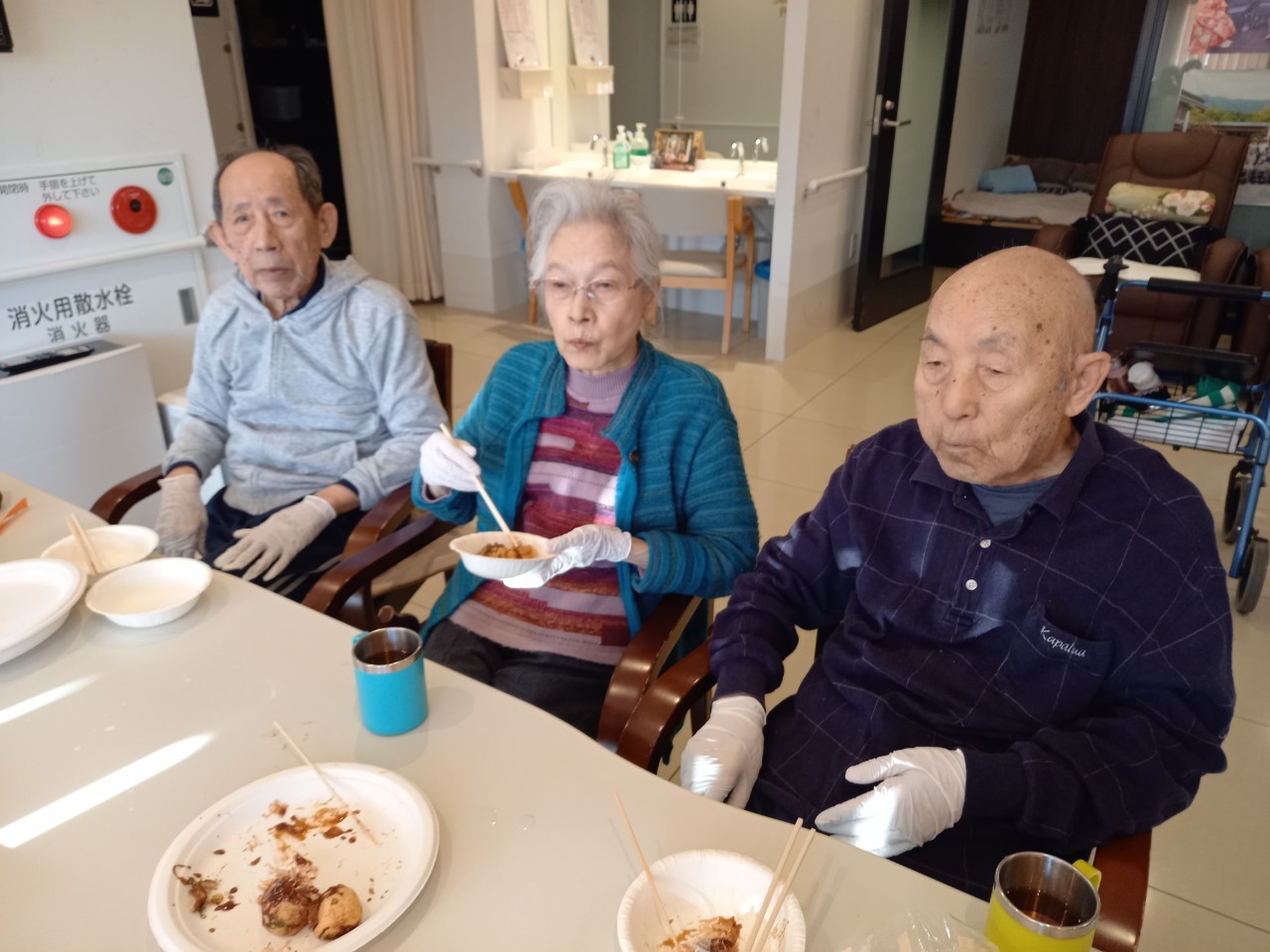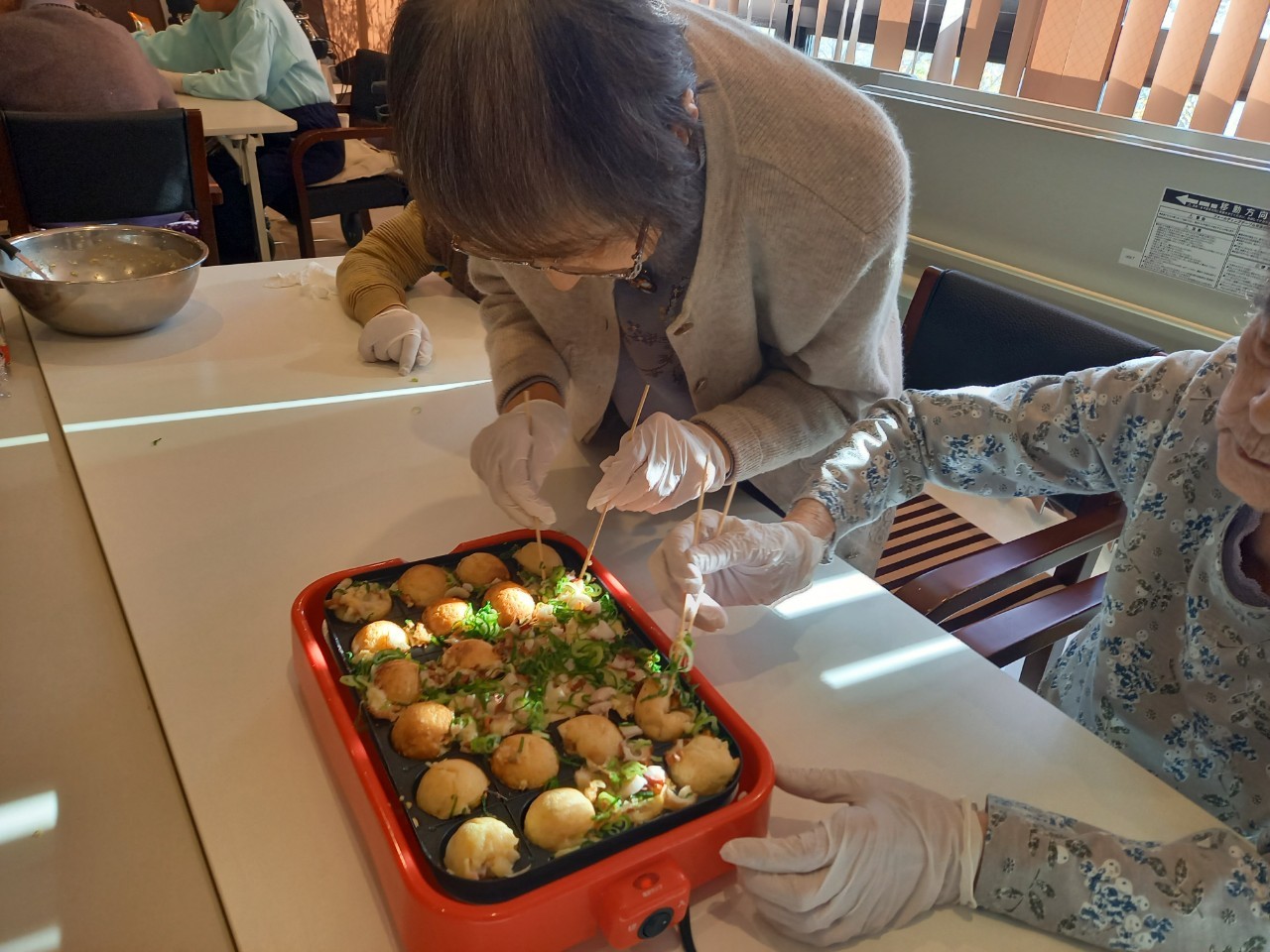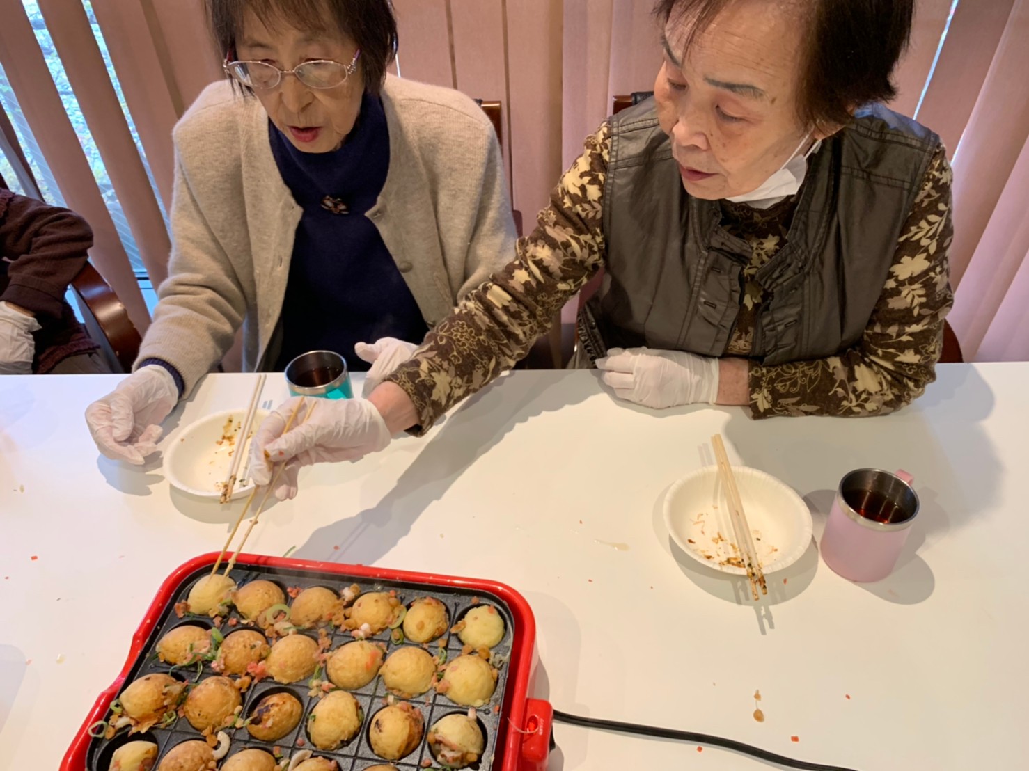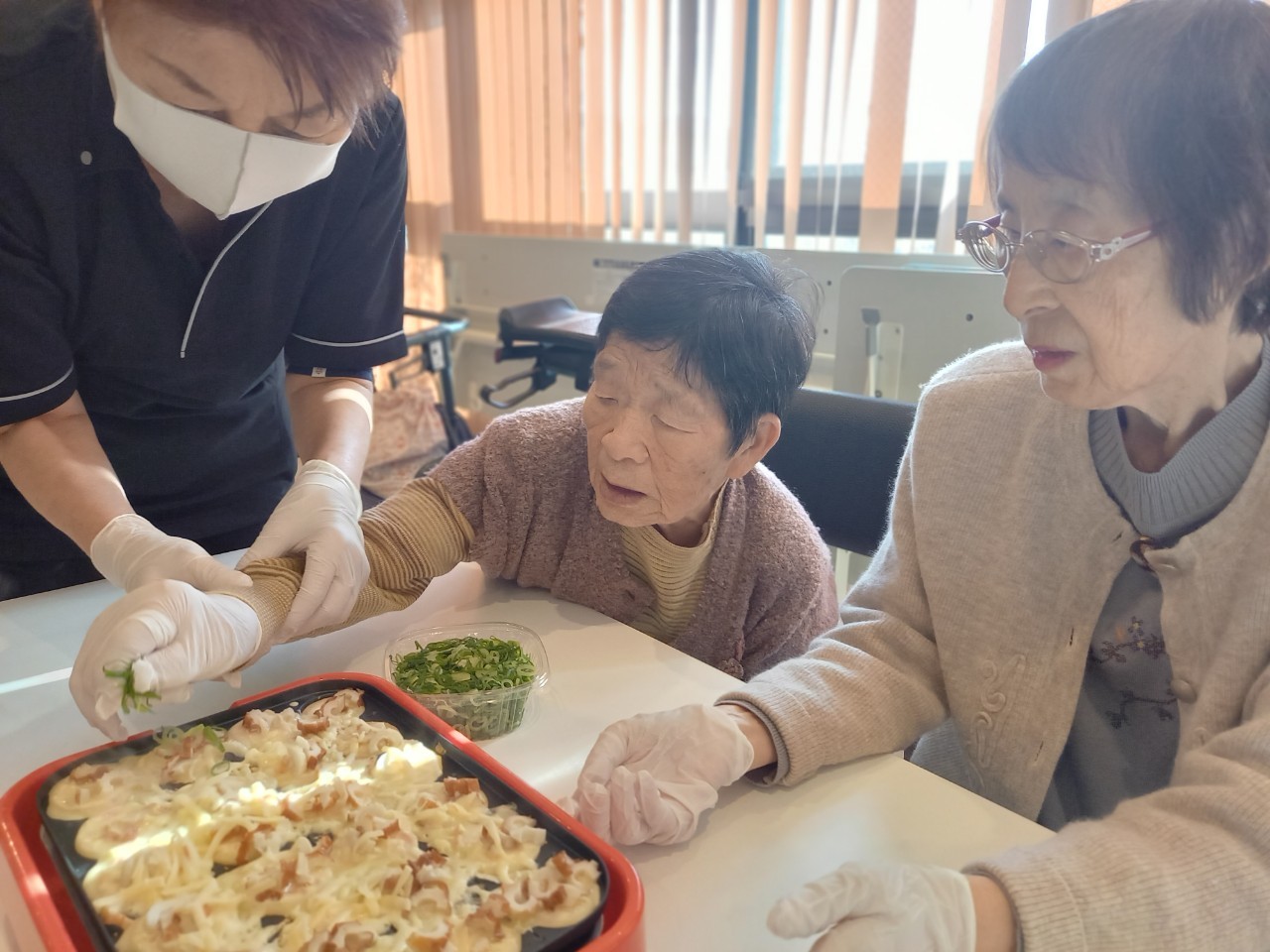 新年1発目の手作りおやつはたこやきをしました。同じ食材で同じ機材で作るのに味が変わるのが不思議なたこ焼き。小さいころから焼かれていた粉もん文化のご出身の利用者さまはさすが手つきも違って美味しいたこやきをお作りになられてました。