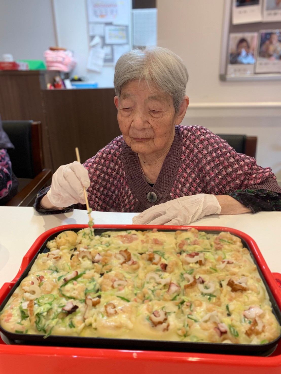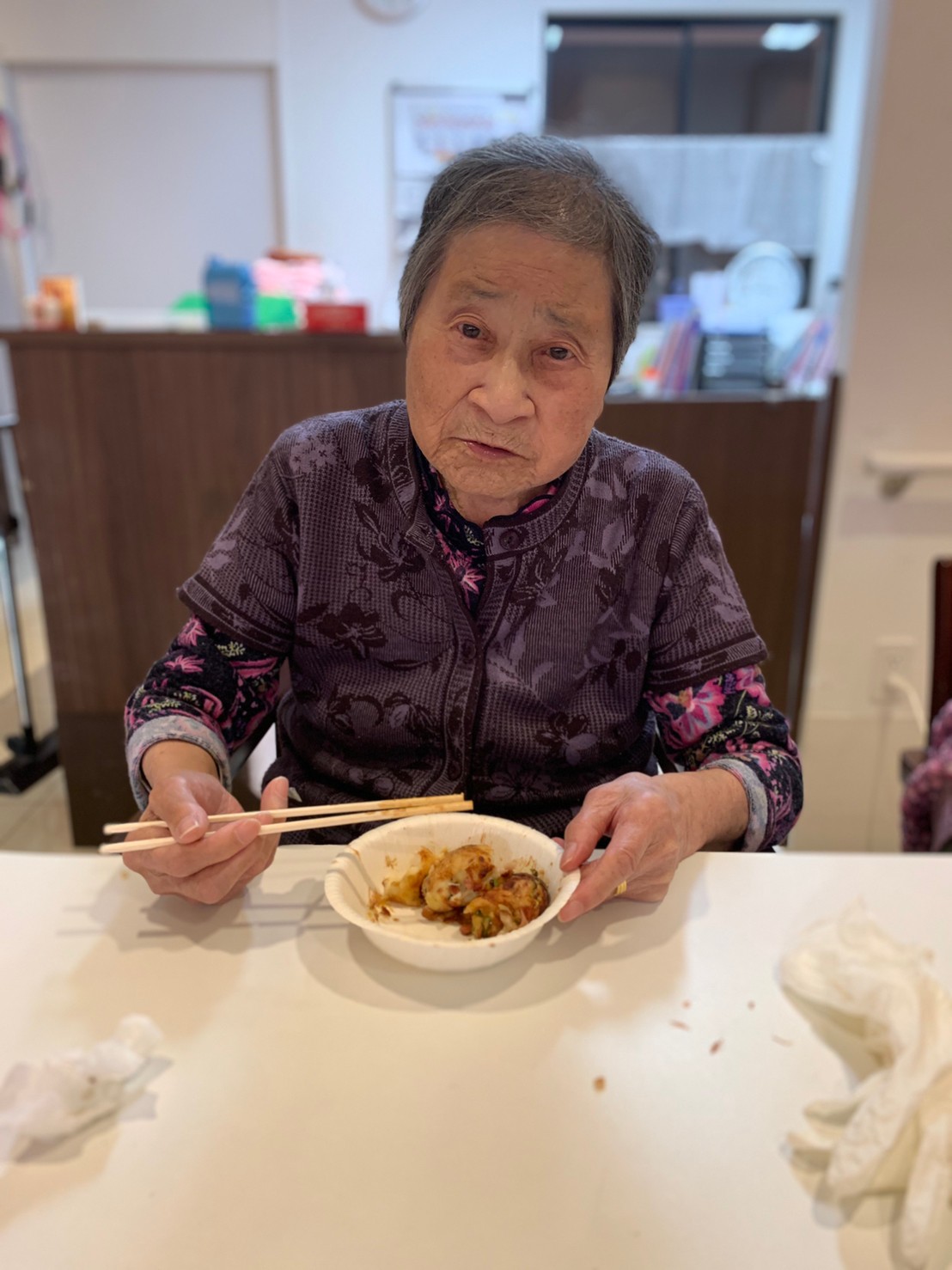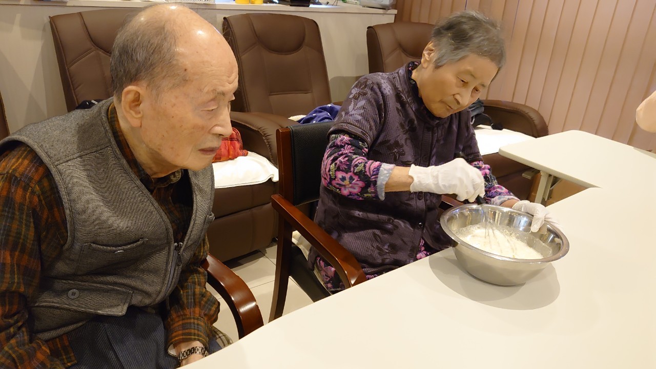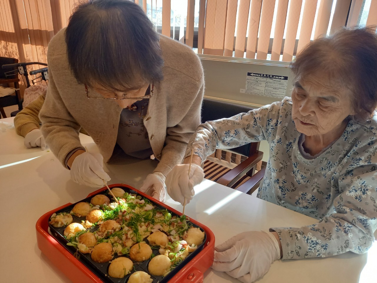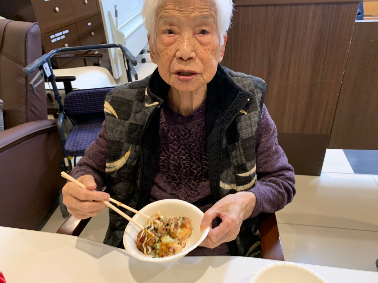 新年1発目の手作りおやつはたこやきをしました。同じ食材で同じ機材で作るのに味が変わるのが不思議なたこ焼き。小さいころから焼かれていた粉もん文化のご出身の利用者さまはさすが手つきも違って美味しいたこやきをお作りになられてました。