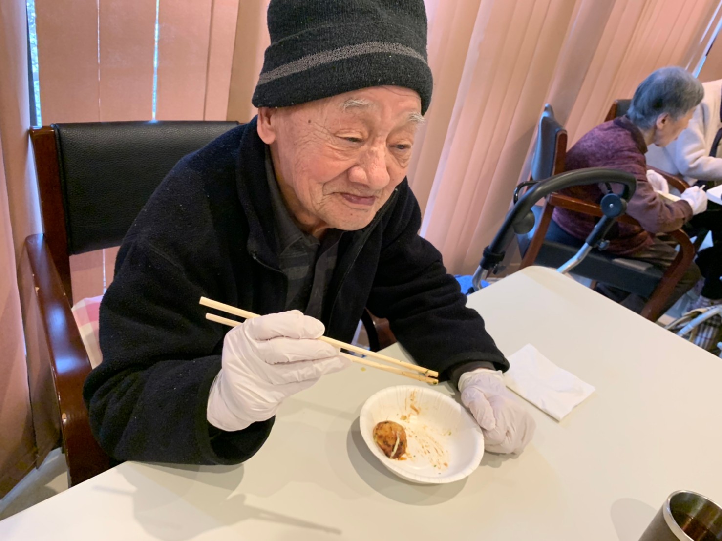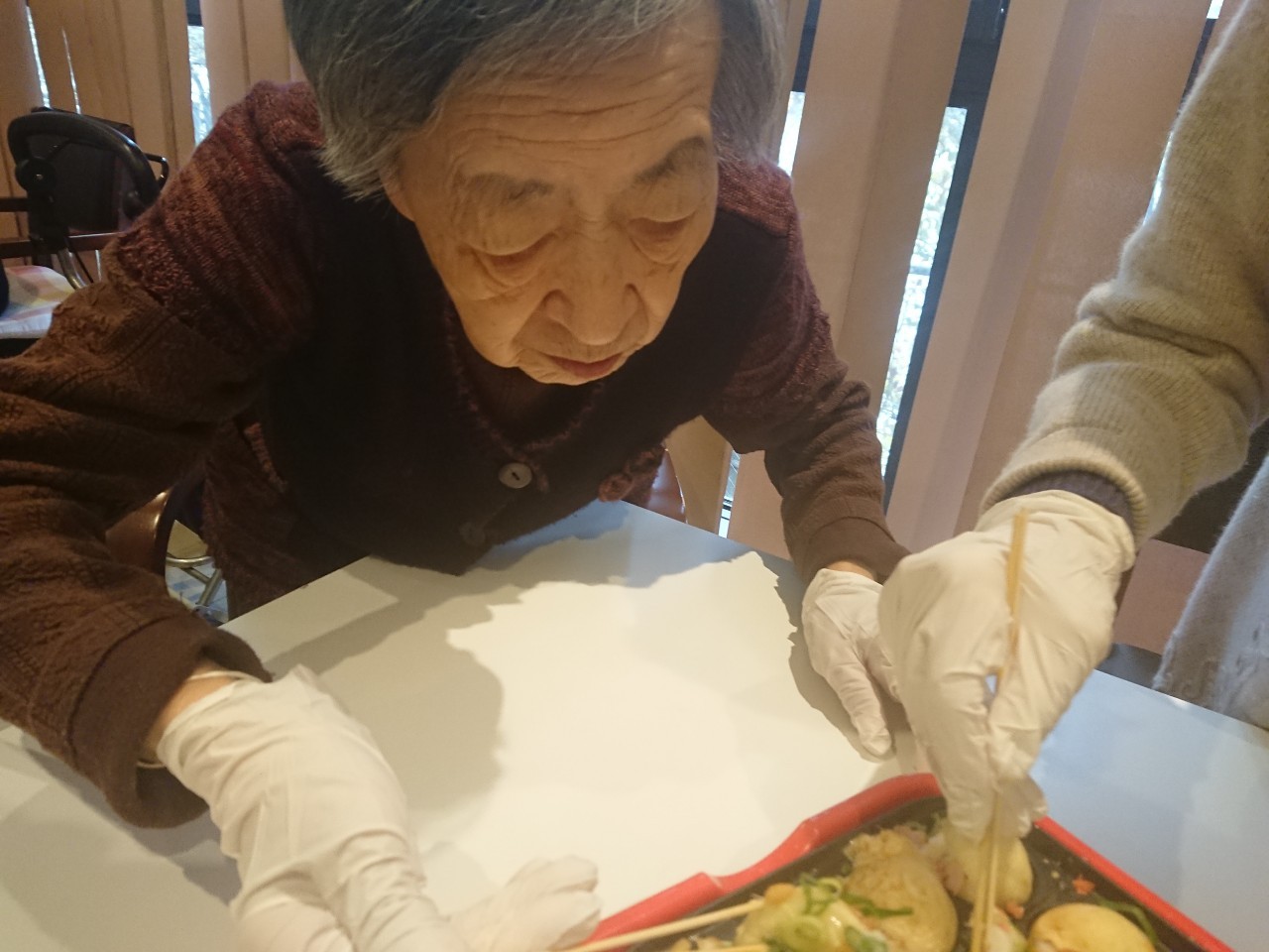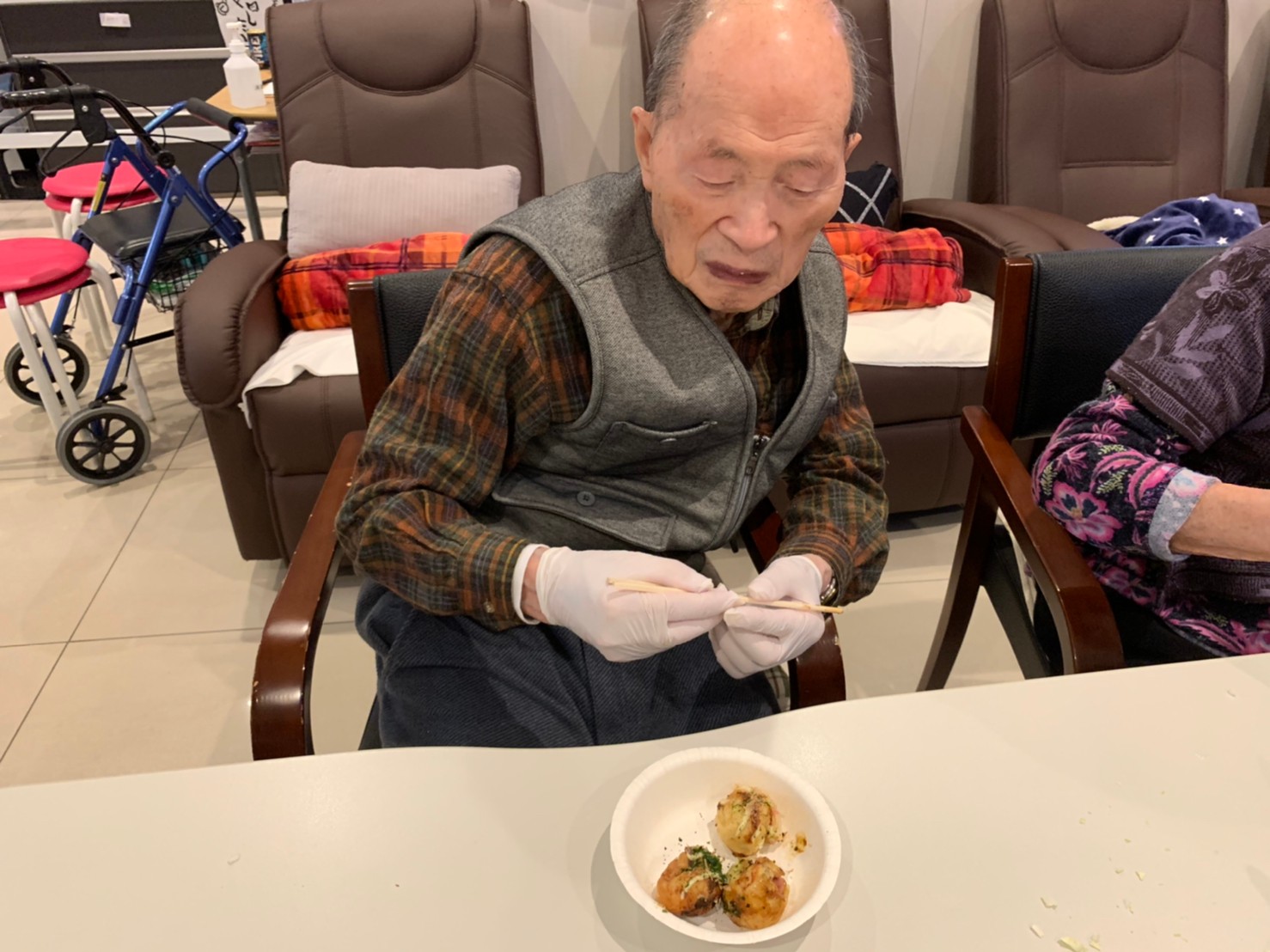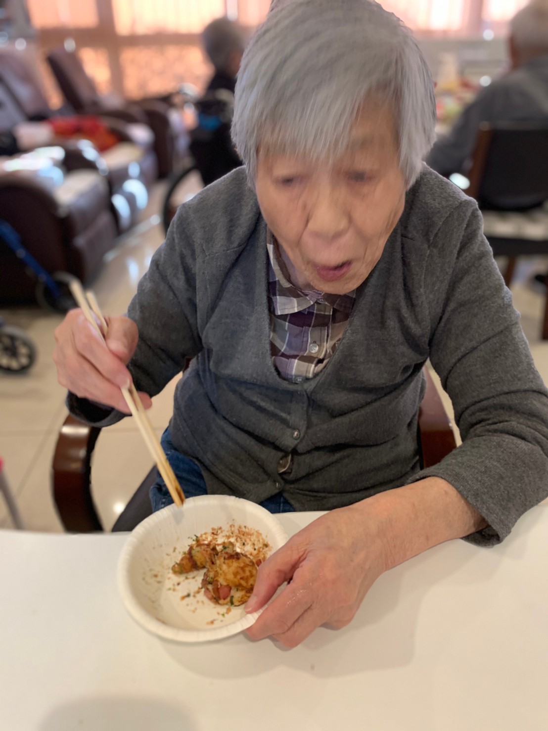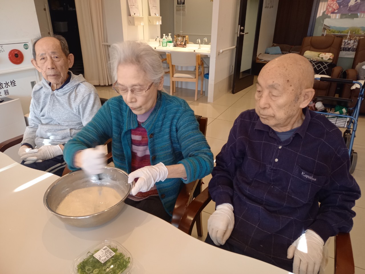 新年1発目の手作りおやつはたこやきをしました。同じ食材で同じ機材で作るのに味が変わるのが不思議なたこ焼き。小さいころから焼かれていた粉もん文化のご出身の利用者さまはさすが手つきも違って美味しいたこやきをお作りになられてました。