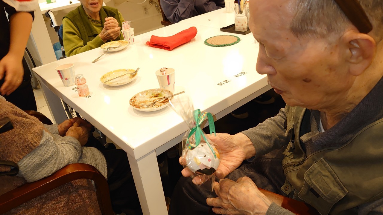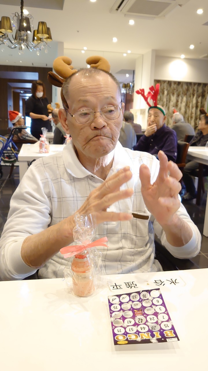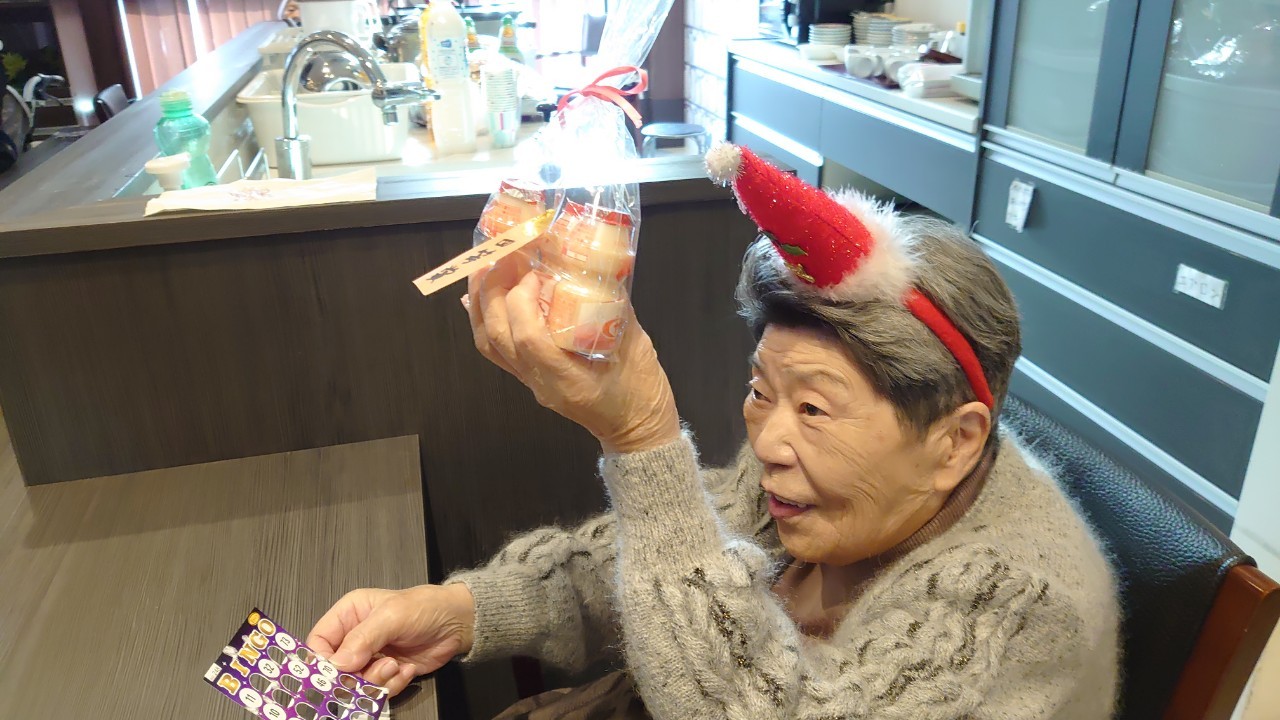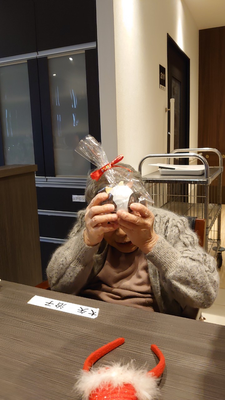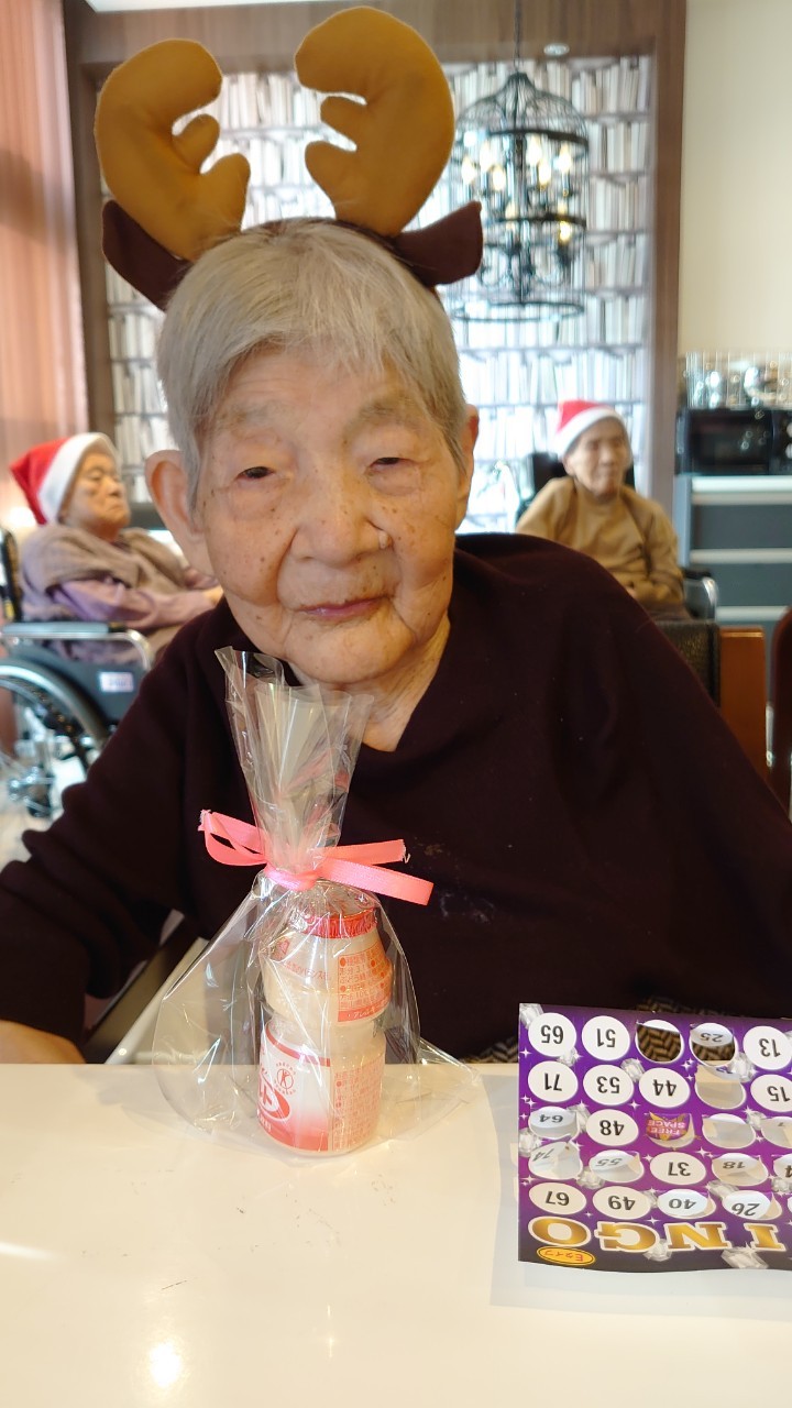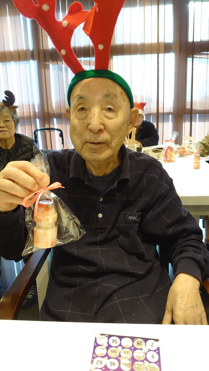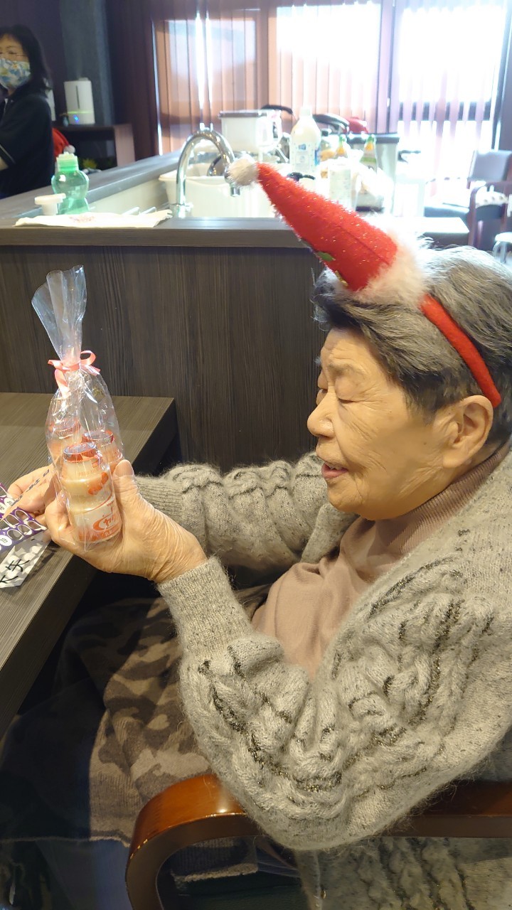 今月のイベントはもちろんクリスマス会です。サニープレイス河瀬には煙突はありませんがエレベーターを使ってサンタクロースが利用者さまにプレゼントを持って毎年やってきます。プレゼントの中身は毎年恒例の来年の干支の置物です。株式会社サンタクロース 彦根支社 河瀬工場の職員が手作りした干支の置物は人気で毎年この時期になると利用者さまも今年はどんなのを作るか興味津々です。来年の干支は丑(うし)ということで、牛の柄を決めるのに和牛のような黒や茶色なのかホルスタインのような白黒まだら模様なのかで迷うこともありました( ;∀;)。イベントではヤクルト争奪大ビンゴ大会もあり利用者さま皆さまにヤクルトをお渡ししてクリスマス会は終えられました。