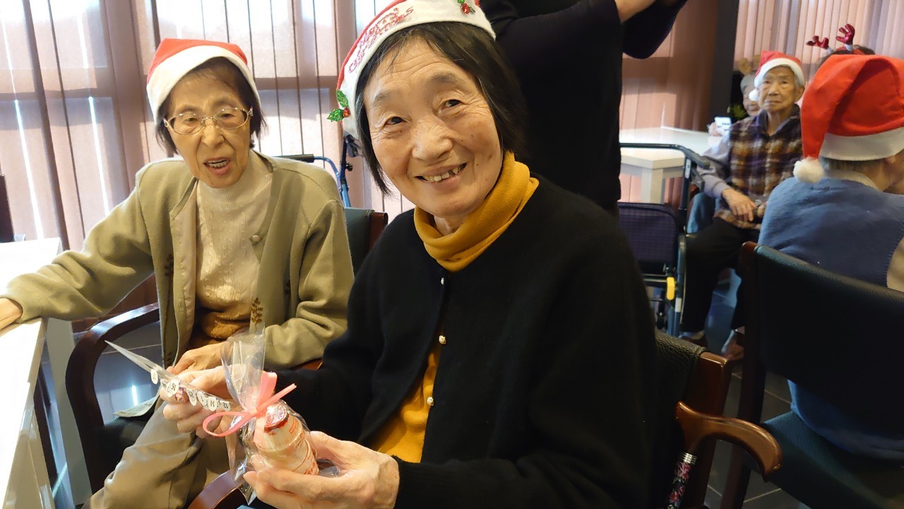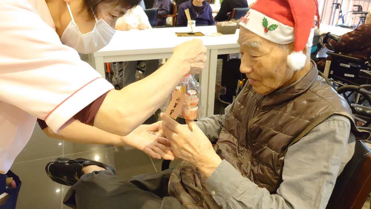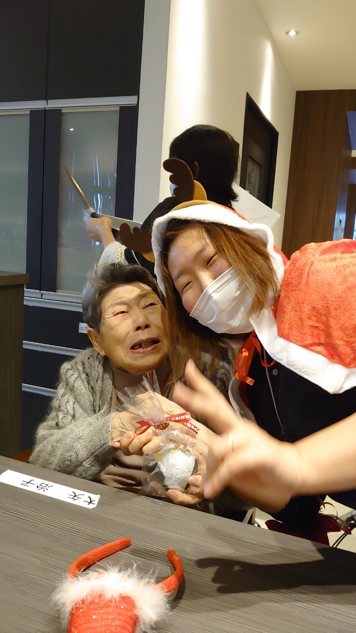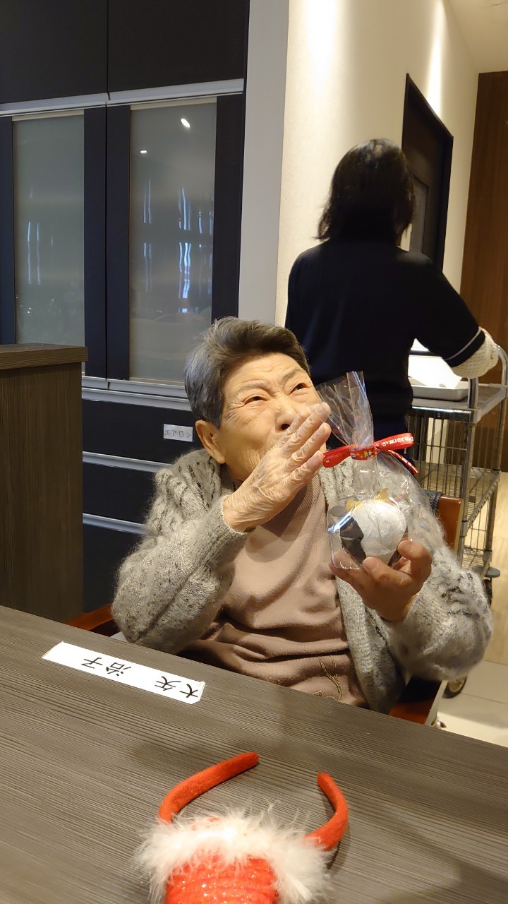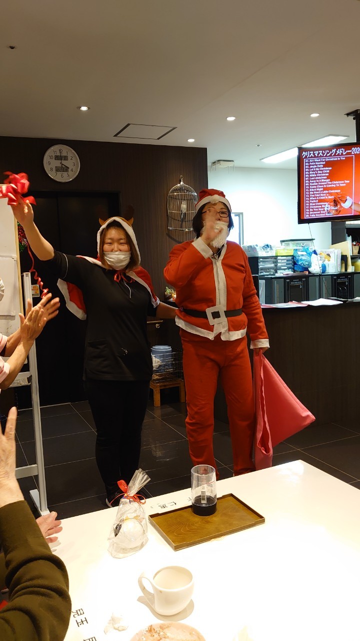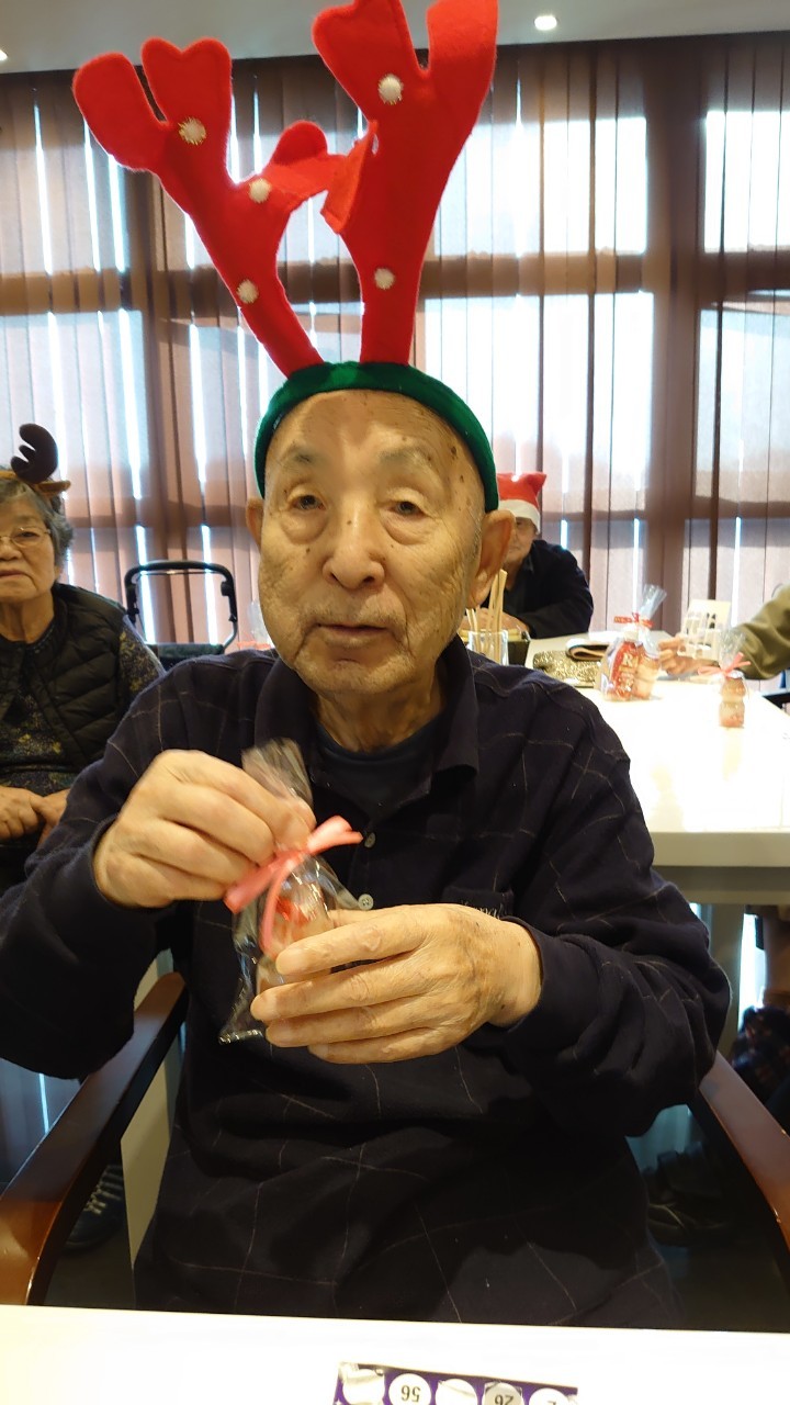 今月のイベントはもちろんクリスマス会です。サニープレイス河瀬には煙突はありませんがエレベーターを使ってサンタクロースが利用者さまにプレゼントを持って毎年やってきます。プレゼントの中身は毎年恒例の来年の干支の置物です。株式会社サンタクロース 彦根支社 河瀬工場の職員が手作りした干支の置物は人気で毎年この時期になると利用者さまも今年はどんなのを作るか興味津々です。来年の干支は丑(うし)ということで、牛の柄を決めるのに和牛のような黒や茶色なのかホルスタインのような白黒まだら模様なのかで迷うこともありました( ;∀;)。イベントではヤクルト争奪大ビンゴ大会もあり利用者さま皆さまにヤクルトをお渡ししてクリスマス会は終えられました。
