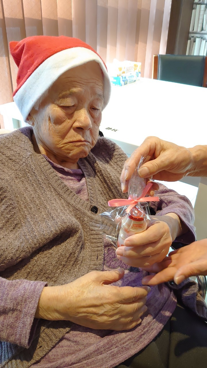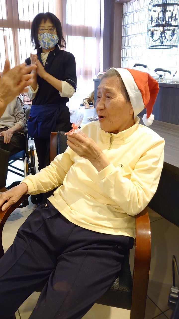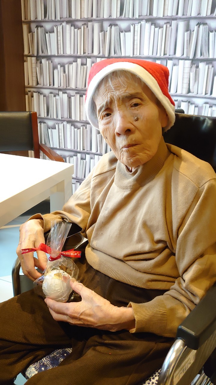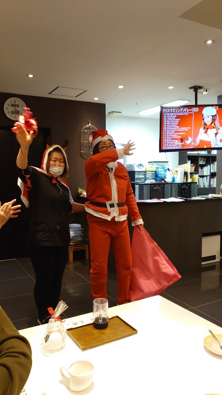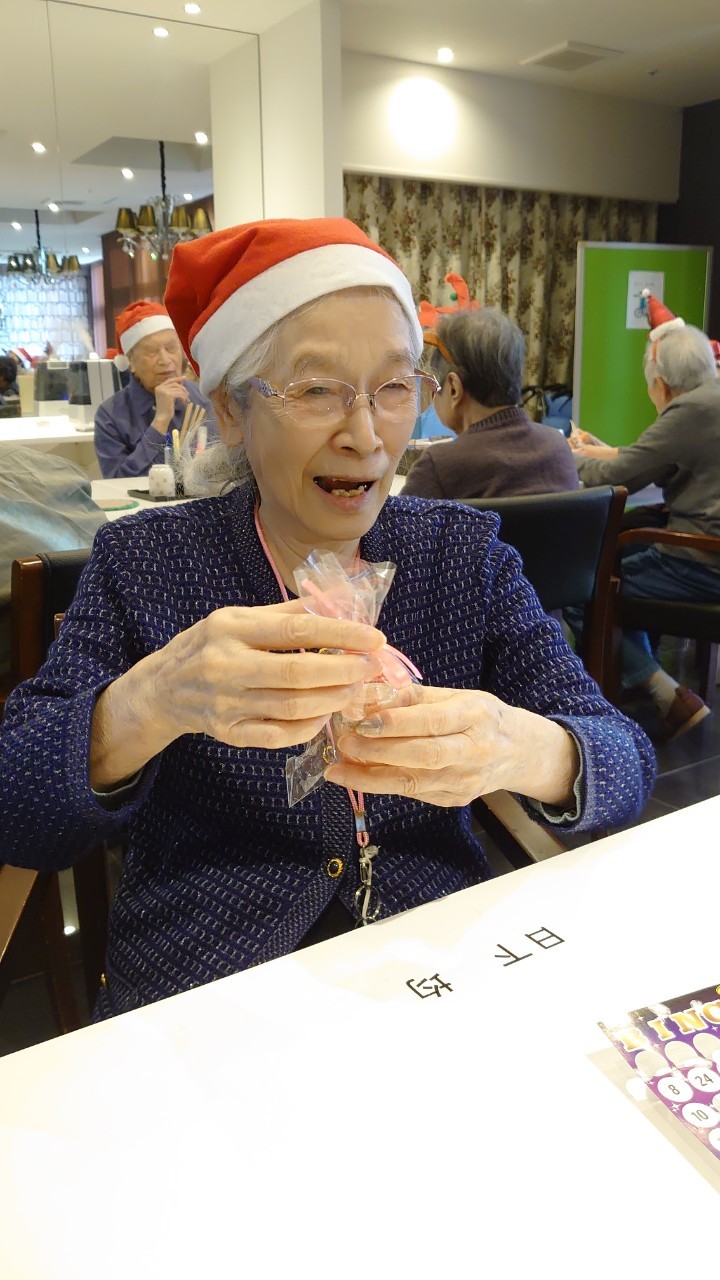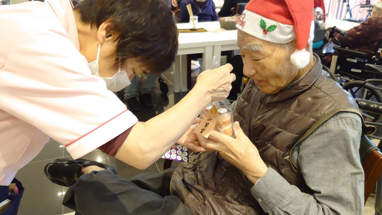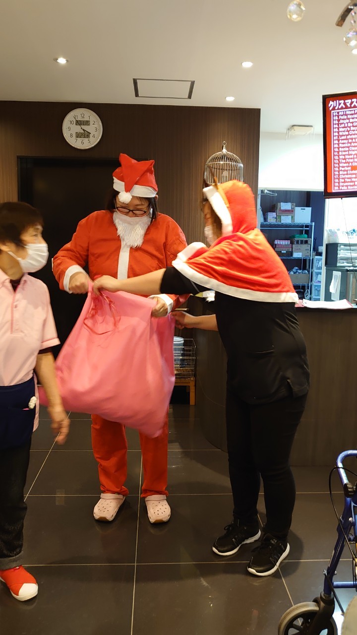 今月のイベントはもちろんクリスマス会です。サニープレイス河瀬には煙突はありませんがエレベーターを使ってサンタクロースが利用者さまにプレゼントを持って毎年やってきます。プレゼントの中身は毎年恒例の来年の干支の置物です。株式会社サンタクロース 彦根支社 河瀬工場の職員が手作りした干支の置物は人気で毎年この時期になると利用者さまも今年はどんなのを作るか興味津々です。来年の干支は丑(うし)ということで、牛の柄を決めるのに和牛のような黒や茶色なのかホルスタインのような白黒まだら模様なのかで迷うこともありました( ;∀;)。イベントではヤクルト争奪大ビンゴ大会もあり利用者さま皆さまにヤクルトをお渡ししてクリスマス会は終えられました。