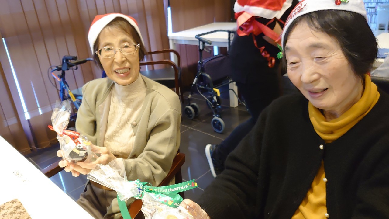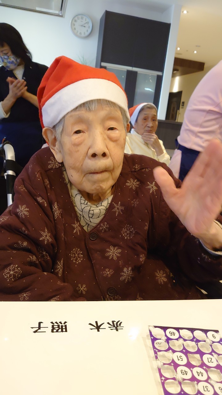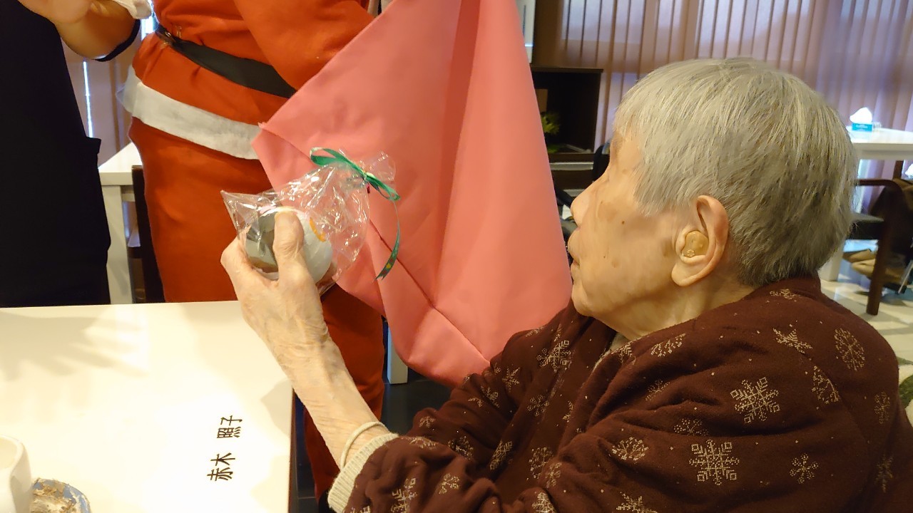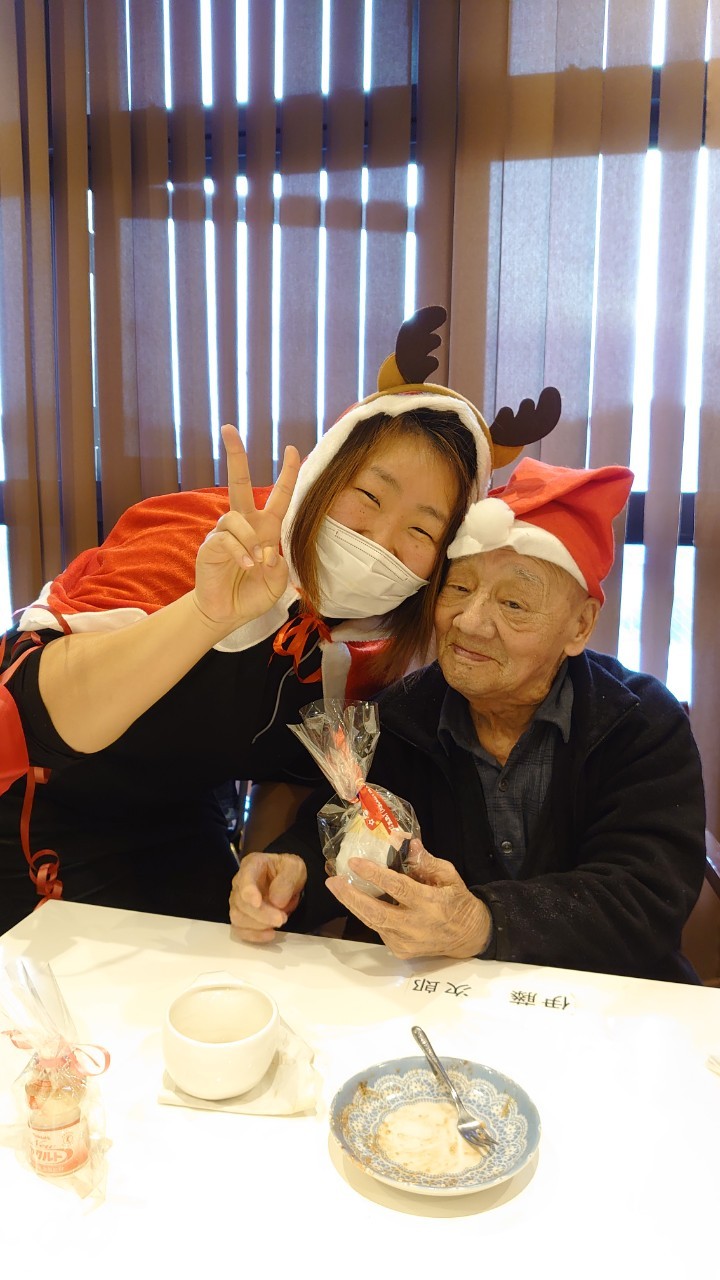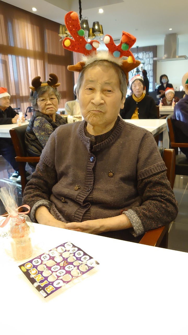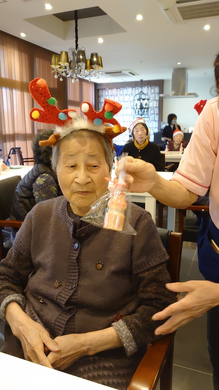 今月のイベントはもちろんクリスマス会です。サニープレイス河瀬には煙突はありませんがエレベーターを使ってサンタクロースが利用者さまにプレゼントを持って毎年やってきます。プレゼントの中身は毎年恒例の来年の干支の置物です。株式会社サンタクロース 彦根支社 河瀬工場の職員が手作りした干支の置物は人気で毎年この時期になると利用者さまも今年はどんなのを作るか興味津々です。来年の干支は丑(うし)ということで、牛の柄を決めるのに和牛のような黒や茶色なのかホルスタインのような白黒まだら模様なのかで迷うこともありました( ;∀;)。イベントではヤクルト争奪大ビンゴ大会もあり利用者さま皆さまにヤクルトをお渡ししてクリスマス会は終えられました。