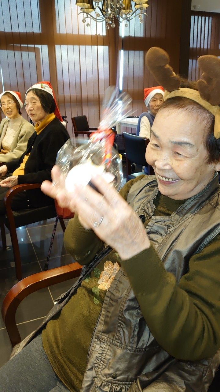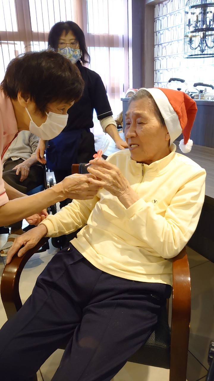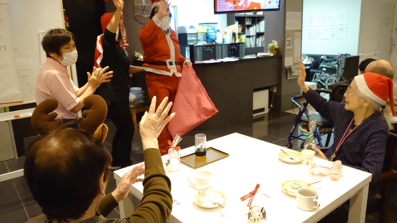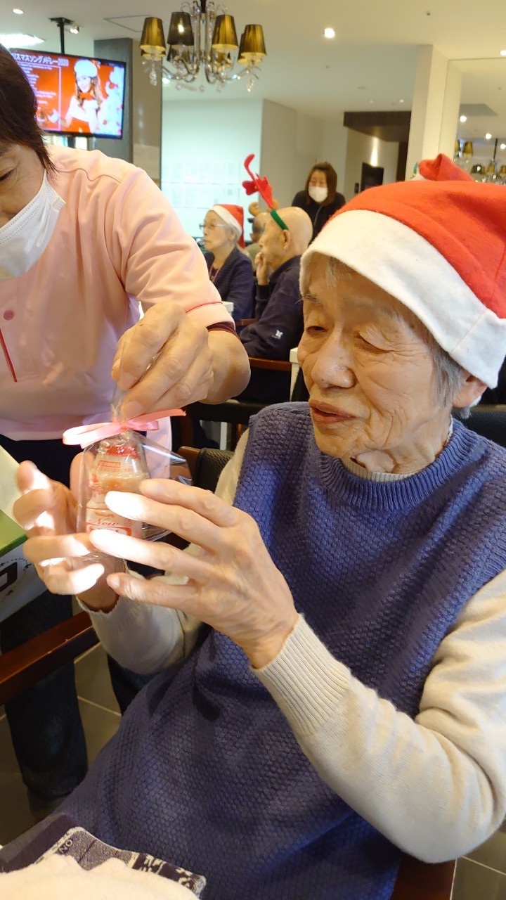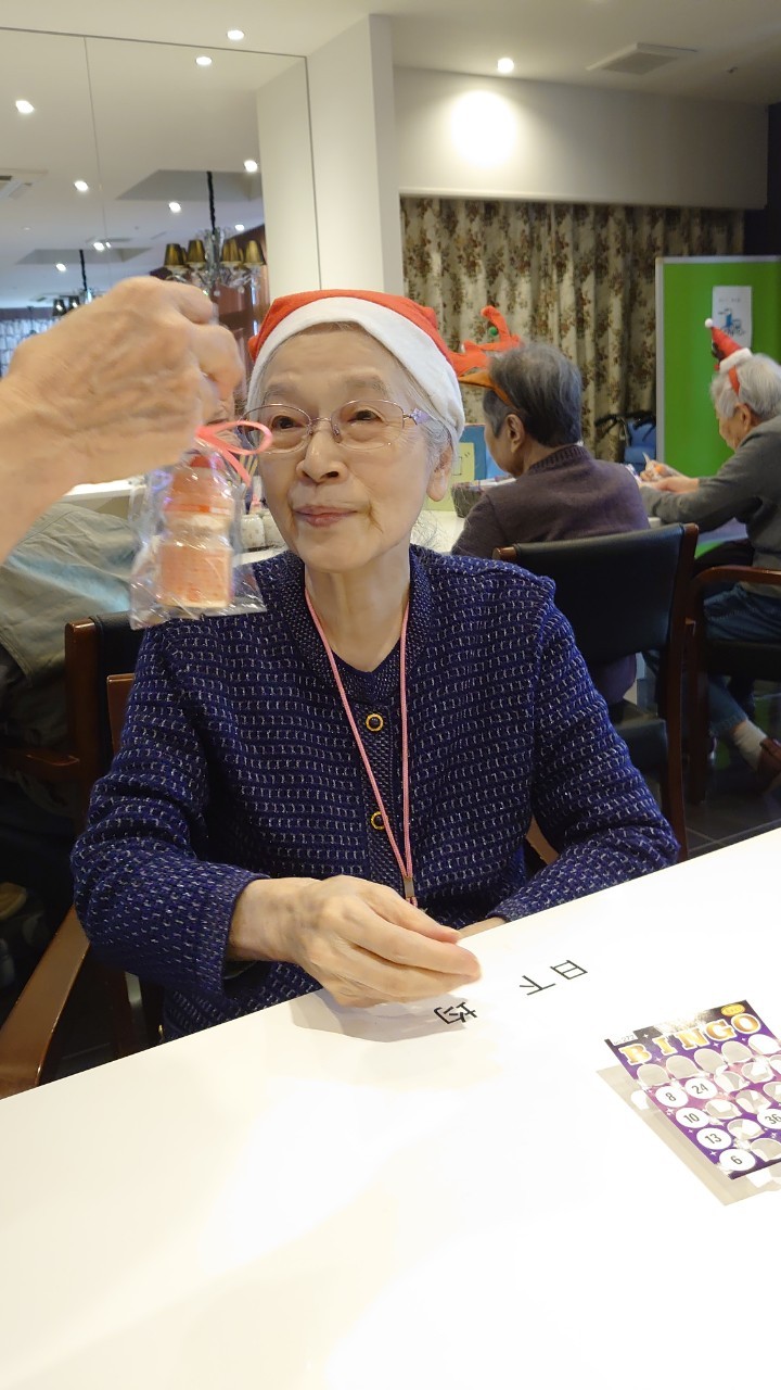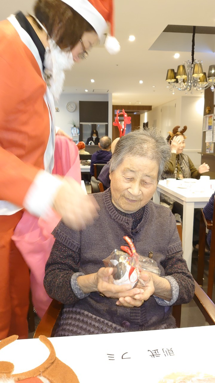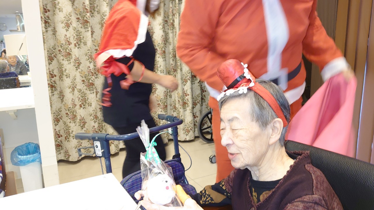 今月のイベントはもちろんクリスマス会です。サニープレイス河瀬には煙突はありませんがエレベーターを使ってサンタクロースが利用者さまにプレゼントを持って毎年やってきます。プレゼントの中身は毎年恒例の来年の干支の置物です。株式会社サンタクロース 彦根支社 河瀬工場の職員が手作りした干支の置物は人気で毎年この時期になると利用者さまも今年はどんなのを作るか興味津々です。来年の干支は丑(うし)ということで、牛の柄を決めるのに和牛のような黒や茶色なのかホルスタインのような白黒まだら模様なのかで迷うこともありました( ;∀;)。イベントではヤクルト争奪大ビンゴ大会もあり利用者さま皆さまにヤクルトをお渡ししてクリスマス会は終えられました。