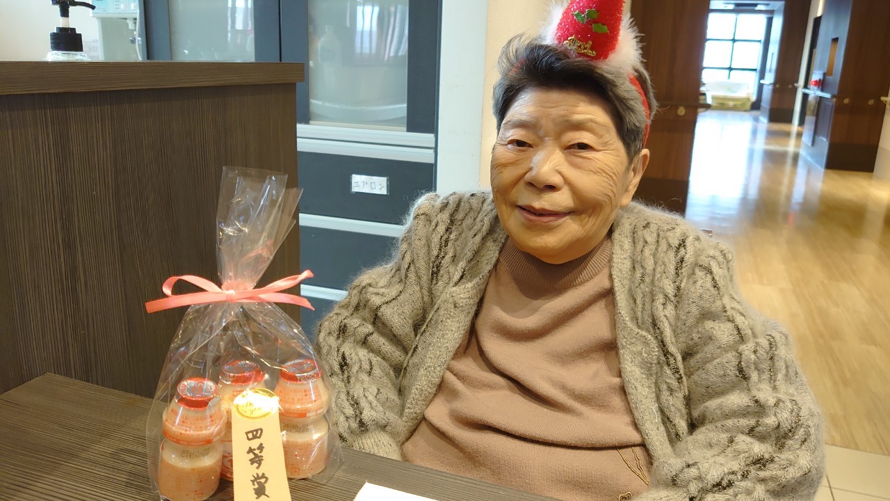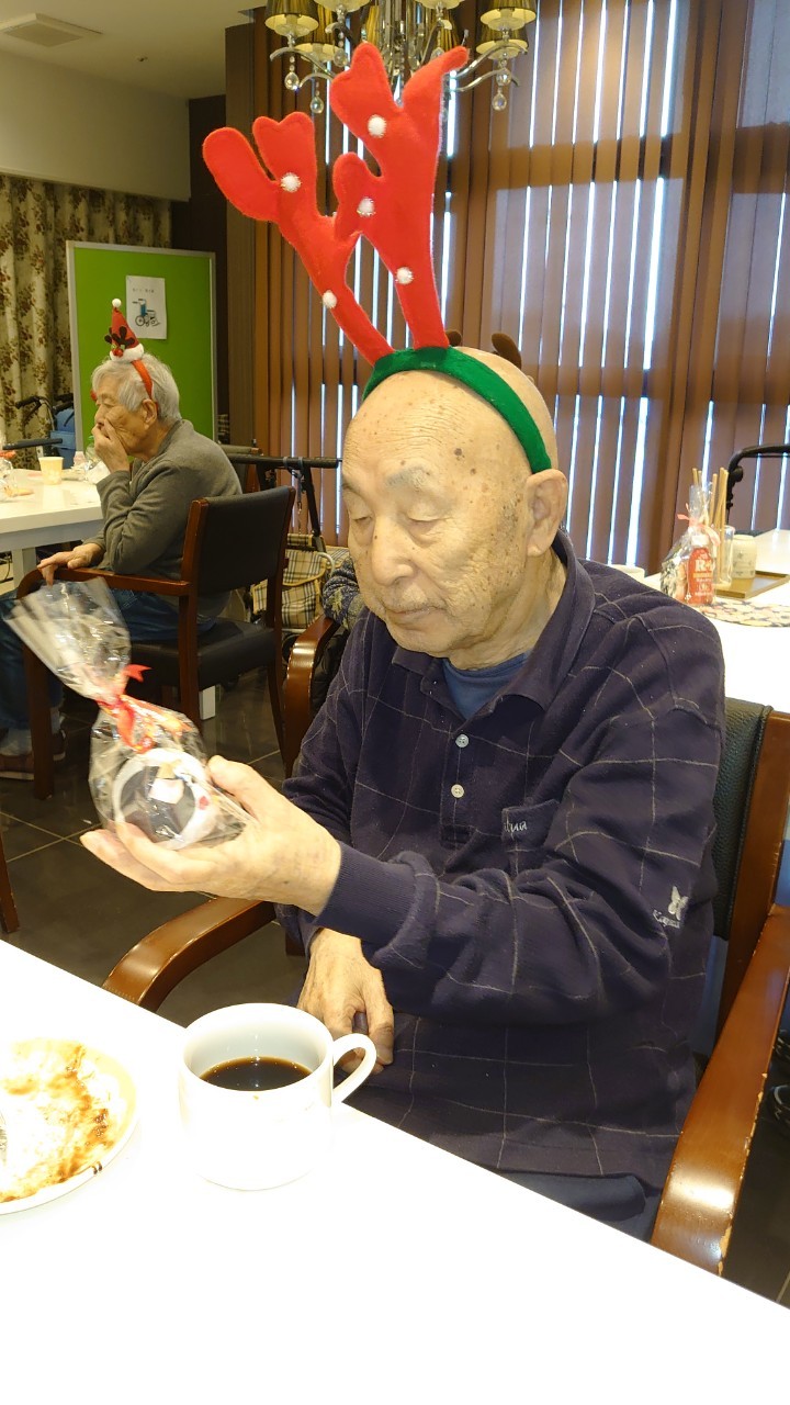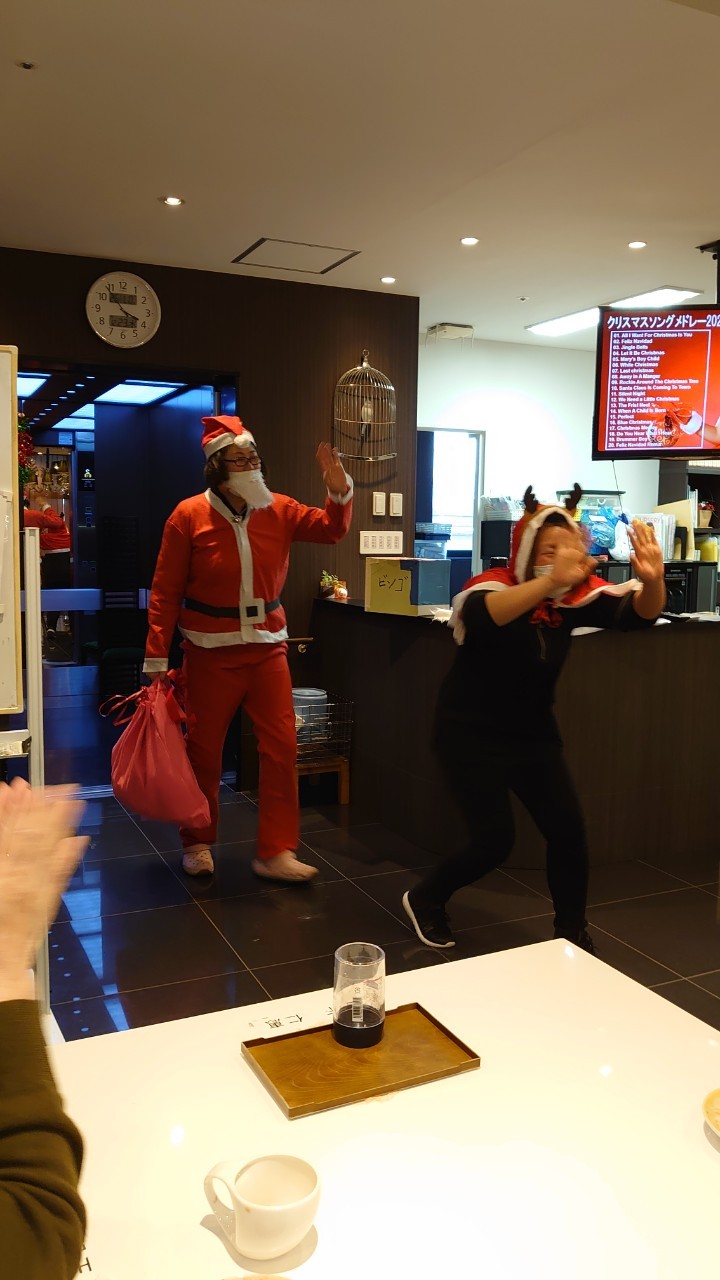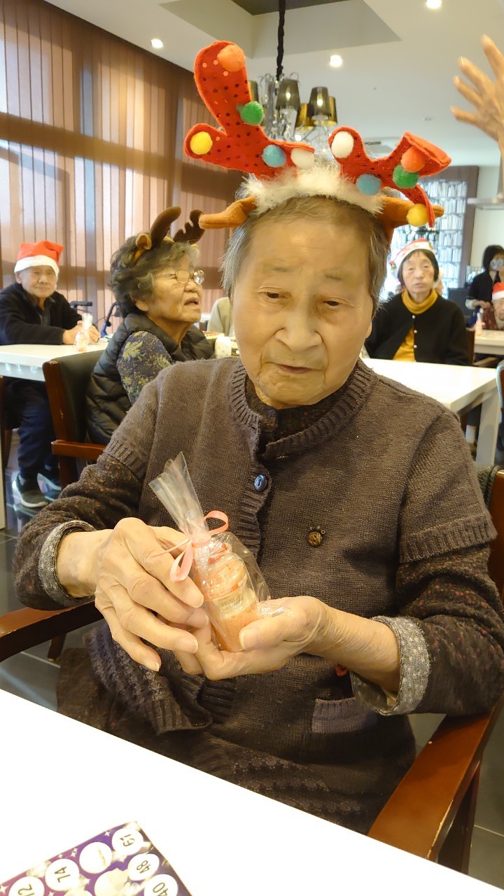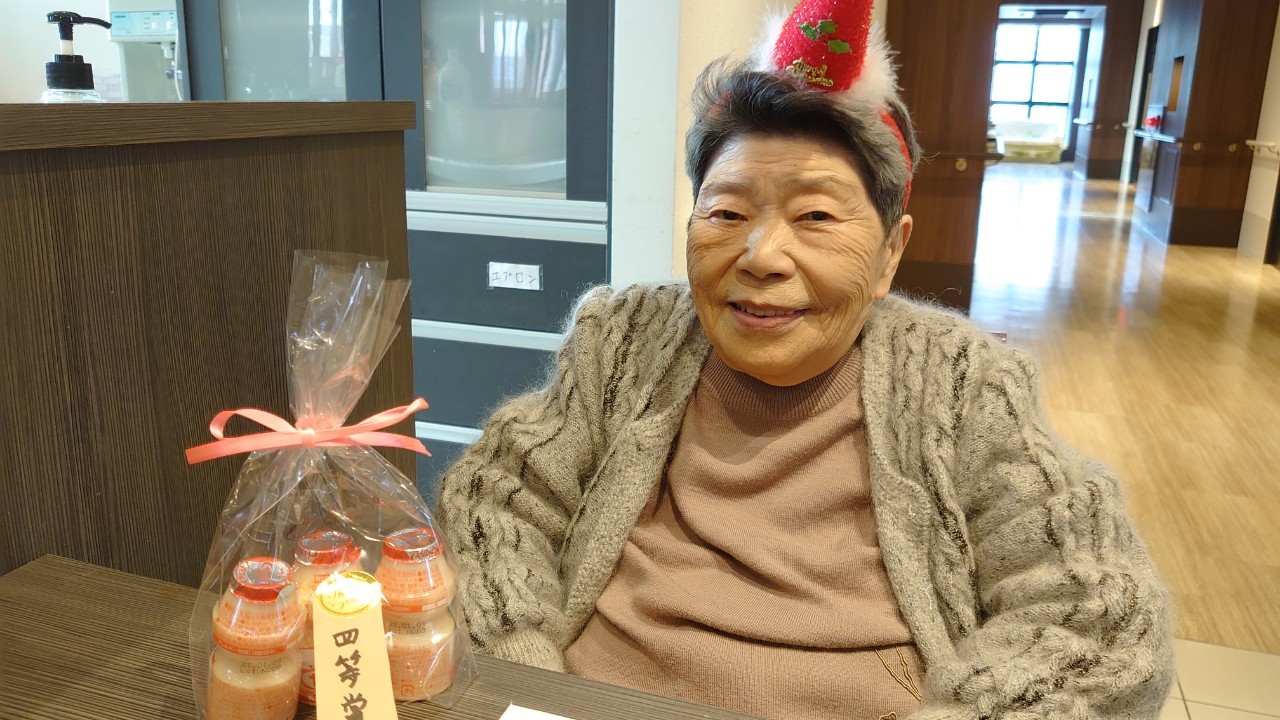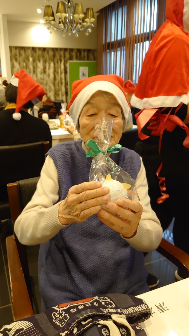 今月のイベントはもちろんクリスマス会です。サニープレイス河瀬には煙突はありませんがエレベーターを使ってサンタクロースが利用者さまにプレゼントを持って毎年やってきます。プレゼントの中身は毎年恒例の来年の干支の置物です。株式会社サンタクロース 彦根支社 河瀬工場の職員が手作りした干支の置物は人気で毎年この時期になると利用者さまも今年はどんなのを作るか興味津々です。来年の干支は丑(うし)ということで、牛の柄を決めるのに和牛のような黒や茶色なのかホルスタインのような白黒まだら模様なのかで迷うこともありました( ;∀;)。イベントではヤクルト争奪大ビンゴ大会もあり利用者さま皆さまにヤクルトをお渡ししてクリスマス会は終えられました。