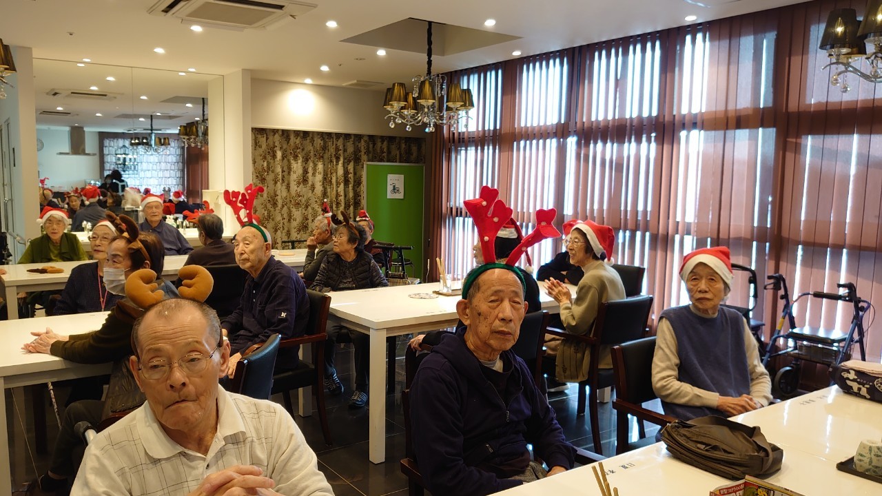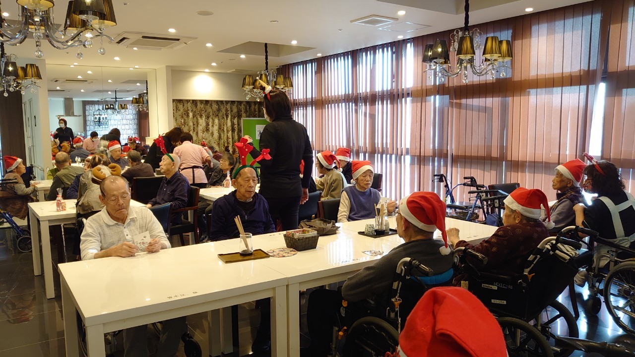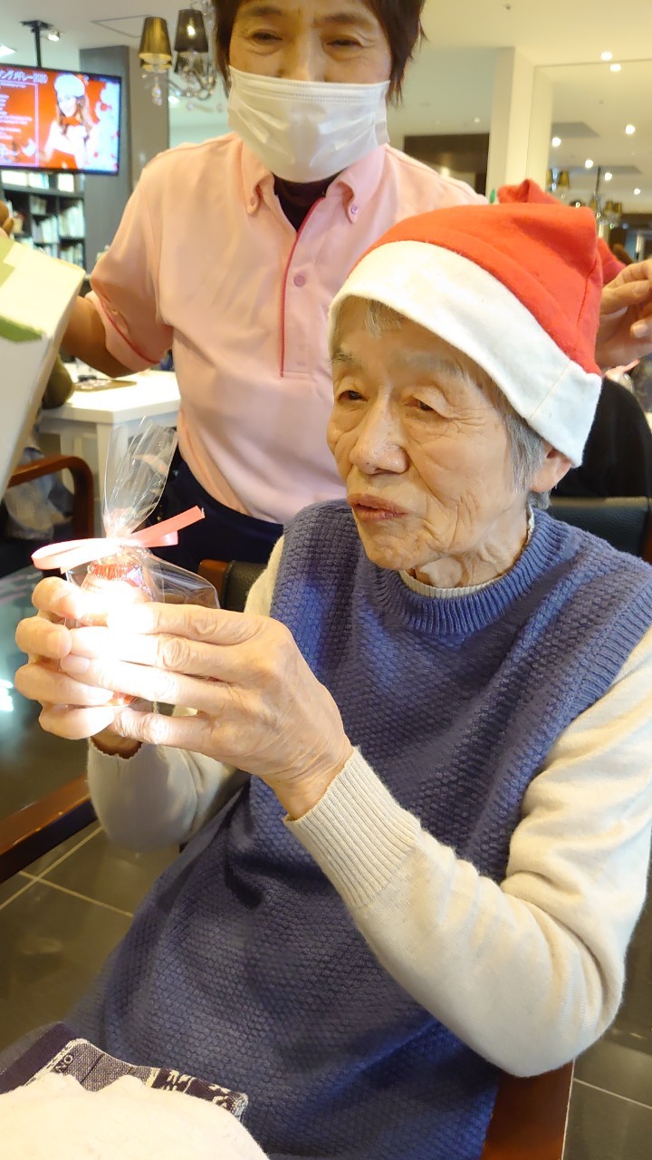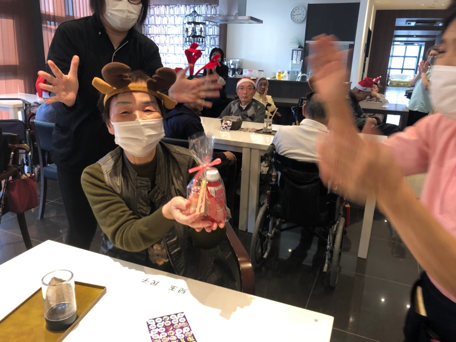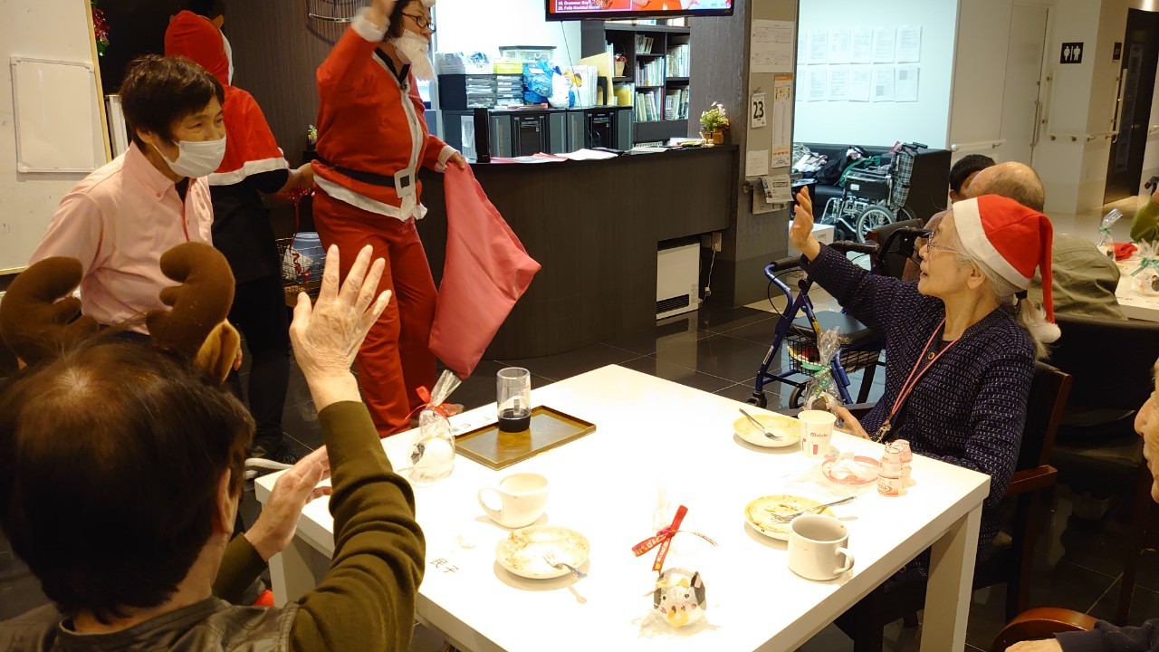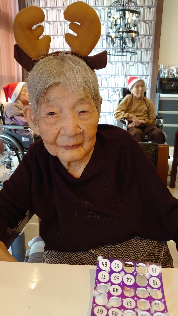 今月のイベントはもちろんクリスマス会です。サニープレイス河瀬には煙突はありませんがエレベーターを使ってサンタクロースが利用者さまにプレゼントを持って毎年やってきます。プレゼントの中身は毎年恒例の来年の干支の置物です。株式会社サンタクロース 彦根支社 河瀬工場の職員が手作りした干支の置物は人気で毎年この時期になると利用者さまも今年はどんなのを作るか興味津々です。来年の干支は丑(うし)ということで、牛の柄を決めるのに和牛のような黒や茶色なのかホルスタインのような白黒まだら模様なのかで迷うこともありました( ;∀;)。イベントではヤクルト争奪大ビンゴ大会もあり利用者さま皆さまにヤクルトをお渡ししてクリスマス会は終えられました。