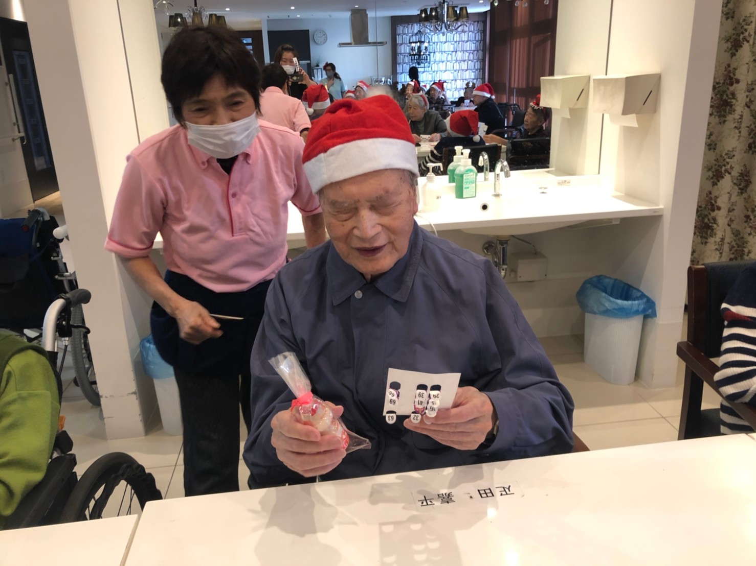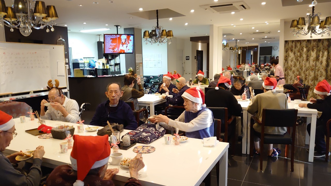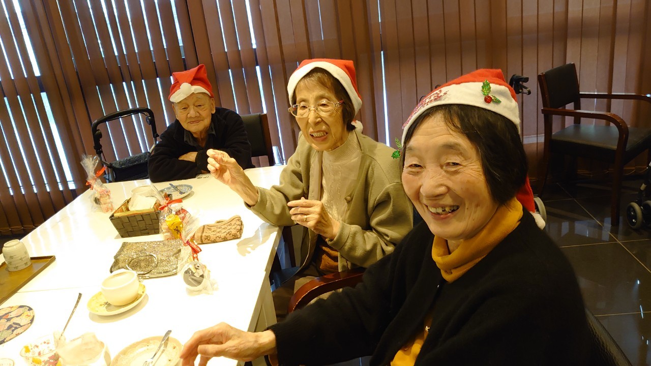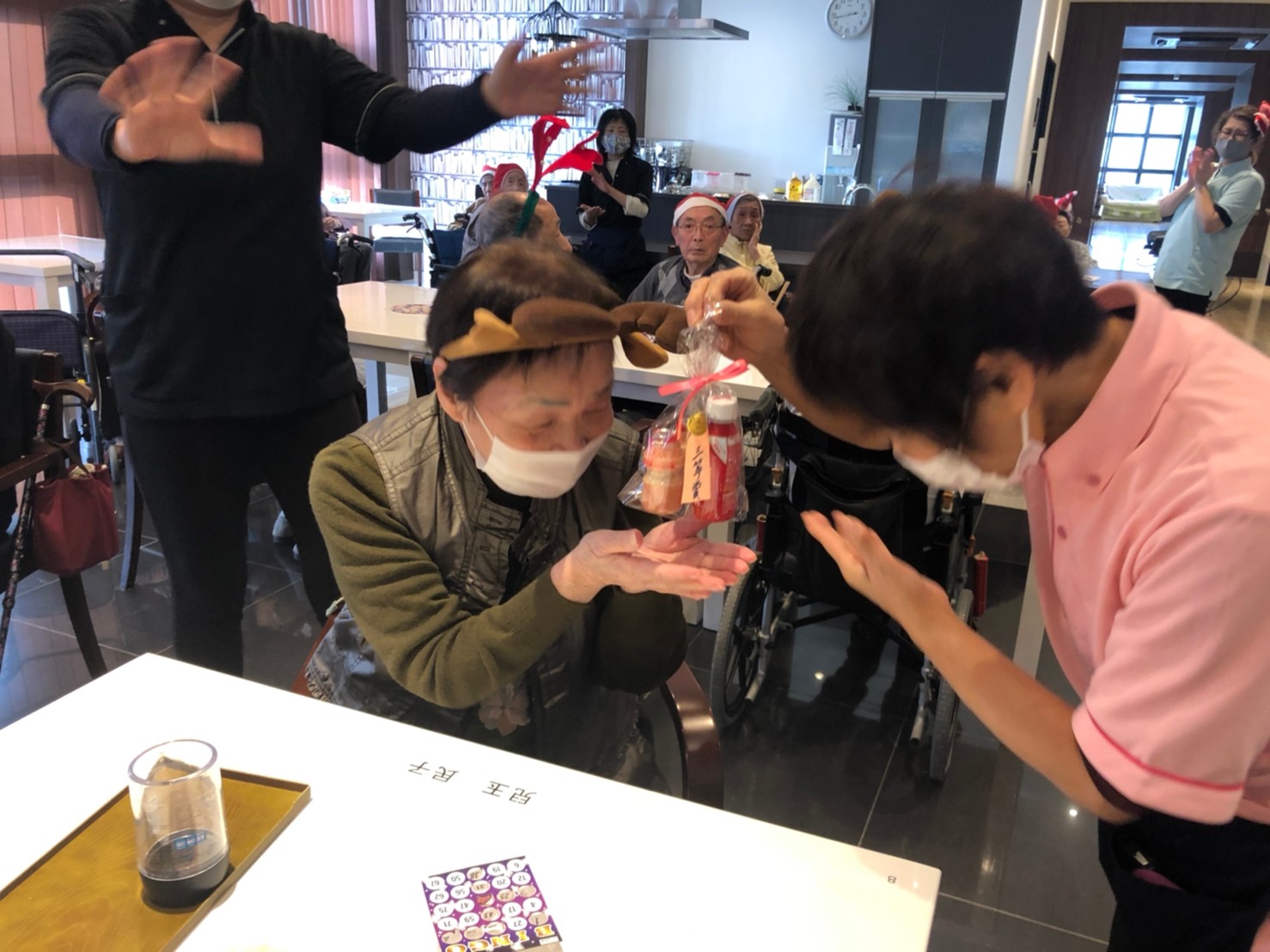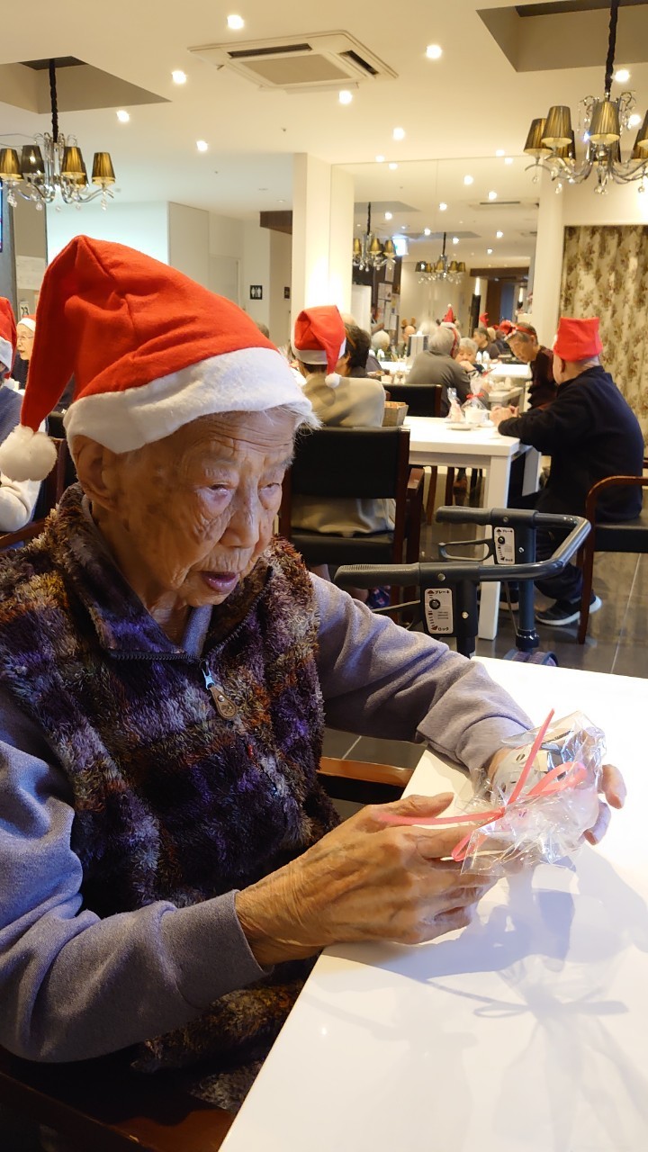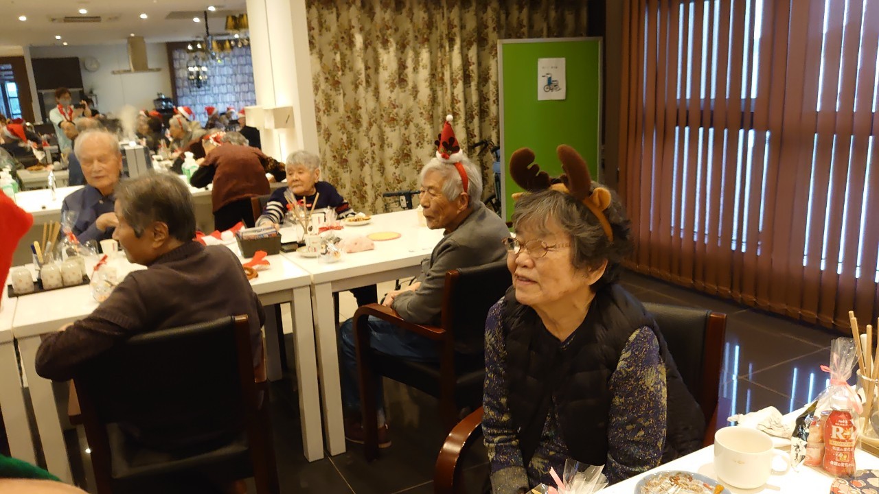 今月のイベントはもちろんクリスマス会です。サニープレイス河瀬には煙突はありませんがエレベーターを使ってサンタクロースが利用者さまにプレゼントを持って毎年やってきます。プレゼントの中身は毎年恒例の来年の干支の置物です。株式会社サンタクロース 彦根支社 河瀬工場の職員が手作りした干支の置物は人気で毎年この時期になると利用者さまも今年はどんなのを作るか興味津々です。来年の干支は丑(うし)ということで、牛の柄を決めるのに和牛のような黒や茶色なのかホルスタインのような白黒まだら模様なのかで迷うこともありました( ;∀;)。イベントではヤクルト争奪大ビンゴ大会もあり利用者さま皆さまにヤクルトをお渡ししてクリスマス会は終えられました。